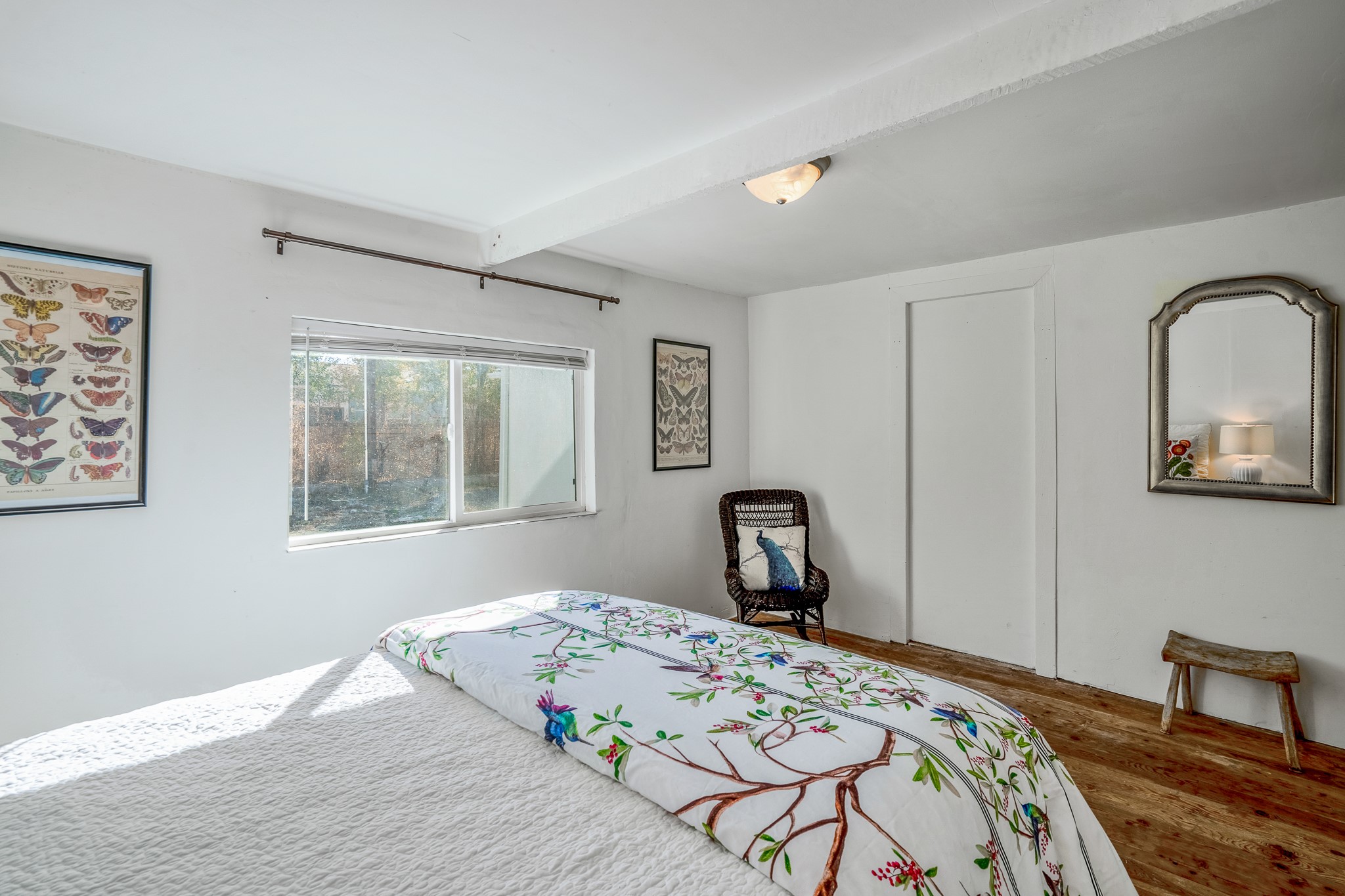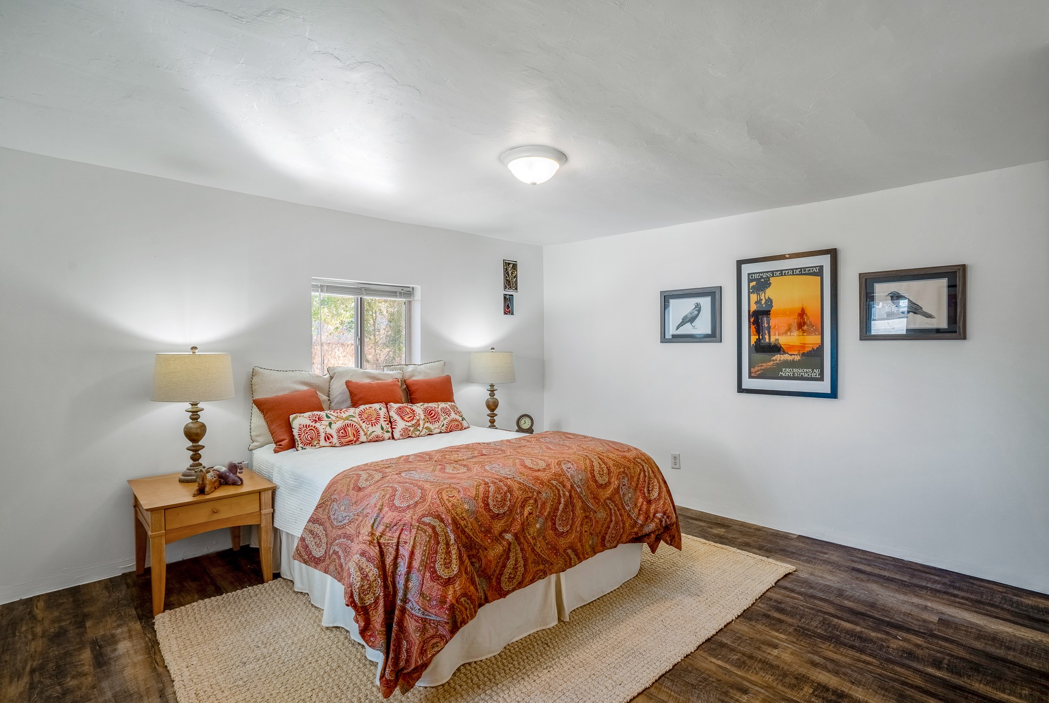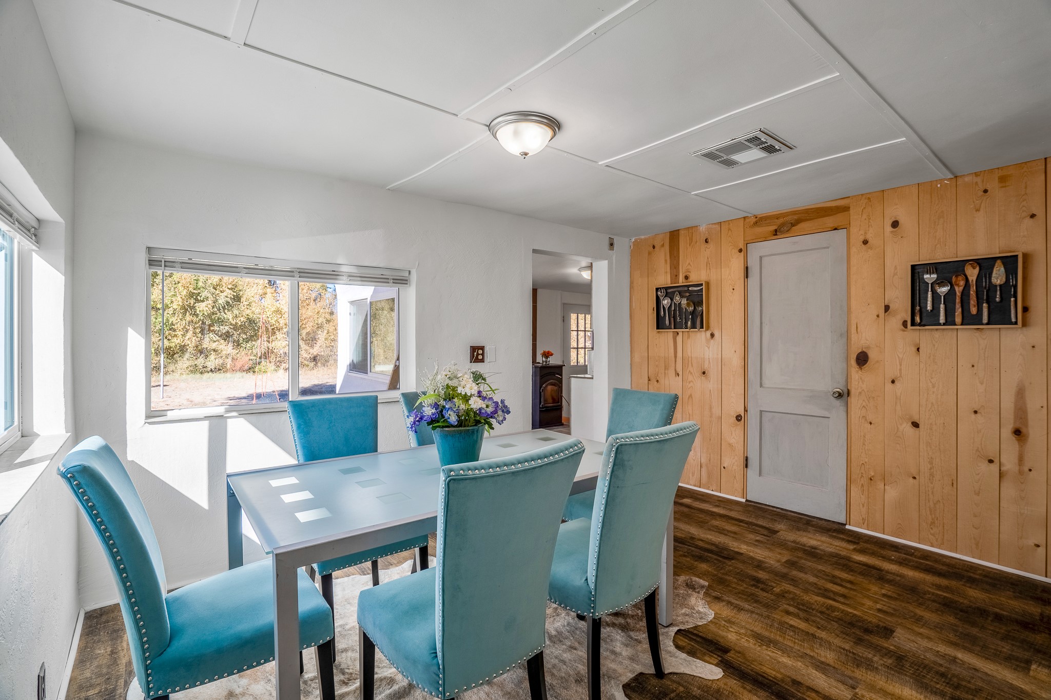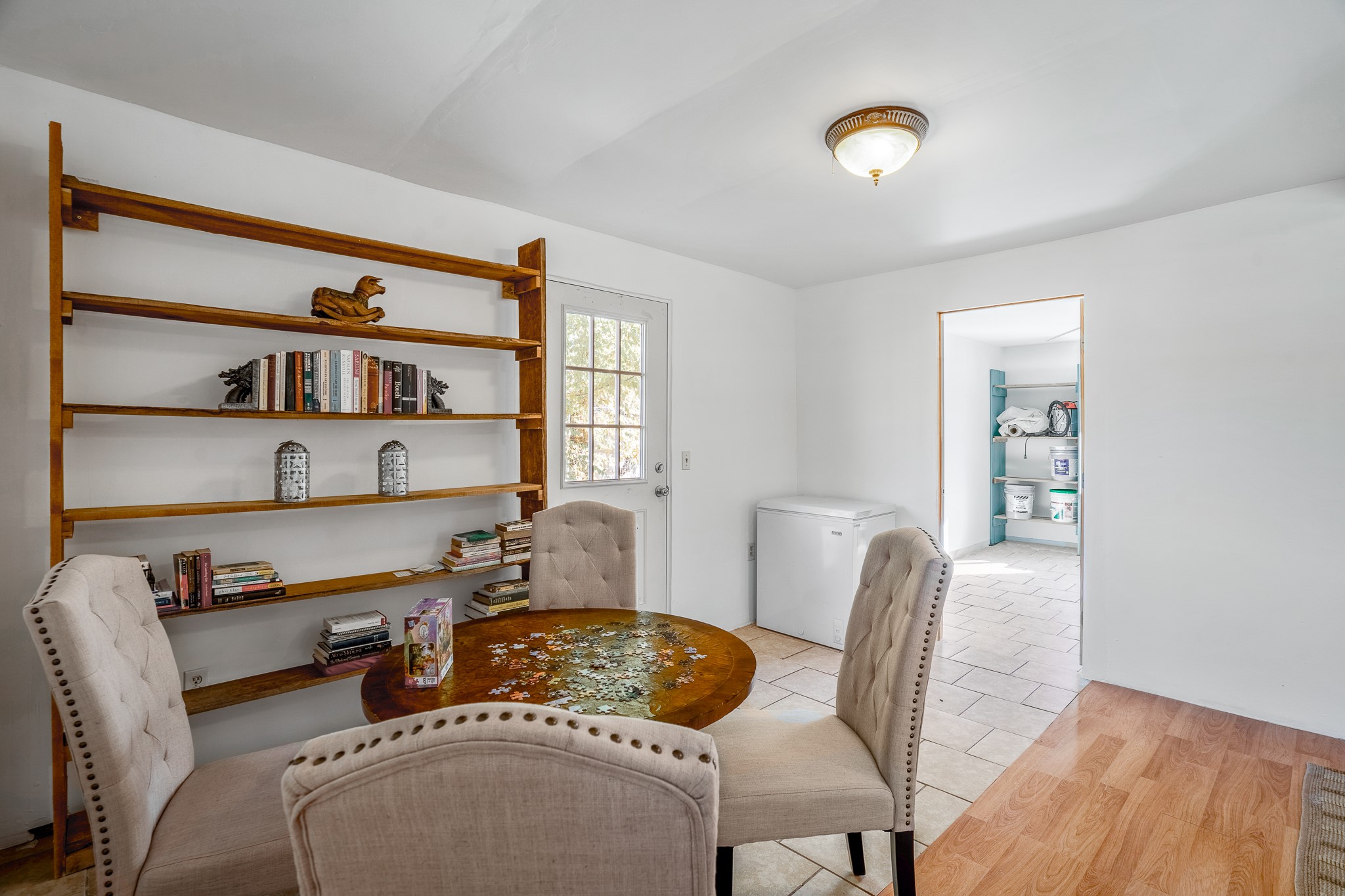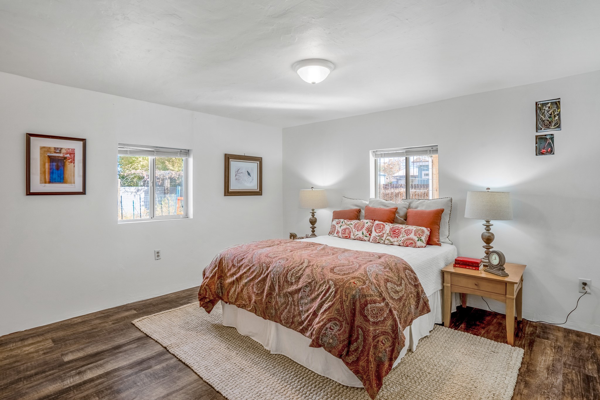 Price Reduction and Move-in ready, WOW! Mature trees surround the sweet home for privacy. With over 1700+/- square feet, three bedrooms, two baths, plenty of storage, a woodburning fireplace, and a pellet stove, this home is move-in ready, with public utilities, acequia water rights, and plenty of room for gardening and outdoor enjoyment. This is genuinely a lovely lot. The backyard backs to Hacienda Home Improvement Center, and bob-wire fencing between the two properties is a plus for security. The home needs some updating. The heating source is the pellet stove in the kitchen. This home's location is very desirable. The time to buy is now! Schedule a showing today. The home is being sold "as is."