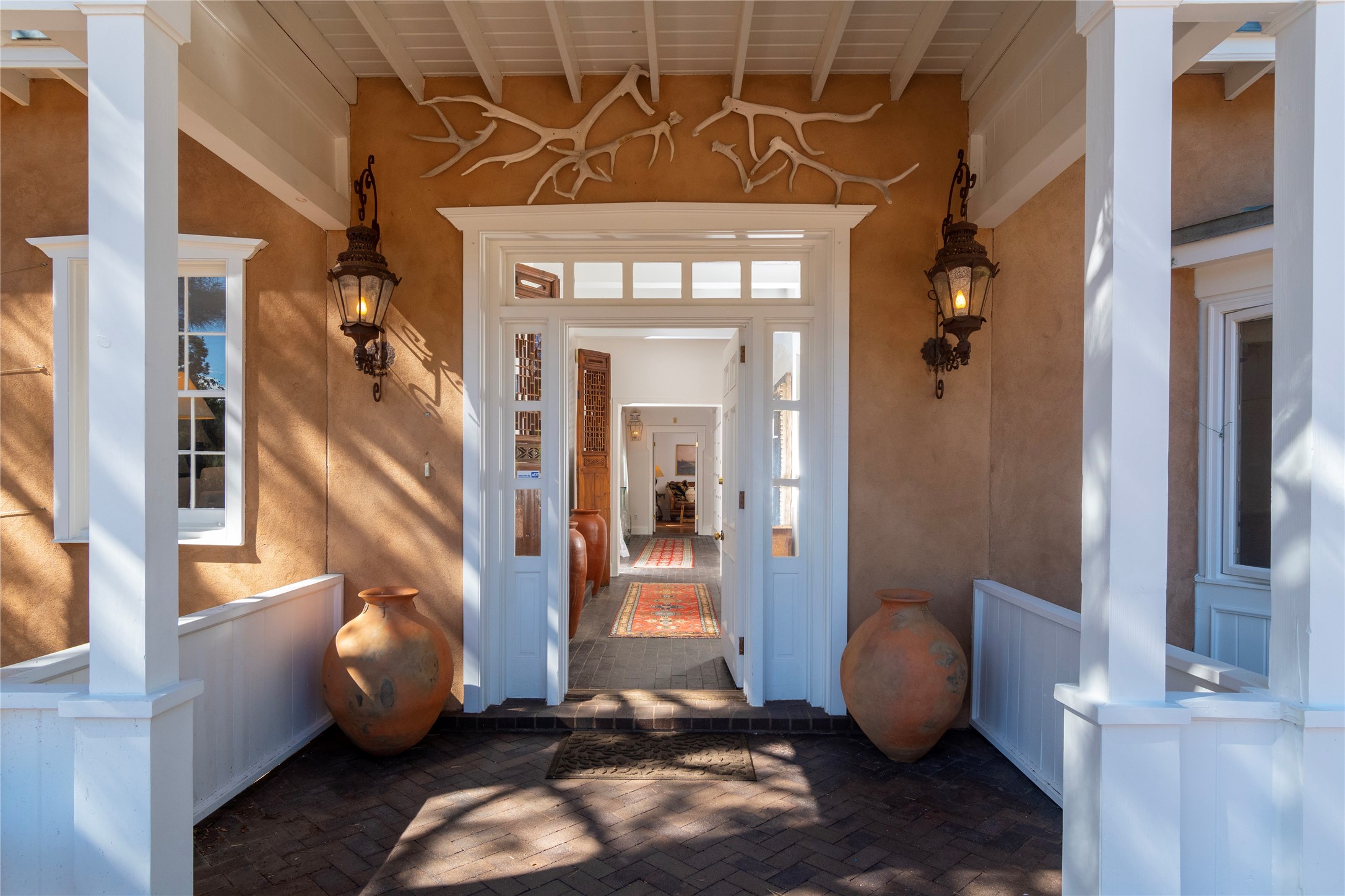 Nestled among mature trees, this classic New Mexico Territorial-style home rests on 2.788 acres of beautiful land with stellar views of Sangre de Cristo, Sandia and Ortiz Mountains. In the 3,600 sq. ft. main house a long, lovely, bricked entry hallway connects many of the rooms. Here there are 3 bedrooms, 4 bathrooms, separate office, living room, formal dining room, and a good-sized eat-in kitchen. The quiet, primary bedroom suite has a media room, full walk-in closet and private portal. There are 6 fireplaces, including one on a wide portal off the living room, so nearly every room is warm and inviting on cold winter nights. There are several portals to enjoy the views and the great Northern New Mexico weather. The guest house (753 sq. ft.) is a one bedroom, one bath home with a living/dining room, separate kitchen, and private patio. A covered brick walkway leads from the two houses to a 2-car garage. Nearby, a 1,059 sq. ft. detached garage/studio stands alone just waiting to make your dreams come true as a studio, shop, or an antique car showroom. Privately located in the historic Eastside of Santa Fe this home is just minutes from hiking trails, Museum Hill, Canyon Road and the Downtown Plaza.