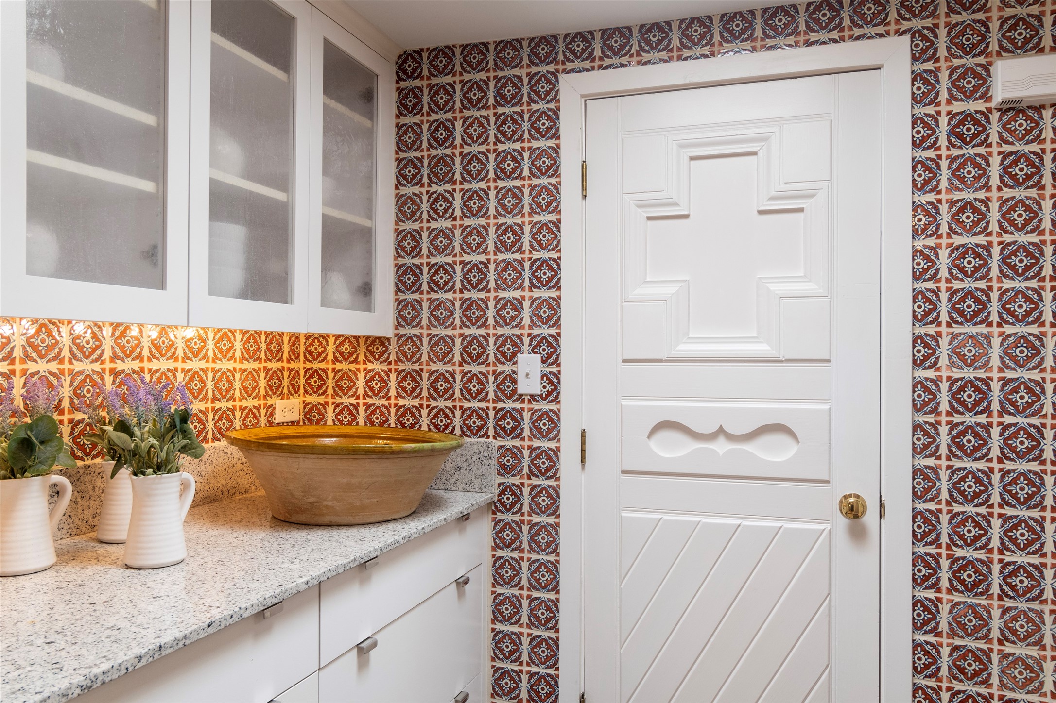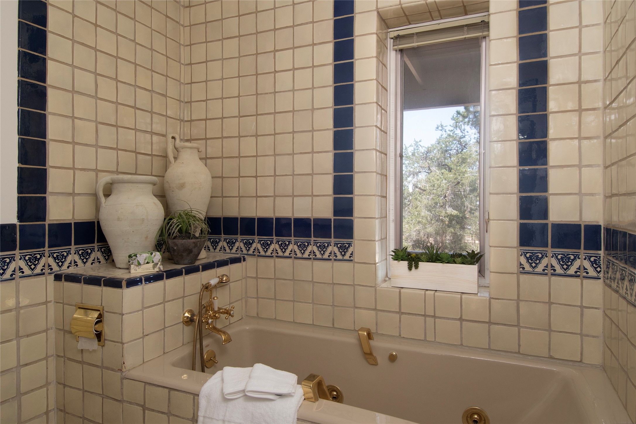 Nestled among mature trees, this classic New Mexico Territorial-style home rests on 2.788 acres of beautiful land with stellar views of Sangre de Cristo, Sandia and Ortiz Mountains. In the 3,600 sq. ft. main house a long, lovely, bricked entry hallway connects many of the rooms. Here there are 3 bedrooms, 4 bathrooms, separate office, living room, formal dining room, and a good-sized eat-in kitchen. The quiet, primary bedroom suite has a media room, full walk-in closet and private portal. There are 6 fireplaces, including one on a wide portal off the living room, so nearly every room is warm and inviting on cold winter nights. There are several portals to enjoy the views and the great Northern New Mexico weather. The guest house (753 sq. ft.) is a one bedroom, one bath home with a living/dining room, separate kitchen, and private patio. A covered brick walkway leads from the two houses to a 2-car garage. Nearby, a 1,059 sq. ft. detached garage/studio stands alone just waiting to make your dreams come true as a studio, shop, or an antique car showroom. Privately located in the historic Eastside of Santa Fe this home is just minutes from hiking trails, Museum Hill, Canyon Road and the Downtown Plaza.