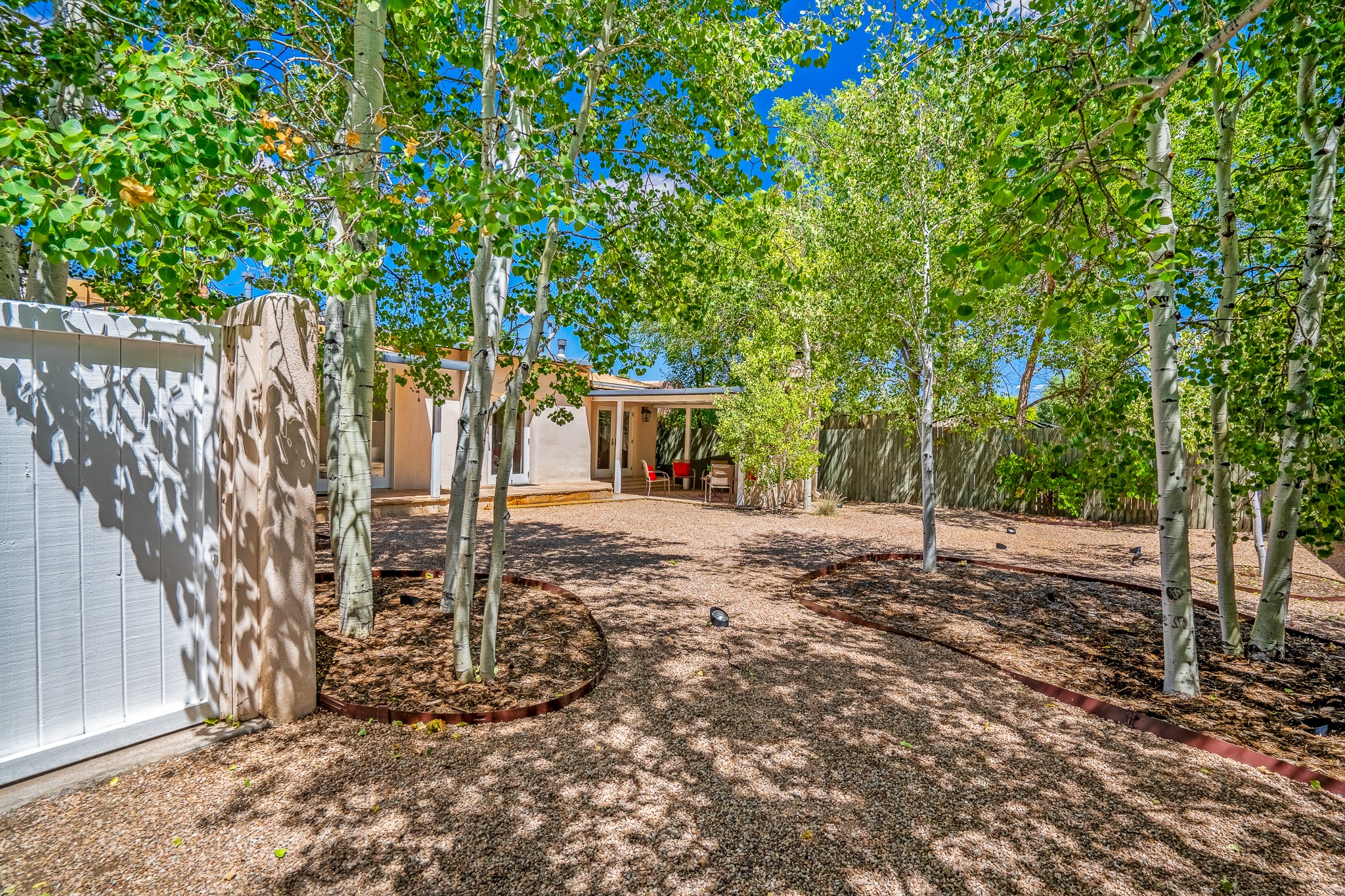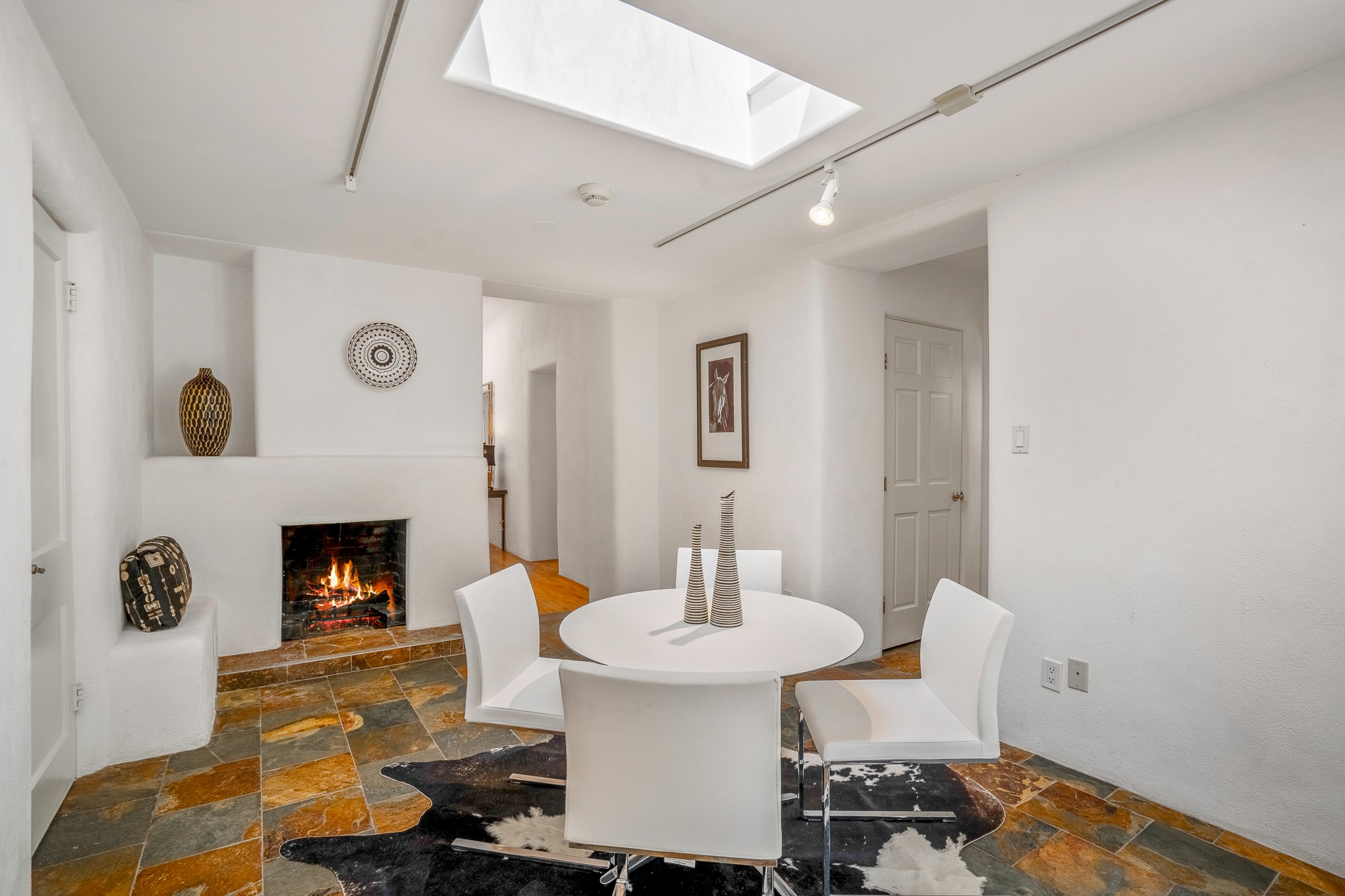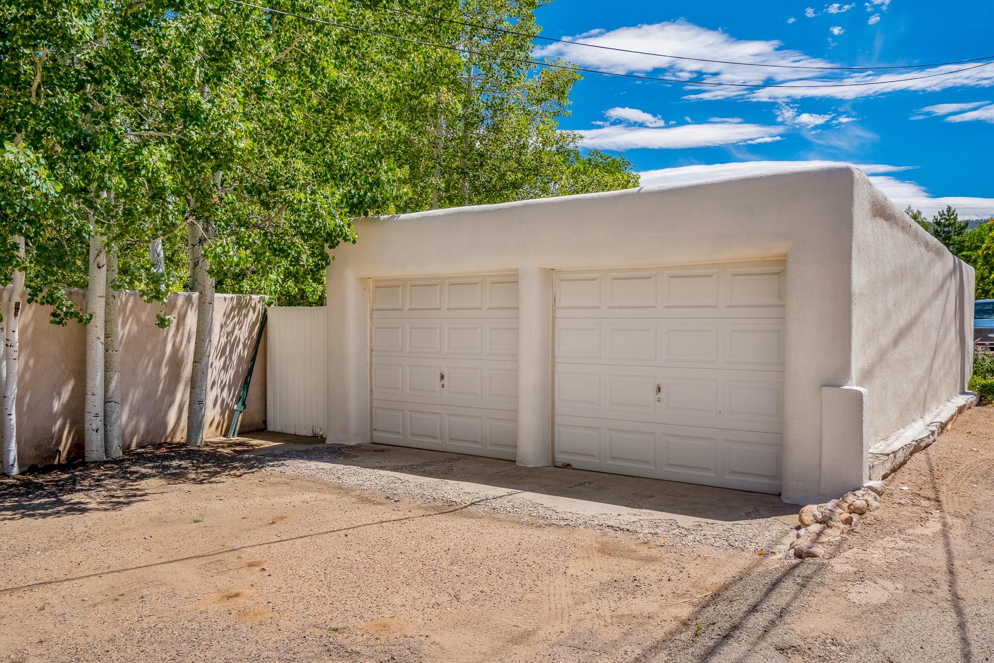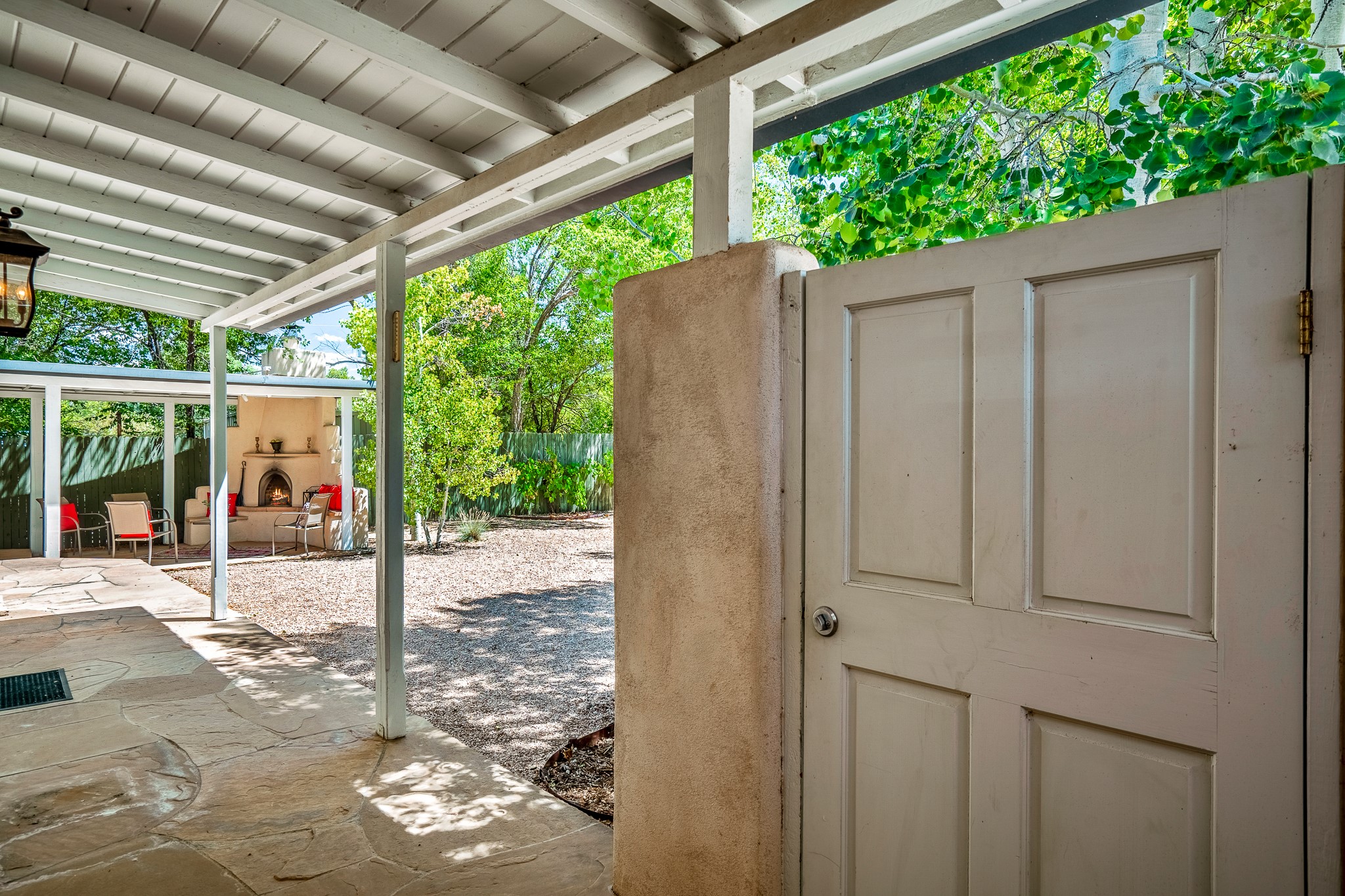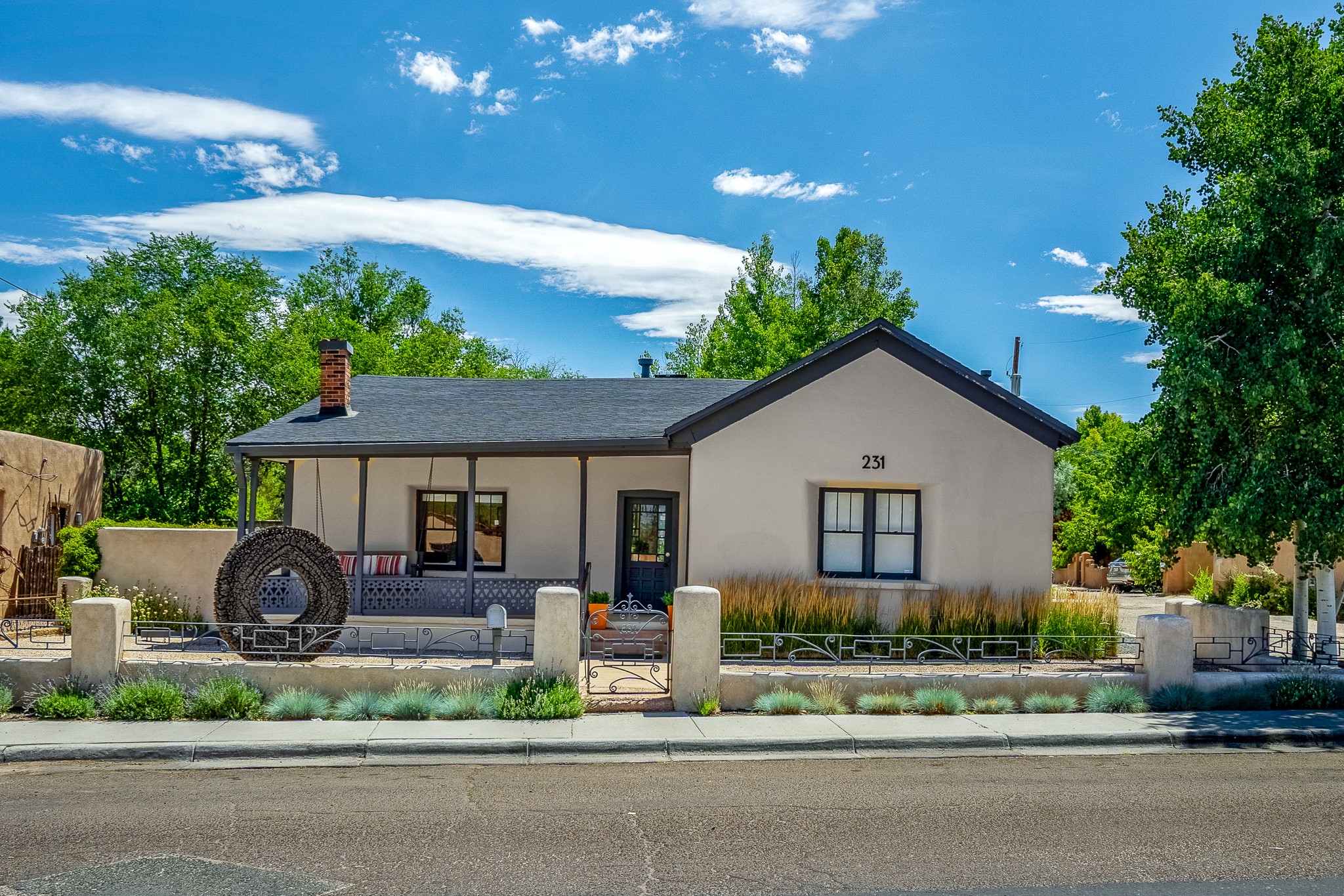 Welcome to 231 Delgado Street, a captivating piece of Santa Fe's rich history. As you step into this charming home, you'll instantly feel its warm embrace and imagine the endless possibilities it offers. Located within 200' of Canyon but without the busy traffic of Canyon Road. Adobe walls, multiple fireplaces, hardwood and slate tile flooring bring out the old-world charm. High ceilings and an entry foyer welcome you into the +/-2,389 square foot floor plan. The three bedrooms and one and a half bathrooms give a sense of space and comfort. The main rooms include the living room, dining room, kitchen and two additional rooms to be modified into bedrooms or flex/office spaces providing the opportunity for you to unleash your creative spirit and showcase your collections. Step outside to experience the tranquility of the outdoor spaces. Imagine cozying up to the wood-burning kiva in the rear portal, or sitting on the porch swing enjoying the sunset. The rear courtyard is accessible through three sets of French doors, adorned with mature aspen trees, giving you a private hideaway. Parking includes a two-car garage, driveway parking, and city on-street parking. A hidden gem lies in the 6,000+/- square foot residential lot just behind the garage, presenting an opportunity to add another home, or a guest house.** It's worth noting that this property is recognized as a contributing structure within the Santa Fe historic district, a testament to its timeless appeal and significance. Imagine being at the heart of the city, close to downtown, the Santa Fe River, and the renowned Canyon Road. Embrace the vibrant art community, and walk to the finest art galleries and dining experiences in town. Embrace the Santa Fe lifestyle and make this abode your own or design the next stunning gallery and let it be a testament to exceptional taste and appreciation for Santa Fe's beauty and culture. **Subject to city approval for development and/or lot split
