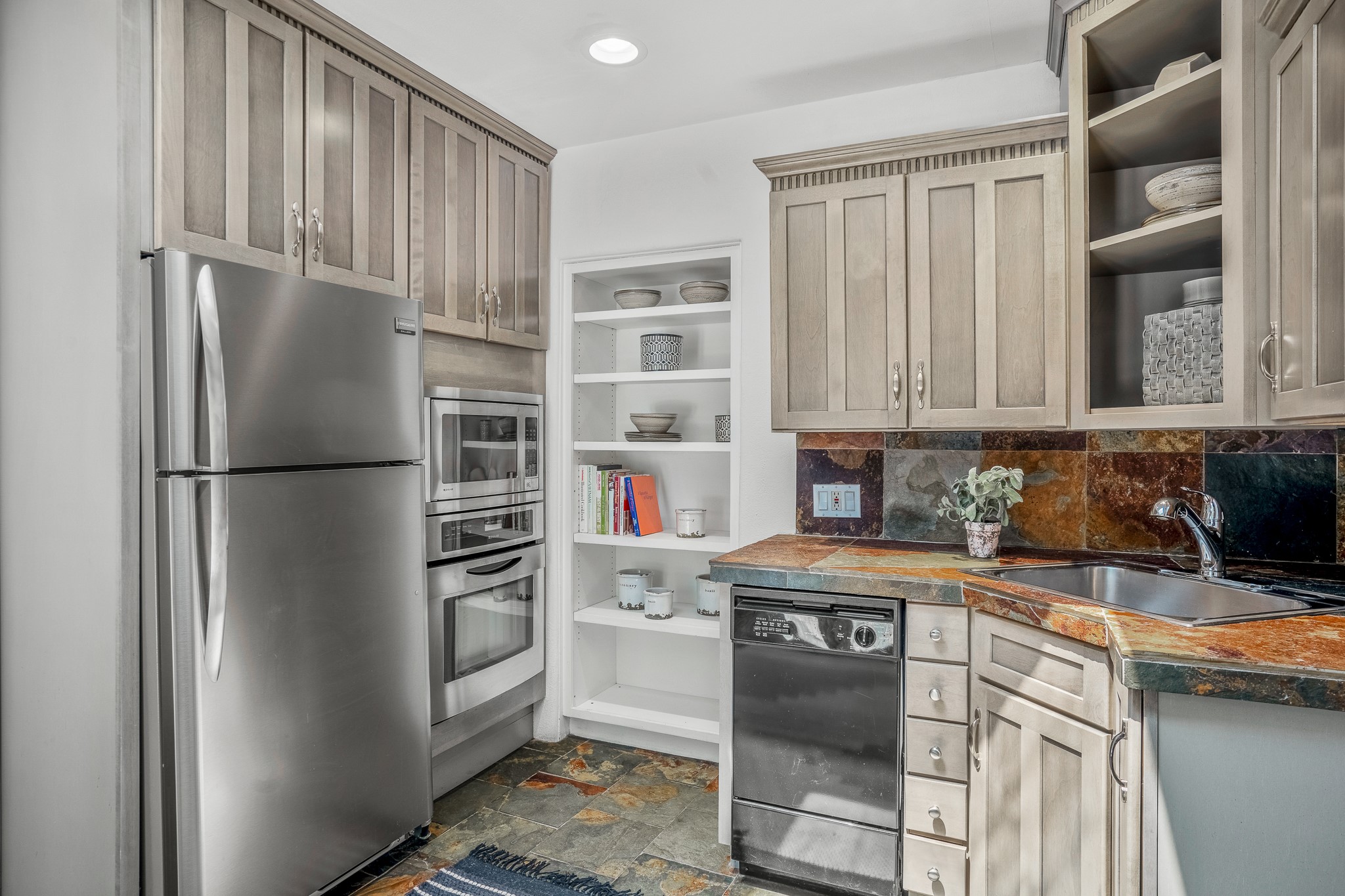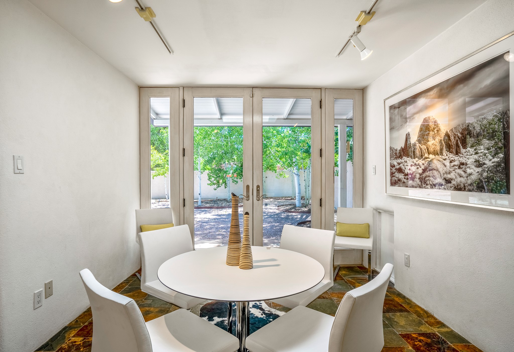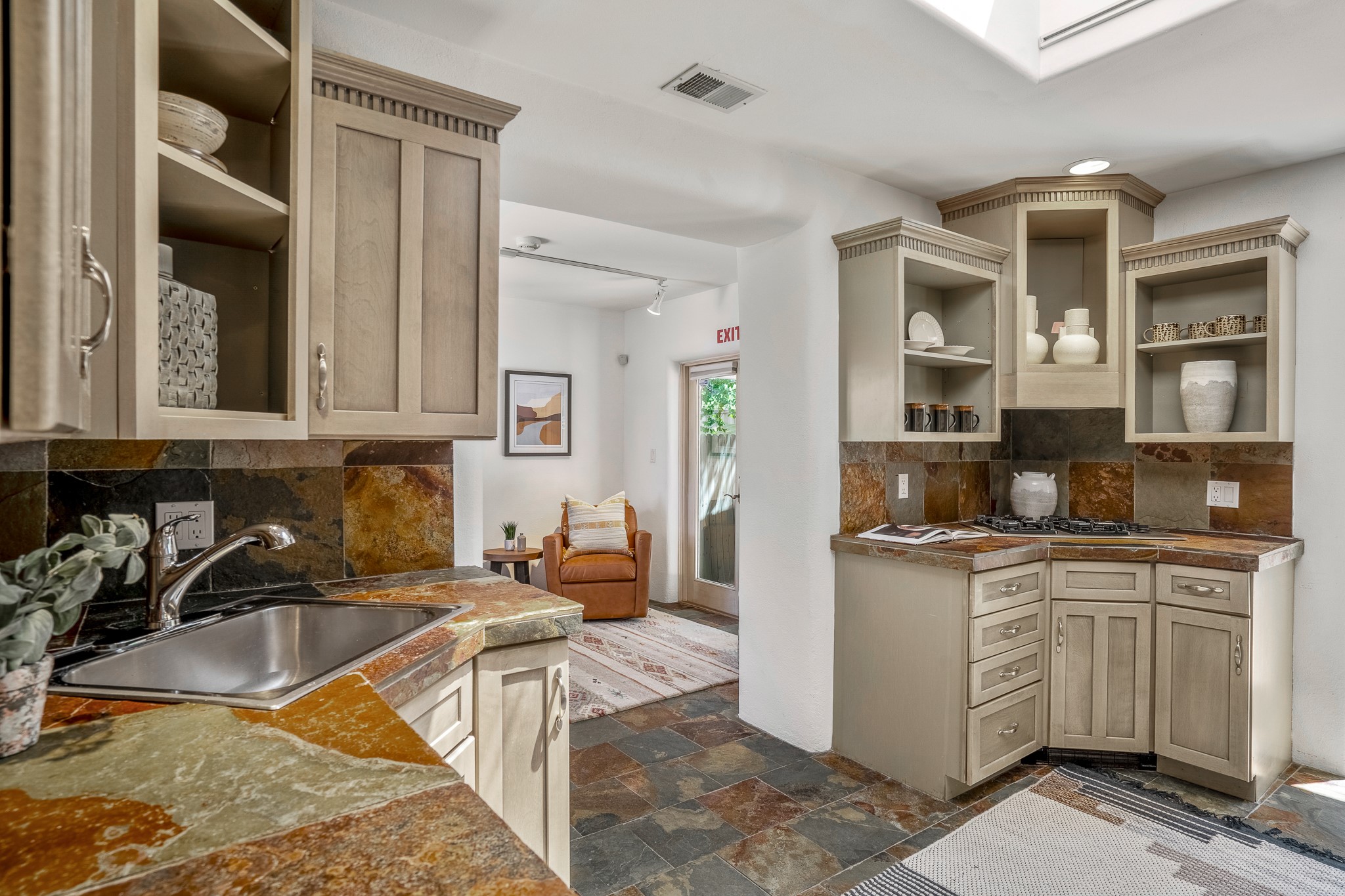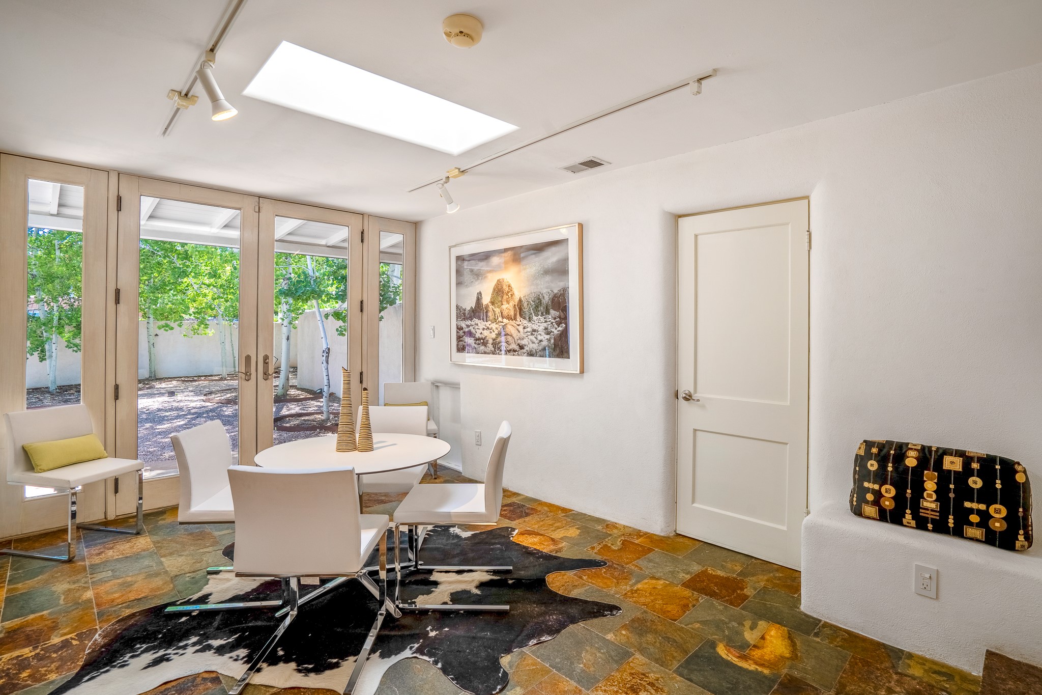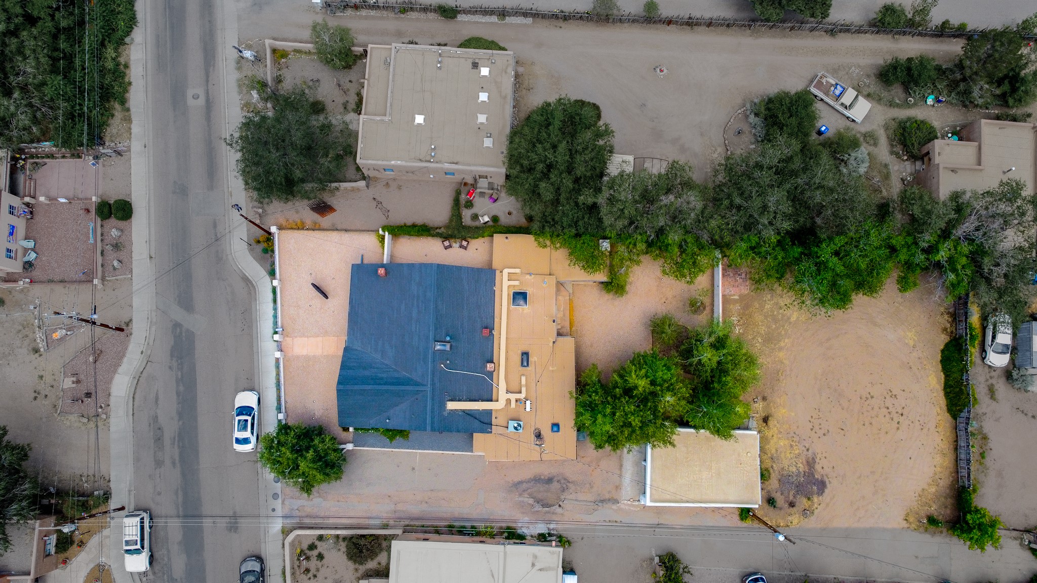 Welcome to 231 Delgado Street, a captivating piece of Santa Fe's rich history. As you step into this charming home, you'll instantly feel its warm embrace and imagine the endless possibilities it offers. Located within 200' of Canyon but without the busy traffic of Canyon Road. Adobe walls, multiple fireplaces, hardwood and slate tile flooring bring out the old-world charm. High ceilings and an entry foyer welcome you into the +/-2,389 square foot floor plan. The three bedrooms and one and a half bathrooms give a sense of space and comfort. The main rooms include the living room, dining room, kitchen and two additional rooms to be modified into bedrooms or flex/office spaces providing the opportunity for you to unleash your creative spirit and showcase your collections. Step outside to experience the tranquility of the outdoor spaces. Imagine cozying up to the wood-burning kiva in the rear portal, or sitting on the porch swing enjoying the sunset. The rear courtyard is accessible through three sets of French doors, adorned with mature aspen trees, giving you a private hideaway. Parking includes a two-car garage, driveway parking, and city on-street parking. A hidden gem lies in the 6,000+/- square foot residential lot just behind the garage, presenting an opportunity to add another home, or a guest house.** It's worth noting that this property is recognized as a contributing structure within the Santa Fe historic district, a testament to its timeless appeal and significance. Imagine being at the heart of the city, close to downtown, the Santa Fe River, and the renowned Canyon Road. Embrace the vibrant art community, and walk to the finest art galleries and dining experiences in town. Embrace the Santa Fe lifestyle and make this abode your own or design the next stunning gallery and let it be a testament to exceptional taste and appreciation for Santa Fe's beauty and culture. **Subject to city approval for development and/or lot split