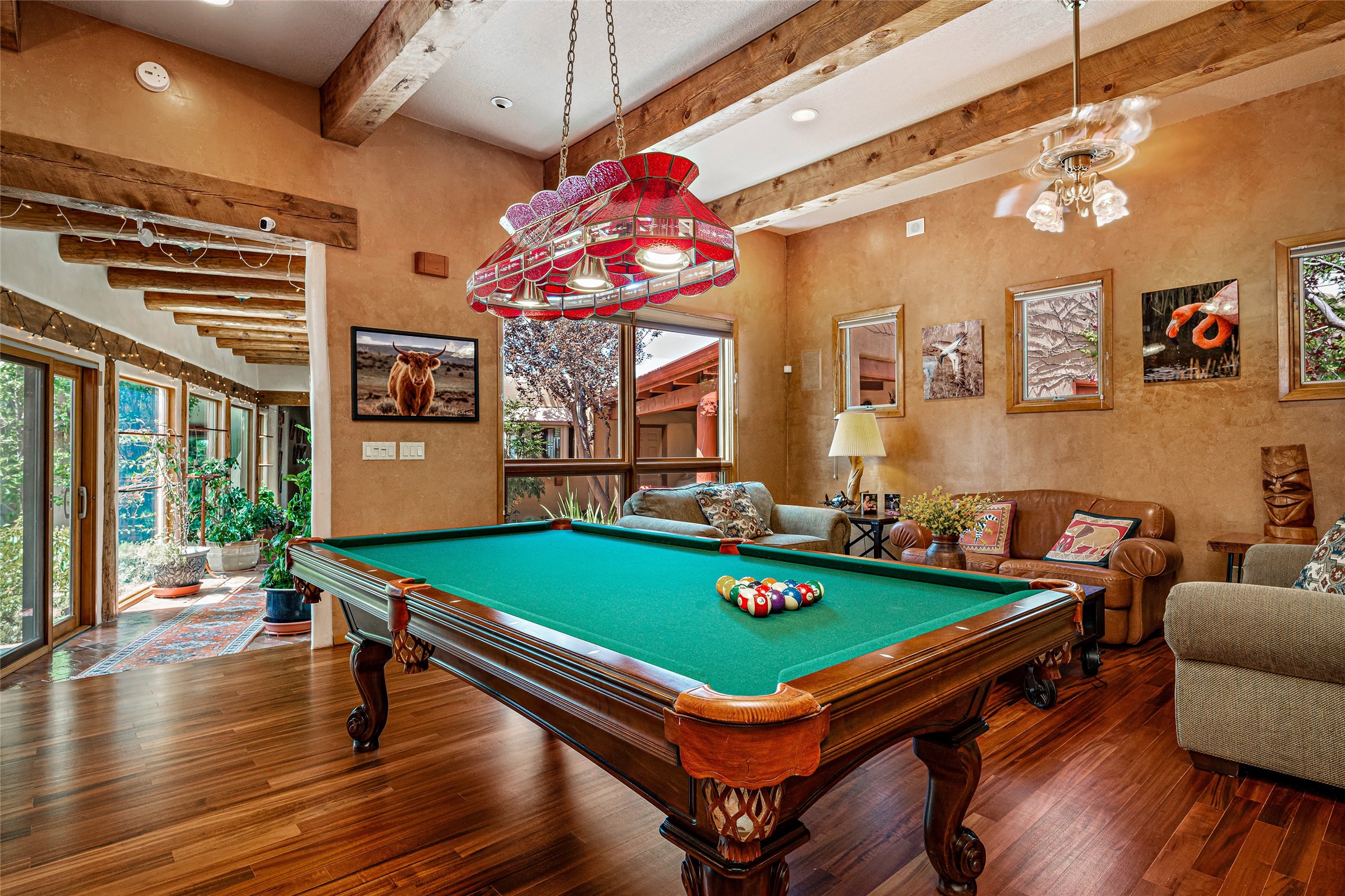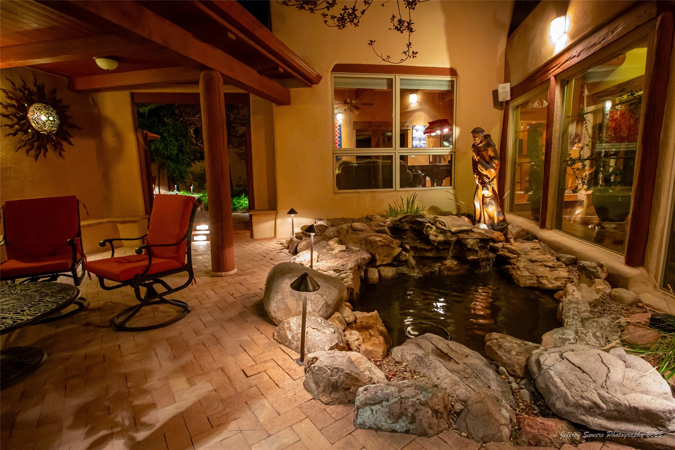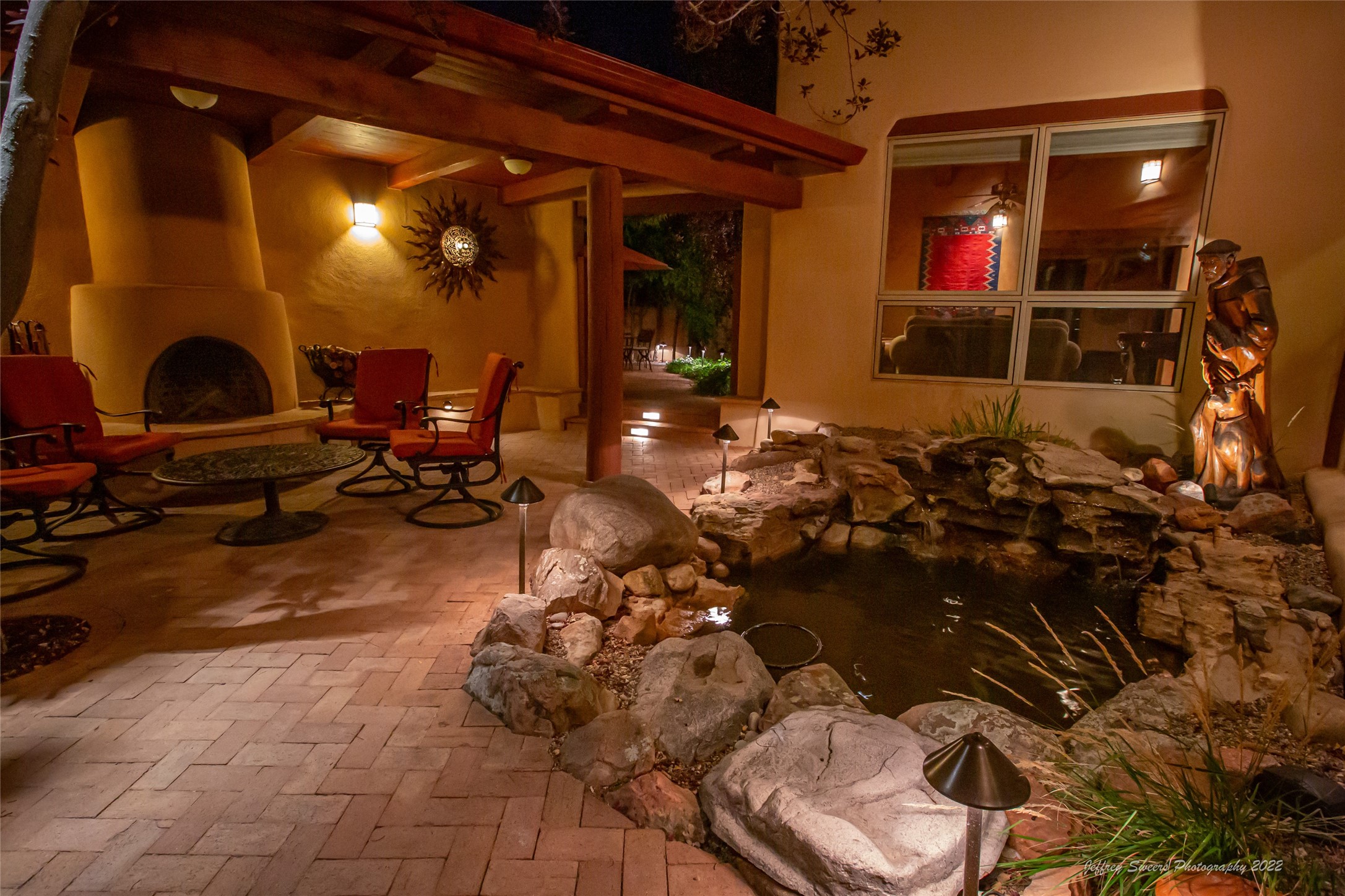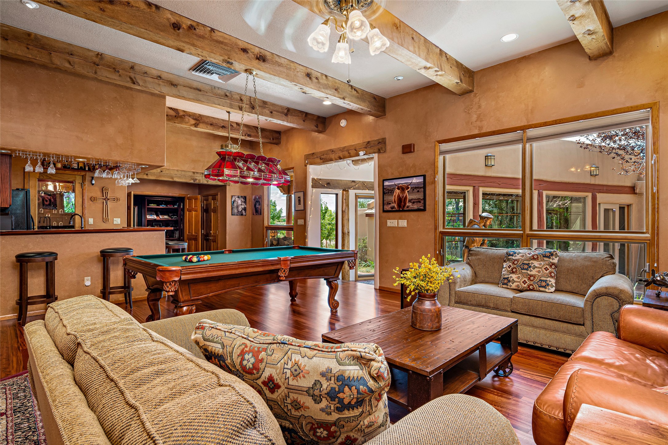 Beautiful well cared-for home offers lots of spaces for almost every function one might need! Charming comfortable living room with kiva fireplace, formal dining room, casual dining in remodeled kitchen, big den with wet bar and wine cellar, fabulous media room is the real deal, five bedrooms, three full baths, and delightful outdoor living areas include a patio with rock waterfall and Koi pond, portal with kiva fireplace, and a lovely patio dining area. There are five bays in three finished garages, one of which is currently a studio/workshop. Play volleyball in an officially sized sand court or toss some horseshoes! Two brand new modern-efficiency evaporative air conditioners, recently serviced boilers for two radiant heating systems, two hot water tanks, new stucco, and roof is well-maintained in good condition. Electricity is totally supplied by an owned, rooftop-mounted, solar photovoltaic system. An exceptional Eldorado home!