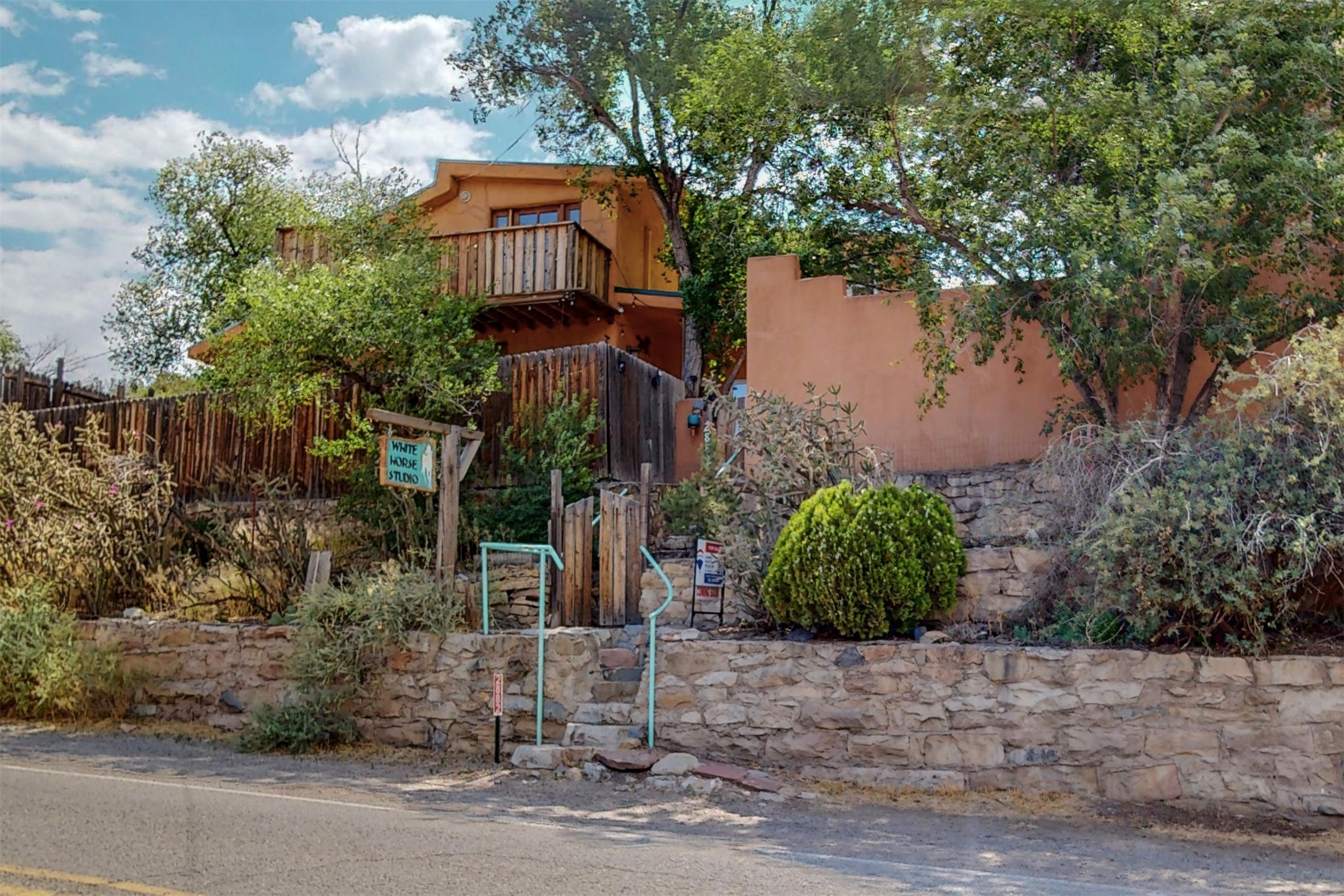 What an incredible find! This beautiful Madrid home is an artist's dream, offering both residential and commercial potential on two side by side lots. The charming home sits up high, right on the Turquoise Trail. The large deck out front offers great entertainment potential with wonderful views and lots of privacy. This home offers an open floorplan, including a large kitchen, a bedroom and office downstairs, and a large master suite with a walk in closet upstairs. There is plenty of natural light, as well as a whole home water filtration system, including reverse osmosis under the kitchen sink. The large side yard is tastefully landscaped and has a small outbuilding, perfect for an artist studio or gallery. Access and offstreet parking is available off of Ice House Rd.