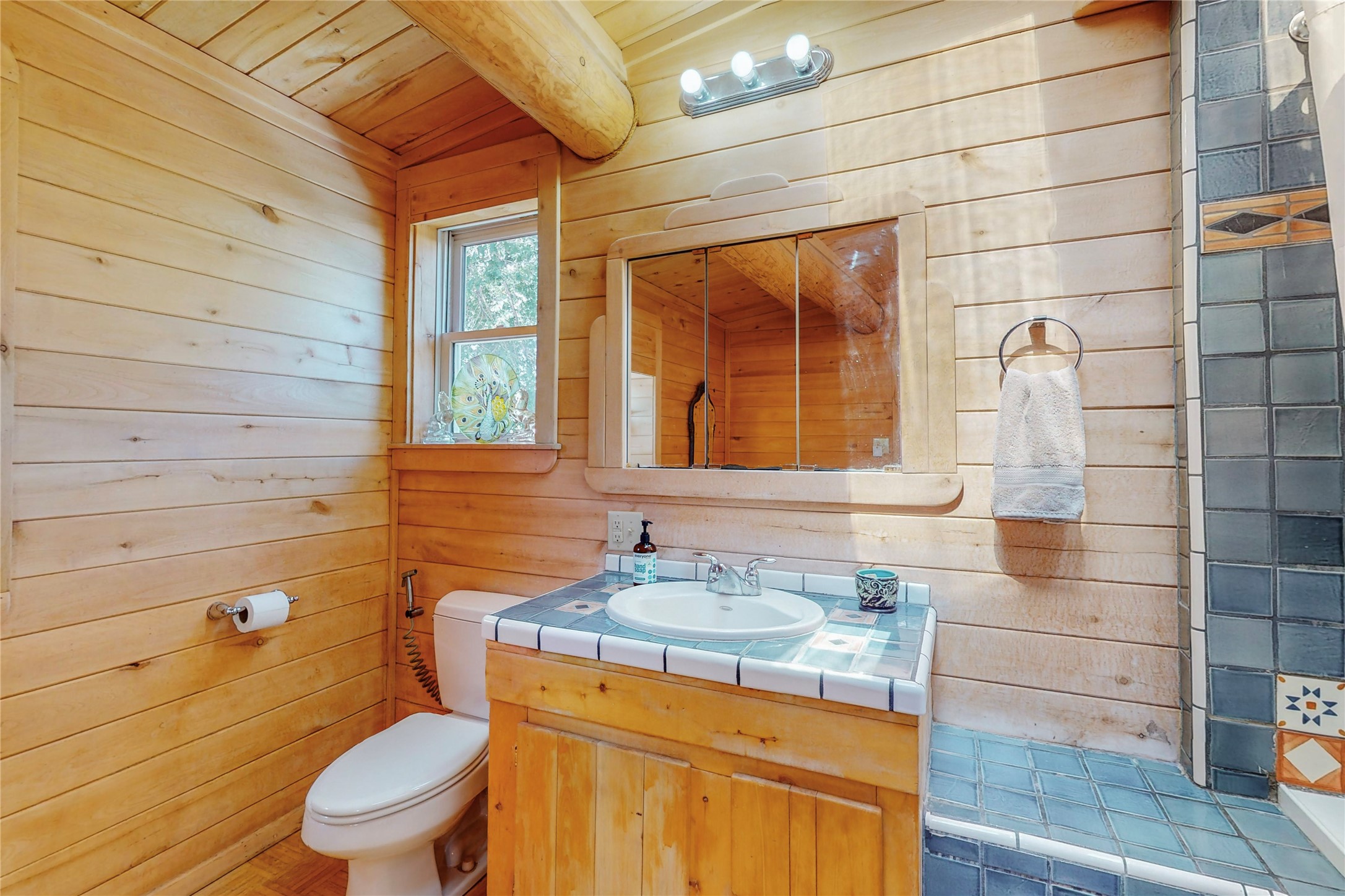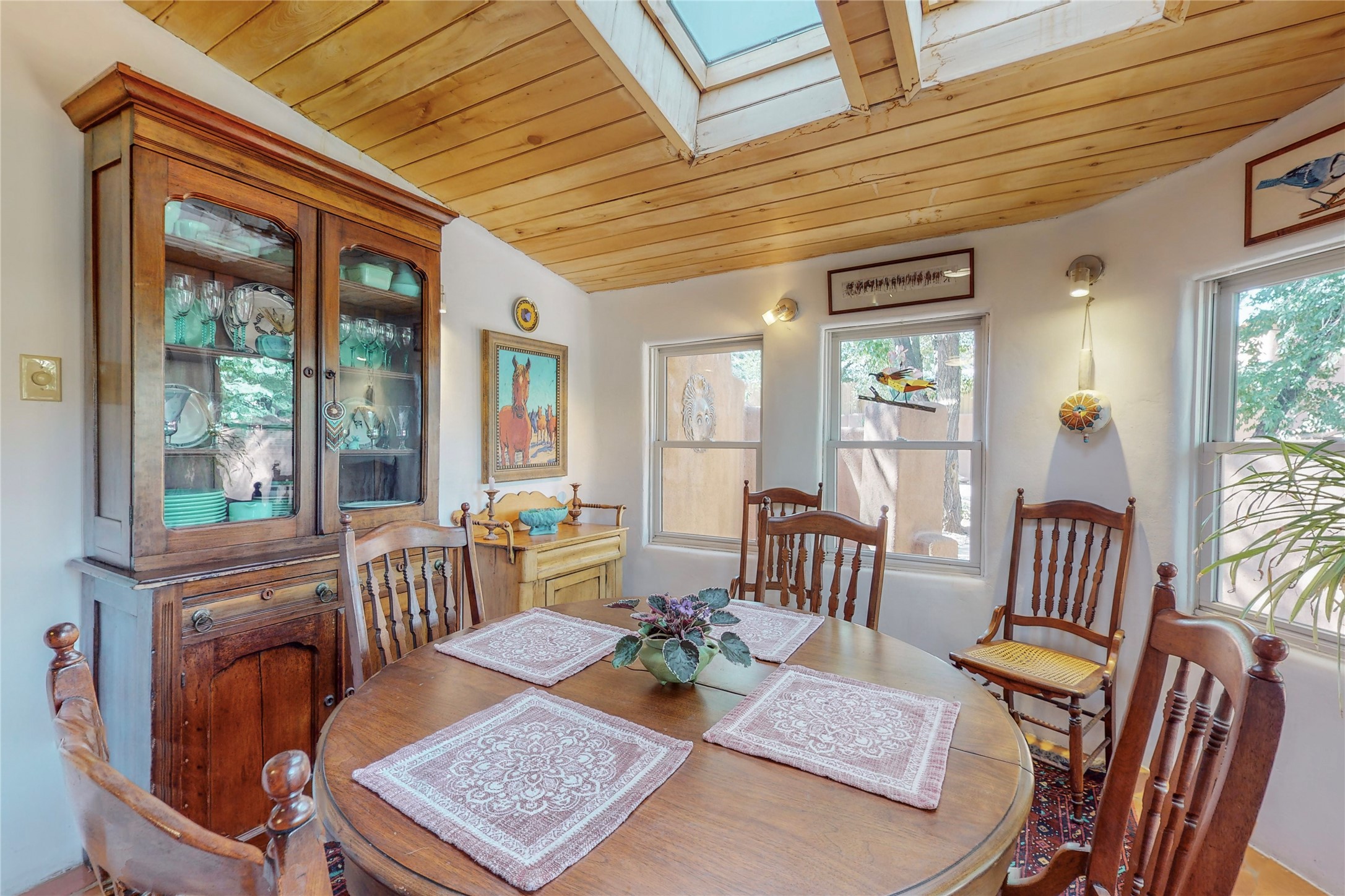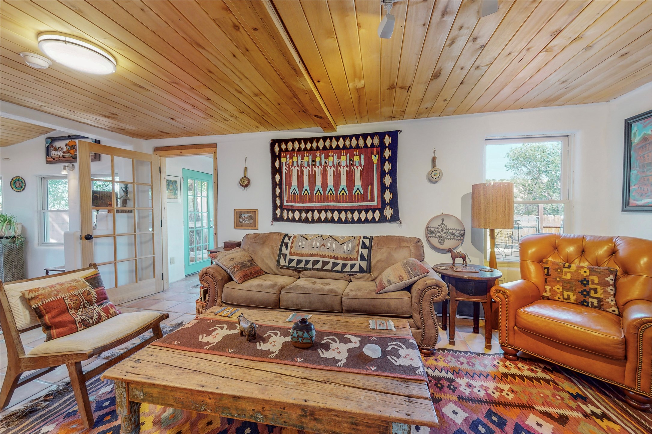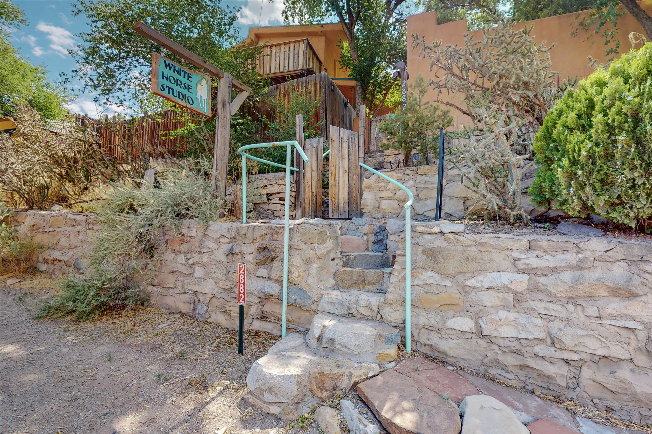 What an incredible find! This beautiful Madrid home is an artist's dream, offering both residential and commercial potential on two side by side lots. The charming home sits up high, right on the Turquoise Trail. The large deck out front offers great entertainment potential with wonderful views and lots of privacy. This home offers an open floorplan, including a large kitchen, a bedroom and office downstairs, and a large master suite with a walk in closet upstairs. There is plenty of natural light, as well as a whole home water filtration system, including reverse osmosis under the kitchen sink. The large side yard is tastefully landscaped and has a small outbuilding, perfect for an artist studio or gallery. Access and offstreet parking is available off of Ice House Rd.