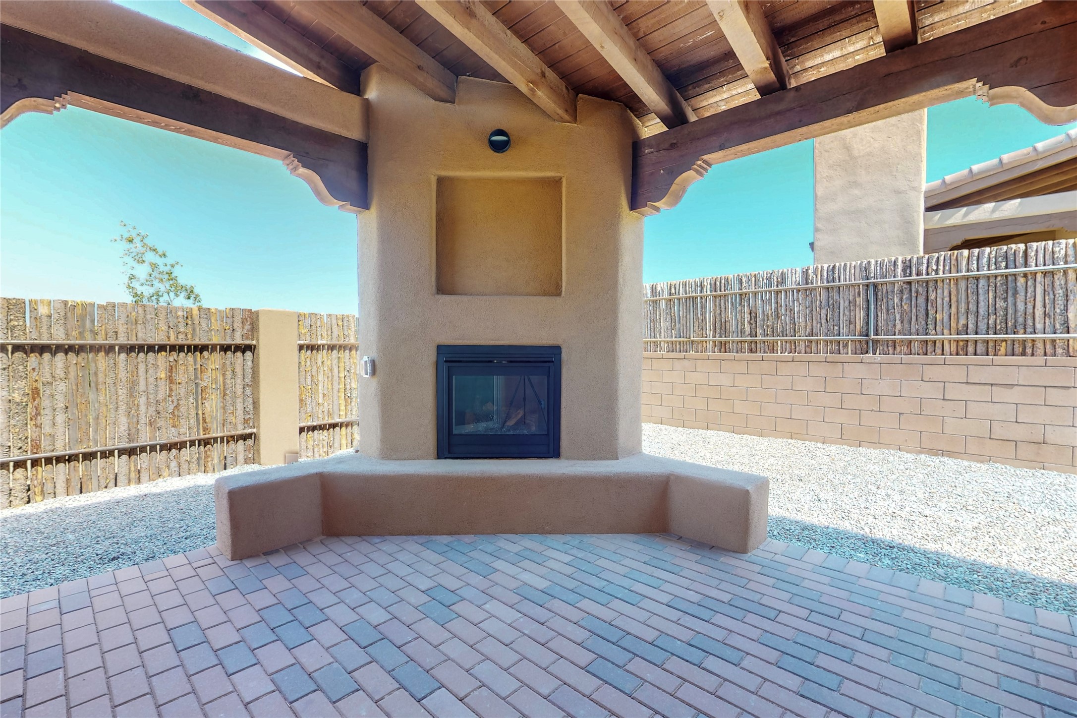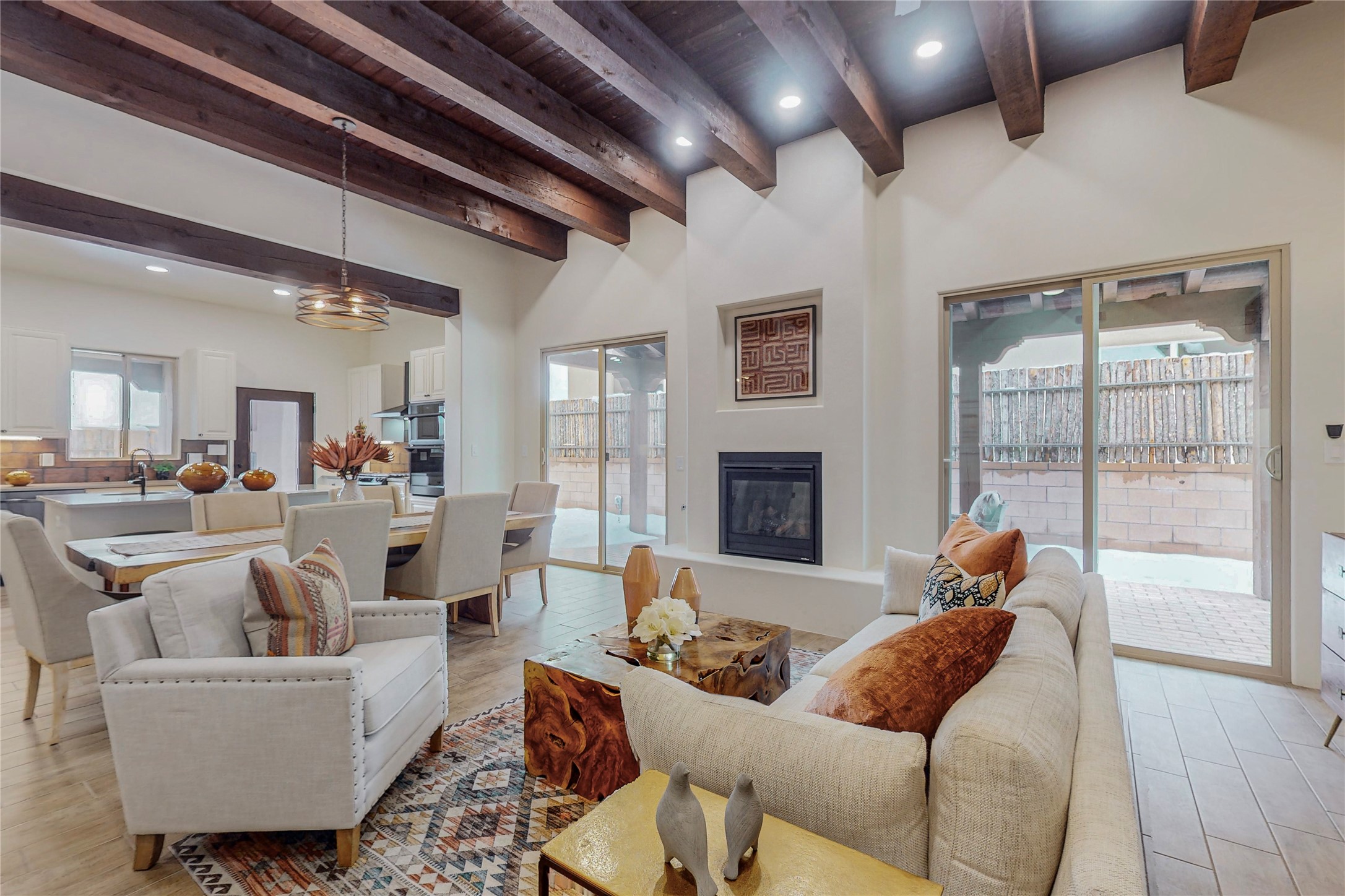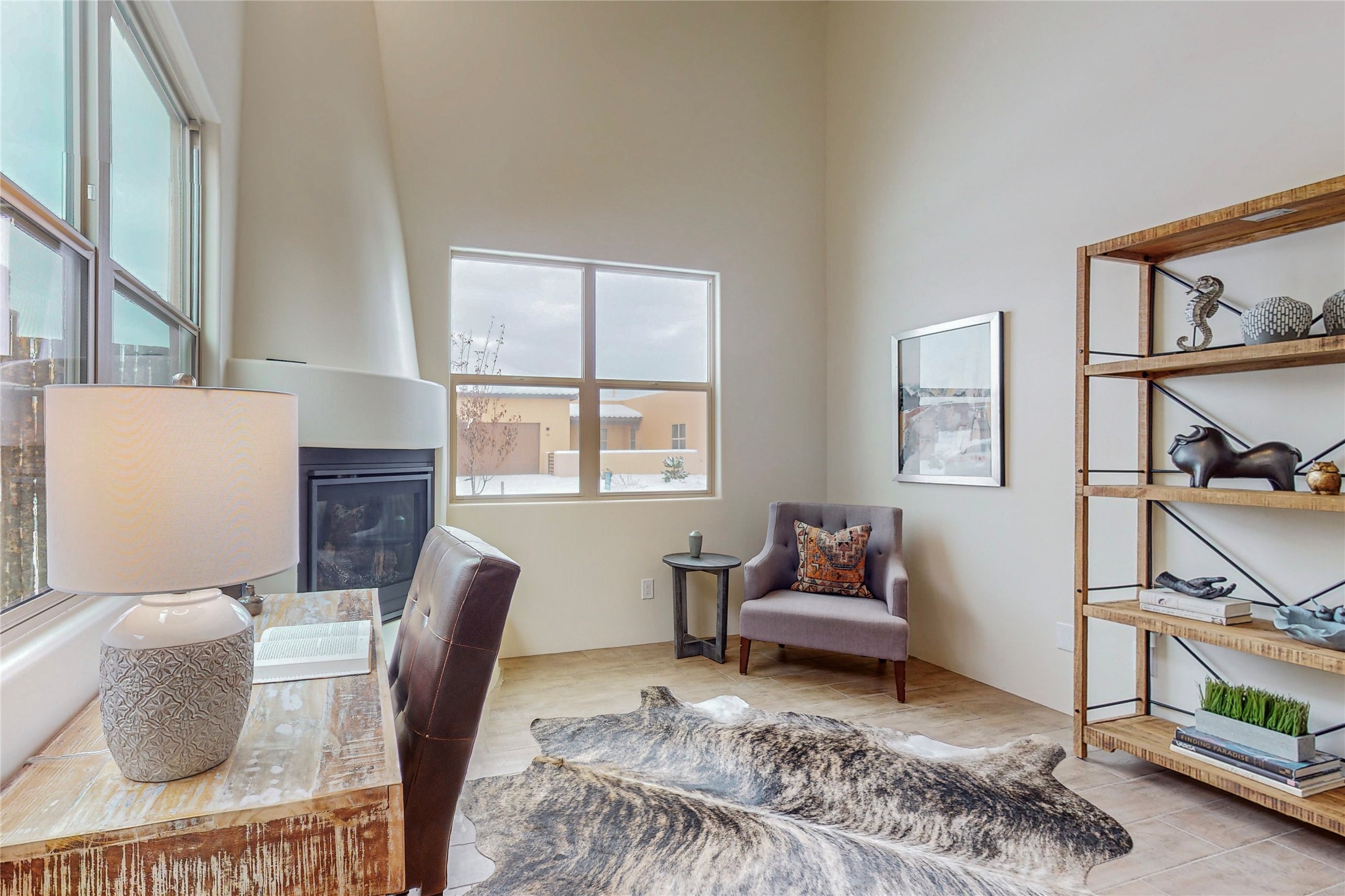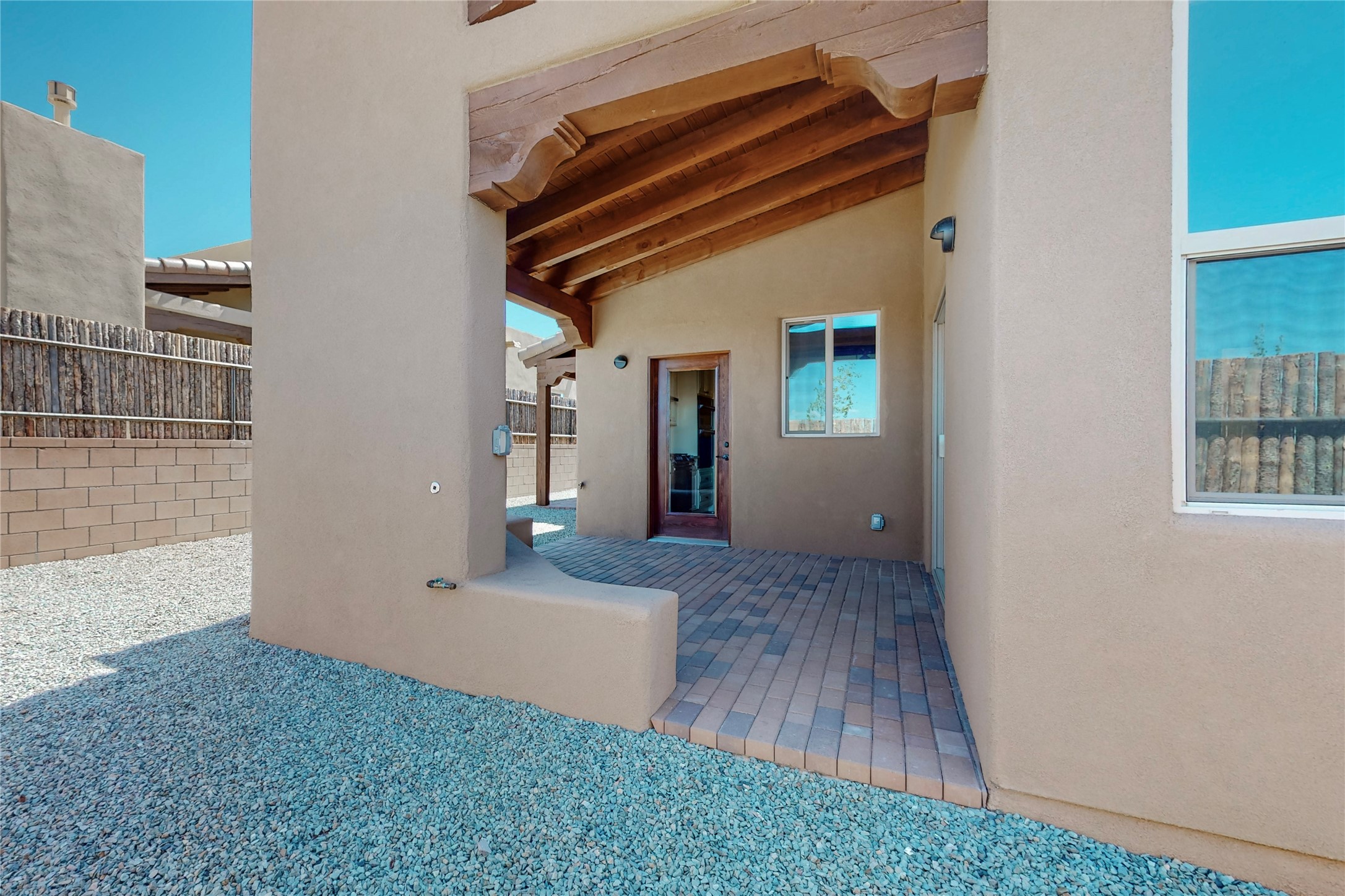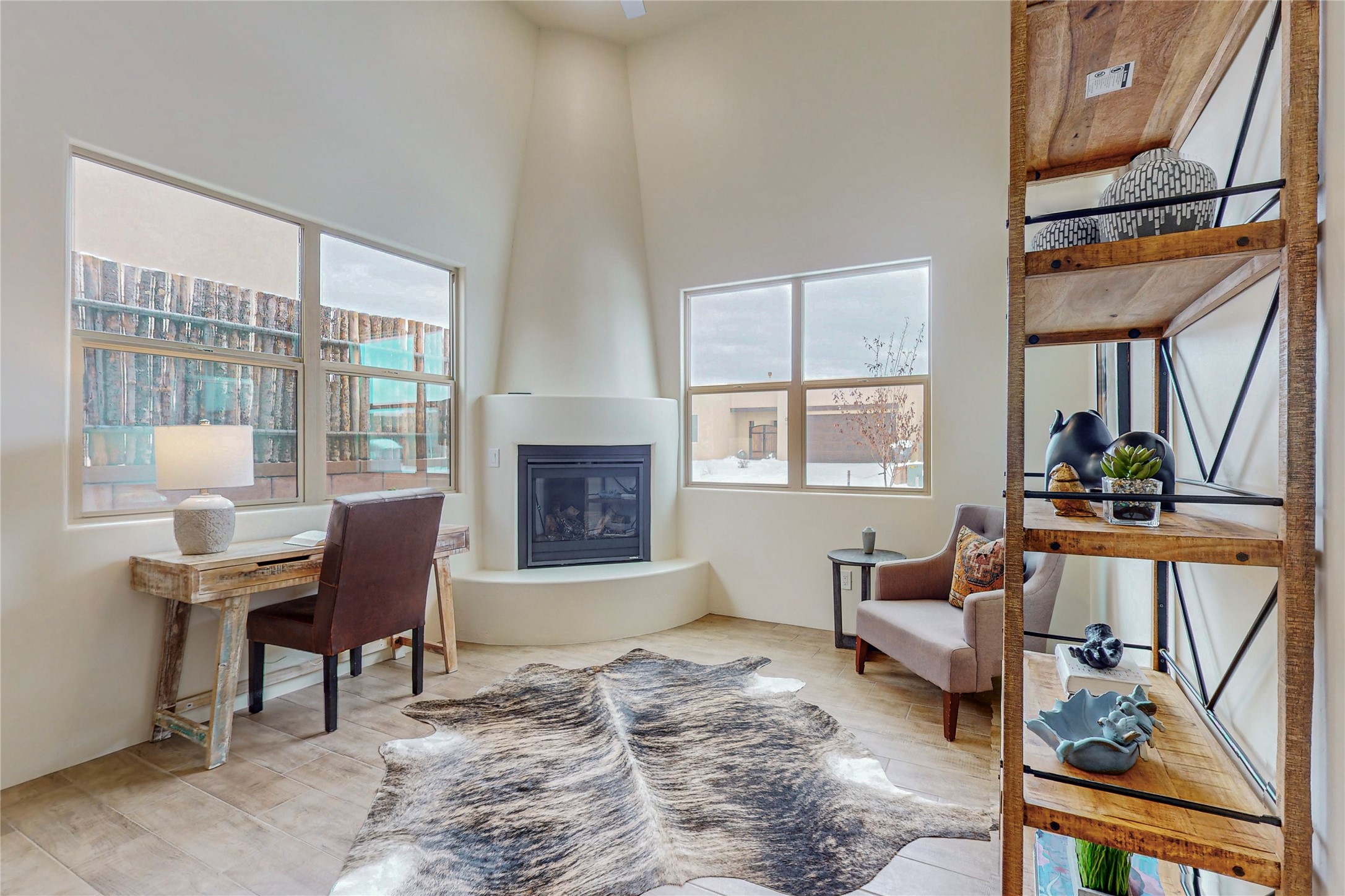 This powerful Santiago Plan is a 2239 sqft 3 bedroom, 4 bath home with three fireplaces, three bedrooms, each with ensuite baths, and a 3 car garage. Located at 31 Pinon Doblado in the La Pradera Subdivision, this home backs up to and is accessible to open space. Access to this home is through an 8 ft tall door that opens into a foyer with a 13-foot boveda ceiling. Immediately to the left is a powder room and an adjacent closet. To the right is a study/bedroom with a gas-fired kiva fireplace and a 3/34 bath. The living room has a 12-foot ceiling, dark, brown-stained wood beams with T&G trim and a fireplace. The open kitchen has walnut-colored cabinets. The kitchen and the guest bedroom open out to a covered portal with a gas fireplace and brick pavers. The floor tile is porcelain plank in a light brown wood-like tone. The owner's suite has an enormous walk-in closet (about 100 sqft) and the owner's bath has a skylight, a large walk-in shower with euro style shower fixtures, and an overhead rain shower head. the exterior is a pitched roof Spanish design with clay-concrete tile roofs and covered portals with heavy wood beams and brick pavers. The driveway is a color-stamped concrete design. The insulated three-car garage has two storage closets and an epoxy-coated floor.