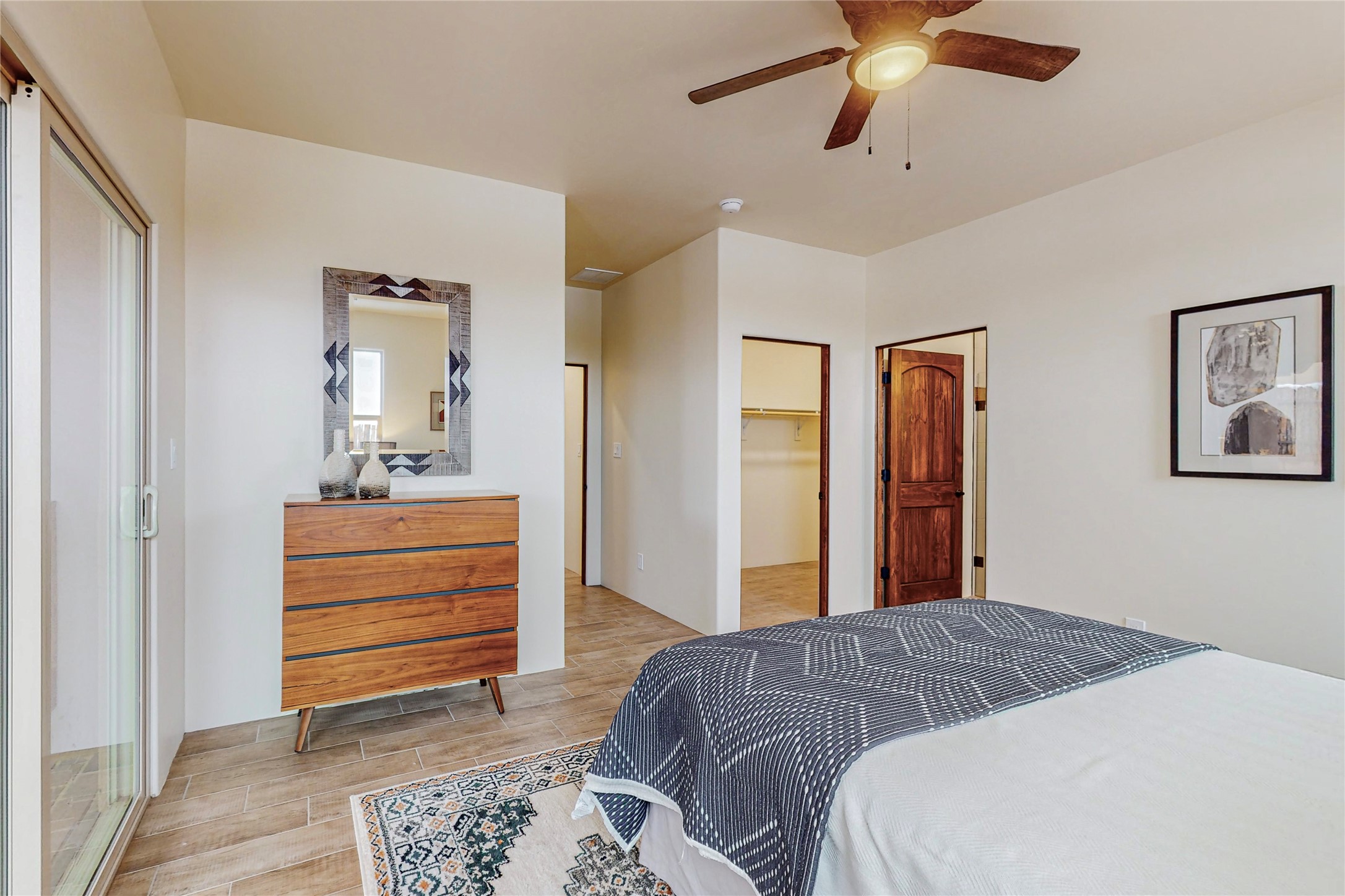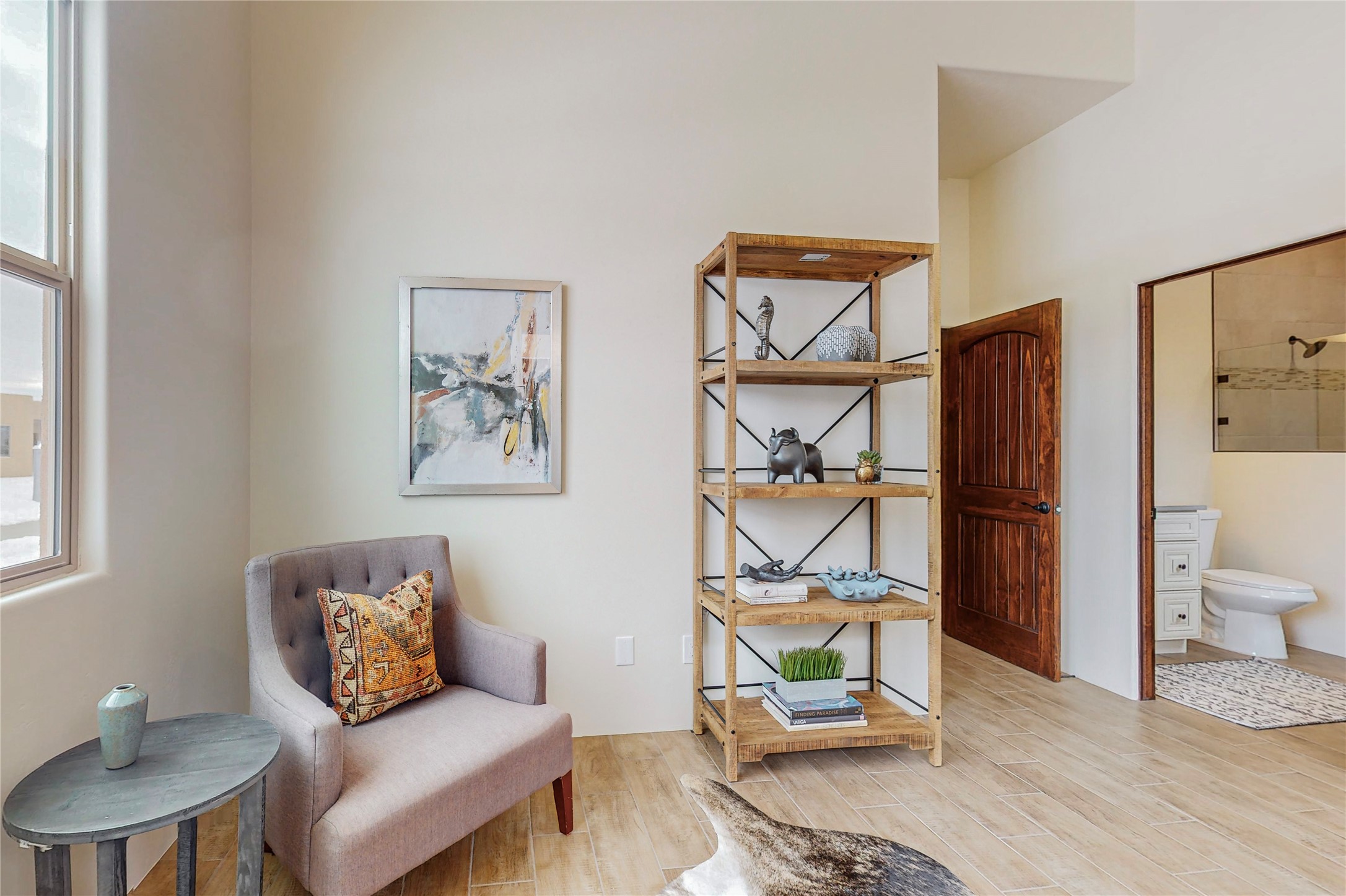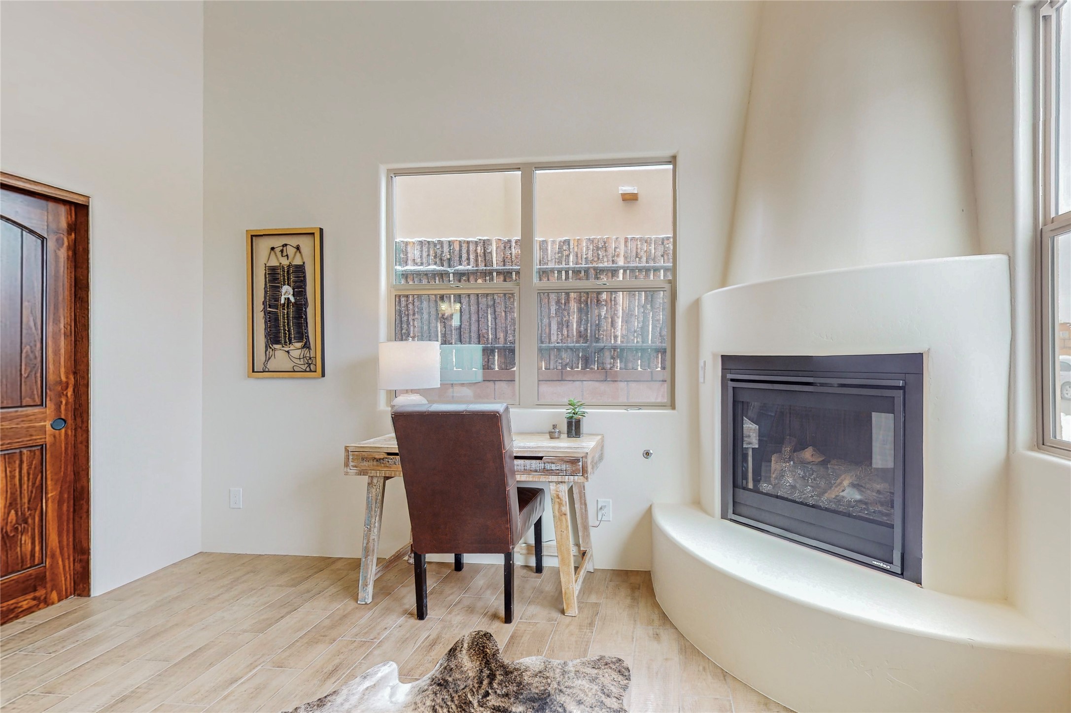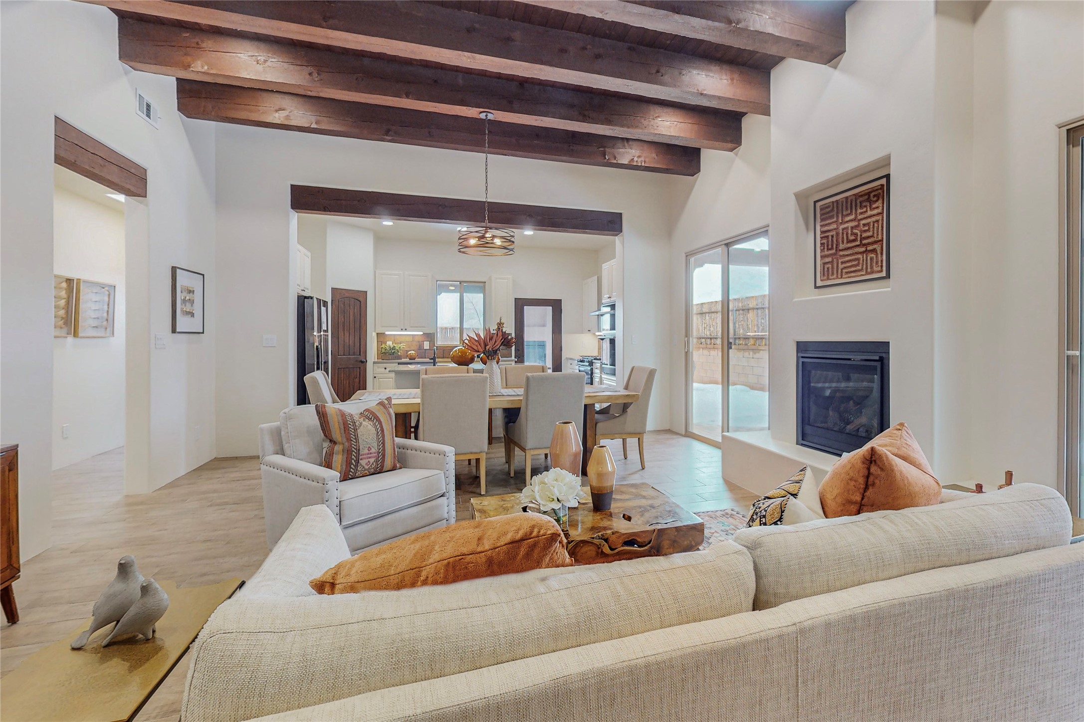 This powerful Santiago Plan is a 2239 sqft 3 bedroom, 4 bath home with three fireplaces, three bedrooms, each with ensuite baths, and a 3 car garage. Located at 31 Pinon Doblado in the La Pradera Subdivision, this home backs up to and is accessible to open space. Access to this home is through an 8 ft tall door that opens into a foyer with a 13-foot boveda ceiling. Immediately to the left is a powder room and an adjacent closet. To the right is a study/bedroom with a gas-fired kiva fireplace and a 3/34 bath. The living room has a 12-foot ceiling, dark, brown-stained wood beams with T&G trim and a fireplace. The open kitchen has walnut-colored cabinets. The kitchen and the guest bedroom open out to a covered portal with a gas fireplace and brick pavers. The floor tile is porcelain plank in a light brown wood-like tone. The owner's suite has an enormous walk-in closet (about 100 sqft) and the owner's bath has a skylight, a large walk-in shower with euro style shower fixtures, and an overhead rain shower head. the exterior is a pitched roof Spanish design with clay-concrete tile roofs and covered portals with heavy wood beams and brick pavers. The driveway is a color-stamped concrete design. The insulated three-car garage has two storage closets and an epoxy-coated floor.