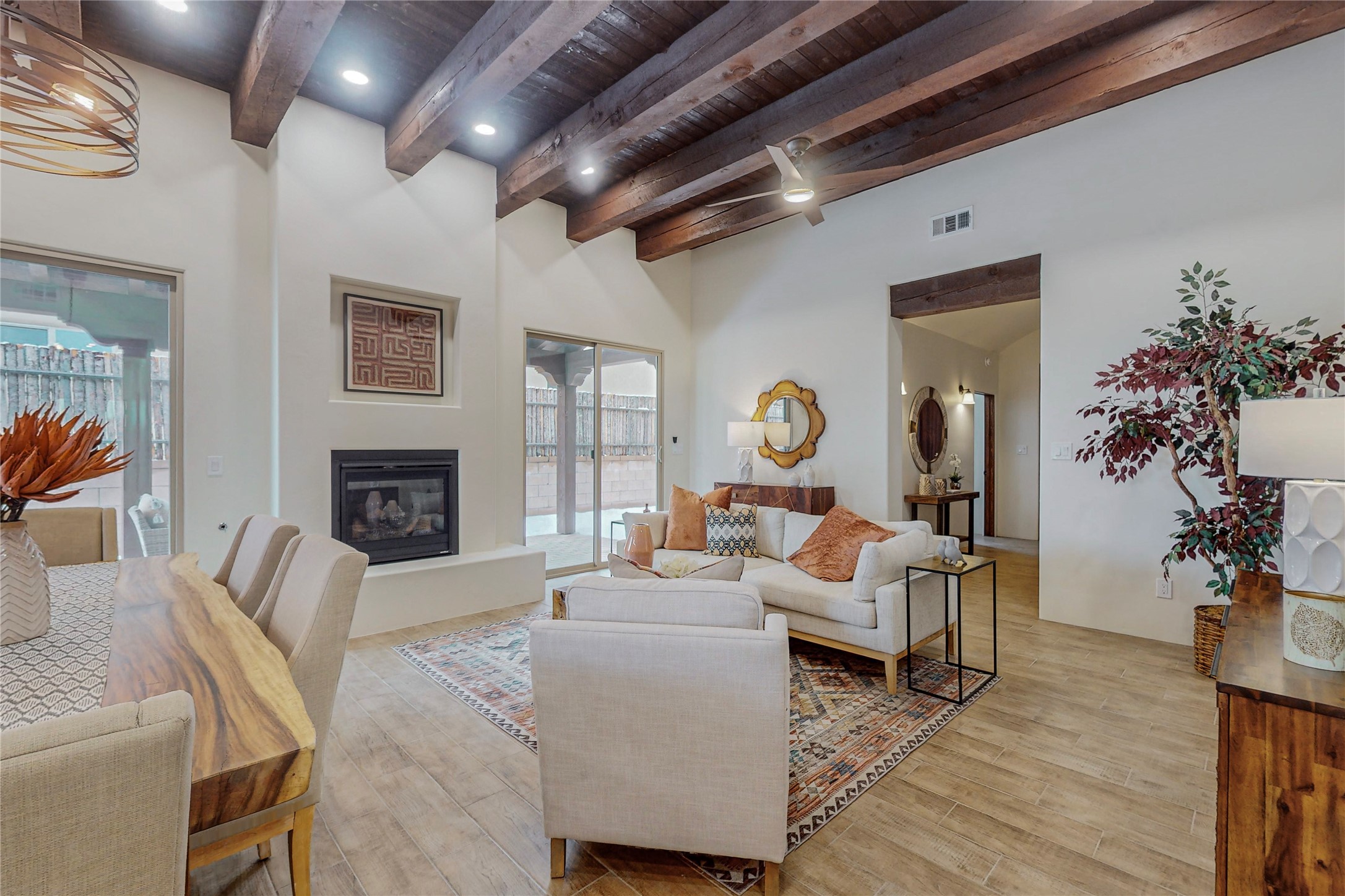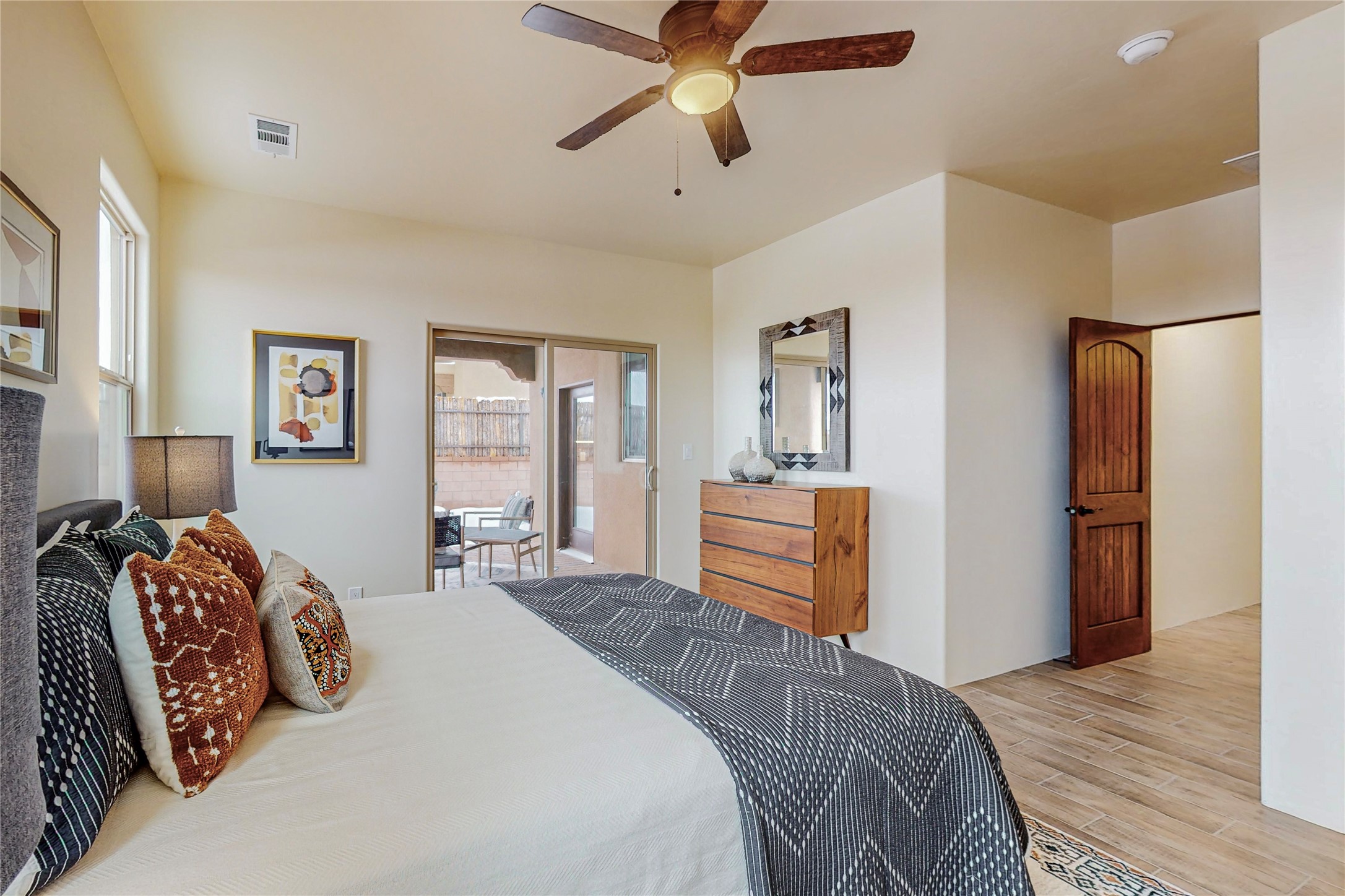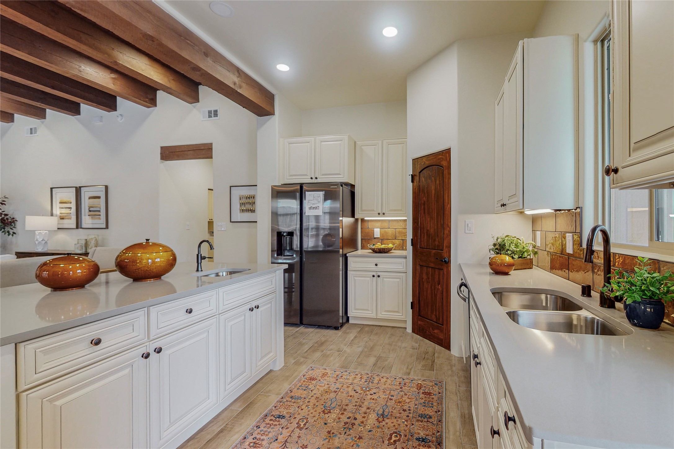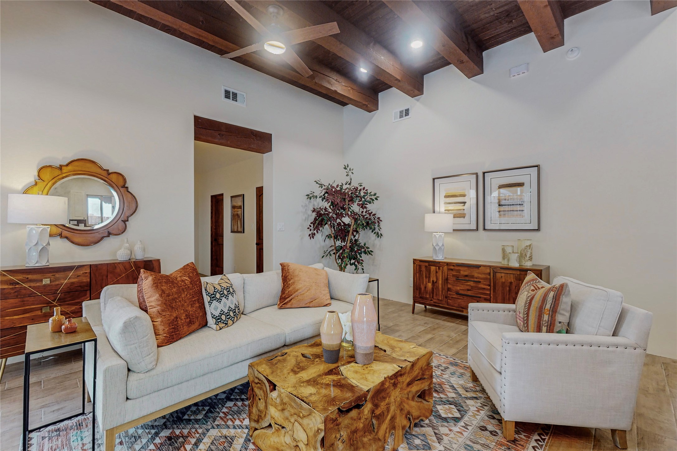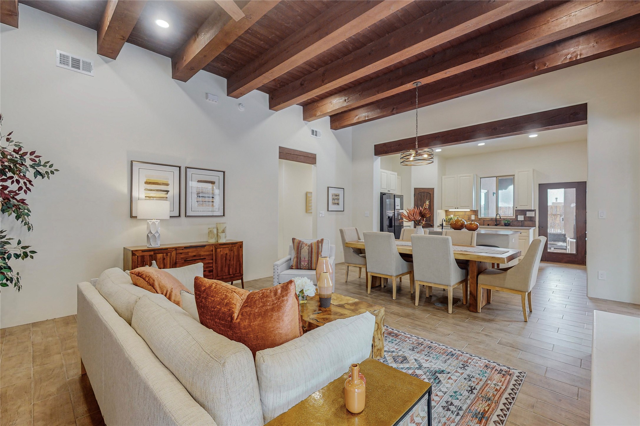 This powerful Santiago Plan is a 2239 sqft 3 bedroom, 4 bath home with three fireplaces, three bedrooms, each with ensuite baths, and a 3 car garage. Located at 31 Pinon Doblado in the La Pradera Subdivision, this home backs up to and is accessible to open space. Access to this home is through an 8 ft tall door that opens into a foyer with a 13-foot boveda ceiling. Immediately to the left is a powder room and an adjacent closet. To the right is a study/bedroom with a gas-fired kiva fireplace and a 3/34 bath. The living room has a 12-foot ceiling, dark, brown-stained wood beams with T&G trim and a fireplace. The open kitchen has walnut-colored cabinets. The kitchen and the guest bedroom open out to a covered portal with a gas fireplace and brick pavers. The floor tile is porcelain plank in a light brown wood-like tone. The owner's suite has an enormous walk-in closet (about 100 sqft) and the owner's bath has a skylight, a large walk-in shower with euro style shower fixtures, and an overhead rain shower head. the exterior is a pitched roof Spanish design with clay-concrete tile roofs and covered portals with heavy wood beams and brick pavers. The driveway is a color-stamped concrete design. The insulated three-car garage has two storage closets and an epoxy-coated floor.