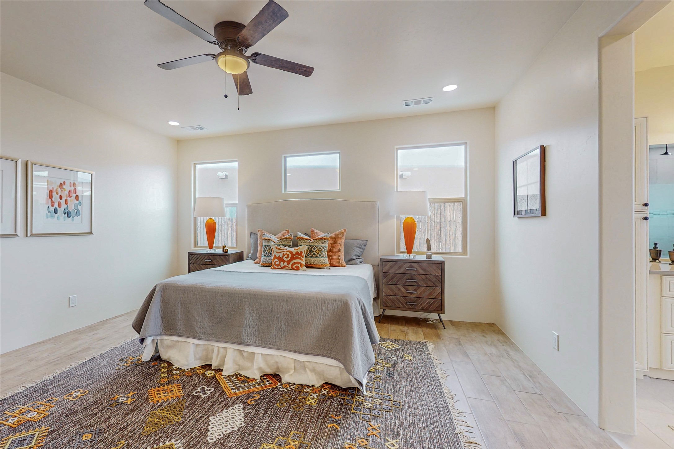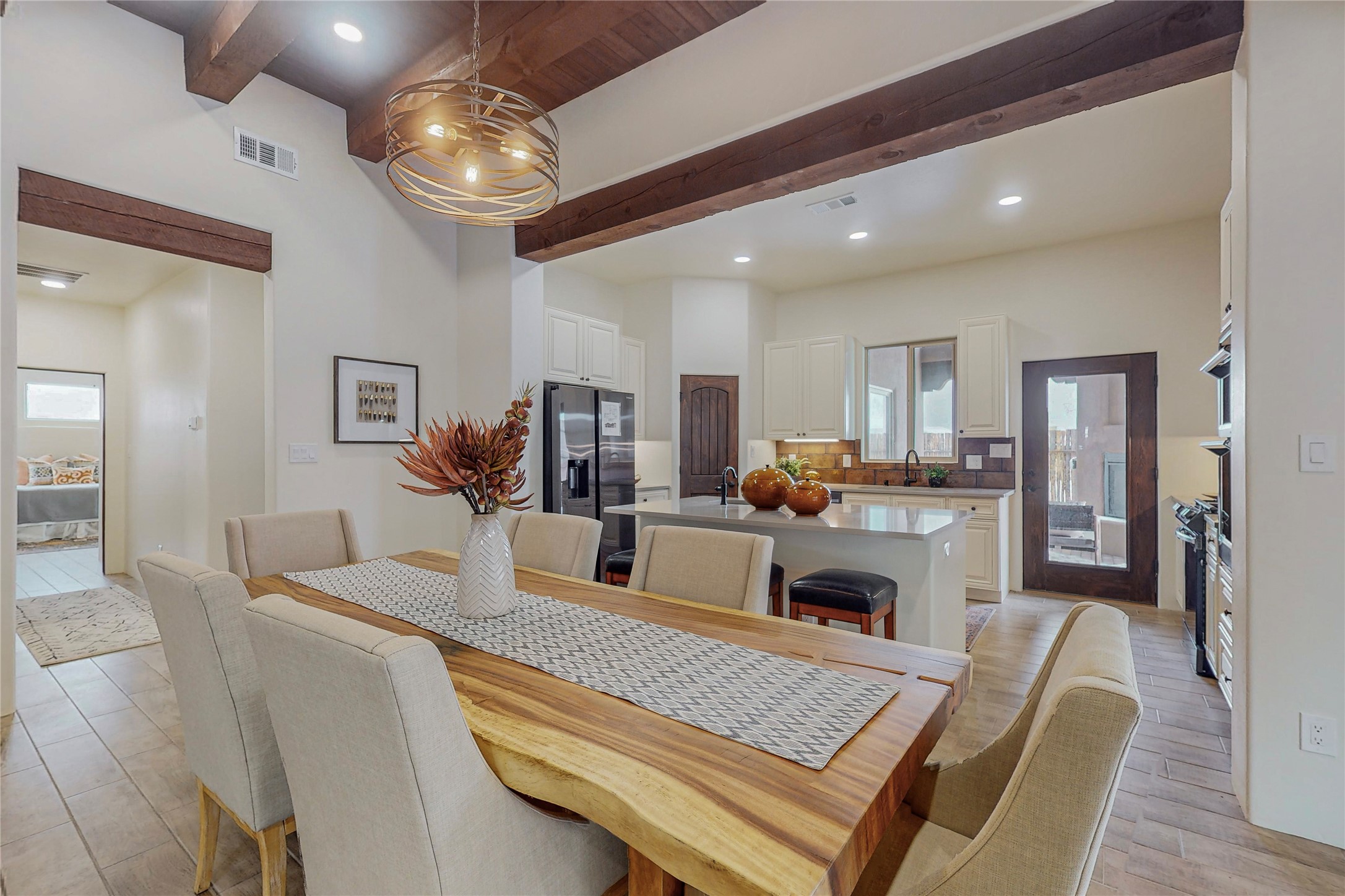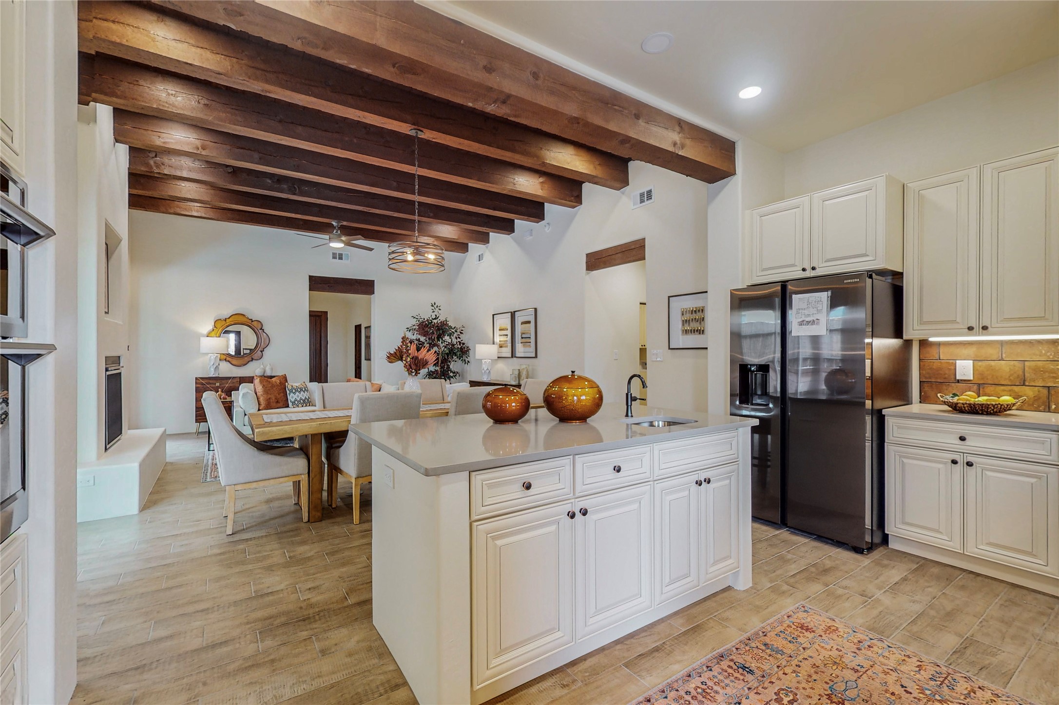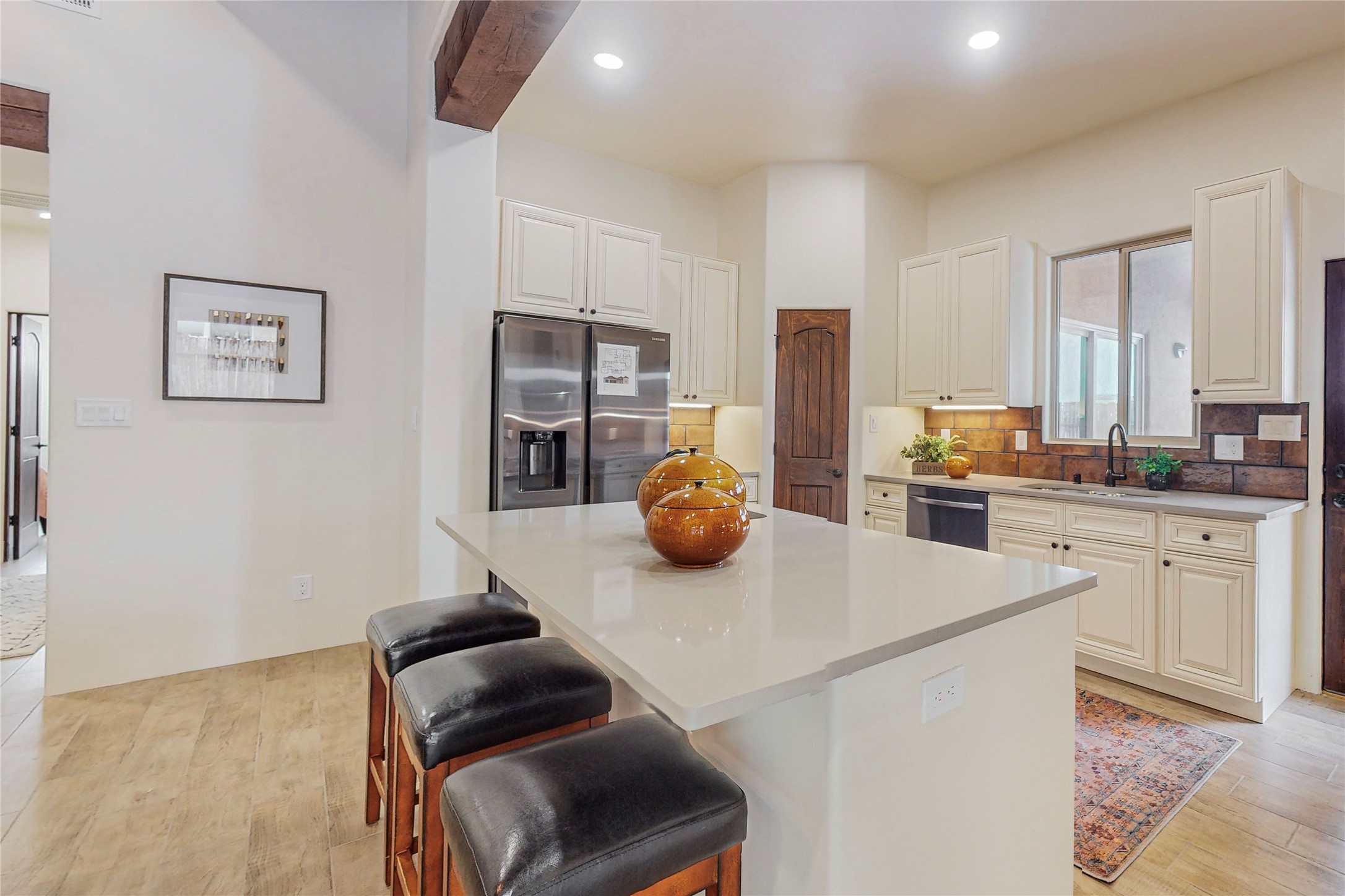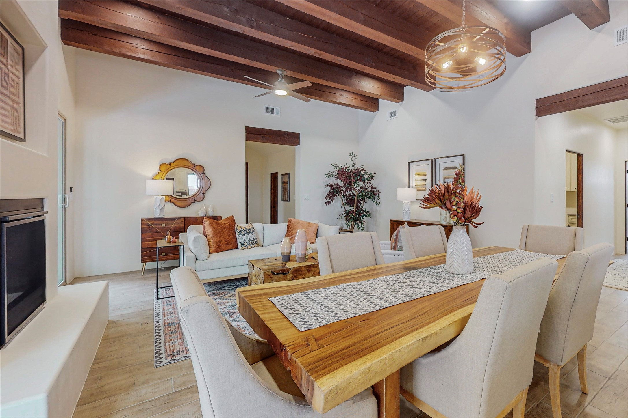 This powerful Santiago Plan is a 2239 sqft 3 bedroom, 4 bath home with three fireplaces, three bedrooms, each with ensuite baths, and a 3 car garage. Located at 31 Pinon Doblado in the La Pradera Subdivision, this home backs up to and is accessible to open space. Access to this home is through an 8 ft tall door that opens into a foyer with a 13-foot boveda ceiling. Immediately to the left is a powder room and an adjacent closet. To the right is a study/bedroom with a gas-fired kiva fireplace and a 3/34 bath. The living room has a 12-foot ceiling, dark, brown-stained wood beams with T&G trim and a fireplace. The open kitchen has walnut-colored cabinets. The kitchen and the guest bedroom open out to a covered portal with a gas fireplace and brick pavers. The floor tile is porcelain plank in a light brown wood-like tone. The owner's suite has an enormous walk-in closet (about 100 sqft) and the owner's bath has a skylight, a large walk-in shower with euro style shower fixtures, and an overhead rain shower head. the exterior is a pitched roof Spanish design with clay-concrete tile roofs and covered portals with heavy wood beams and brick pavers. The driveway is a color-stamped concrete design. The insulated three-car garage has two storage closets and an epoxy-coated floor.