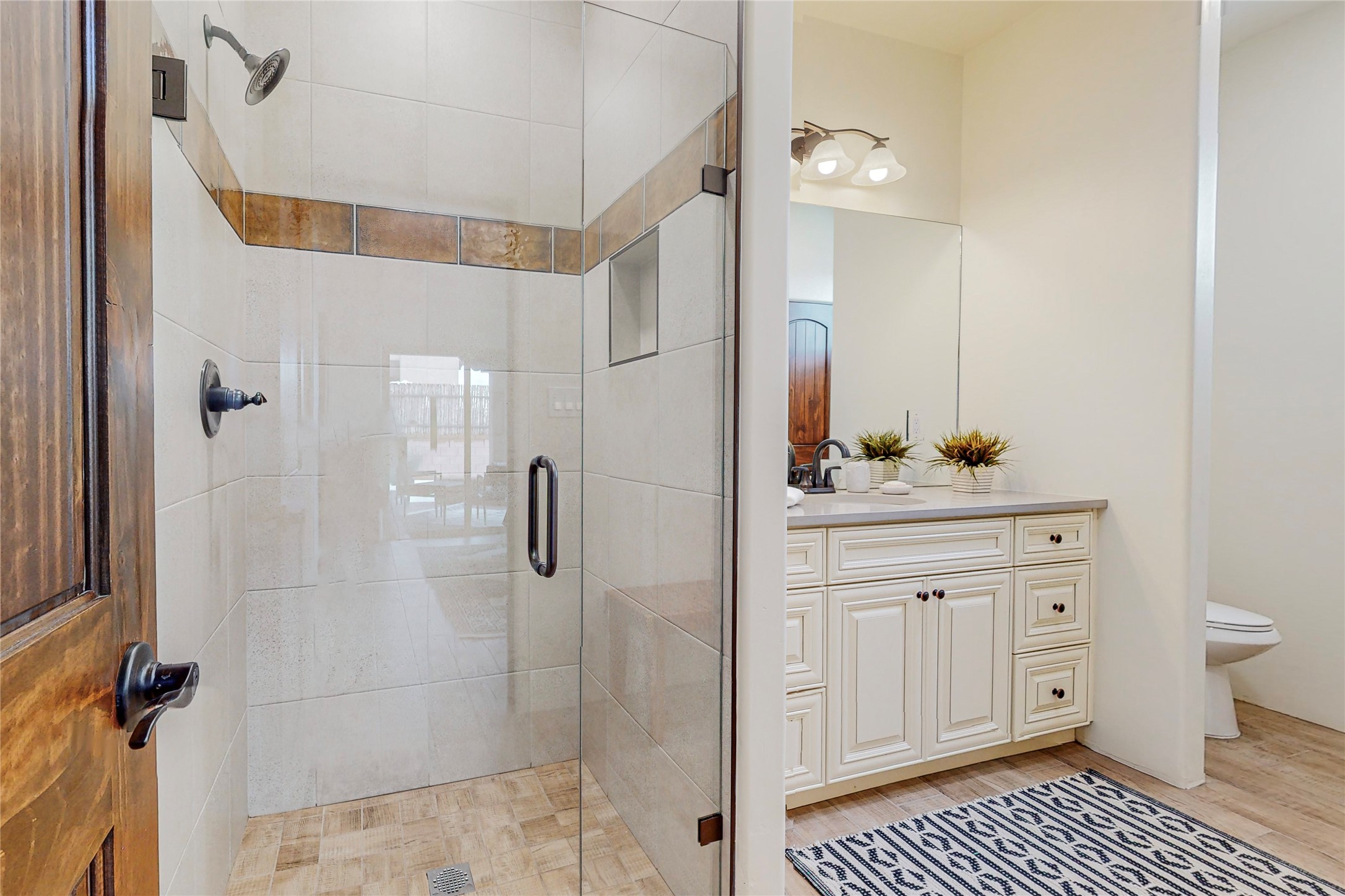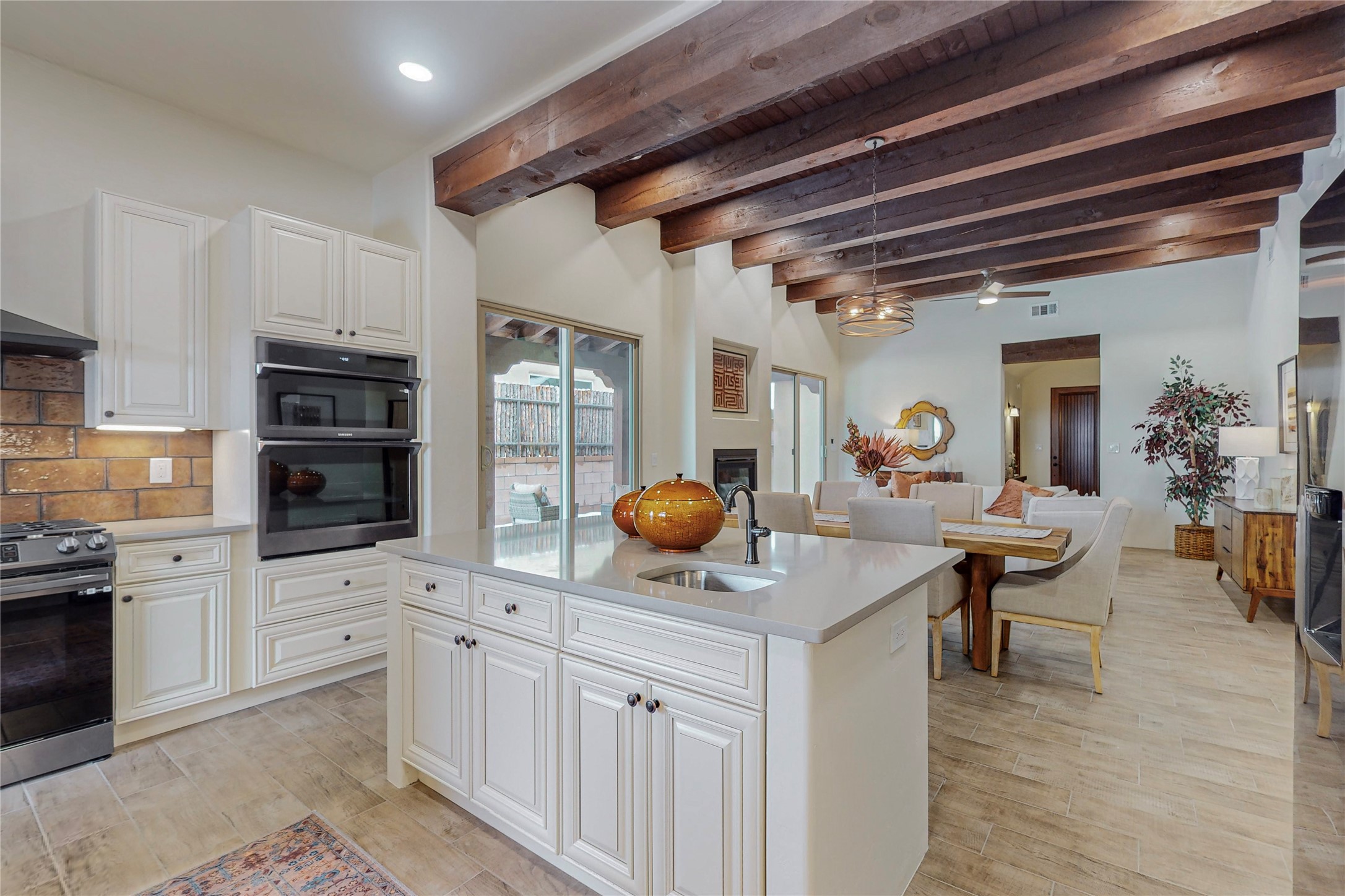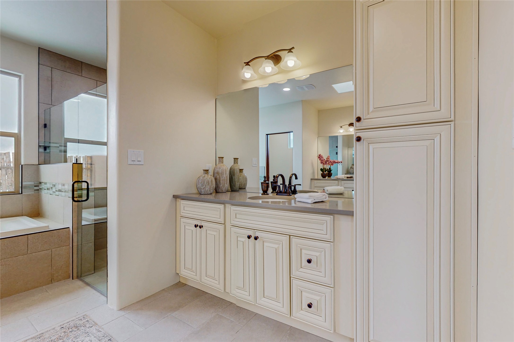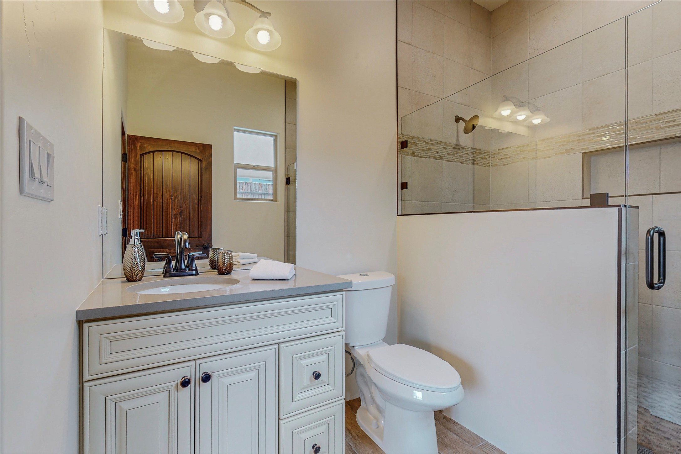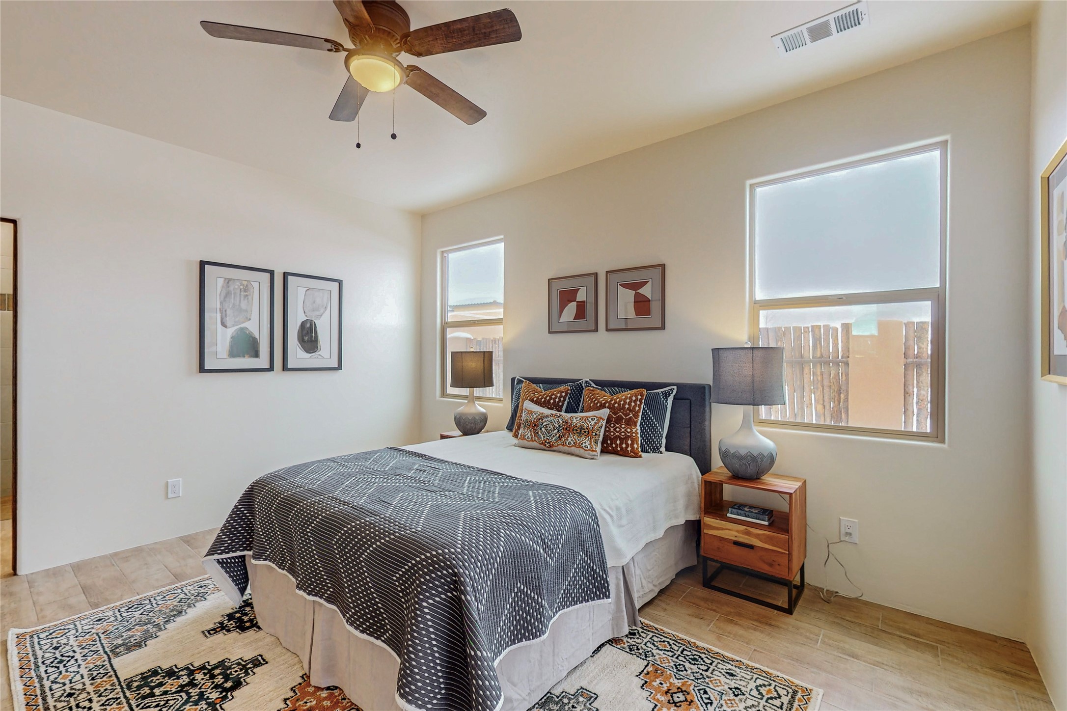This powerful Santiago Plan is a 2239 sqft 3 bedroom, 4 bath home with three fireplaces, three bedrooms, each with ensuite baths, and a 3 car garage. Located at 31 Pinon Doblado in the La Pradera Subdivision, this home backs up to and is accessible to open space. Access to this home is through an 8 ft tall door that opens into a foyer with a 13-foot boveda ceiling. Immediately to the left is a powder room and an adjacent closet. To the right is a study/bedroom with a gas-fired kiva fireplace and a 3/34 bath. The living room has a 12-foot ceiling, dark, brown-stained wood beams with T&G trim and a fireplace. The open kitchen has walnut-colored cabinets. The kitchen and the guest bedroom open out to a covered portal with a gas fireplace and brick pavers. The floor tile is porcelain plank in a light brown wood-like tone. The owner's suite has an enormous walk-in closet (about 100 sqft) and the owner's bath has a skylight, a large walk-in shower with euro style shower fixtures, and an overhead rain shower head. the exterior is a pitched roof Spanish design with clay-concrete tile roofs and covered portals with heavy wood beams and brick pavers. The driveway is a color-stamped concrete design. The insulated three-car garage has two storage closets and an epoxy-coated floor.