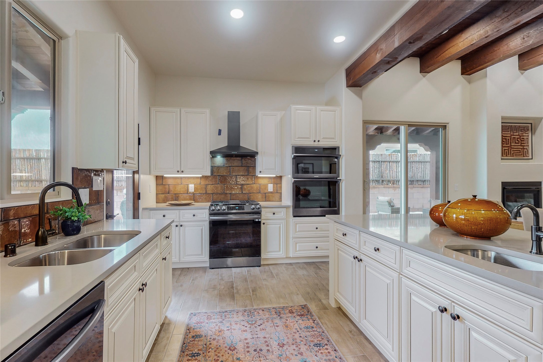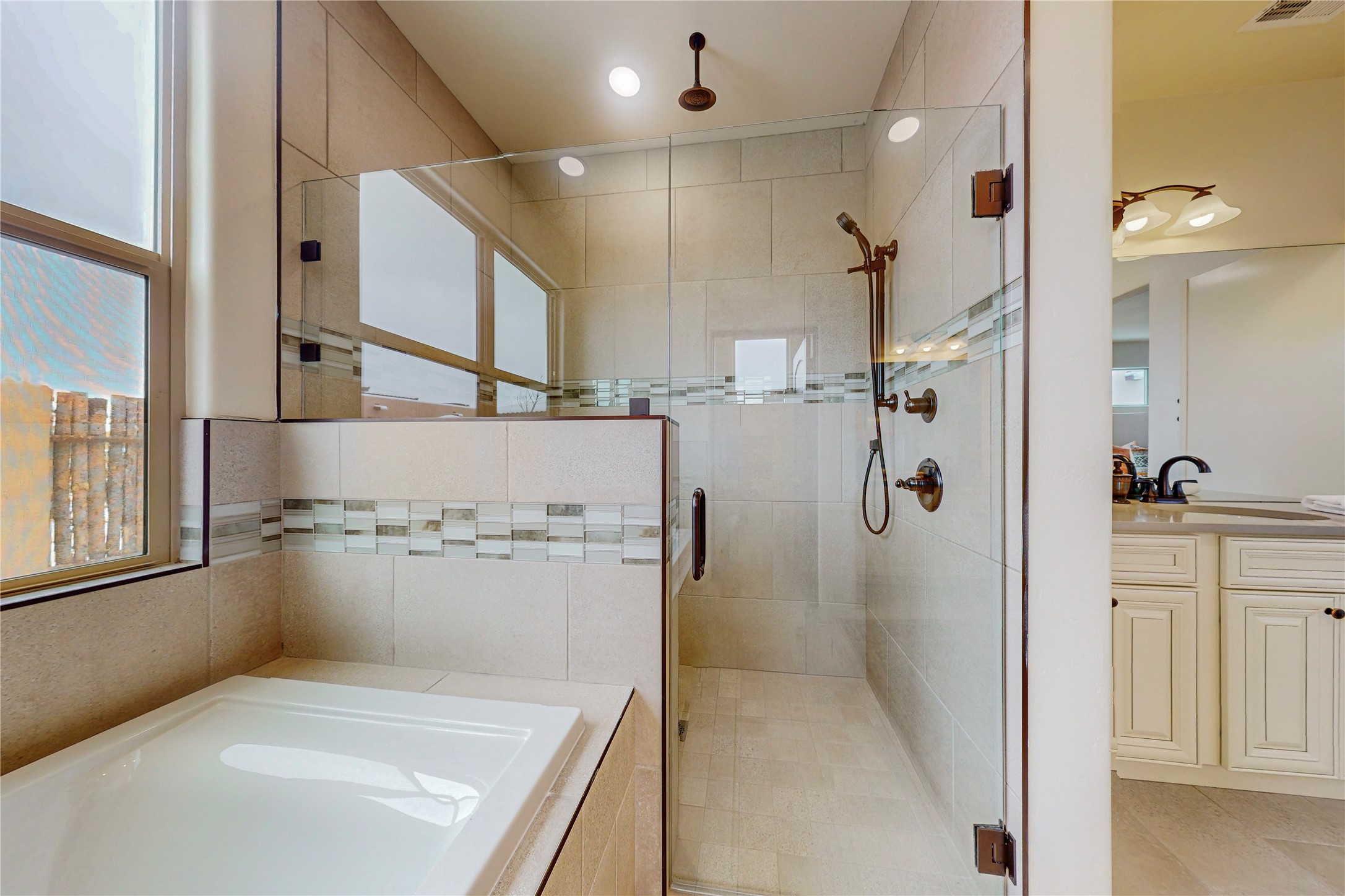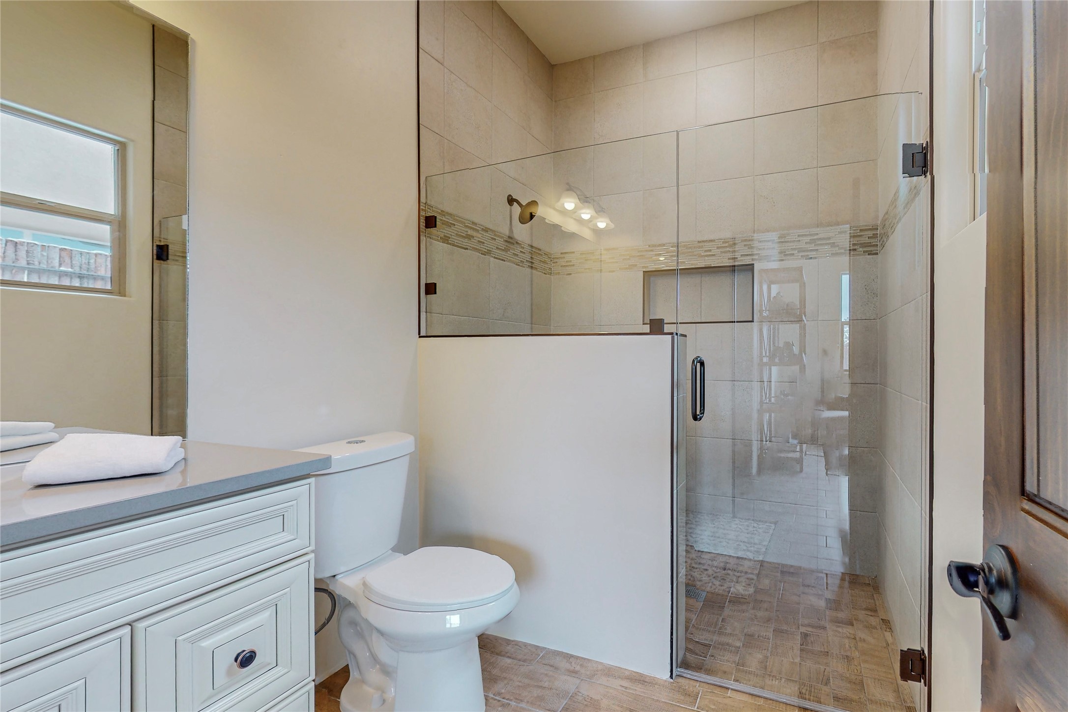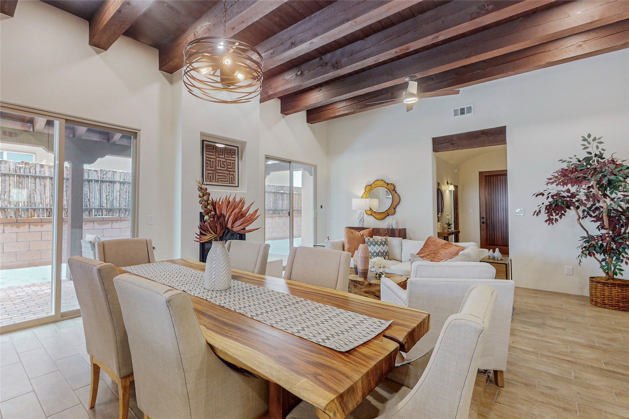 This powerful Santiago Plan is a 2239 sqft 3 bedroom, 4 bath home with three fireplaces, three bedrooms, each with ensuite baths, and a 3 car garage. Located at 31 Pinon Doblado in the La Pradera Subdivision, this home backs up to and is accessible to open space. Access to this home is through an 8 ft tall door that opens into a foyer with a 13-foot boveda ceiling. Immediately to the left is a powder room and an adjacent closet. To the right is a study/bedroom with a gas-fired kiva fireplace and a 3/34 bath. The living room has a 12-foot ceiling, dark, brown-stained wood beams with T&G trim and a fireplace. The open kitchen has walnut-colored cabinets. The kitchen and the guest bedroom open out to a covered portal with a gas fireplace and brick pavers. The floor tile is porcelain plank in a light brown wood-like tone. The owner's suite has an enormous walk-in closet (about 100 sqft) and the owner's bath has a skylight, a large walk-in shower with euro style shower fixtures, and an overhead rain shower head. the exterior is a pitched roof Spanish design with clay-concrete tile roofs and covered portals with heavy wood beams and brick pavers. The driveway is a color-stamped concrete design. The insulated three-car garage has two storage closets and an epoxy-coated floor.
