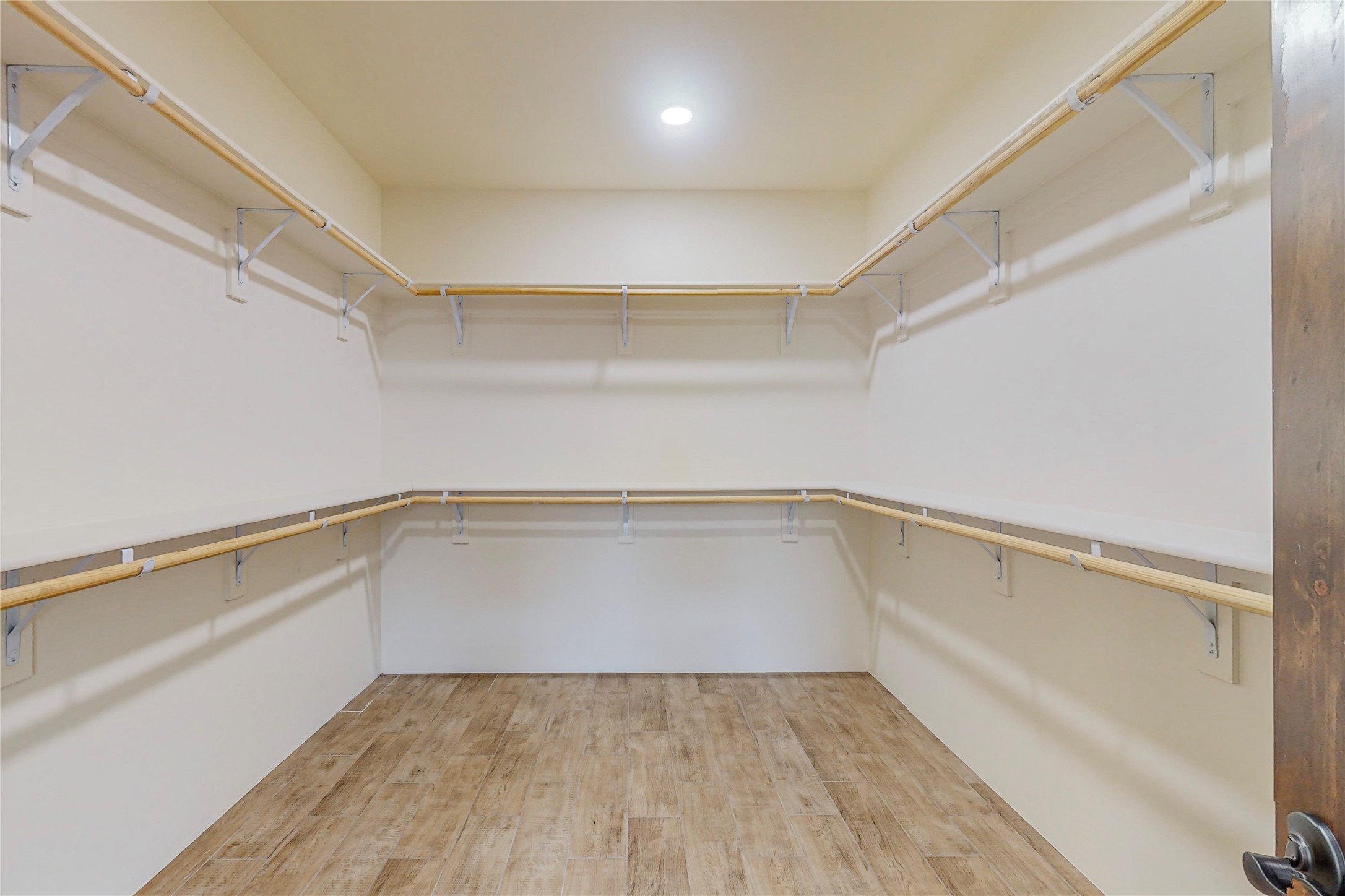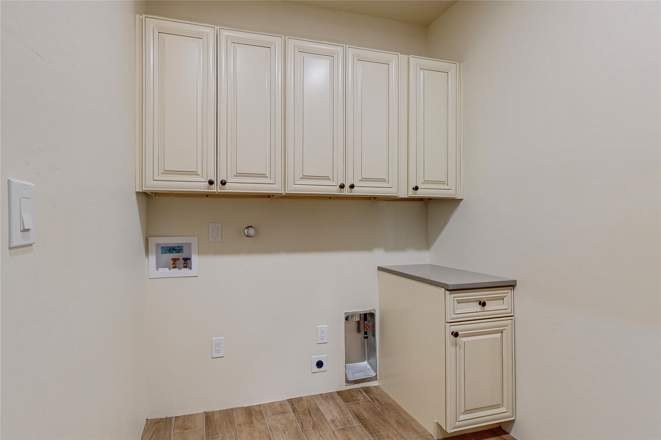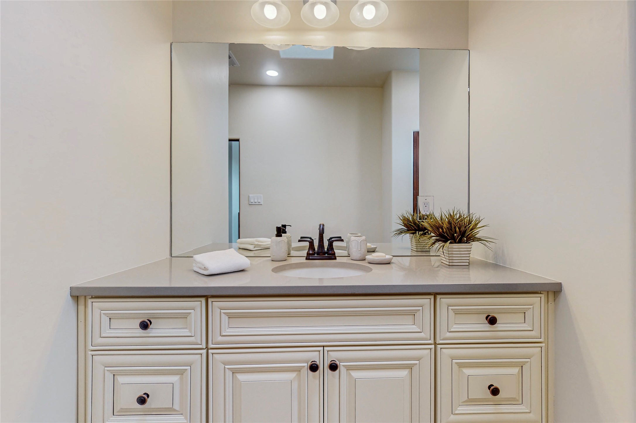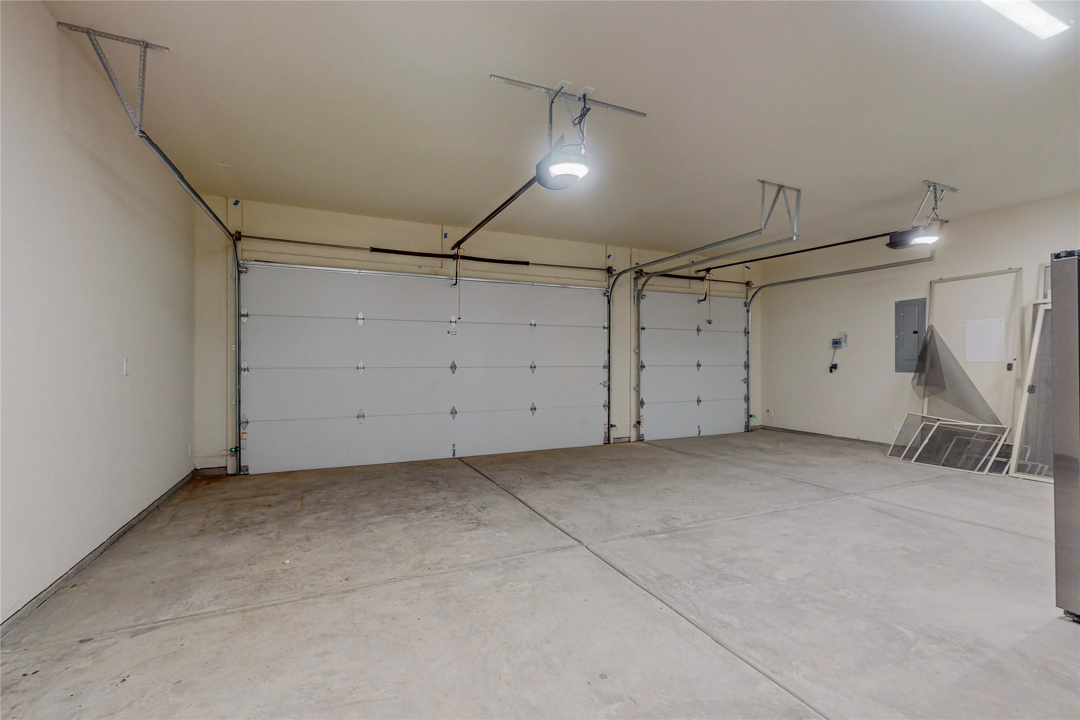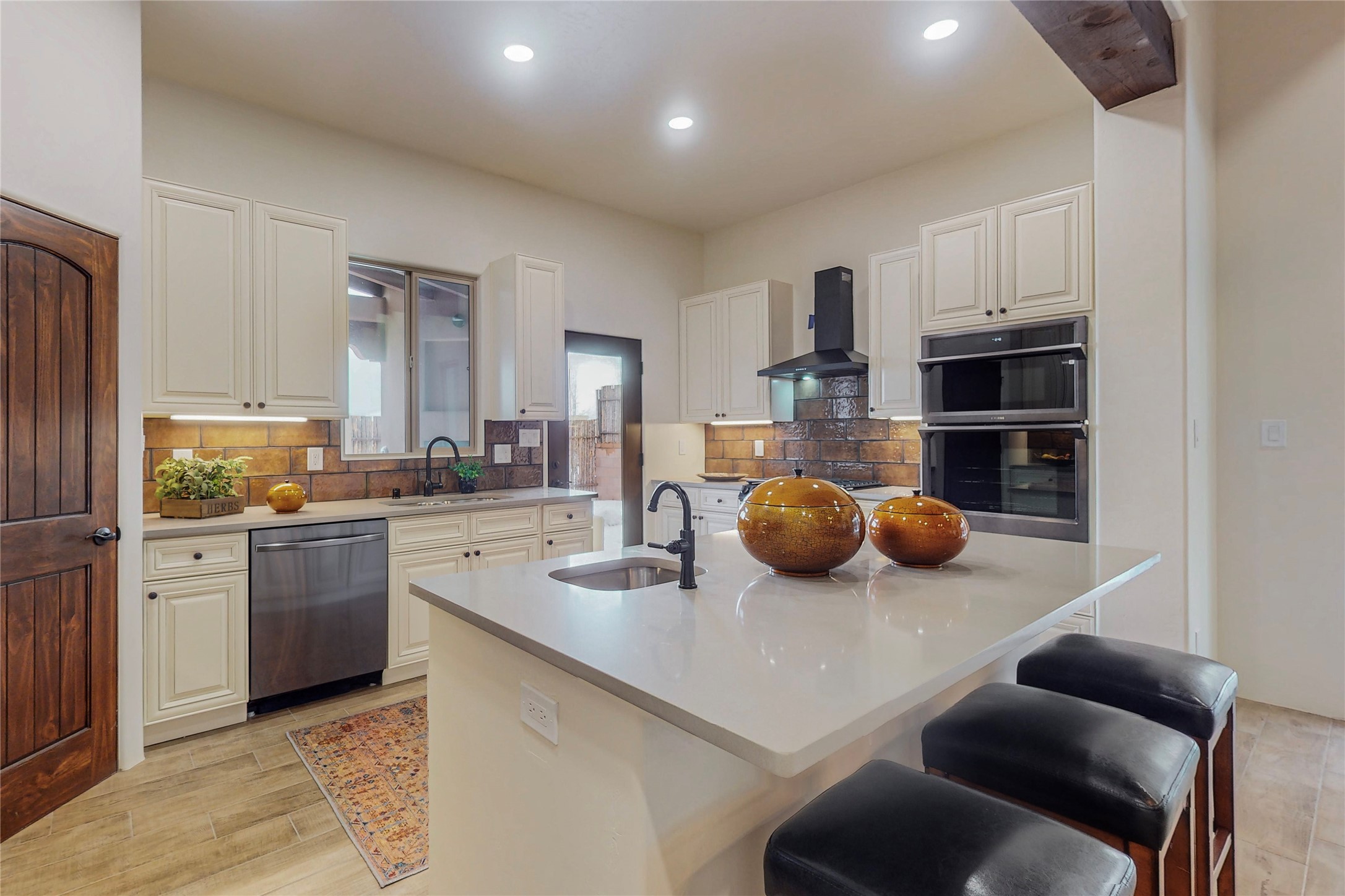 This powerful Santiago Plan is a 2239 sqft 3 bedroom, 4 bath home with three fireplaces, three bedrooms, each with ensuite baths, and a 3 car garage. Located at 31 Pinon Doblado in the La Pradera Subdivision, this home backs up to and is accessible to open space. Access to this home is through an 8 ft tall door that opens into a foyer with a 13-foot boveda ceiling. Immediately to the left is a powder room and an adjacent closet. To the right is a study/bedroom with a gas-fired kiva fireplace and a 3/34 bath. The living room has a 12-foot ceiling, dark, brown-stained wood beams with T&G trim and a fireplace. The open kitchen has walnut-colored cabinets. The kitchen and the guest bedroom open out to a covered portal with a gas fireplace and brick pavers. The floor tile is porcelain plank in a light brown wood-like tone. The owner's suite has an enormous walk-in closet (about 100 sqft) and the owner's bath has a skylight, a large walk-in shower with euro style shower fixtures, and an overhead rain shower head. the exterior is a pitched roof Spanish design with clay-concrete tile roofs and covered portals with heavy wood beams and brick pavers. The driveway is a color-stamped concrete design. The insulated three-car garage has two storage closets and an epoxy-coated floor.