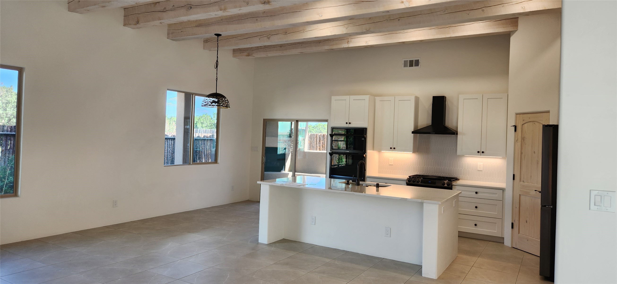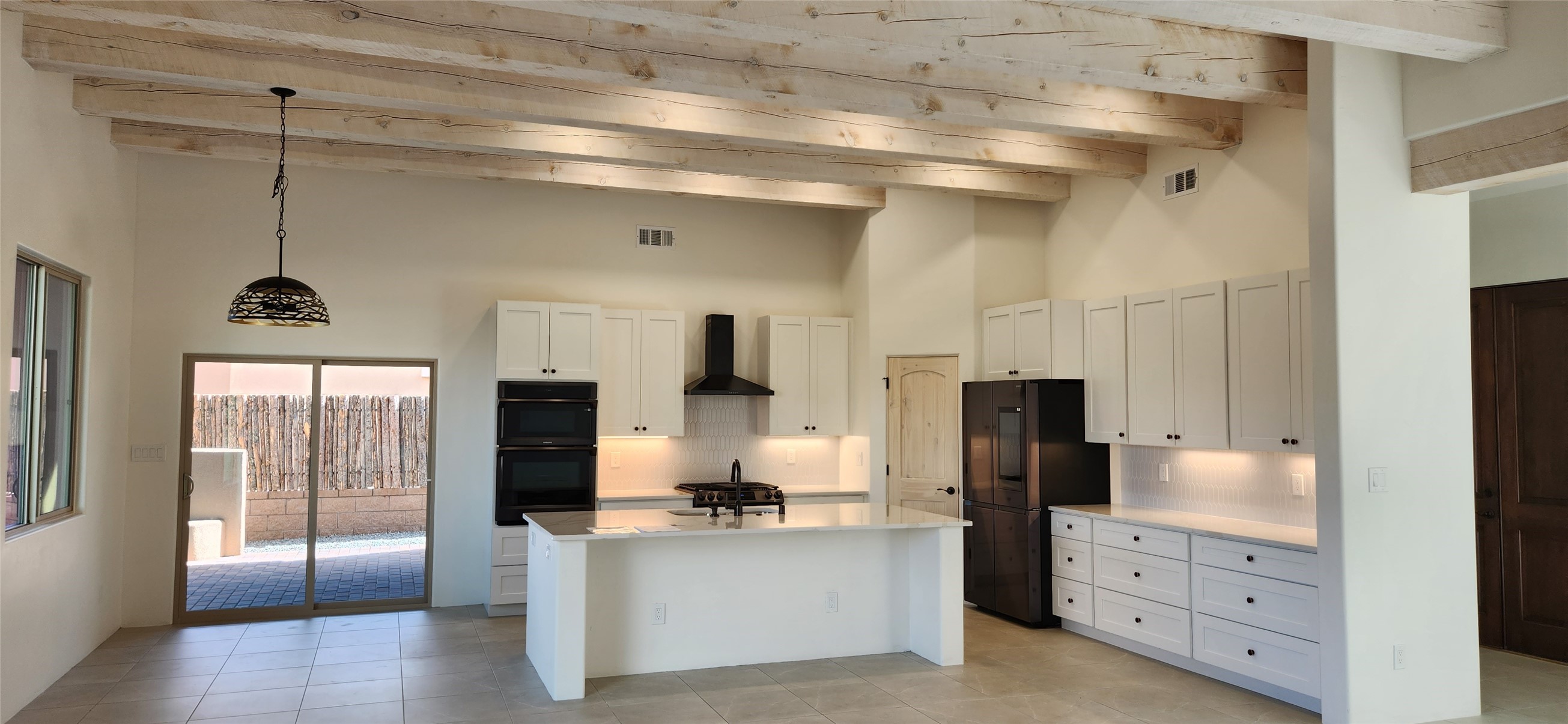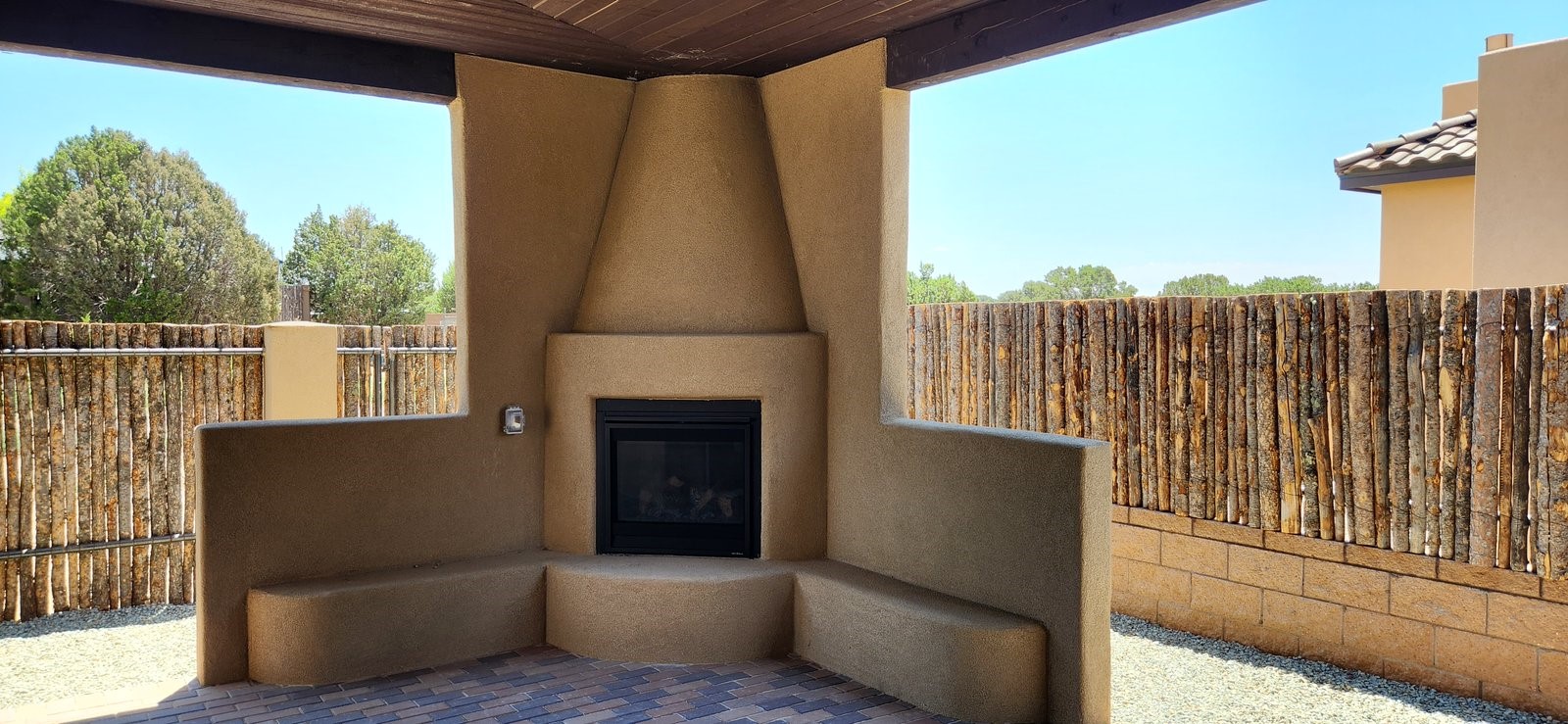Just Completed!Enter this award-winning Zaguan Plan through a lockable double-cedar and wrought iron gate into a covered entry (a "Zaguan") with brick pavers and an open private courtyard. To your left is a separate living unit with a living room and a 3/4 bath and its own HVAC unit and tankless hot water heater. The main entry leads to the formal entry with a lighted nicho. To the left is the owner's suite with a large walk-in shower with euro-style shower fixtures and an overhead rain shower head. 2 separate closets are separated by a commode closet. Directly ahead of the entrance is the open living room with white-stained beams and T&G planking, a kiva fireplace and open kitchen with an oversized counter. The kitchen and guest bedroom both open out to a 371 sq ft covered portal that has a gas-fired kiva fireplace and brick pavers. To the right is the guest bedroom bath that can also serve as a powder room. The living room has an 11-foot ceiling, white-stained wood beams with T&G trim, and a fireplace. The open kitchen has white cabinets. Floor tile is porcelain plank in a beige wood-like tone. Bedrooms are carpeted. The exterior is a contemporary design with a TPO roof on the living areas and a clay-like concrete tile roof on the outside portal that has heavy wood beams and brick pavers. The driveway is a colored stamped concrete design. An insulated two-car garage with an epoxy floor is included.
