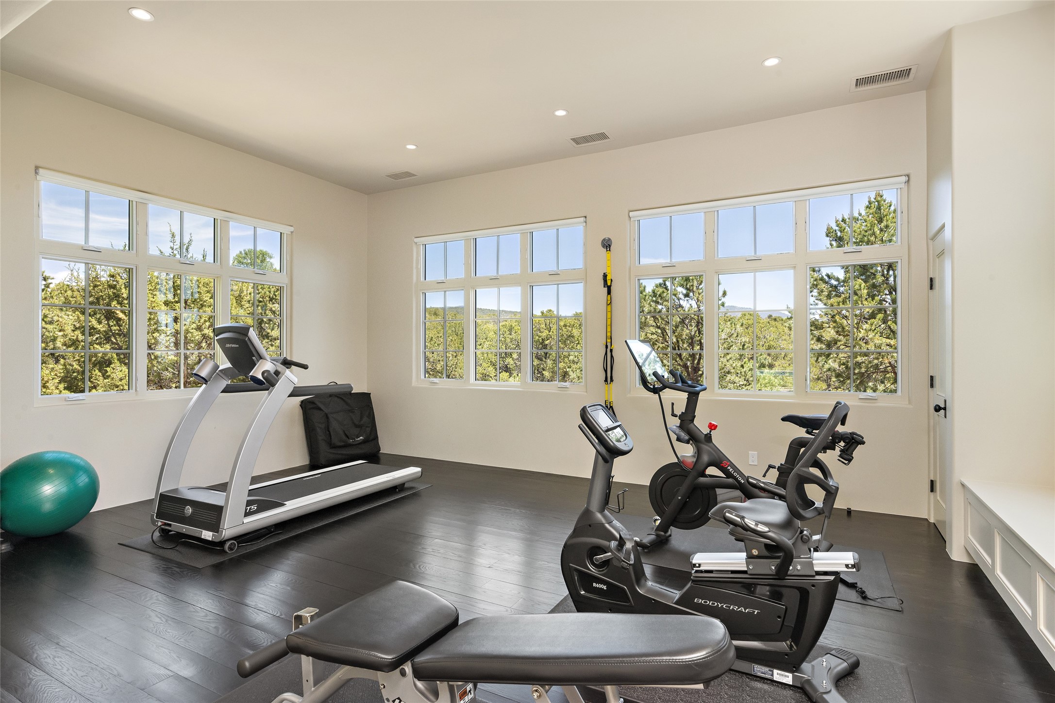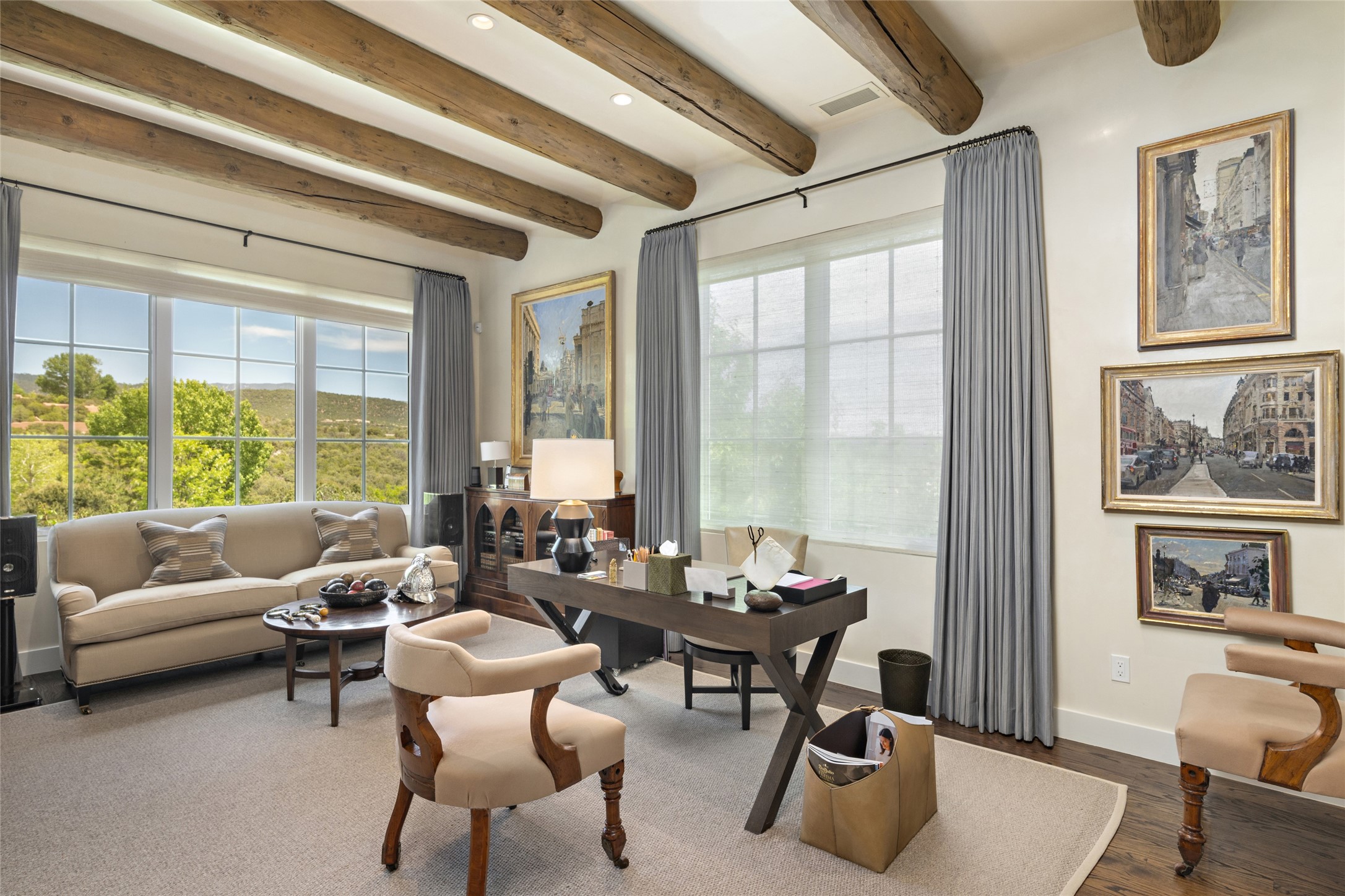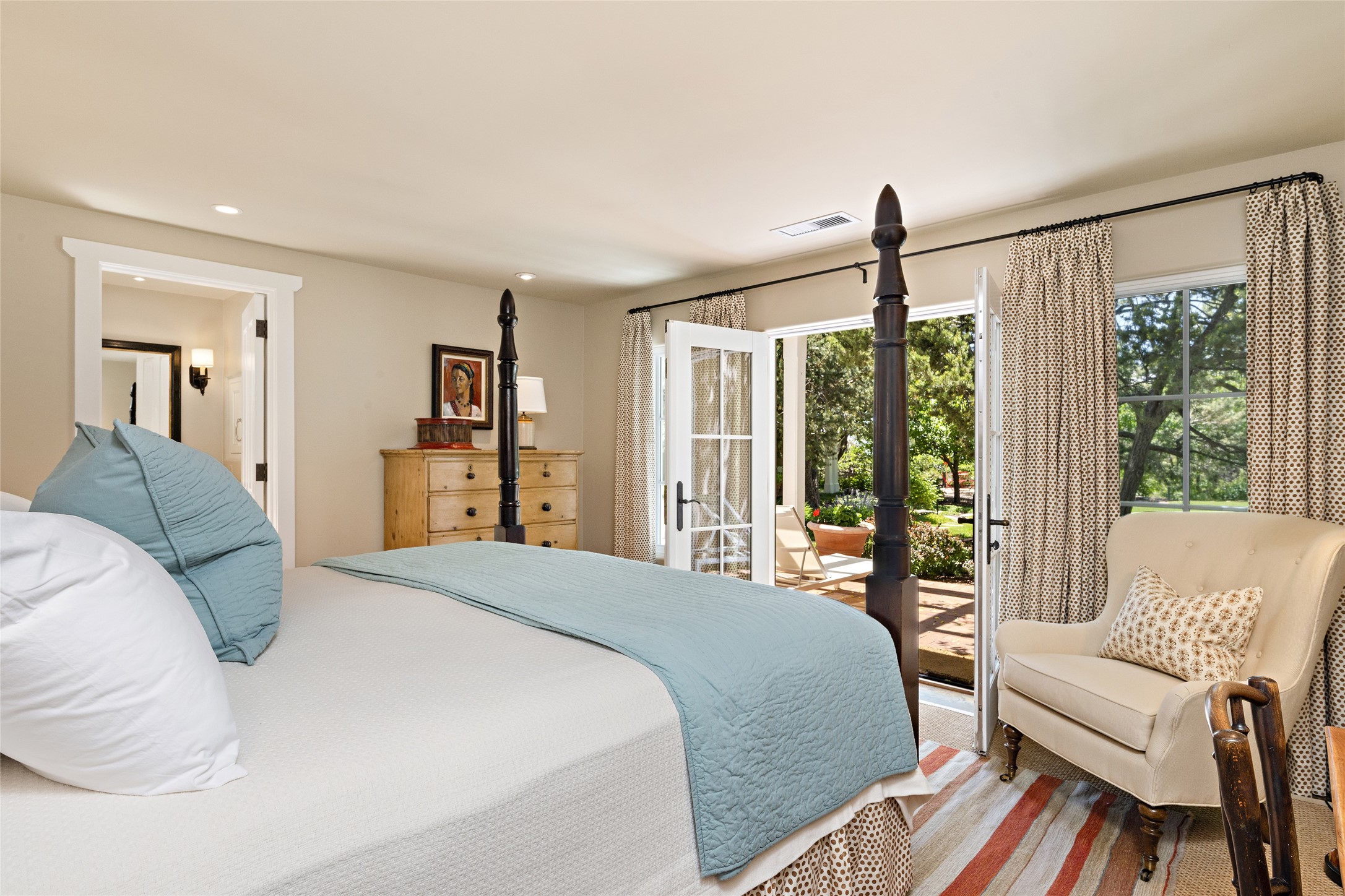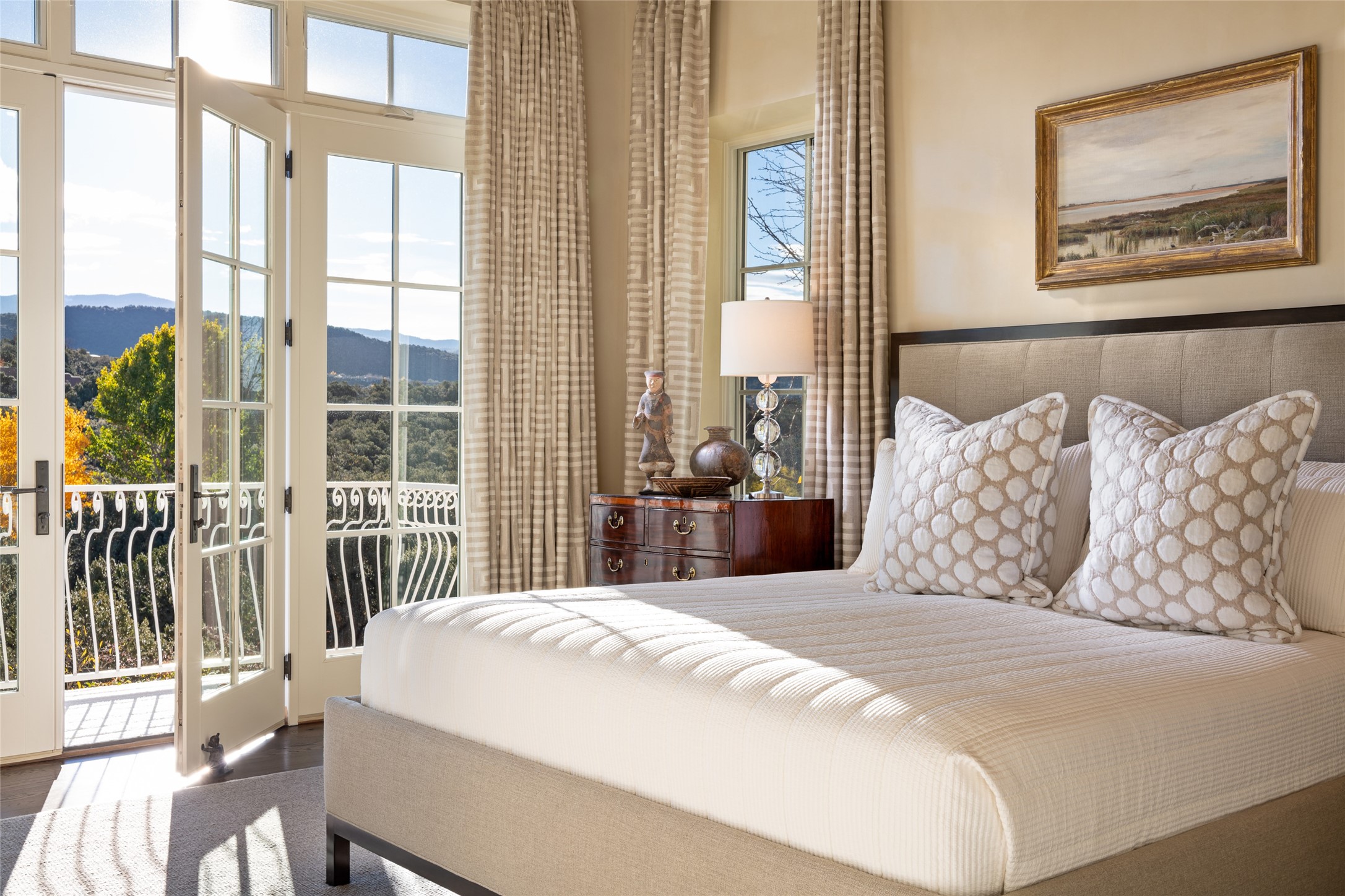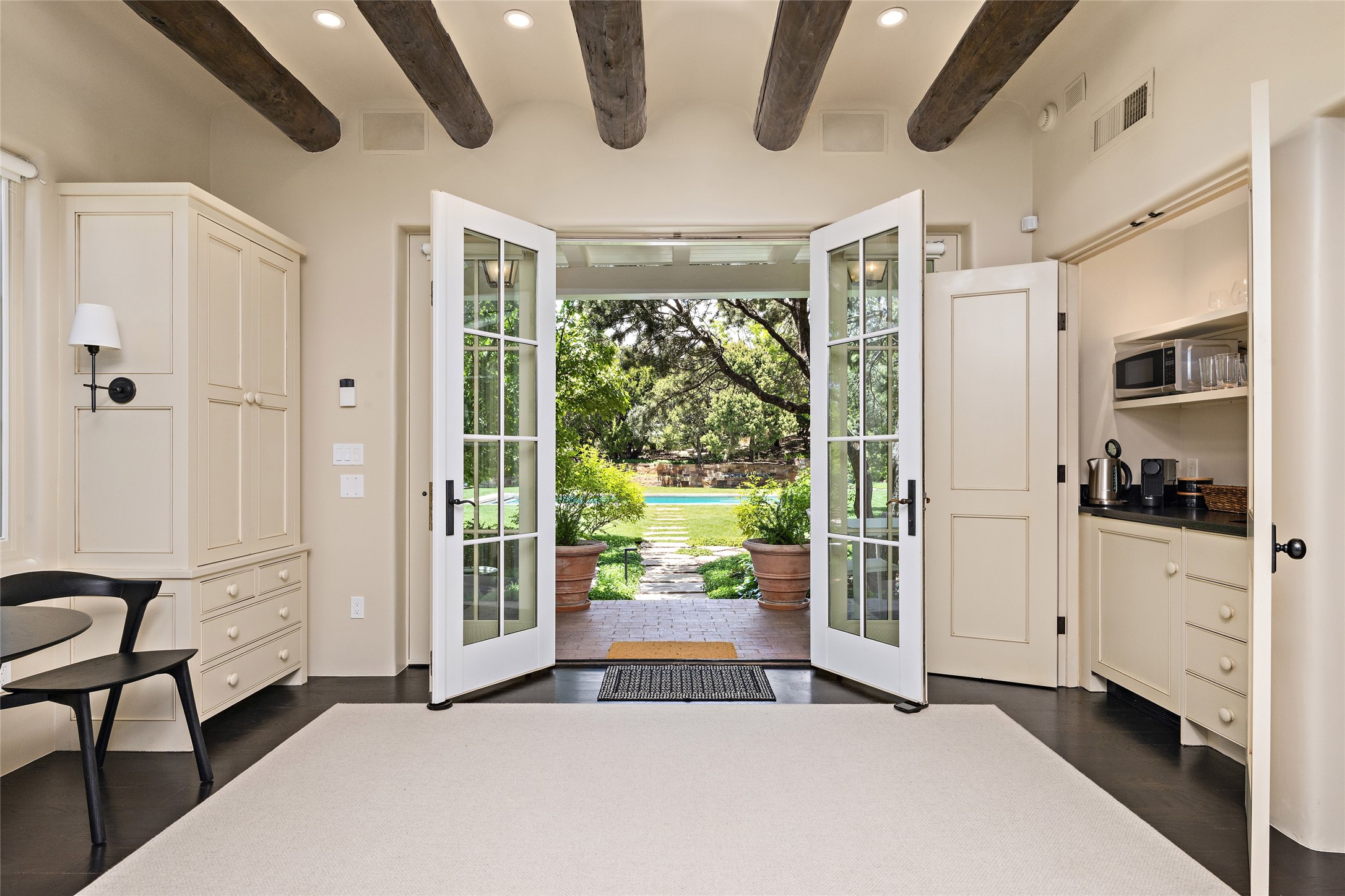 Said to have been built in 1920 as a Hollywood actor's getaway, this stunning Territorial Style gated estate is arguably one of Santa Fe's finest. A remarkable property, it features a 2 bedroom main residence, a 2 bedroom guesthouse and a second guesthouse used as a gym and with a Murphy Bed. A sparkling, refreshing swimming pool is adjacent and surrounded by gorgeous landscaping. Located on the prestigious northside and only 5 minutes to downtown, the 3.13 acre lot offers complete privacy and views in all directions. The main residence was recently meticulously remodeled by the esteemed team of architect Lorn Tryk, Woods Design Builders and interior design by Violante and Rochford. All on one level, highlights include an elegant living room, a large well-equipped kitchen in the main house, a full kitchen in the guesthouse and a kitchenette in the gym. The kitchen appliances are Wolf and Subzero. Perfect for today's lifestyle, the main house has 2 offices as well as 2 outdoor portals for dining and taking in the magnificent views of the Sangre de Cristo and Jemez mountains. Finishes in the main house include diamond finish plaster walls and ceilings, walnut stained oak floors, viga ceilings, 7 fireplaces and a flowing, gracious floor plan. Outside the grounds are landscaped and include Japanese and Cactus Gardens and native plants, fruit trees, perennial flower gardens and meandering nature trails. Rarely does one encounter such an impeccably designed and maintained property as this northside gem.
