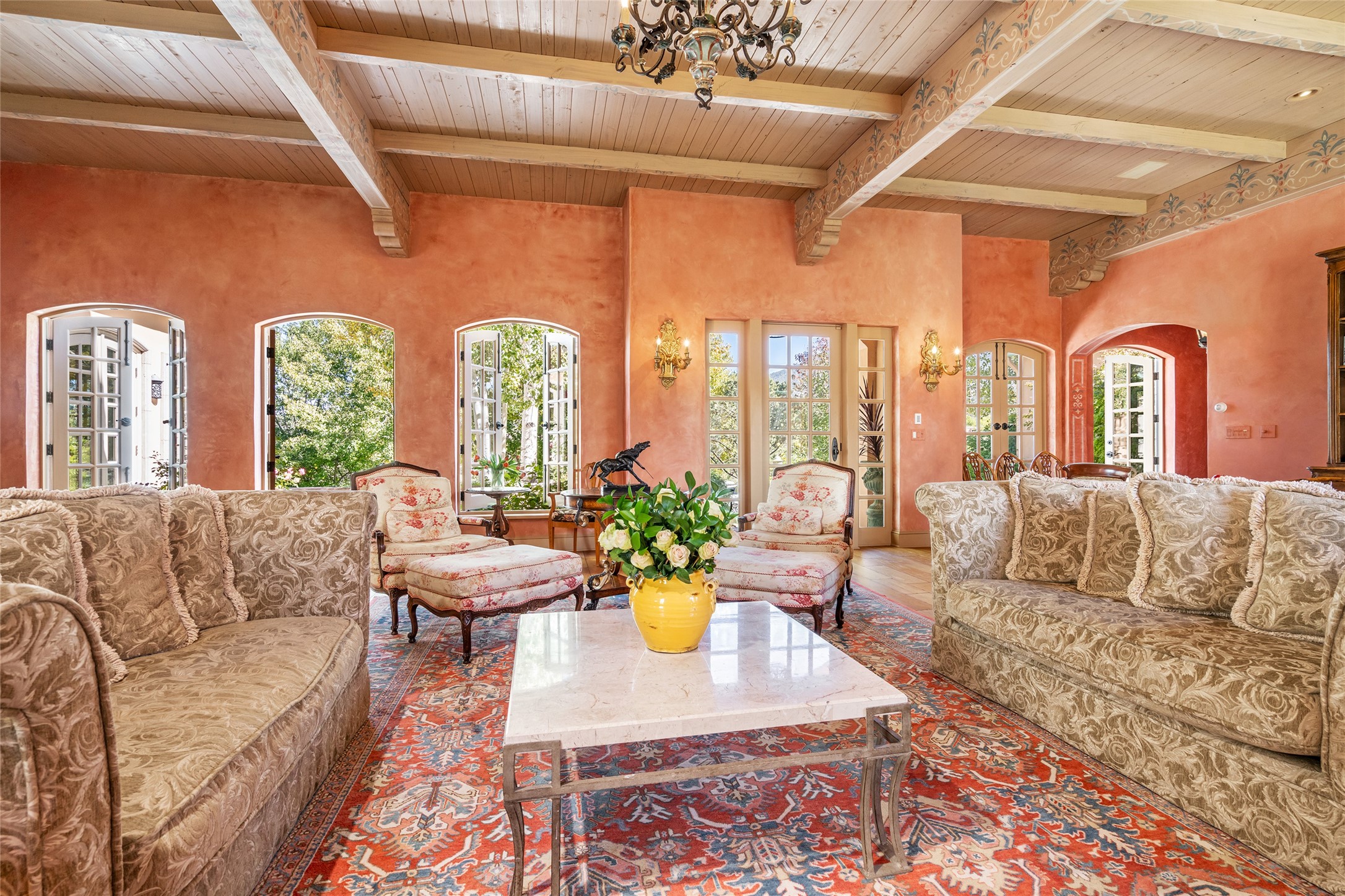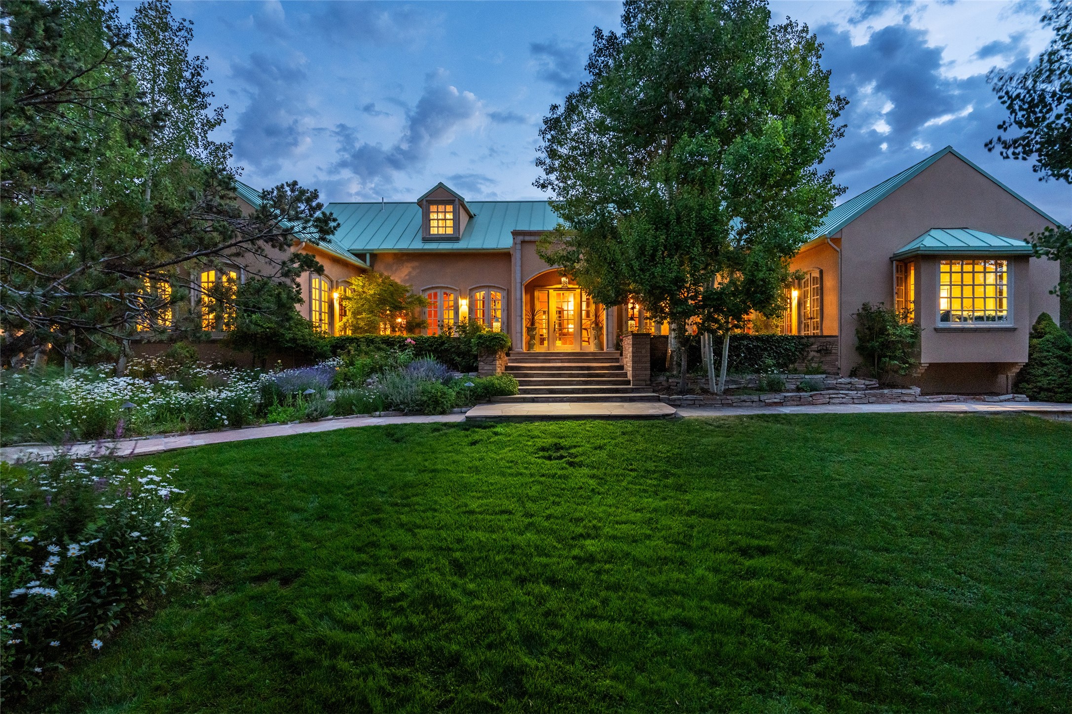 Elegant gated Eastside estate, situated on just over 1.8 acres of mature lush gardens, with a main house and separate guest house over the 3-car garage. European style features include extensive use of stone, hand-troweled pigmented plaster walls, hand-made tiles, custom stenciling, beamed ceilings, custom windows and hardware, hardwood hickory floors, and grand fireplaces. The gracious living room is enhanced by French doors and windows, and is located directly across the private central courtyard from the family room. An inviting formal dining room is the perfect place to share a lovely meal. Informal dining is available in the breakfast room just off the spacious well-equipped kitchen. The luxurious primary suite offers a sitting room or office with a large fireplace, two well-appointed custom-designed walk-in closets, and a spa-inspired bath with separate soaking tub and tiled steam shower. Two guest rooms, each with outdoor access, are set apart down a private hallway. The al fresco dining area, with fantastic mountain views, connects the primary residence with the garage spaces and guest house. The guest house provides the flexibility for a private home office. Captivating grounds with flagstone pathways, terraces and multiple courtyards are irrigated by the private well, which also serves the residences. The property is enveloped by views of the Sangre de Cristo Mountains and foothills. Close to recreation and schools; less than a mile from Canyon Road.