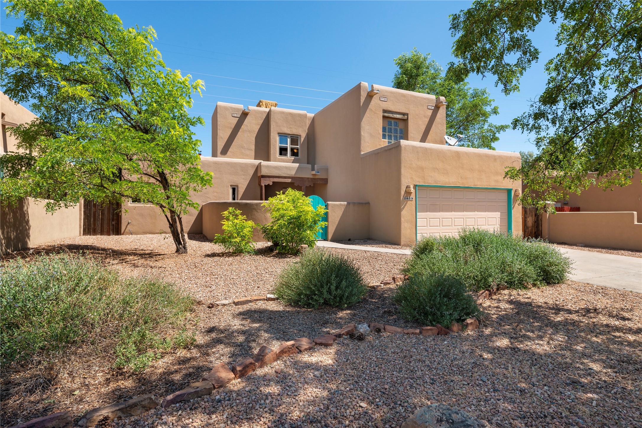 Good cheer abounds in this light-filled, Chapman-built home in Pueblos del Sol. Traditional touches such as Saltillo tile, nichos, a corner kiva and handsome vigas ground the home in Southwestern style, while the tall ceilings and many windows keep the overall feeling light and airy. The tidy kitchen is outfitted with granite countertops, stainless steel appliances, a brand-new gas stove, and plenty of storage. The Primary Suite has a walk-in closet, window seat, and ensuite bath with separate tub and shower. The adjacent office accesses a deck making the upper story a true, private retreat. Low-maintenance landscaping in front and rear includes mature trees and a fully-fenced backyard that backs up to open space. Enhanced with all new carpet, evaporative cooling and many sweet details, this custom home is not-too-close to the highway and near miles of walking trails.