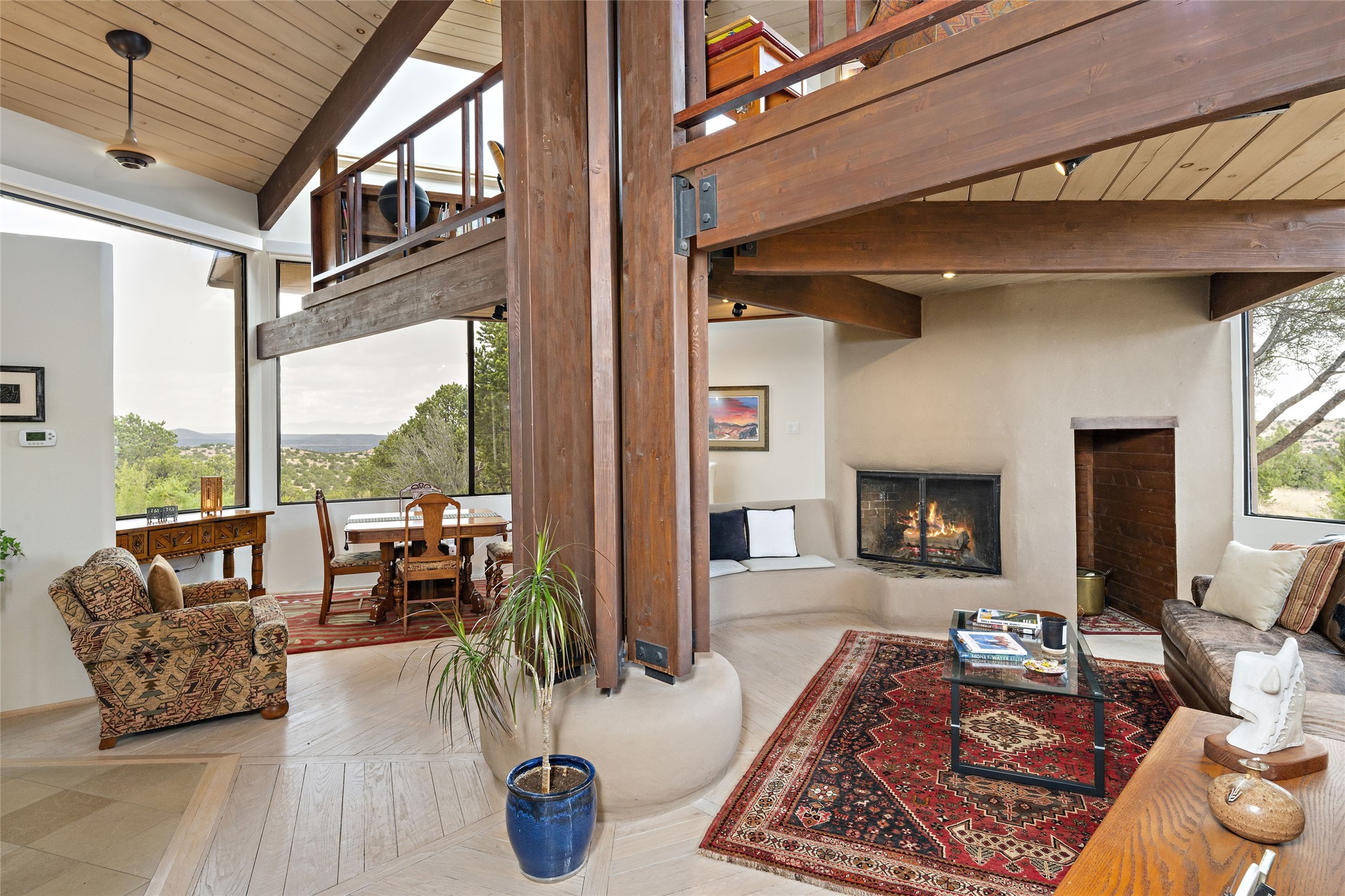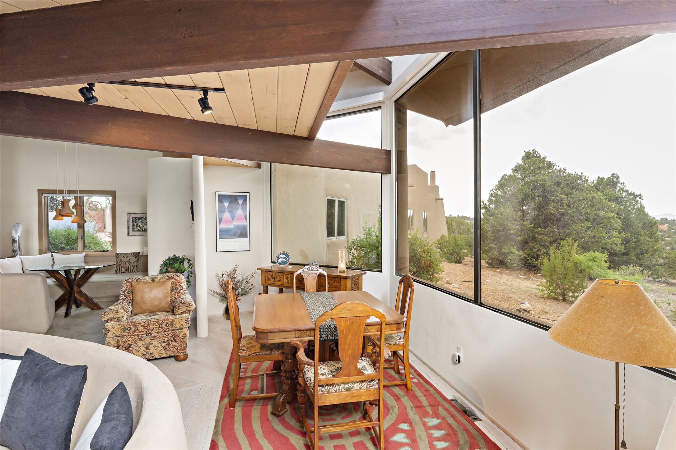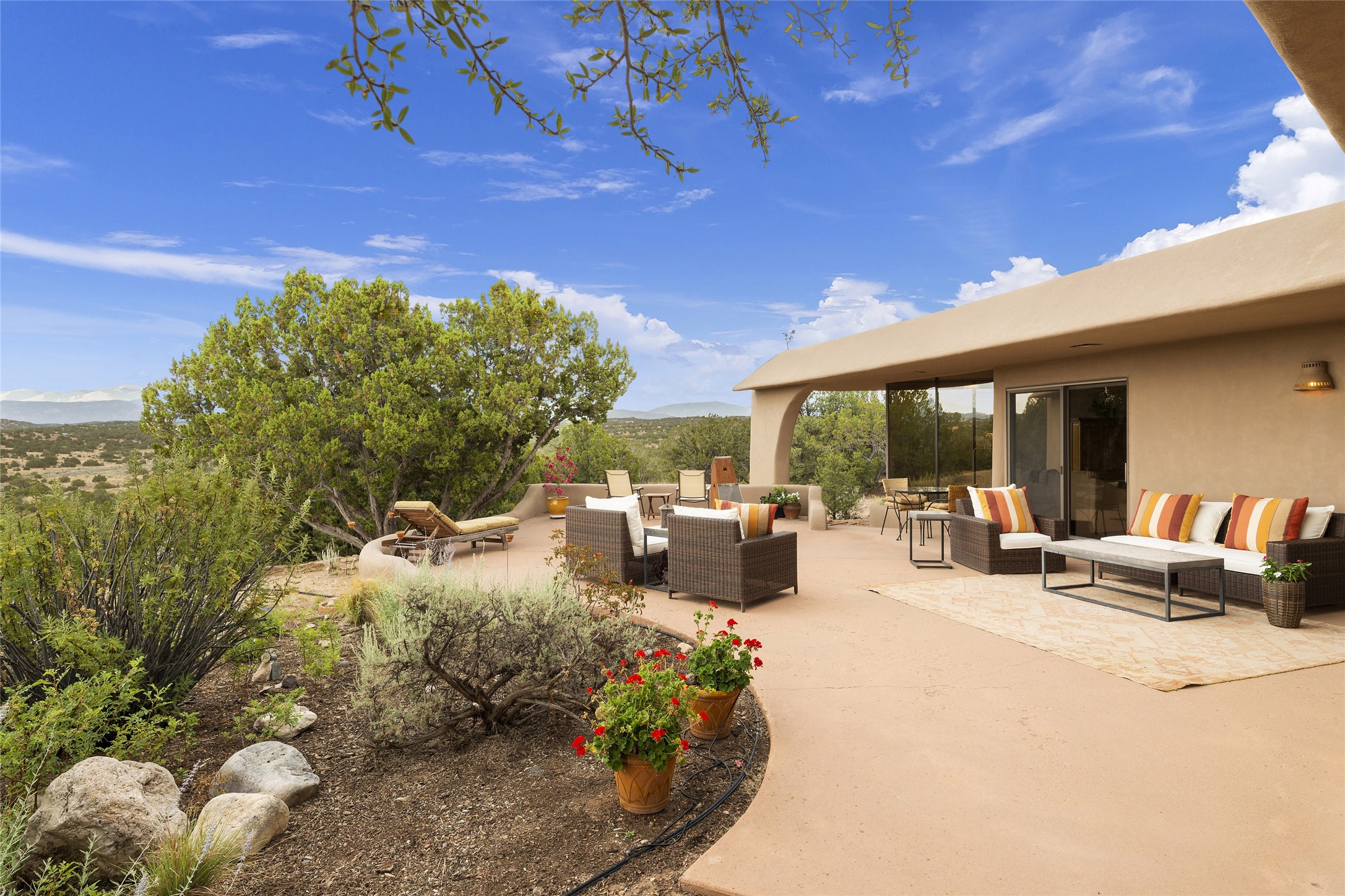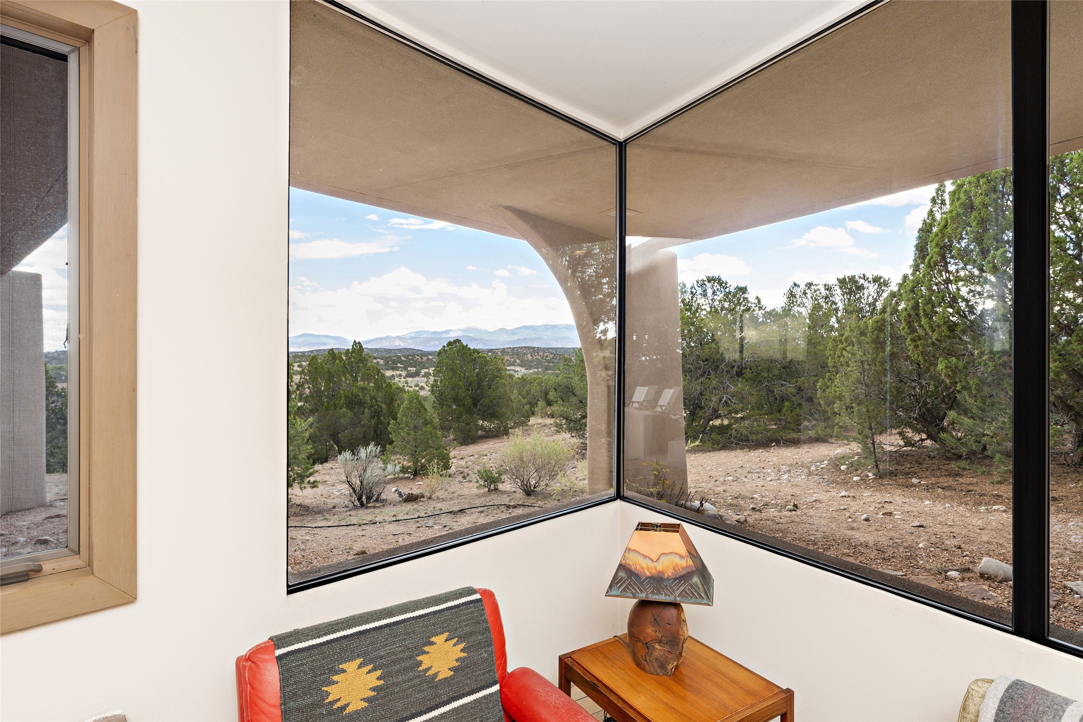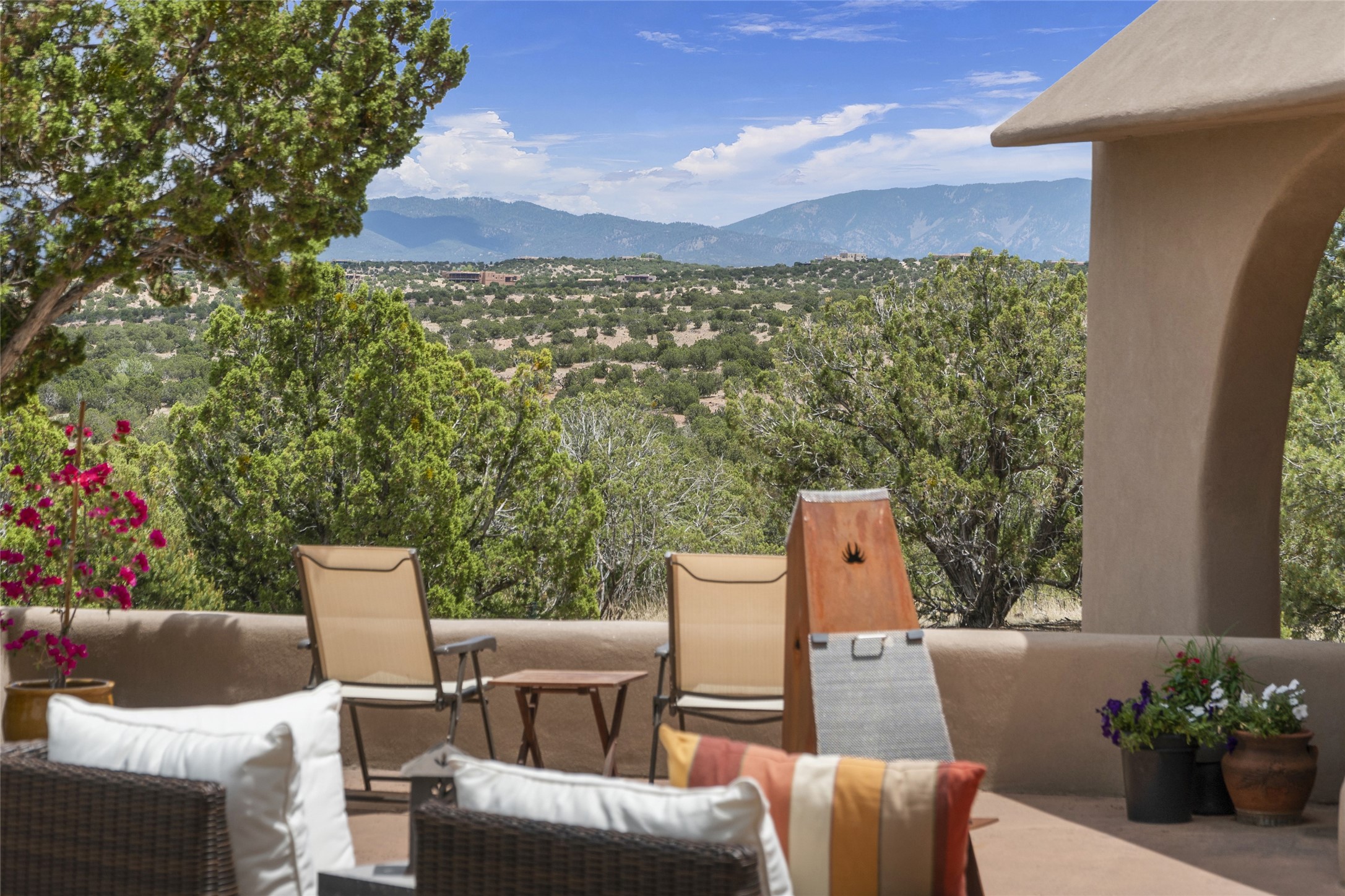 This architecturally stunning home is perfectly perched on a private 10+ acre La Tierra lot in a manner to accentuate the 360 views. Relish the captivating Sangre De Cristo mountains to the east, relax in the evening to the spectacular New Mexico sunsets over the Jemez Mountains to the west. This home was designed by Ted Luna to be both organic and time-less with interiors and exteriors in balanced harmony. The use of glass and materials brings the outside in. The floors are a combination of limestone and hardwood. Upon entering the home through a glorious front courtyard garden, you will note the magnificent front door which sets the stage for the soaring octagonal ceiling and huge windows framing the awesome views. The main home has 3 bedrooms, with the 2nd ensuite bedroom potentially a wonderful office with big windows and views. Except for the library loft, this home is one level with no interior steps. The primary bedroom suite also maximizes the huge views and features an oversized wood burning kiva fireplace. The private, attached casita has its own entry. The air-conditioned home has a 3 car oversized garage that is heated and also air conditioned. There is also a 24 X 12 outbuilding that serves as a garage space for a 4th vehicle. The totally electric home, has solar installed, that causes the utility cost to be a fraction of what a similar sized home would be. And one can have this private setting, with the magnificent views, yet be less than 15 minutes to town.