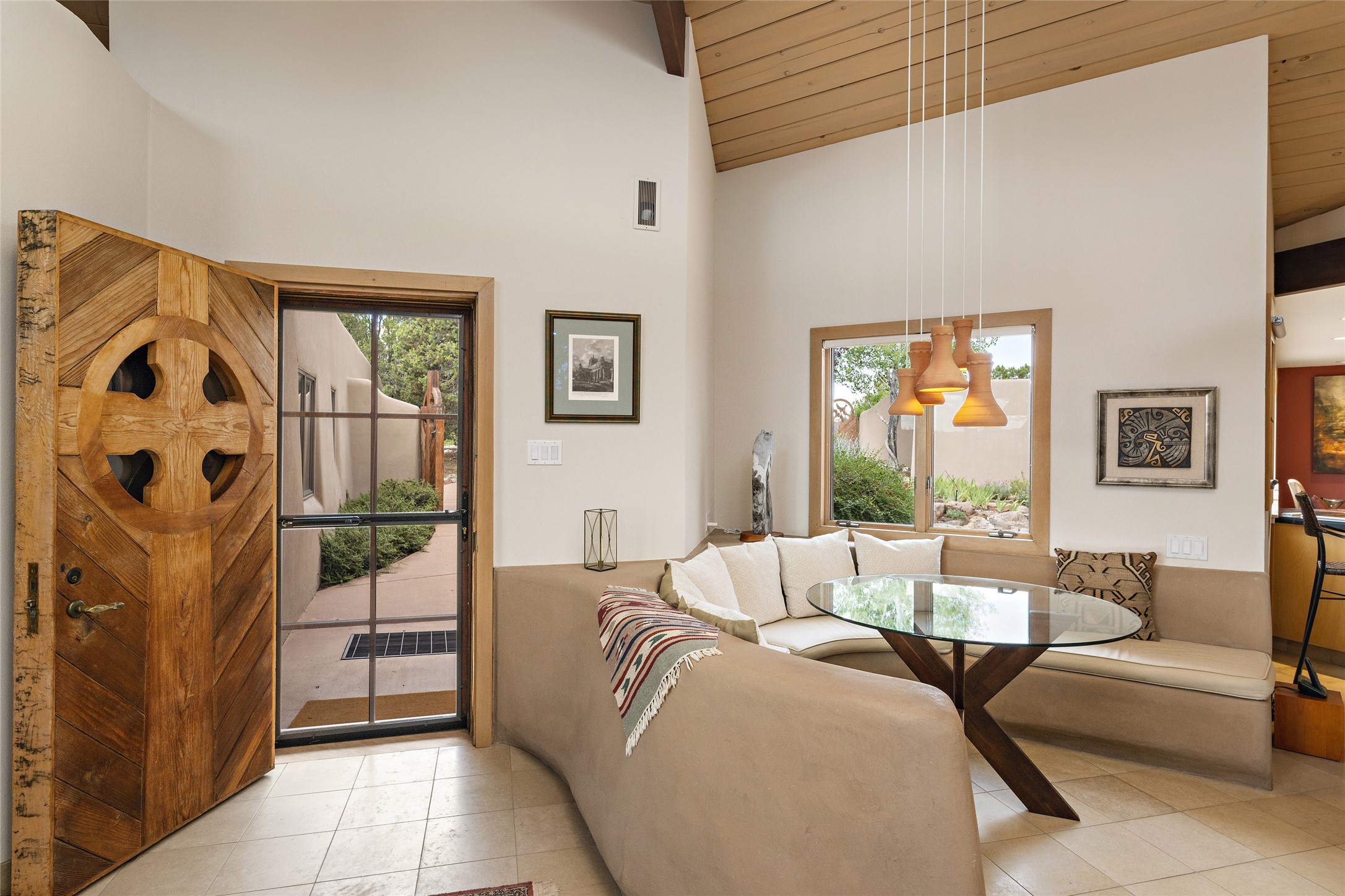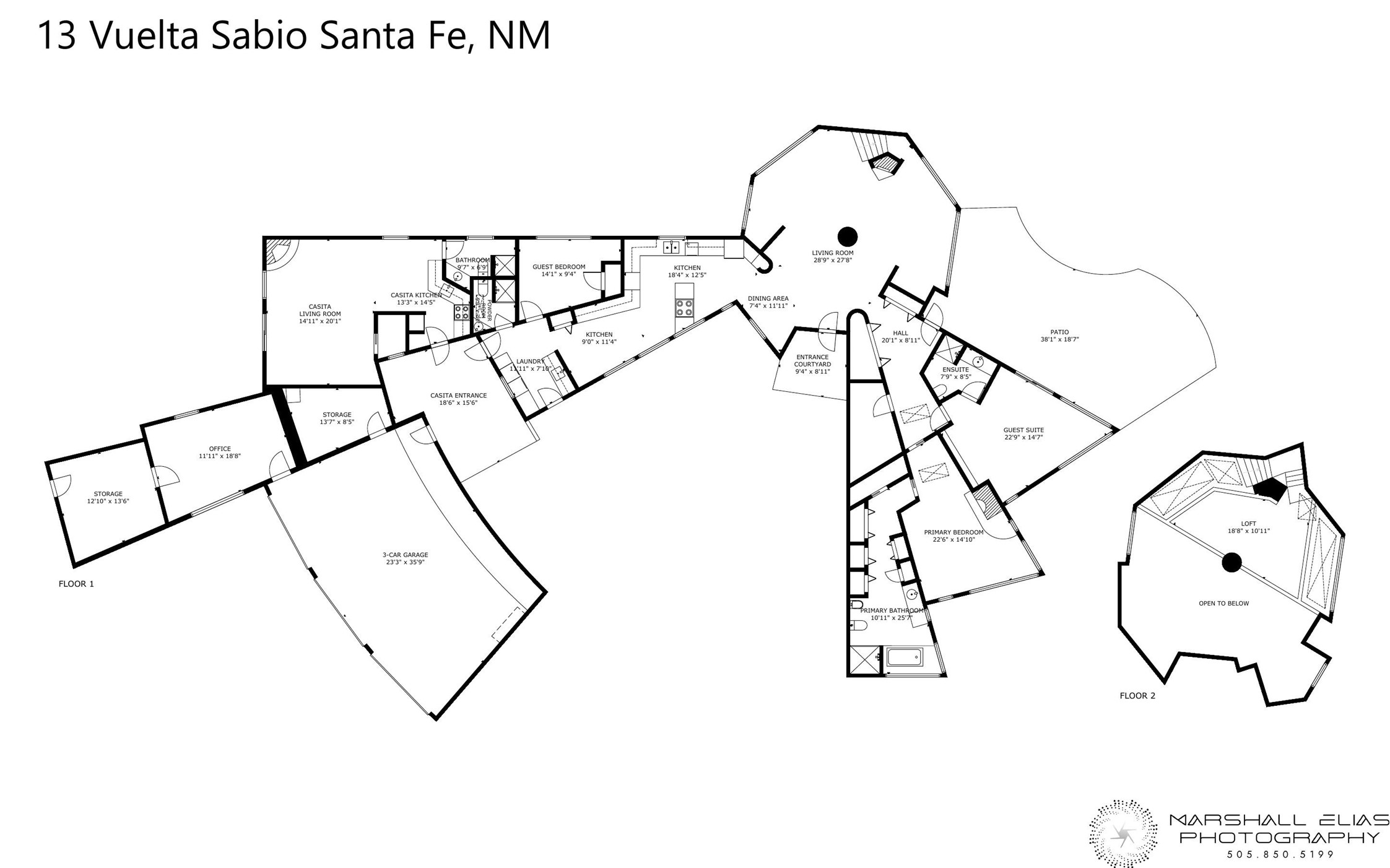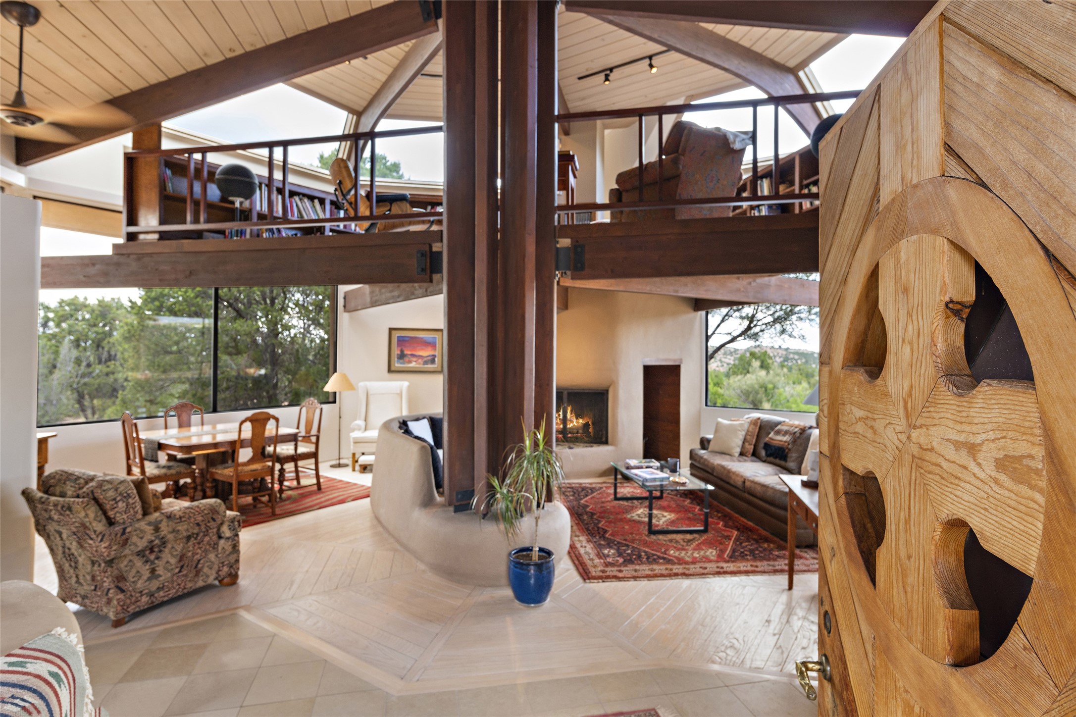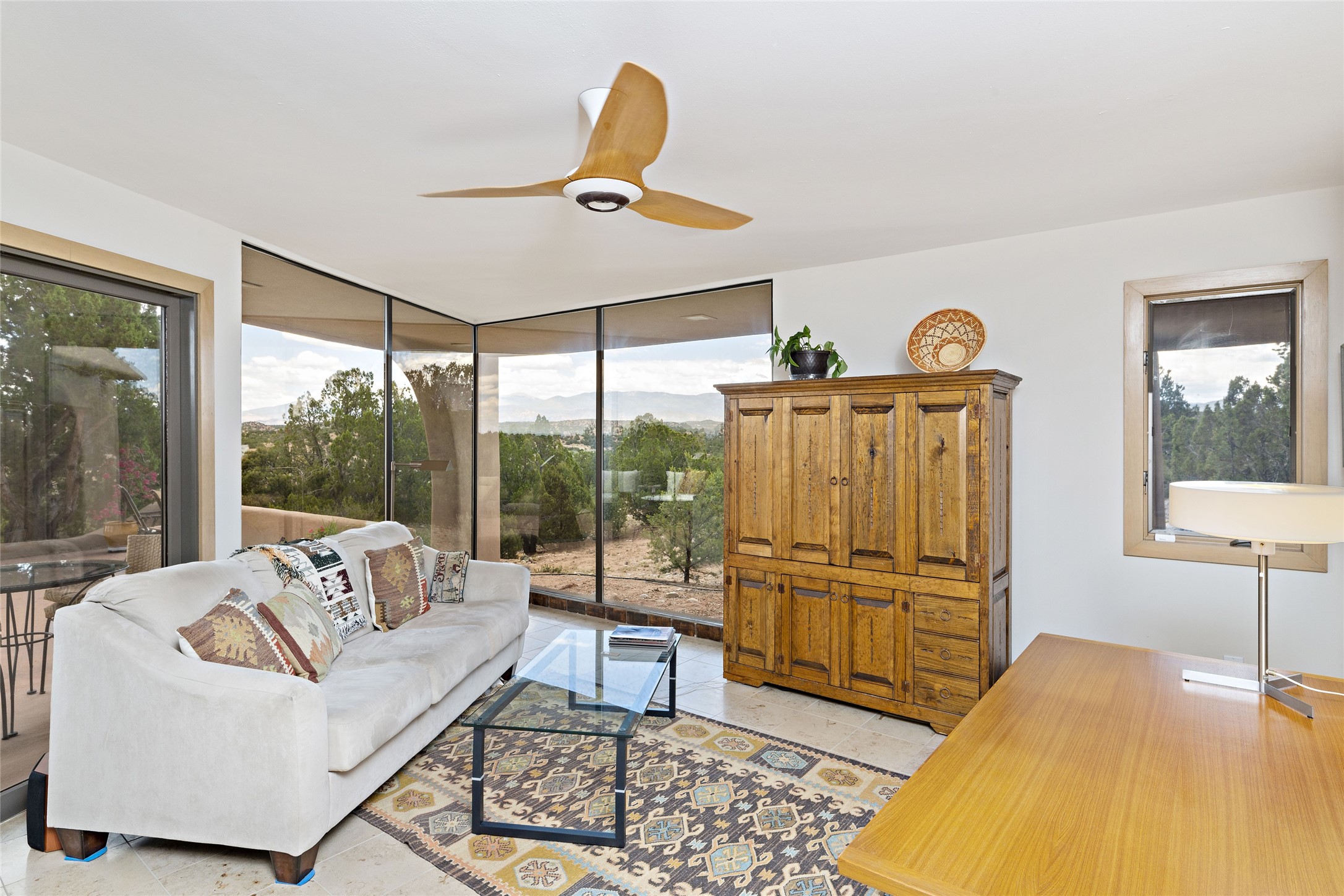 This architecturally stunning home is perfectly perched on a private 10+ acre La Tierra lot in a manner to accentuate the 360 views. Relish the captivating Sangre De Cristo mountains to the east, relax in the evening to the spectacular New Mexico sunsets over the Jemez Mountains to the west. This home was designed by Ted Luna to be both organic and time-less with interiors and exteriors in balanced harmony. The use of glass and materials brings the outside in. The floors are a combination of limestone and hardwood. Upon entering the home through a glorious front courtyard garden, you will note the magnificent front door which sets the stage for the soaring octagonal ceiling and huge windows framing the awesome views. The main home has 3 bedrooms, with the 2nd ensuite bedroom potentially a wonderful office with big windows and views. Except for the library loft, this home is one level with no interior steps. The primary bedroom suite also maximizes the huge views and features an oversized wood burning kiva fireplace. The private, attached casita has its own entry. The air-conditioned home has a 3 car oversized garage that is heated and also air conditioned. There is also a 24 X 12 outbuilding that serves as a garage space for a 4th vehicle. The totally electric home, has solar installed, that causes the utility cost to be a fraction of what a similar sized home would be. And one can have this private setting, with the magnificent views, yet be less than 15 minutes to town.