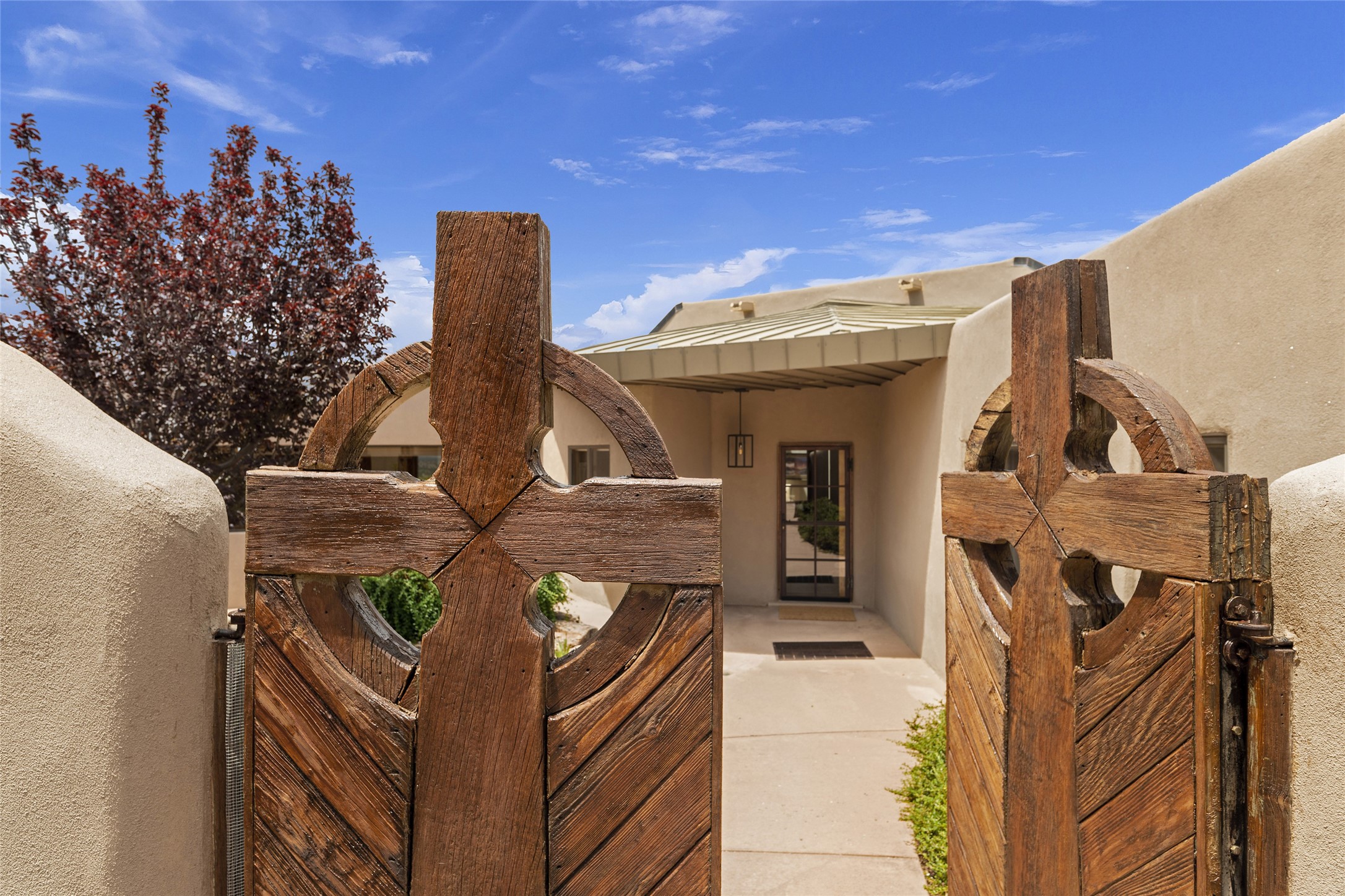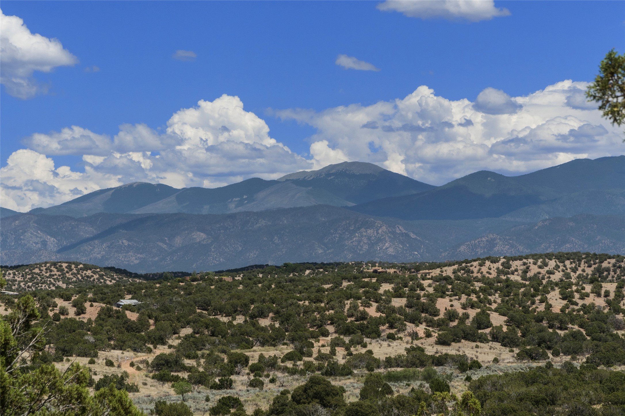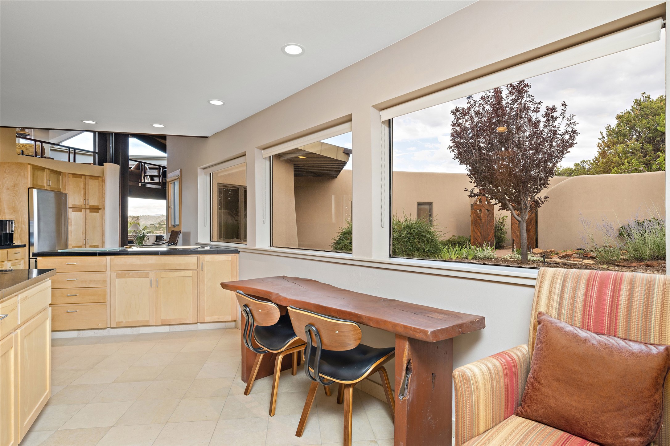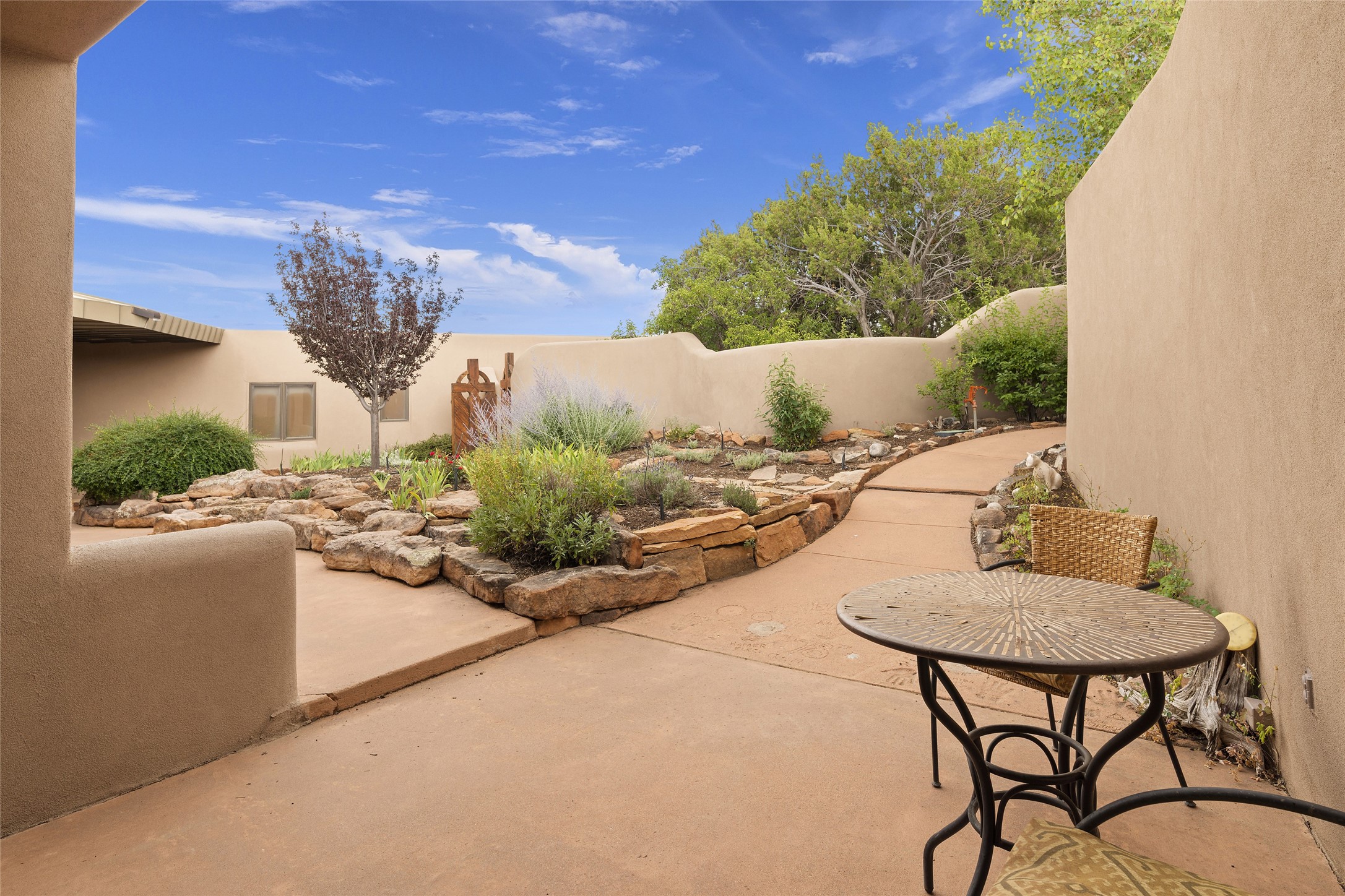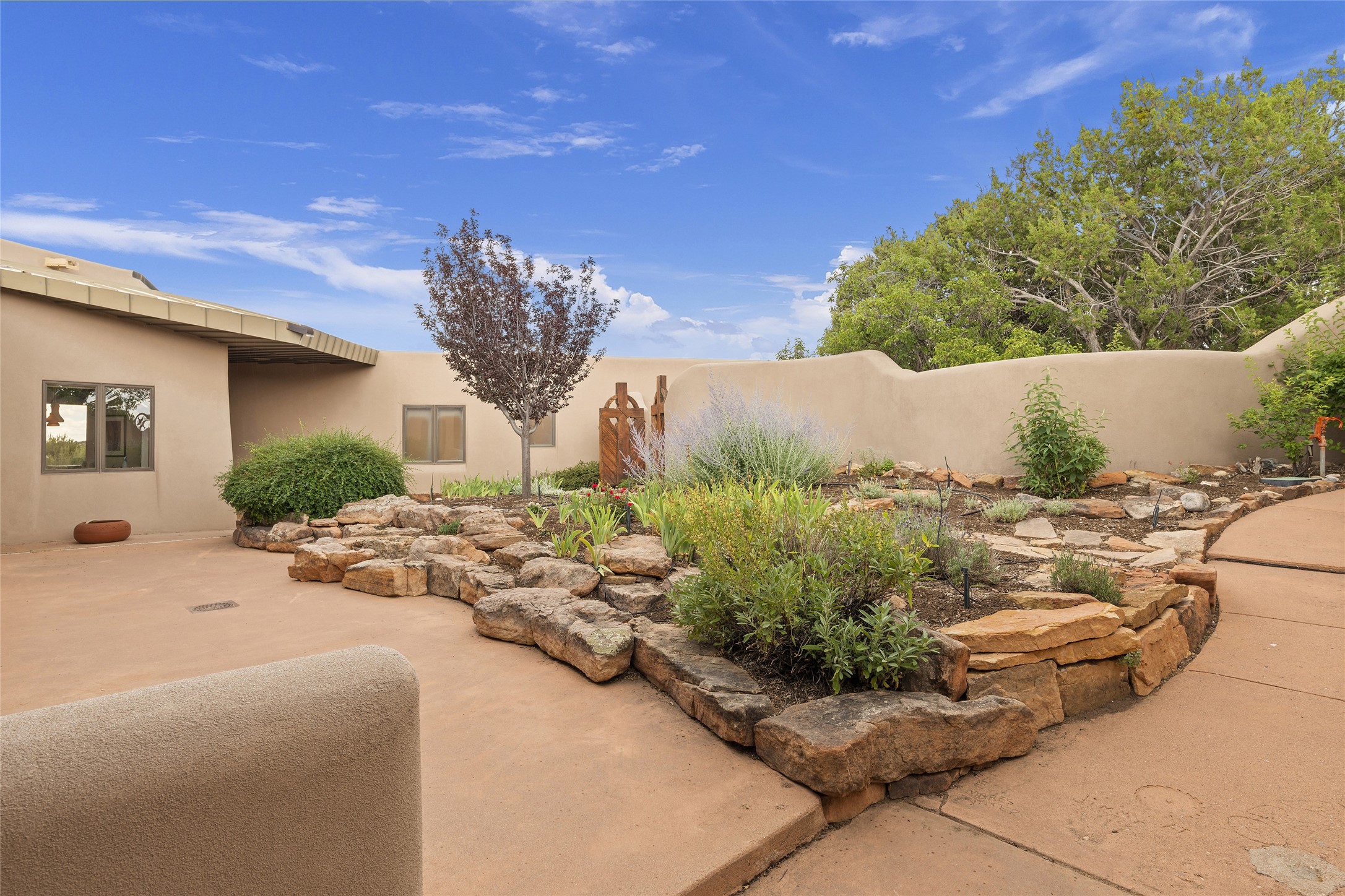 This architecturally stunning home is perfectly perched on a private 10+ acre La Tierra lot in a manner to accentuate the 360 views. Relish the captivating Sangre De Cristo mountains to the east, relax in the evening to the spectacular New Mexico sunsets over the Jemez Mountains to the west. This home was designed by Ted Luna to be both organic and time-less with interiors and exteriors in balanced harmony. The use of glass and materials brings the outside in. The floors are a combination of limestone and hardwood. Upon entering the home through a glorious front courtyard garden, you will note the magnificent front door which sets the stage for the soaring octagonal ceiling and huge windows framing the awesome views. The main home has 3 bedrooms, with the 2nd ensuite bedroom potentially a wonderful office with big windows and views. Except for the library loft, this home is one level with no interior steps. The primary bedroom suite also maximizes the huge views and features an oversized wood burning kiva fireplace. The private, attached casita has its own entry. The air-conditioned home has a 3 car oversized garage that is heated and also air conditioned. There is also a 24 X 12 outbuilding that serves as a garage space for a 4th vehicle. The totally electric home, has solar installed, that causes the utility cost to be a fraction of what a similar sized home would be. And one can have this private setting, with the magnificent views, yet be less than 15 minutes to town.