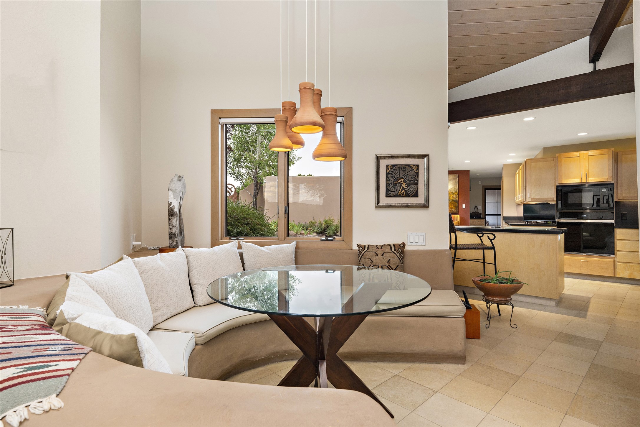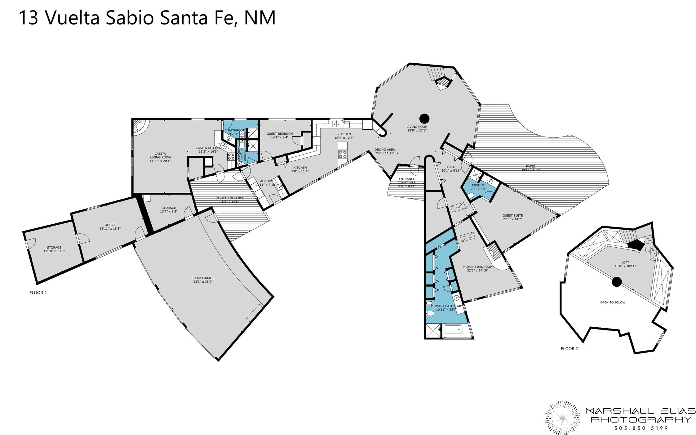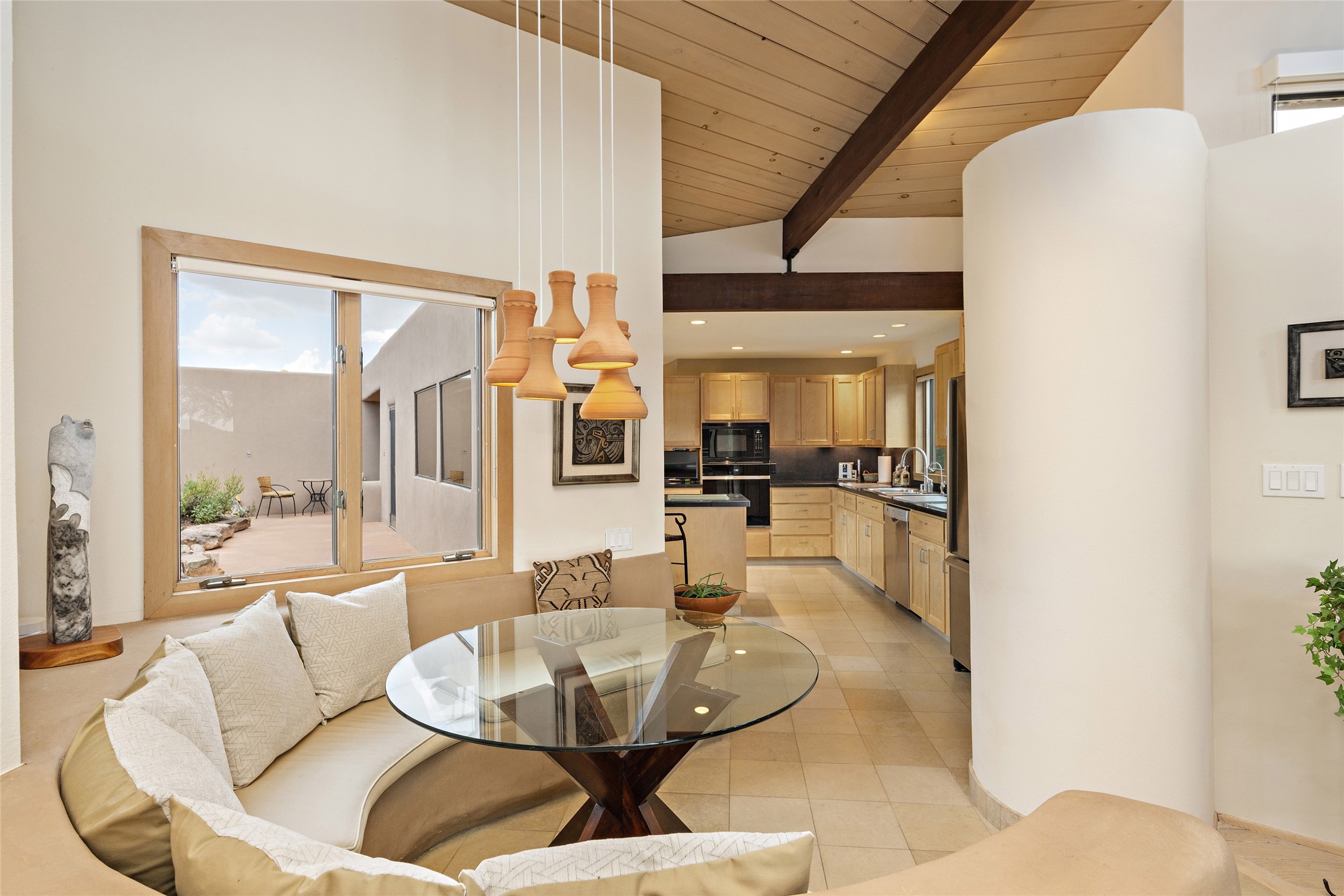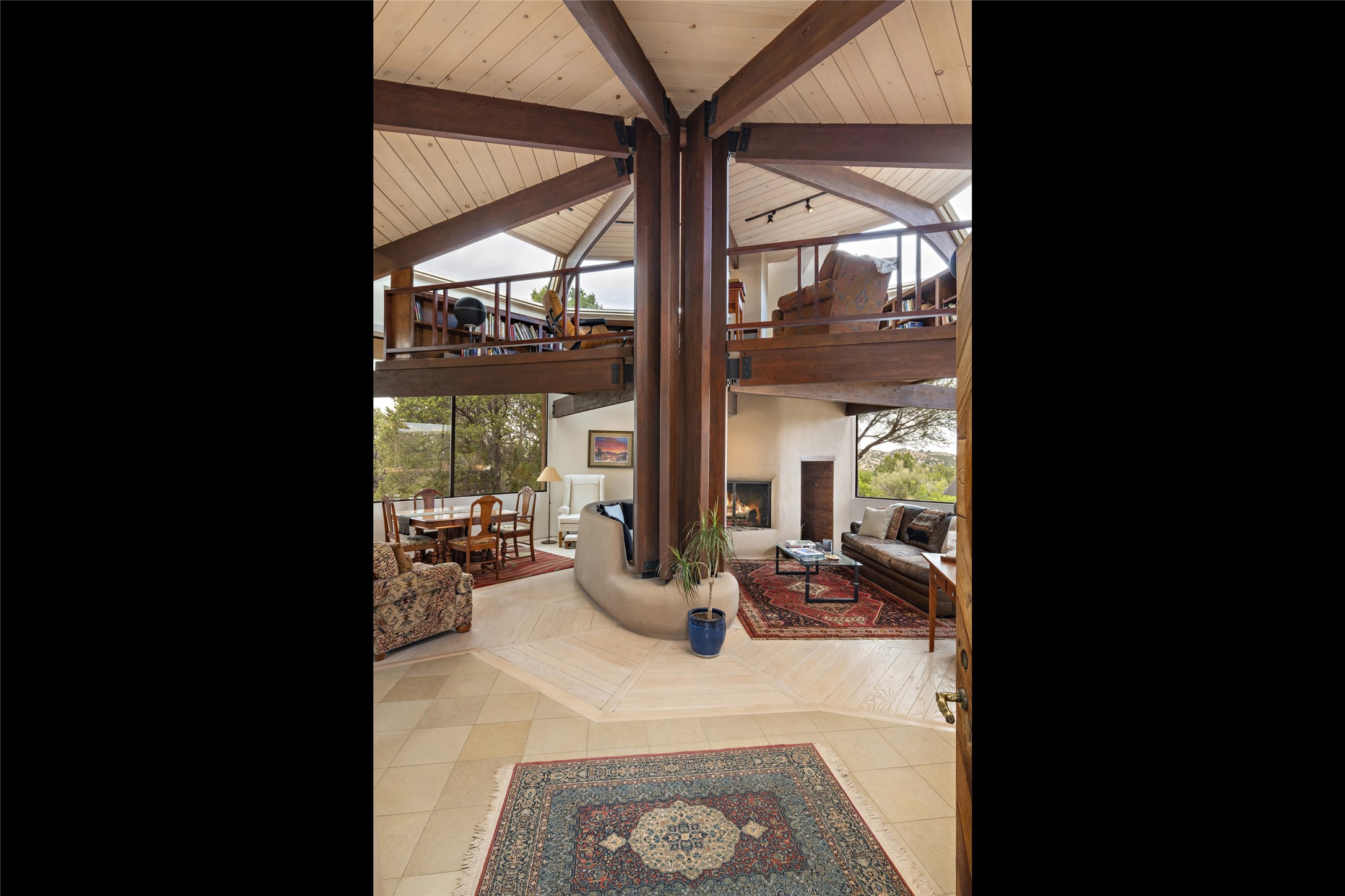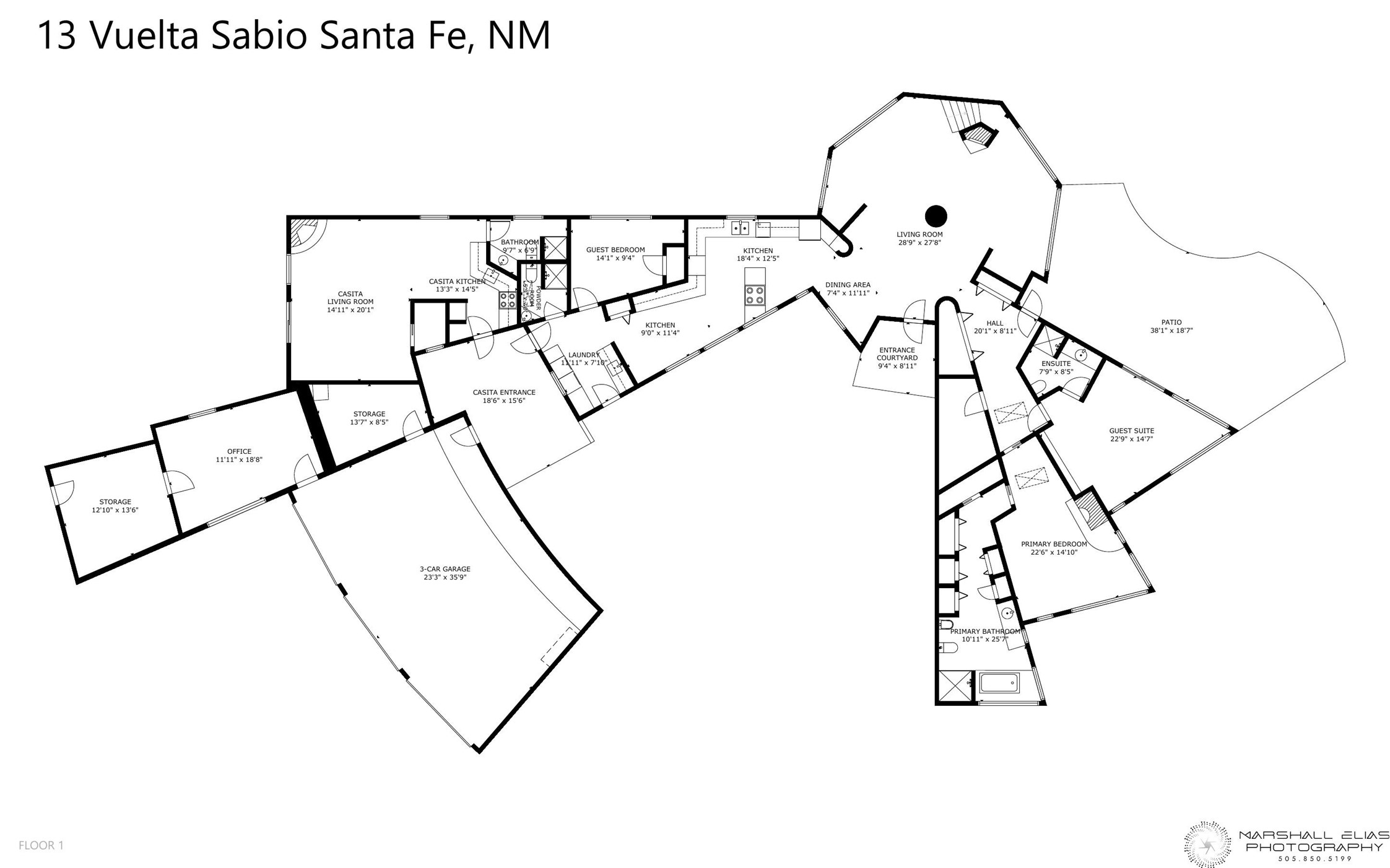 This architecturally stunning home is perfectly perched on a private 10+ acre La Tierra lot in a manner to accentuate the 360 views. Relish the captivating Sangre De Cristo mountains to the east, relax in the evening to the spectacular New Mexico sunsets over the Jemez Mountains to the west. This home was designed by Ted Luna to be both organic and time-less with interiors and exteriors in balanced harmony. The use of glass and materials brings the outside in. The floors are a combination of limestone and hardwood. Upon entering the home through a glorious front courtyard garden, you will note the magnificent front door which sets the stage for the soaring octagonal ceiling and huge windows framing the awesome views. The main home has 3 bedrooms, with the 2nd ensuite bedroom potentially a wonderful office with big windows and views. Except for the library loft, this home is one level with no interior steps. The primary bedroom suite also maximizes the huge views and features an oversized wood burning kiva fireplace. The private, attached casita has its own entry. The air-conditioned home has a 3 car oversized garage that is heated and also air conditioned. There is also a 24 X 12 outbuilding that serves as a garage space for a 4th vehicle. The totally electric home, has solar installed, that causes the utility cost to be a fraction of what a similar sized home would be. And one can have this private setting, with the magnificent views, yet be less than 15 minutes to town.