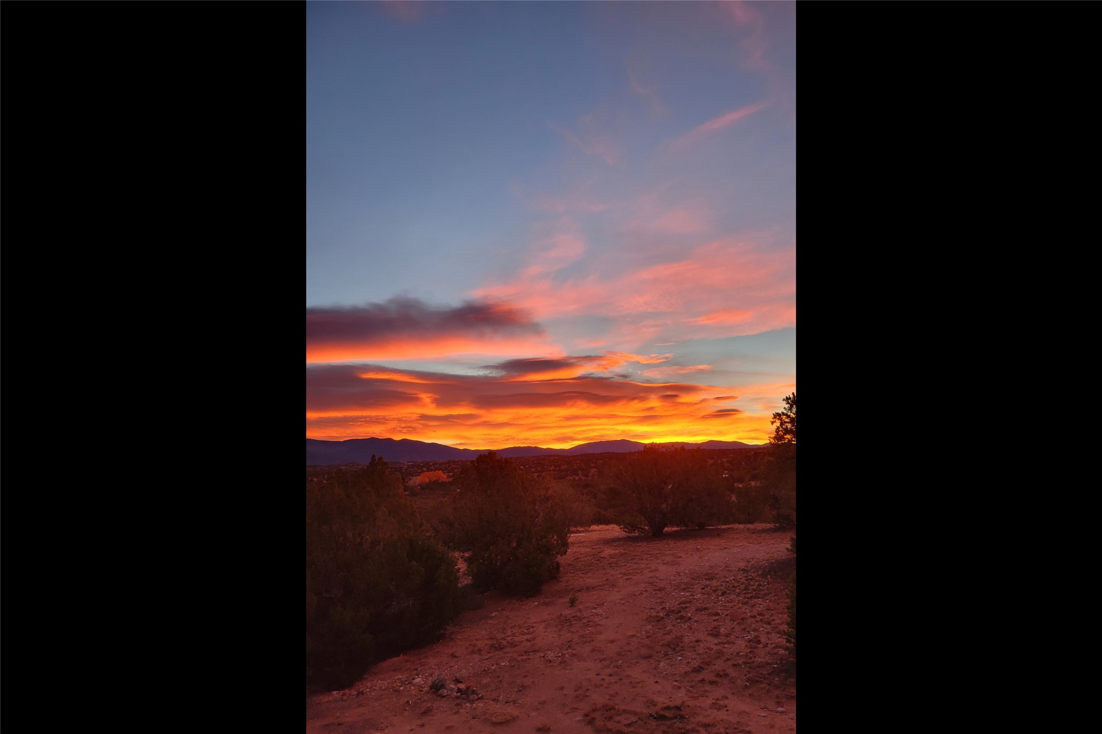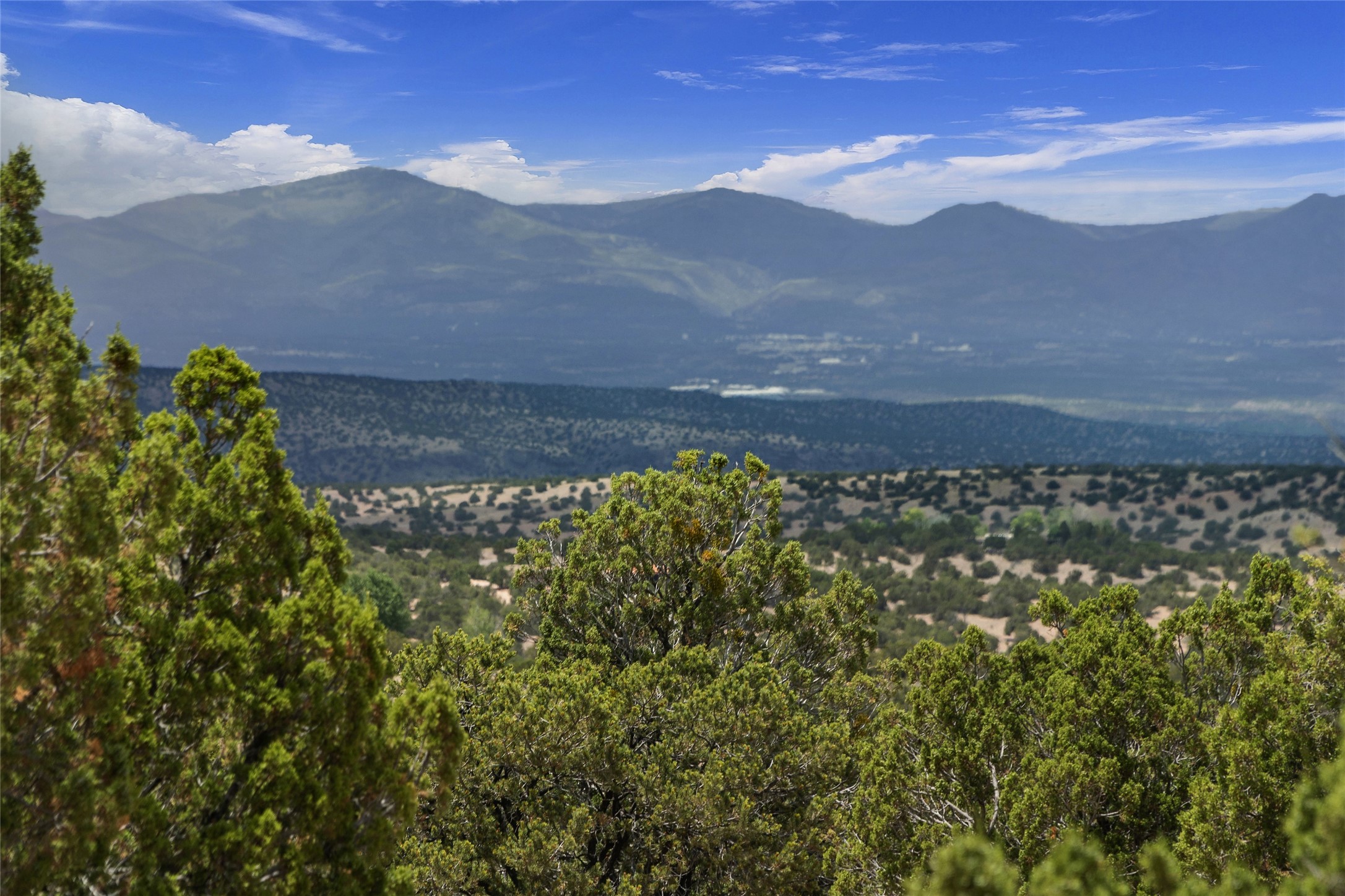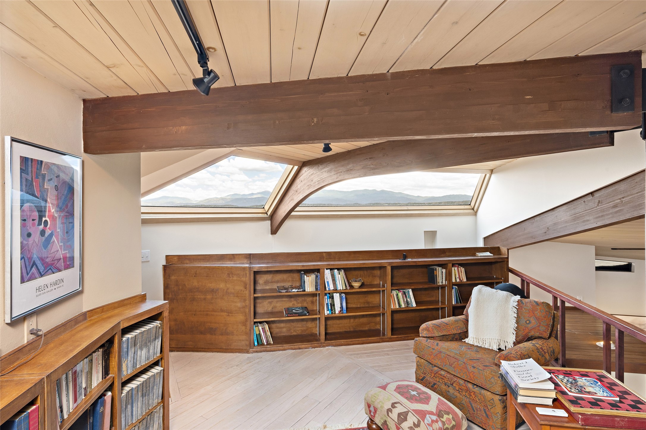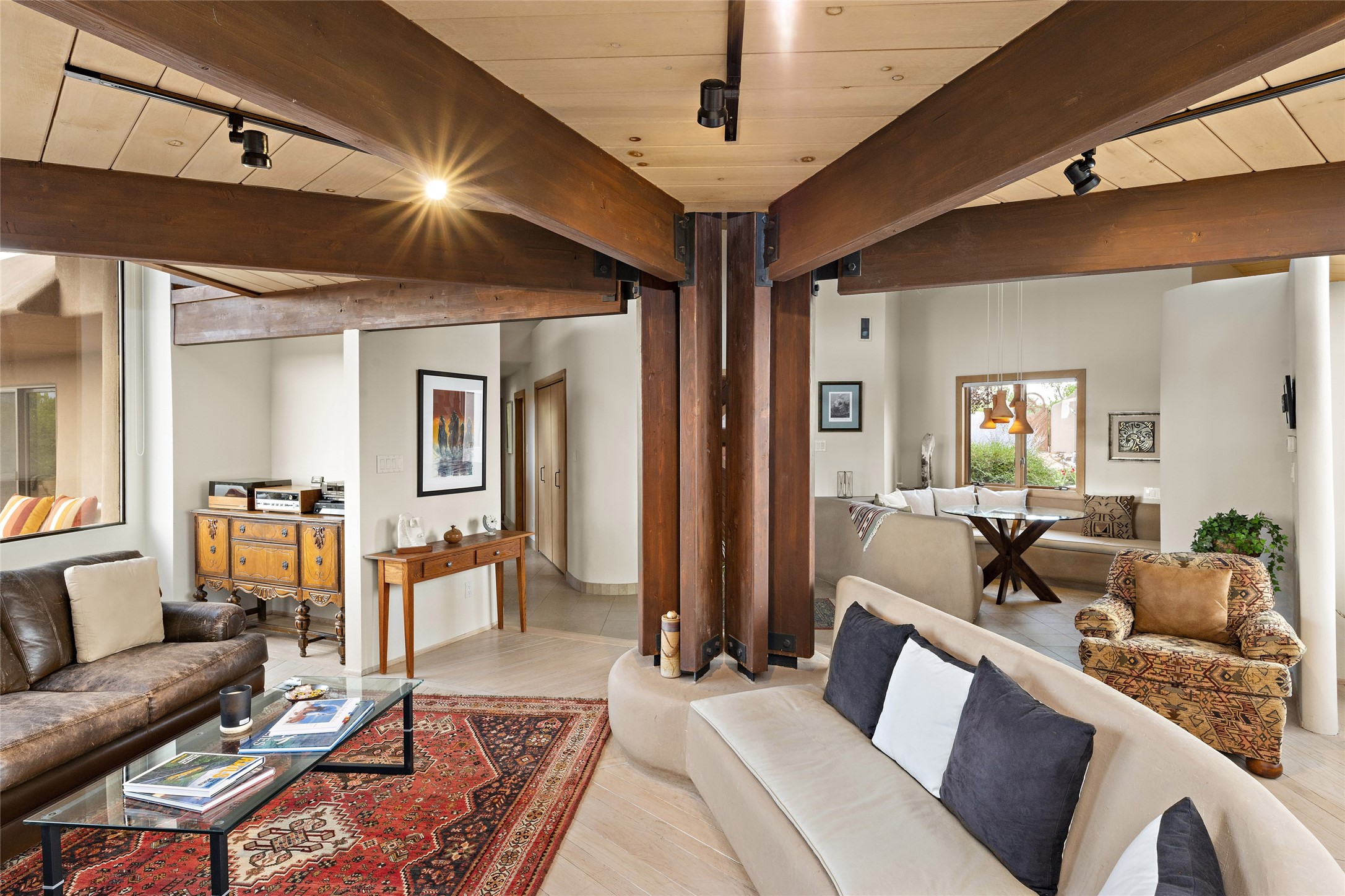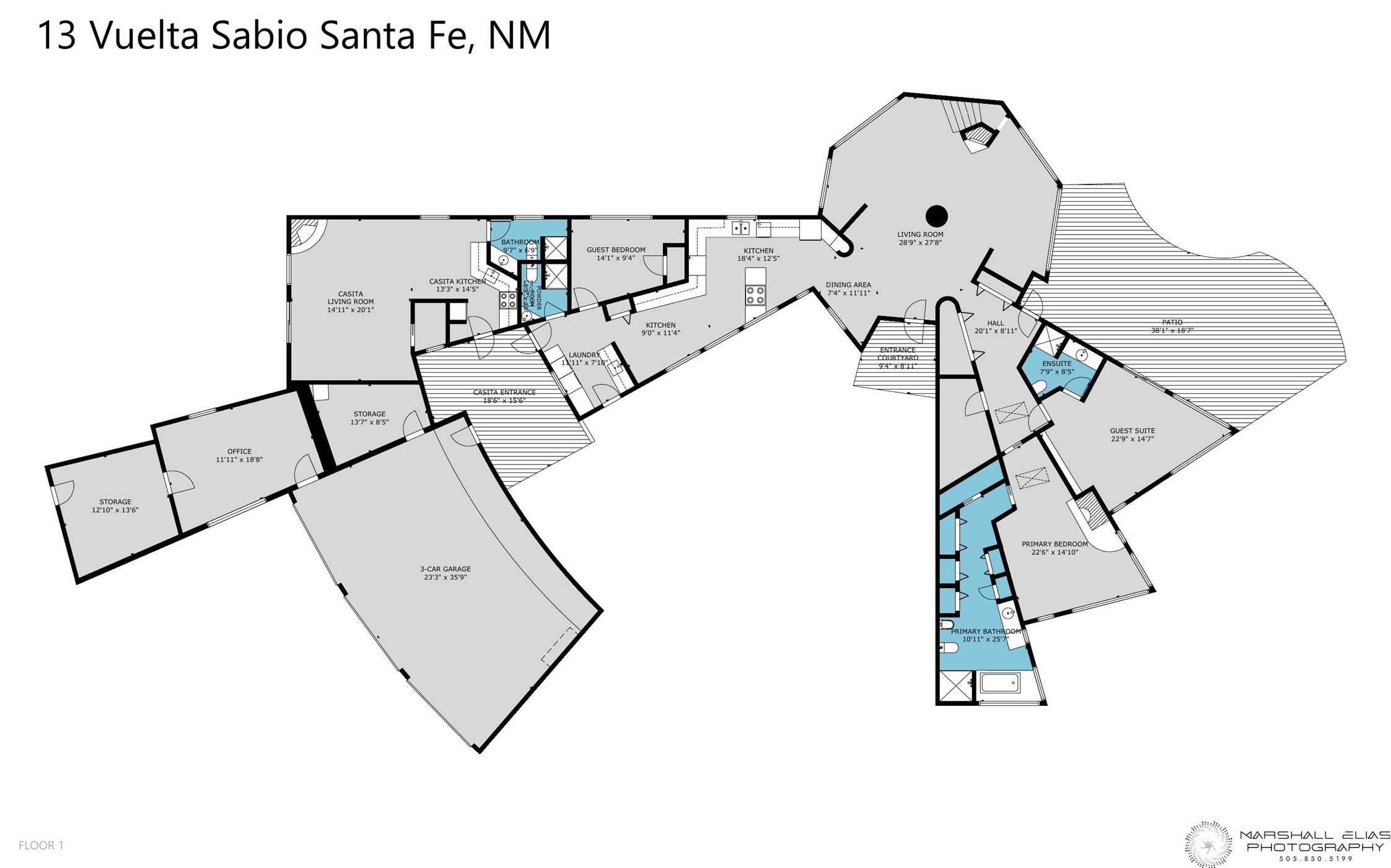This architecturally stunning home is perfectly perched on a private 10+ acre La Tierra lot in a manner to accentuate the 360 views. Relish the captivating Sangre De Cristo mountains to the east, relax in the evening to the spectacular New Mexico sunsets over the Jemez Mountains to the west. This home was designed by Ted Luna to be both organic and time-less with interiors and exteriors in balanced harmony. The use of glass and materials brings the outside in. The floors are a combination of limestone and hardwood. Upon entering the home through a glorious front courtyard garden, you will note the magnificent front door which sets the stage for the soaring octagonal ceiling and huge windows framing the awesome views. The main home has 3 bedrooms, with the 2nd ensuite bedroom potentially a wonderful office with big windows and views. Except for the library loft, this home is one level with no interior steps. The primary bedroom suite also maximizes the huge views and features an oversized wood burning kiva fireplace. The private, attached casita has its own entry. The air-conditioned home has a 3 car oversized garage that is heated and also air conditioned. There is also a 24 X 12 outbuilding that serves as a garage space for a 4th vehicle. The totally electric home, has solar installed, that causes the utility cost to be a fraction of what a similar sized home would be. And one can have this private setting, with the magnificent views, yet be less than 15 minutes to town.