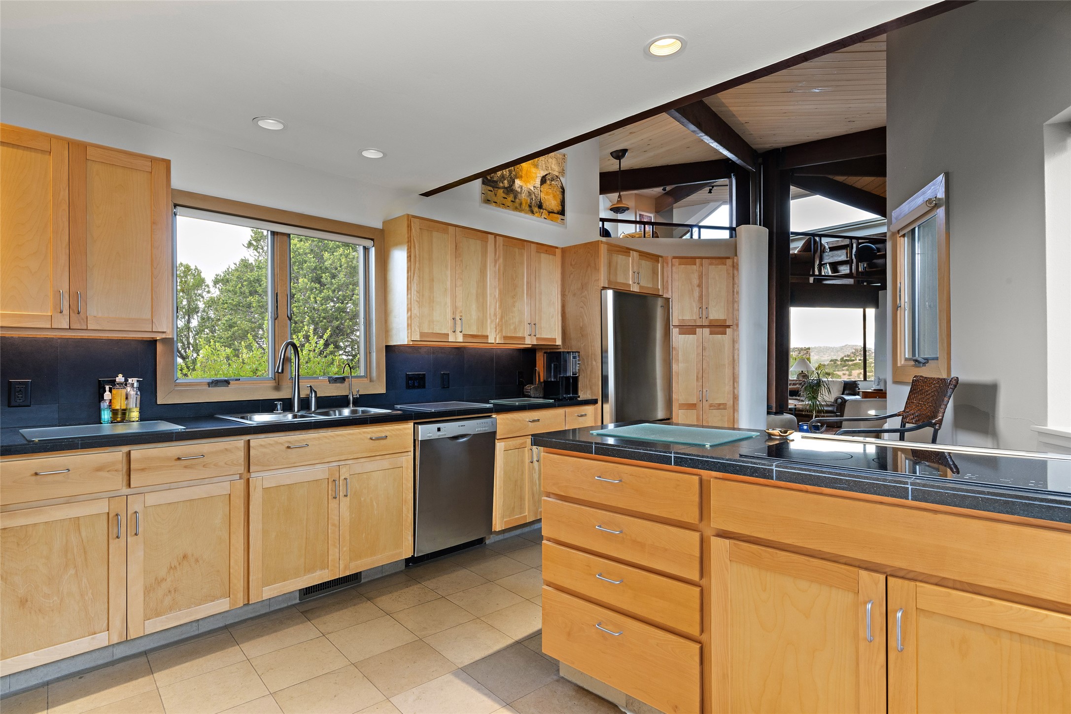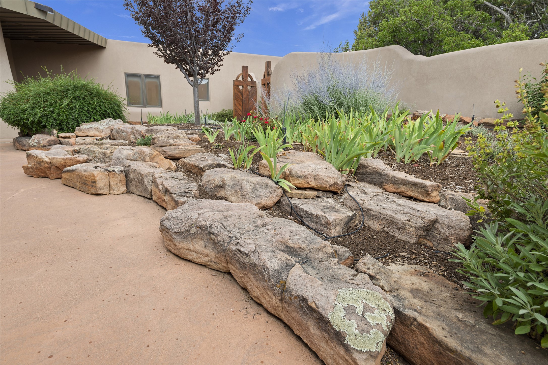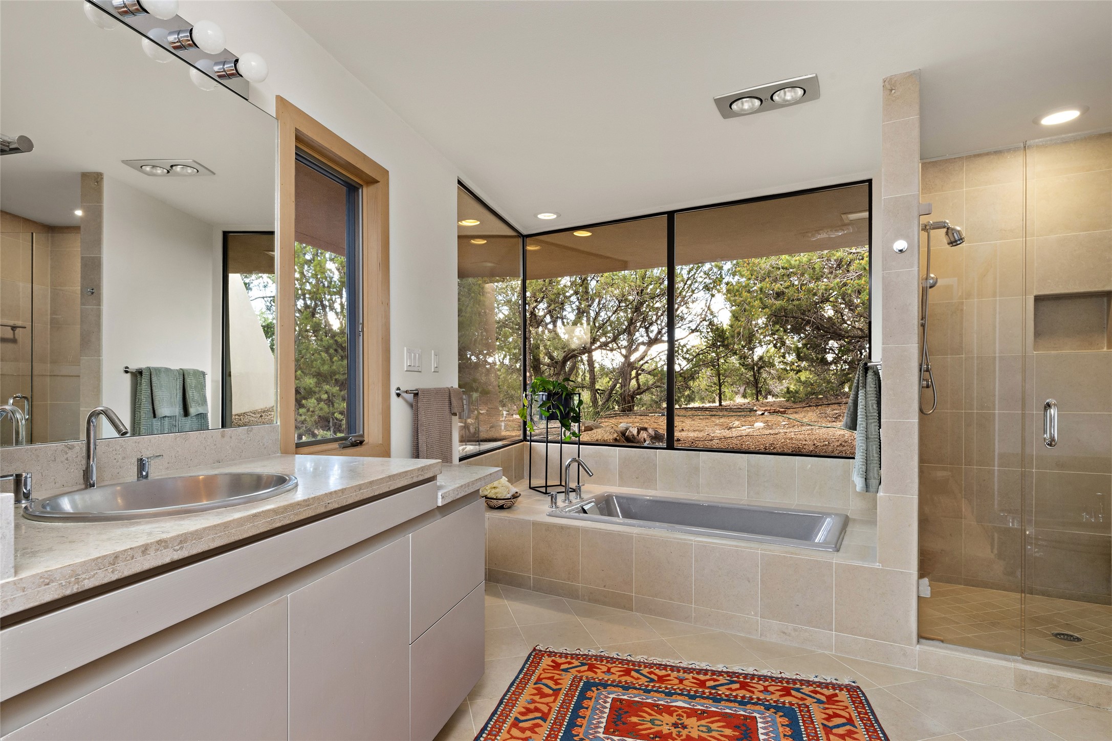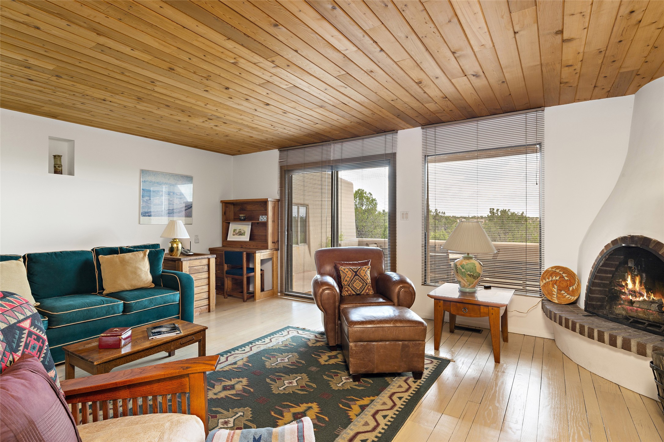 This architecturally stunning home is perfectly perched on a private 10+ acre La Tierra lot in a manner to accentuate the 360 views. Relish the captivating Sangre De Cristo mountains to the east, relax in the evening to the spectacular New Mexico sunsets over the Jemez Mountains to the west. This home was designed by Ted Luna to be both organic and time-less with interiors and exteriors in balanced harmony. The use of glass and materials brings the outside in. The floors are a combination of limestone and hardwood. Upon entering the home through a glorious front courtyard garden, you will note the magnificent front door which sets the stage for the soaring octagonal ceiling and huge windows framing the awesome views. The main home has 3 bedrooms, with the 2nd ensuite bedroom potentially a wonderful office with big windows and views. Except for the library loft, this home is one level with no interior steps. The primary bedroom suite also maximizes the huge views and features an oversized wood burning kiva fireplace. The private, attached casita has its own entry. The air-conditioned home has a 3 car oversized garage that is heated and also air conditioned. There is also a 24 X 12 outbuilding that serves as a garage space for a 4th vehicle. The totally electric home, has solar installed, that causes the utility cost to be a fraction of what a similar sized home would be. And one can have this private setting, with the magnificent views, yet be less than 15 minutes to town.