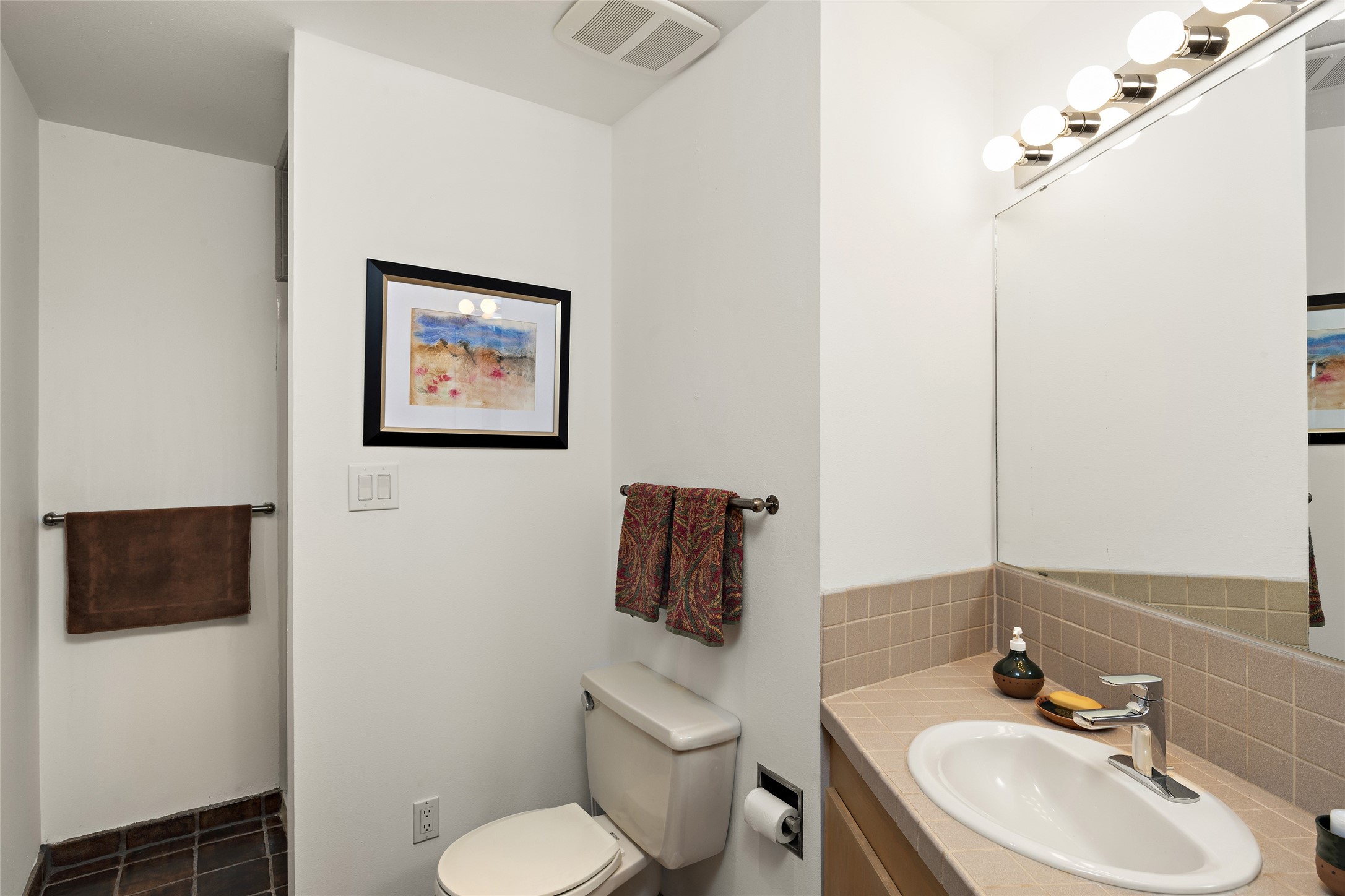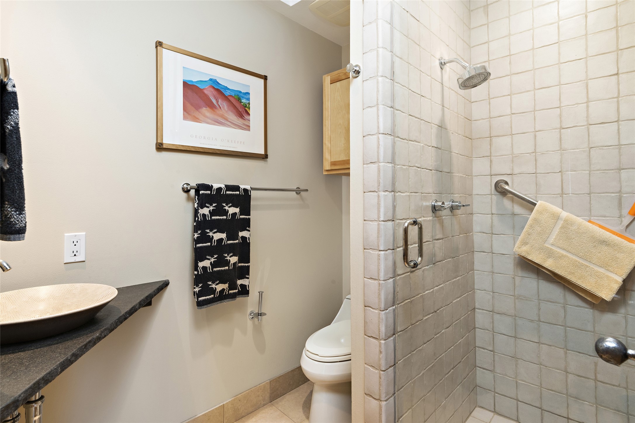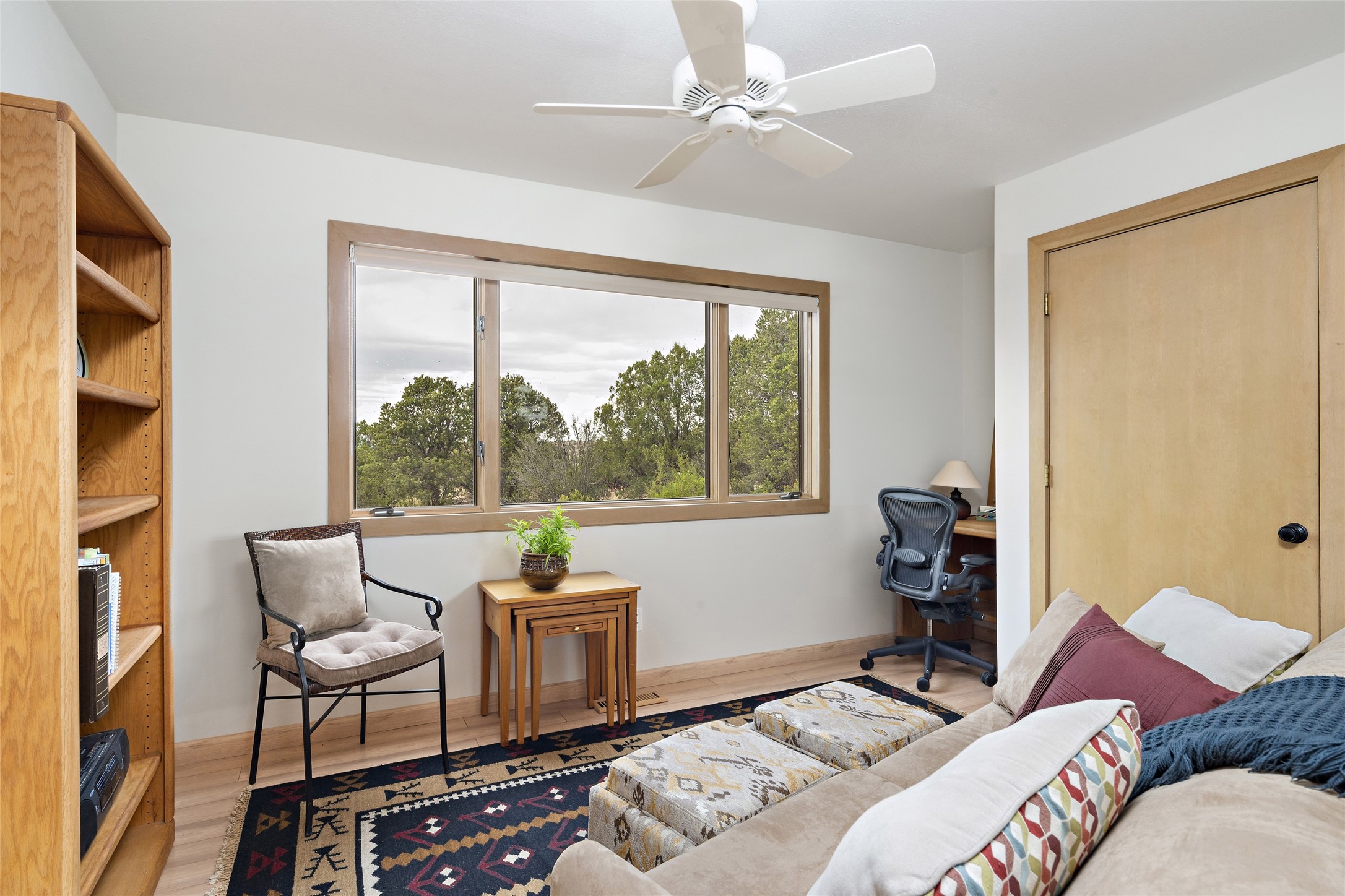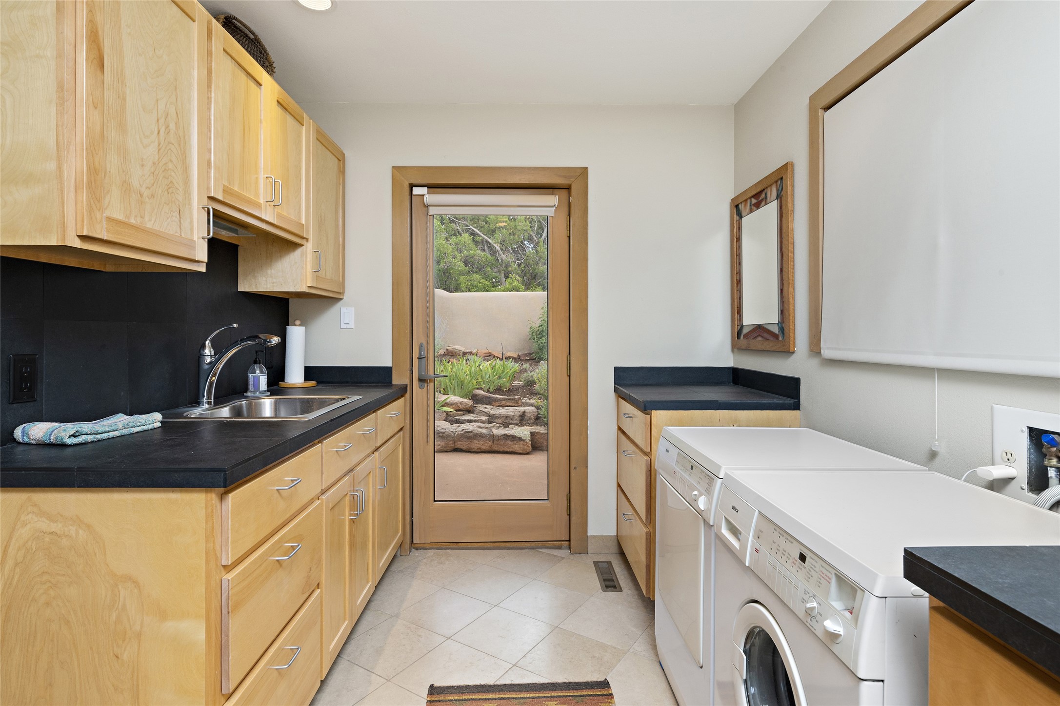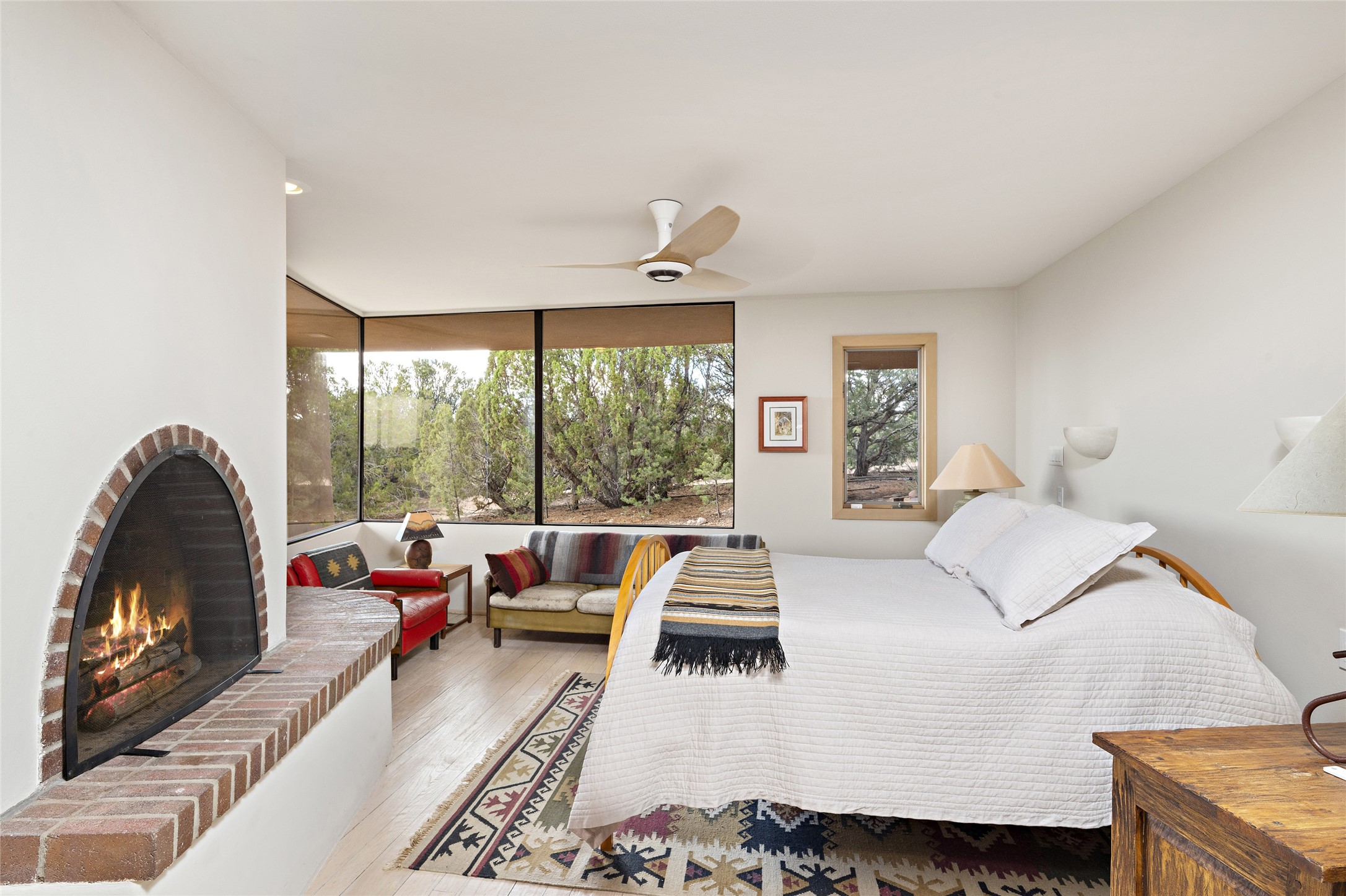 This architecturally stunning home is perfectly perched on a private 10+ acre La Tierra lot in a manner to accentuate the 360 views. Relish the captivating Sangre De Cristo mountains to the east, relax in the evening to the spectacular New Mexico sunsets over the Jemez Mountains to the west. This home was designed by Ted Luna to be both organic and time-less with interiors and exteriors in balanced harmony. The use of glass and materials brings the outside in. The floors are a combination of limestone and hardwood. Upon entering the home through a glorious front courtyard garden, you will note the magnificent front door which sets the stage for the soaring octagonal ceiling and huge windows framing the awesome views. The main home has 3 bedrooms, with the 2nd ensuite bedroom potentially a wonderful office with big windows and views. Except for the library loft, this home is one level with no interior steps. The primary bedroom suite also maximizes the huge views and features an oversized wood burning kiva fireplace. The private, attached casita has its own entry. The air-conditioned home has a 3 car oversized garage that is heated and also air conditioned. There is also a 24 X 12 outbuilding that serves as a garage space for a 4th vehicle. The totally electric home, has solar installed, that causes the utility cost to be a fraction of what a similar sized home would be. And one can have this private setting, with the magnificent views, yet be less than 15 minutes to town.