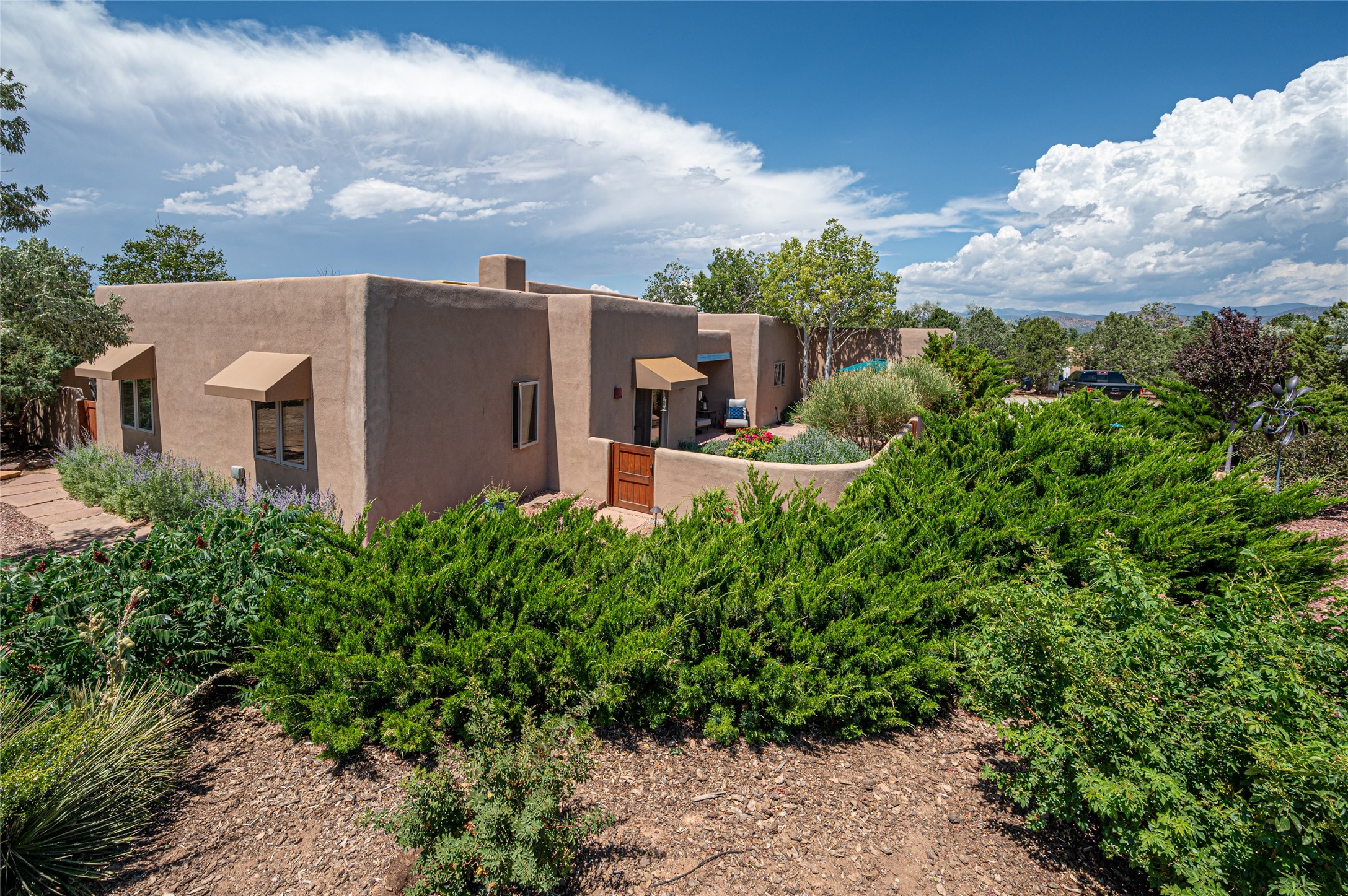 A quiet elegance and ambient symmetry flows throughout this exquisite Eldorado home. It is a shining example of pueblo contemporary design custom built by Adobeworks Inc. An open plan, split 3 bedroom plus lovely den/library with Rumford style central fireplace. Spacious living room with high viga ceilings, gleaming Saltillo floors and traditional kiva fireplace. Spacious kitchen with pantry and informal dining lead out onto a large shady portal. The main house includes over 2470 sq.ft plus a heated studio with half bath plus a 2 car finished garage. Beautifully maintained and surrounded by mature lovingly cared for walled gardens create private relaxing spaces. There is a walkway leading to a lovely remodeled and expanded 762 sq.ft casita which will delight your guests and family visitors. The home and casita share fabulous mountain views and yet delightfully private and peaceful. On one and half acres this home accesses all that Eldorado amenities offer plus local shopping, library, restaurants and open trails yet only minutes into Santa Fe. A must see!