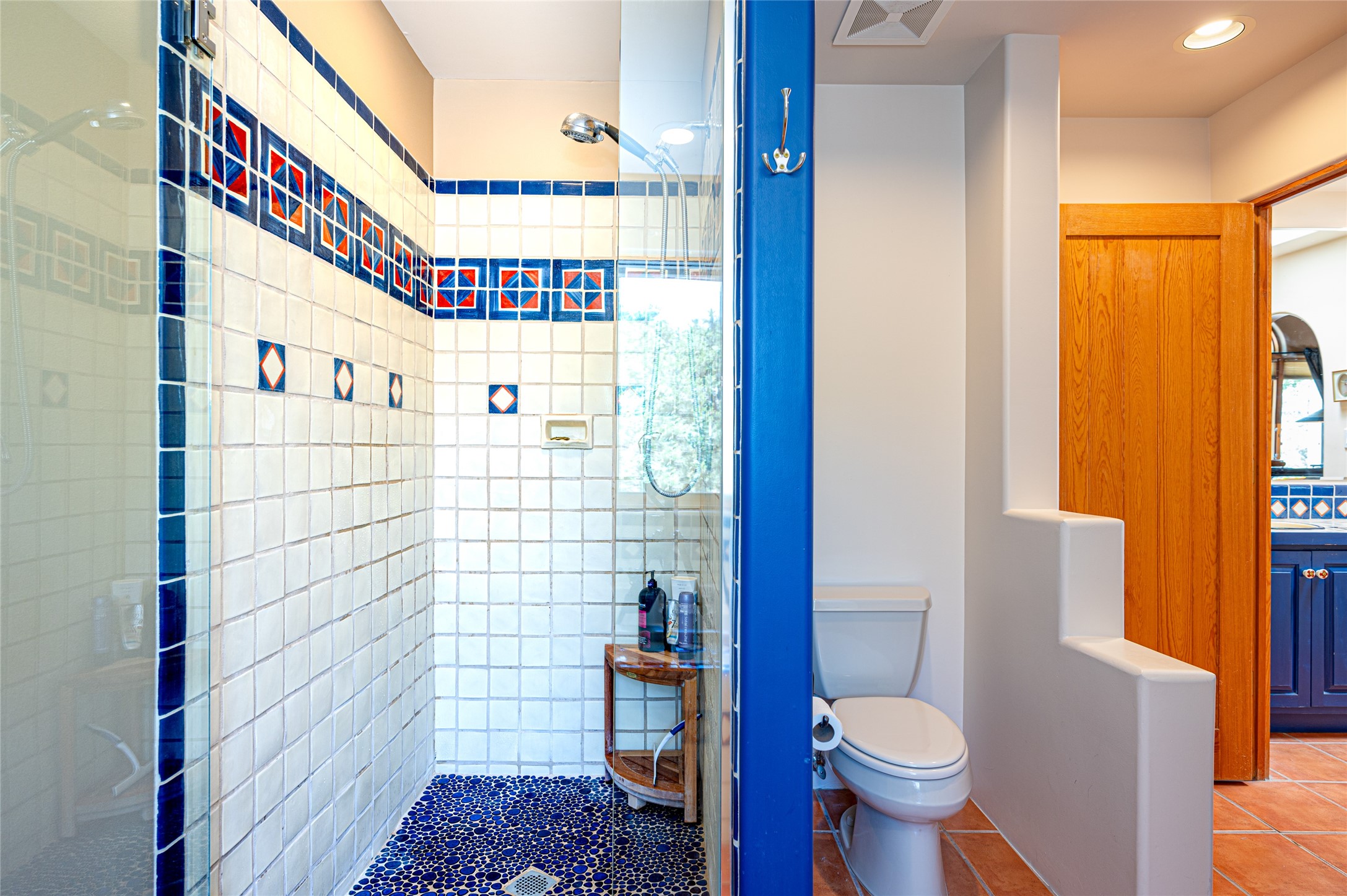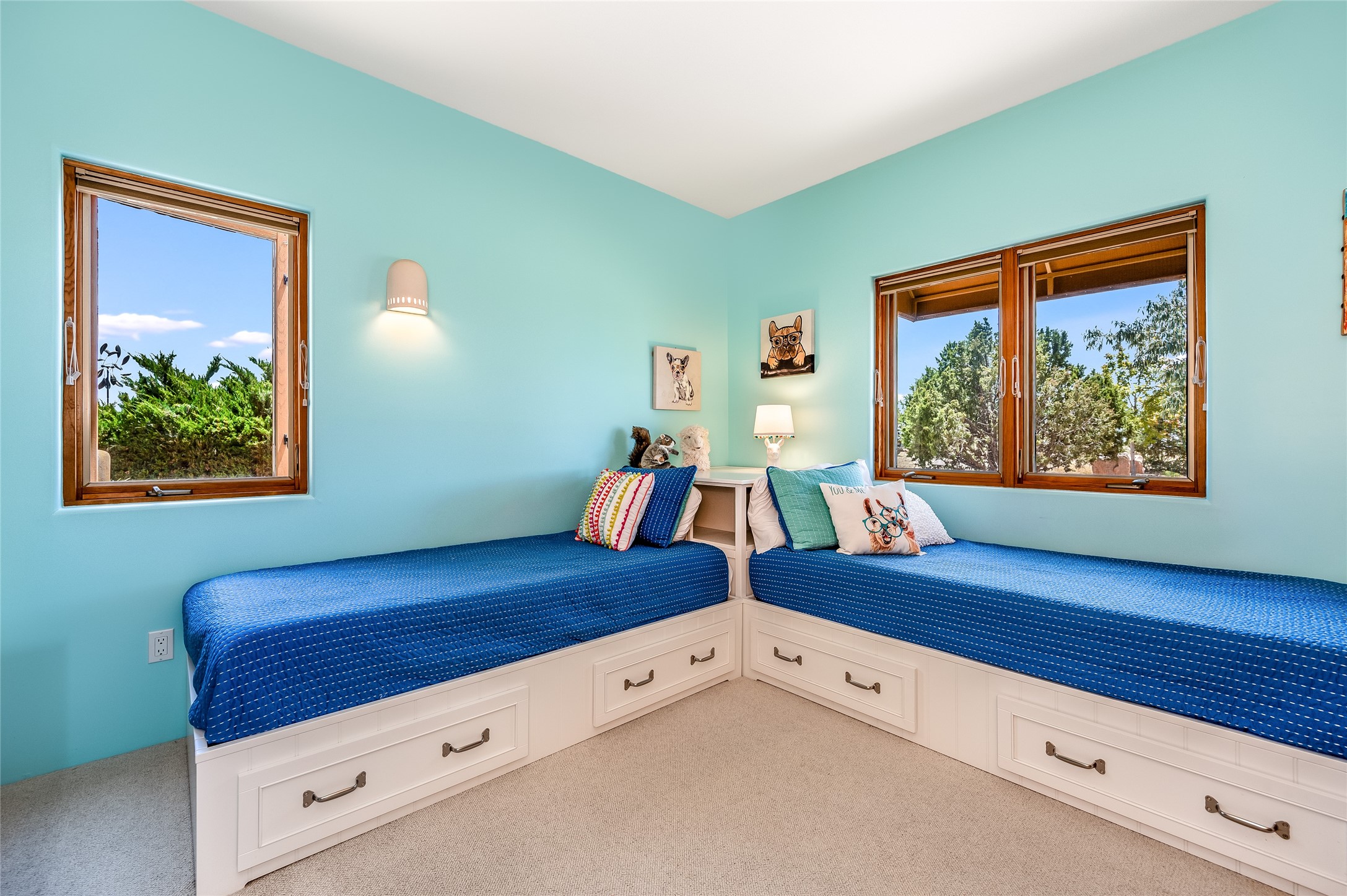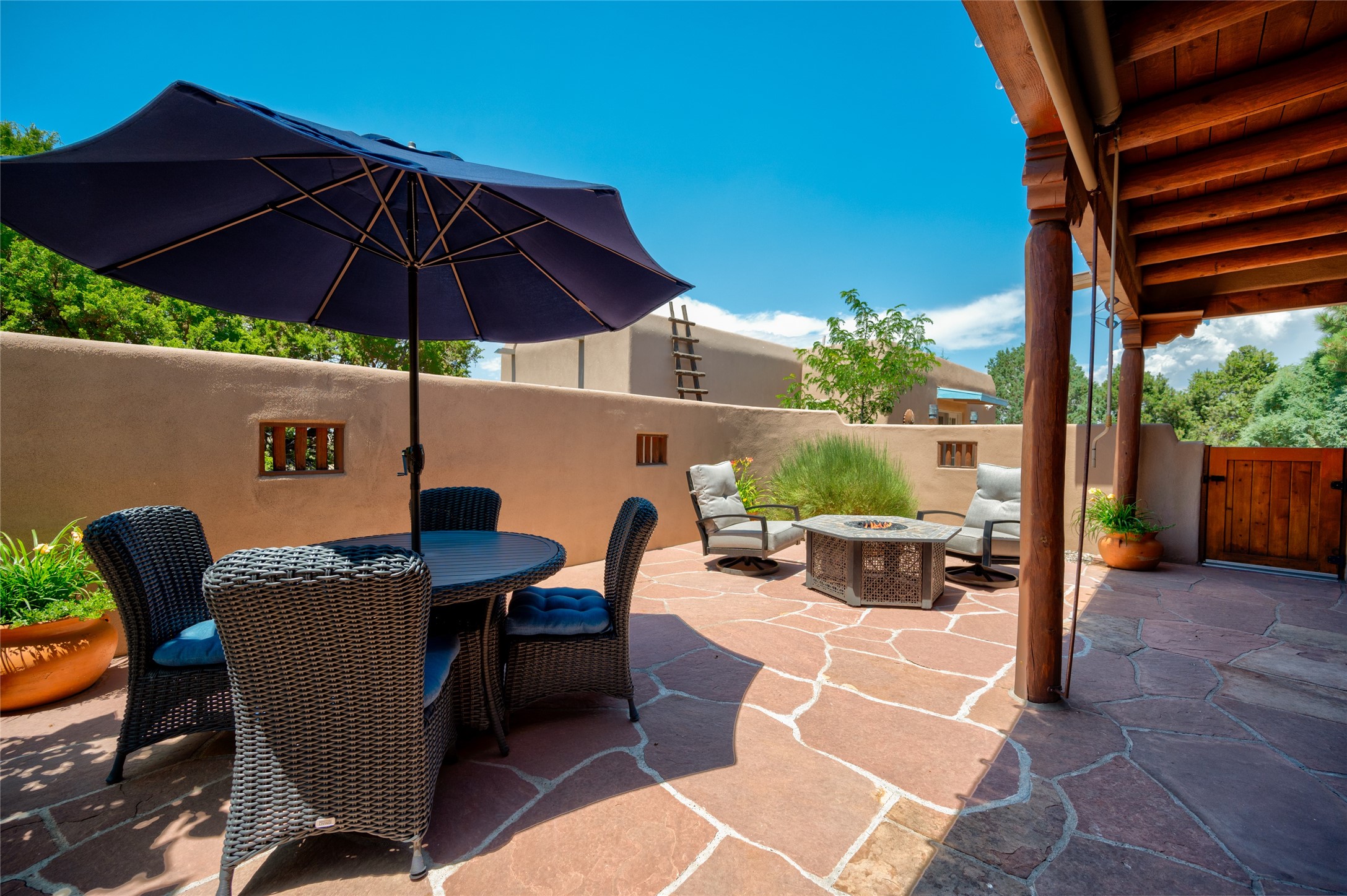 A quiet elegance and ambient symmetry flows throughout this exquisite Eldorado home. It is a shining example of pueblo contemporary design custom built by Adobeworks Inc. An open plan, split 3 bedroom plus lovely den/library with Rumford style central fireplace. Spacious living room with high viga ceilings, gleaming Saltillo floors and traditional kiva fireplace. Spacious kitchen with pantry and informal dining lead out onto a large shady portal. The main house includes over 2470 sq.ft plus a heated studio with half bath plus a 2 car finished garage. Beautifully maintained and surrounded by mature lovingly cared for walled gardens create private relaxing spaces. There is a walkway leading to a lovely remodeled and expanded 762 sq.ft casita which will delight your guests and family visitors. The home and casita share fabulous mountain views and yet delightfully private and peaceful. On one and half acres this home accesses all that Eldorado amenities offer plus local shopping, library, restaurants and open trails yet only minutes into Santa Fe. A must see!