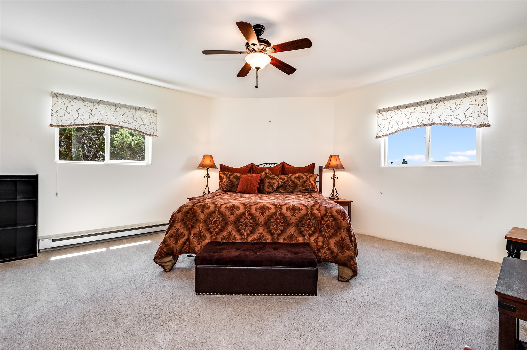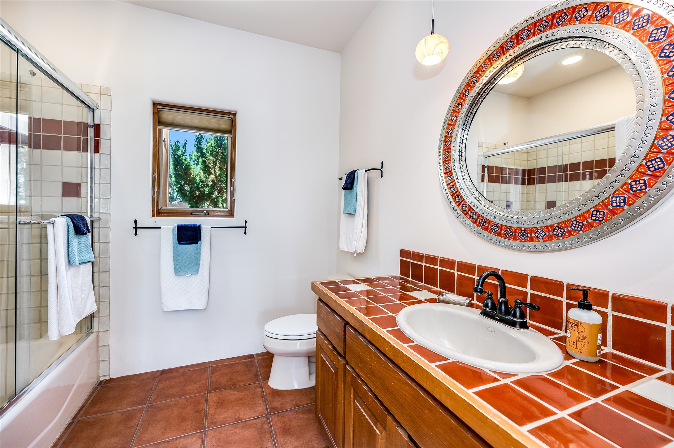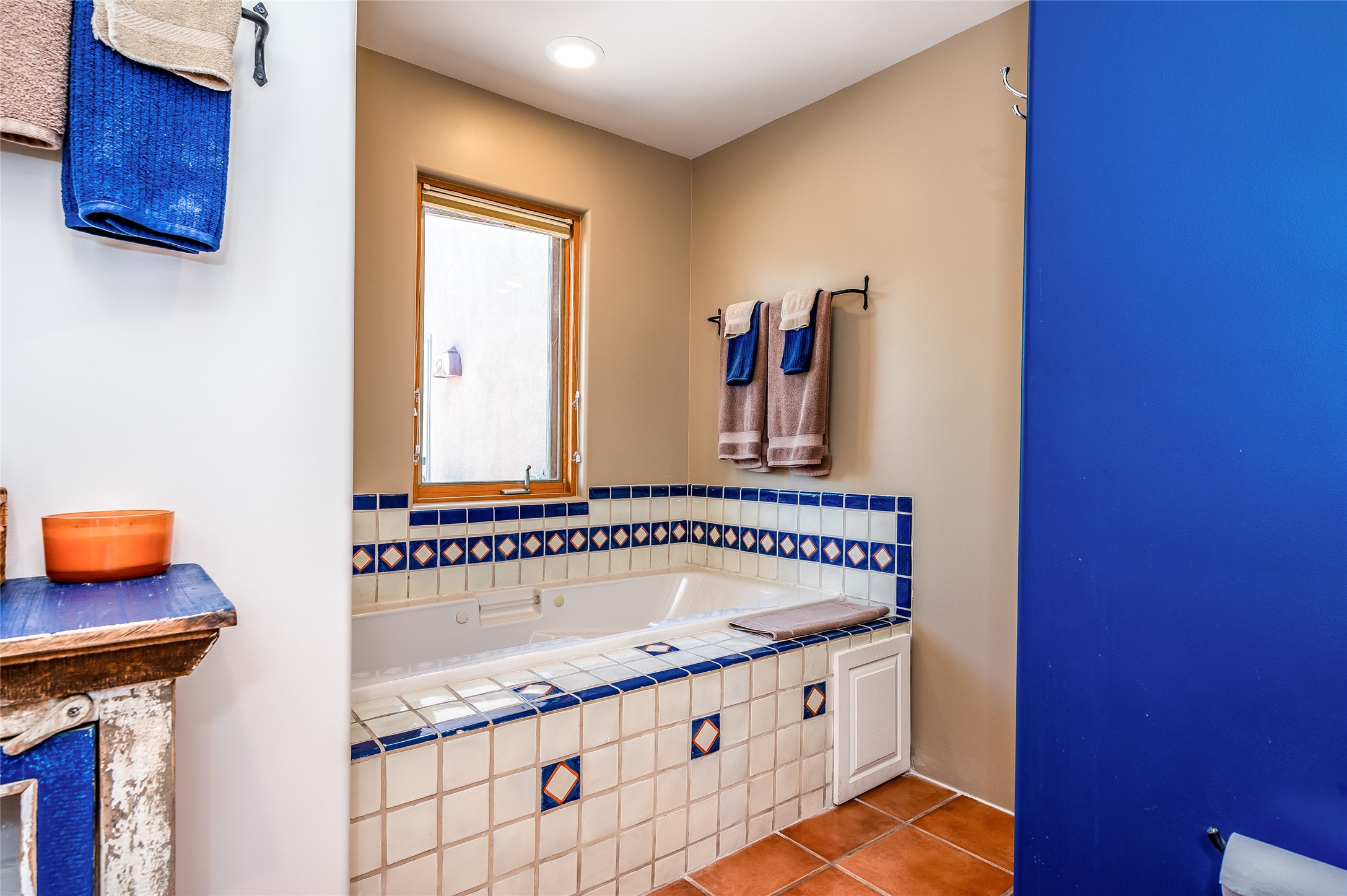 A quiet elegance and ambient symmetry flows throughout this exquisite Eldorado home. It is a shining example of pueblo contemporary design custom built by Adobeworks Inc. An open plan, split 3 bedroom plus lovely den/library with Rumford style central fireplace. Spacious living room with high viga ceilings, gleaming Saltillo floors and traditional kiva fireplace. Spacious kitchen with pantry and informal dining lead out onto a large shady portal. The main house includes over 2470 sq.ft plus a heated studio with half bath plus a 2 car finished garage. Beautifully maintained and surrounded by mature lovingly cared for walled gardens create private relaxing spaces. There is a walkway leading to a lovely remodeled and expanded 762 sq.ft casita which will delight your guests and family visitors. The home and casita share fabulous mountain views and yet delightfully private and peaceful. On one and half acres this home accesses all that Eldorado amenities offer plus local shopping, library, restaurants and open trails yet only minutes into Santa Fe. A must see!