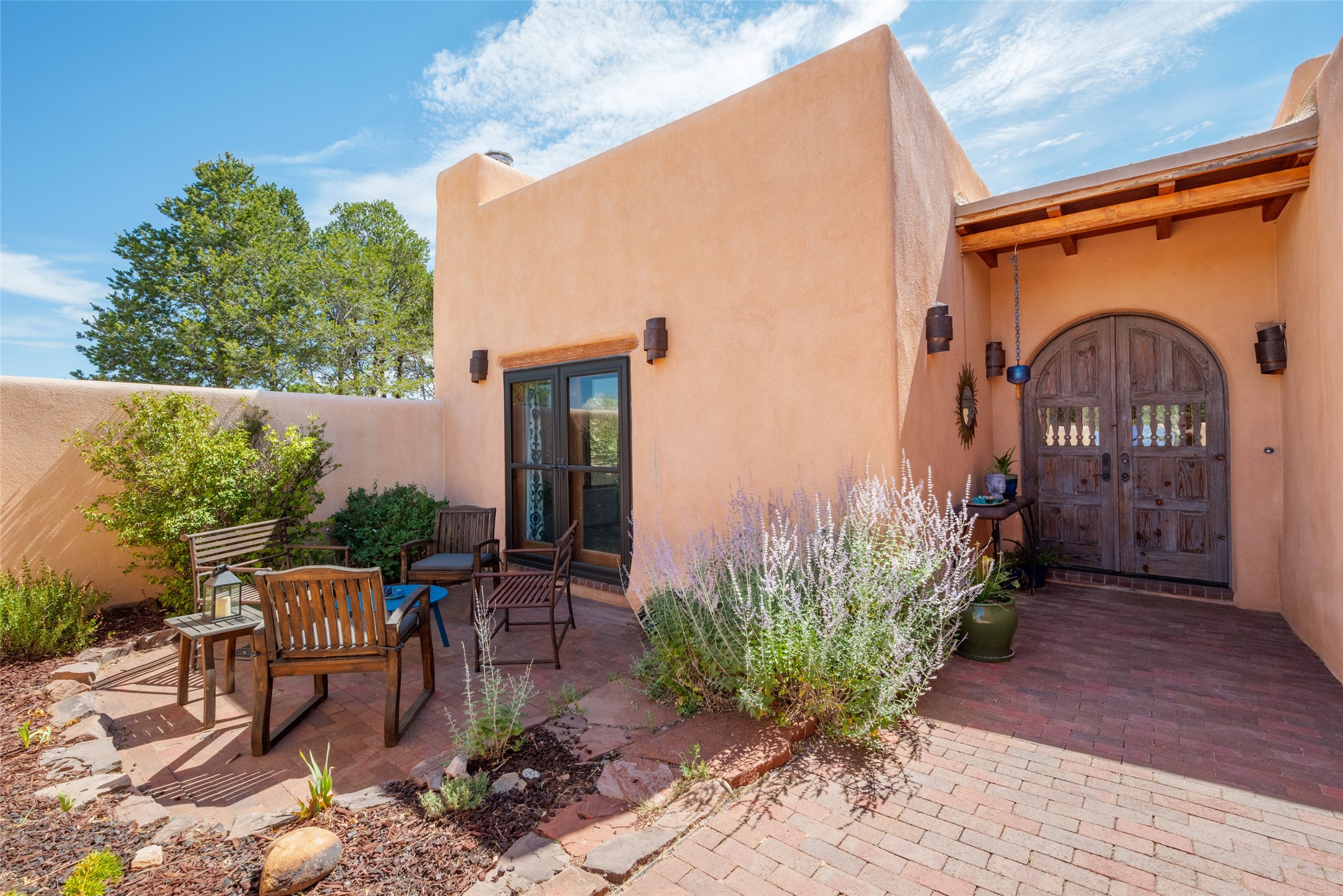Enter the peaceful front courtyard, continue through the vintage Mexican carved doors into the dramatic entry with soaring ceilings This beautiful Eldorado home was built around 1991 . The previous owners added an addition to create a master bedroom with kiva fireplace. The home has brick floors throughout, large windows to take in the views and 2 additional courtyard spaces for outside enjoyment. The kitchen has been remodeled. There is great separation between the 4 bedrooms and 3 baths, with a choice of which bedroom you want to be the master, both lead to a courtyard. Don't miss this beautiful home.