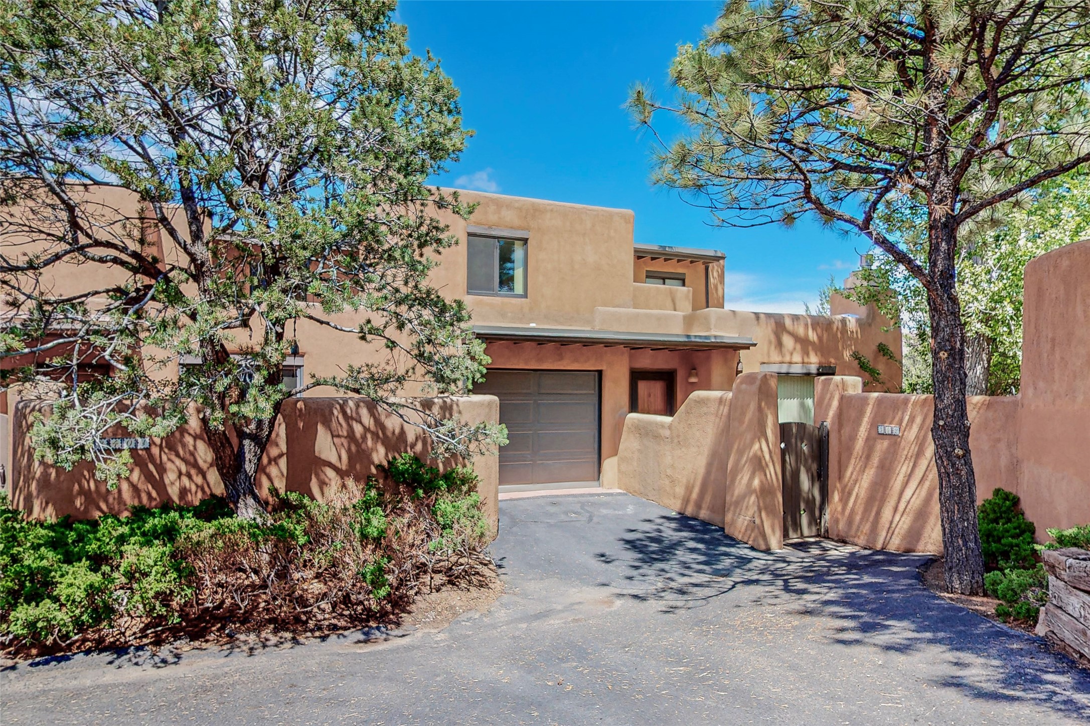 Sunny and secluded - an ideal location for your new Santa Fe home! This condo unit will surprise you, it's private and tucked away at the end of a cul-de-sac. A peaceful courtyard greets you, and this area of greenery and sunshine is also seen from inside the unit. The entire first floor is open space planning focused on a large light-filled living room, complete with a gas-fired corner kiva fireplace. The open space flows to a dining area and from these windows you'll see mountain views of the Sangres - and possibly snow-covered peaks. The open kitchen is euro style with a Wolf induction cook top. Currently there is no oven, but there is a cabinet space (under counter) in the kitchen that formerly had an oven and this is where a new oven could be installed. The extra-deep attached garage, laundry area, and bath with walk-in shower complete the first floor. Up the staircase you'll find two generous bedrooms with a large full bath between. Both bedrooms offer big windows, good closets and lots of natural light. With professional HOA coverage on many exterior items plus the new roof completed in September of 2021, this unit will provide the new owner with easy living. The location offers you close proximity to all of downtown Santa Fe, for restaurants, museums, shopping. Nearby are numerous grocery store options and the farmers' market. Within 5 minutes you can be ordering breakfast at a downtown location. Also, just at the base of the hill is Ft Marcy park, which offers multiple choices: pickle ball courts, indoor swimming pool, basketball court, exercise rooms, and good dog walking options. OR, you can walk downhill to the Plaza in about 20 minutes. This is a very comfortable place as a full time home or your Santa Fe escape. Welcome to Santa Fe!