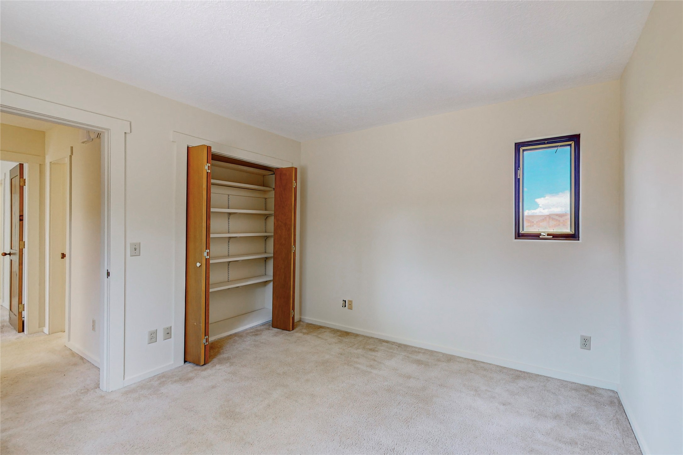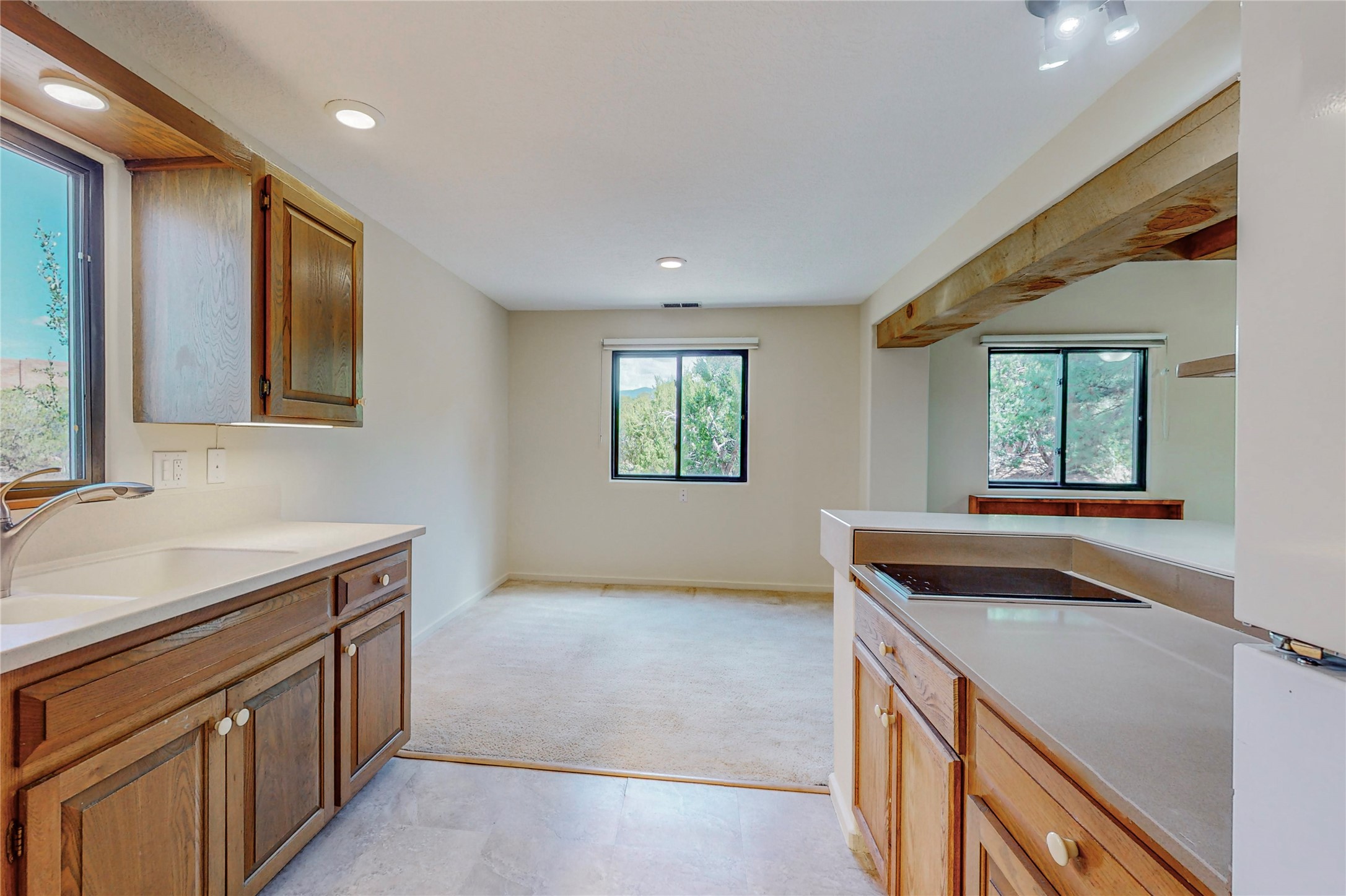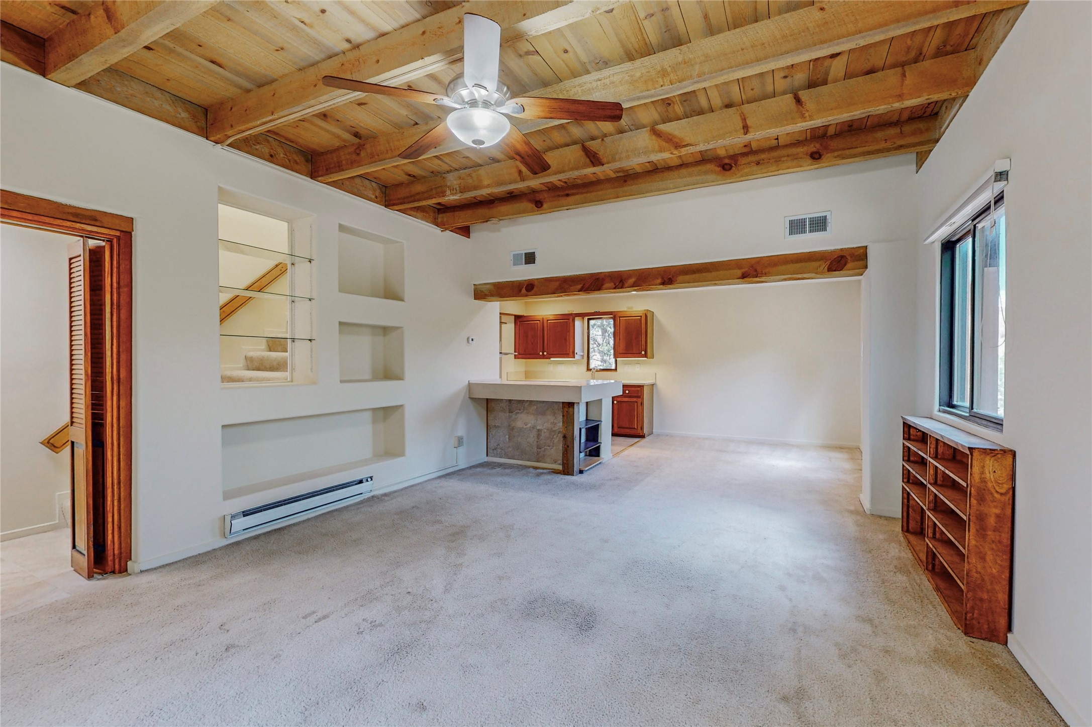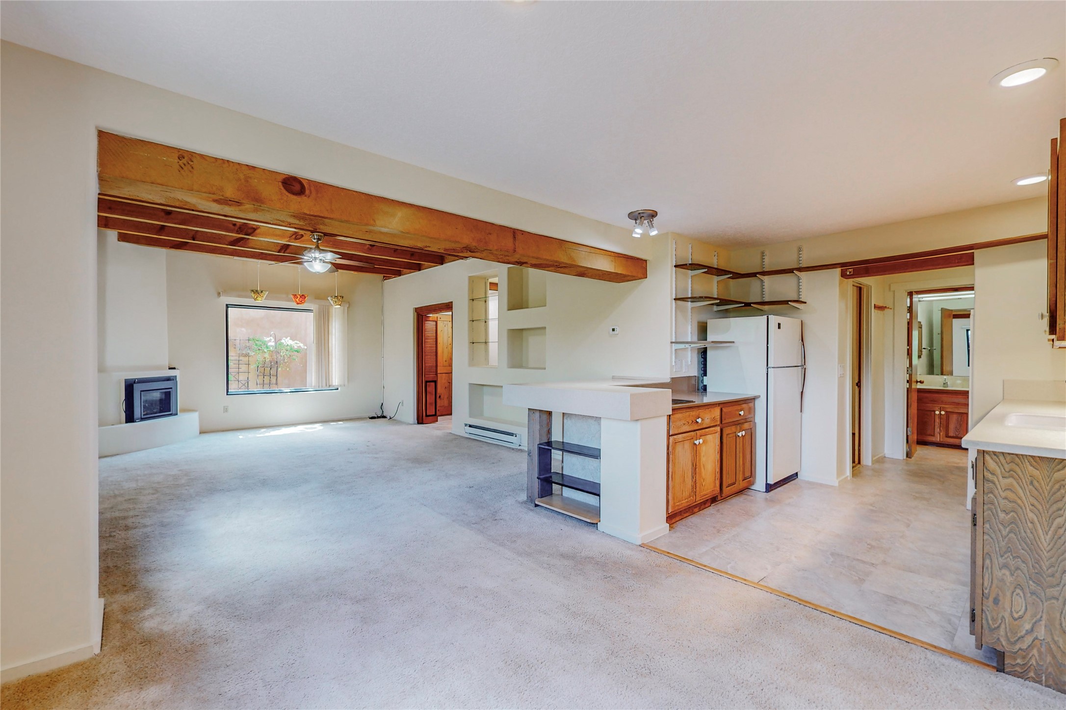 Sunny and secluded - an ideal location for your new Santa Fe home! This condo unit will surprise you, it's private and tucked away at the end of a cul-de-sac. A peaceful courtyard greets you, and this area of greenery and sunshine is also seen from inside the unit. The entire first floor is open space planning focused on a large light-filled living room, complete with a gas-fired corner kiva fireplace. The open space flows to a dining area and from these windows you'll see mountain views of the Sangres - and possibly snow-covered peaks. The open kitchen is euro style with a Wolf induction cook top. Currently there is no oven, but there is a cabinet space (under counter) in the kitchen that formerly had an oven and this is where a new oven could be installed. The extra-deep attached garage, laundry area, and bath with walk-in shower complete the first floor. Up the staircase you'll find two generous bedrooms with a large full bath between. Both bedrooms offer big windows, good closets and lots of natural light. With professional HOA coverage on many exterior items plus the new roof completed in September of 2021, this unit will provide the new owner with easy living. The location offers you close proximity to all of downtown Santa Fe, for restaurants, museums, shopping. Nearby are numerous grocery store options and the farmers' market. Within 5 minutes you can be ordering breakfast at a downtown location. Also, just at the base of the hill is Ft Marcy park, which offers multiple choices: pickle ball courts, indoor swimming pool, basketball court, exercise rooms, and good dog walking options. OR, you can walk downhill to the Plaza in about 20 minutes. This is a very comfortable place as a full time home or your Santa Fe escape. Welcome to Santa Fe!