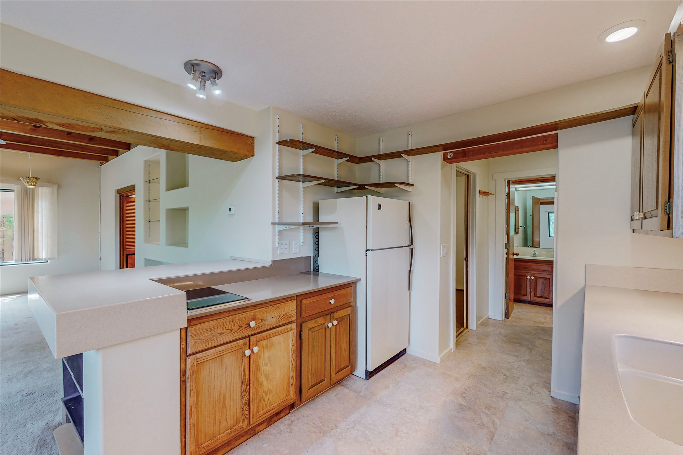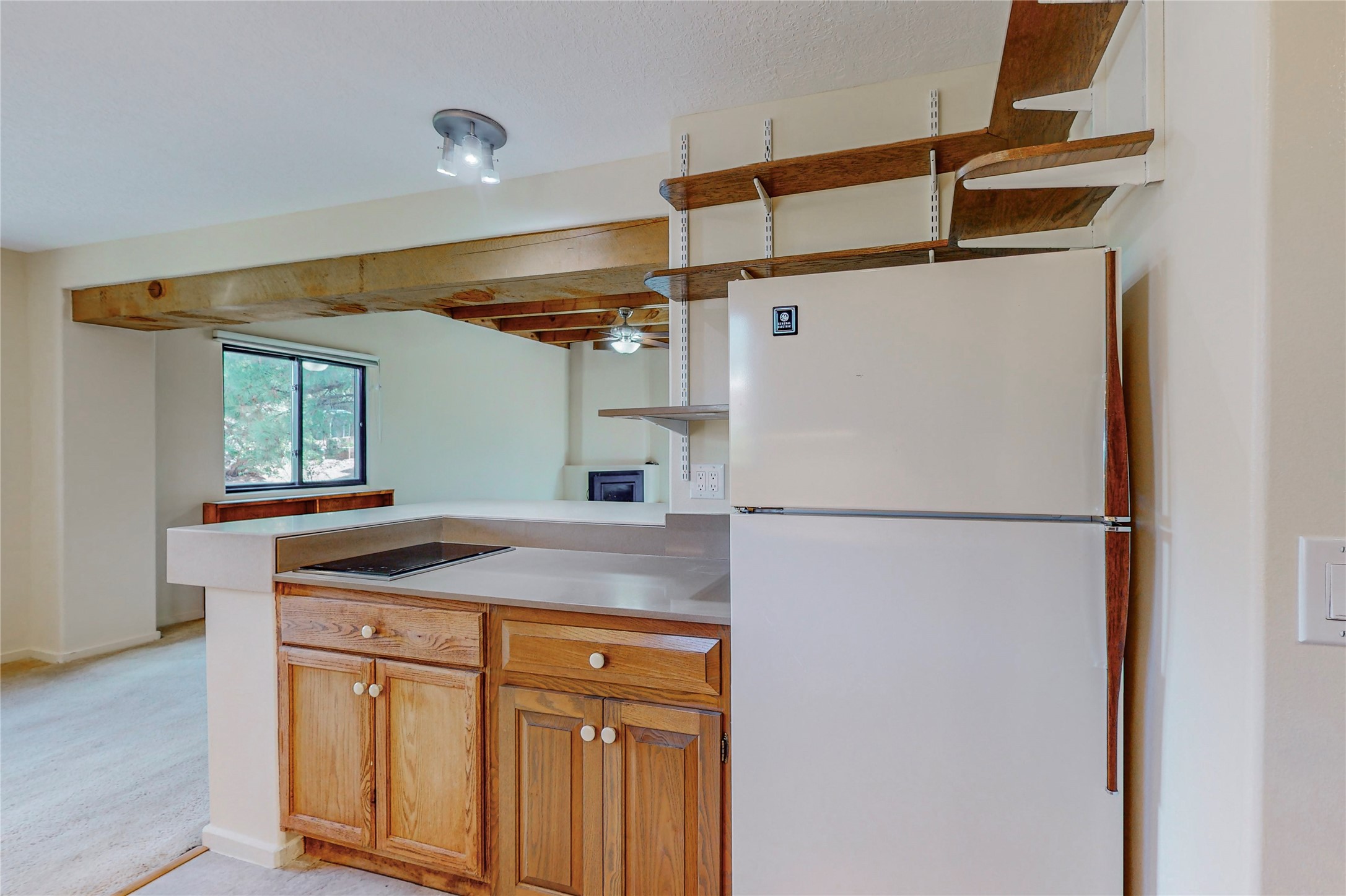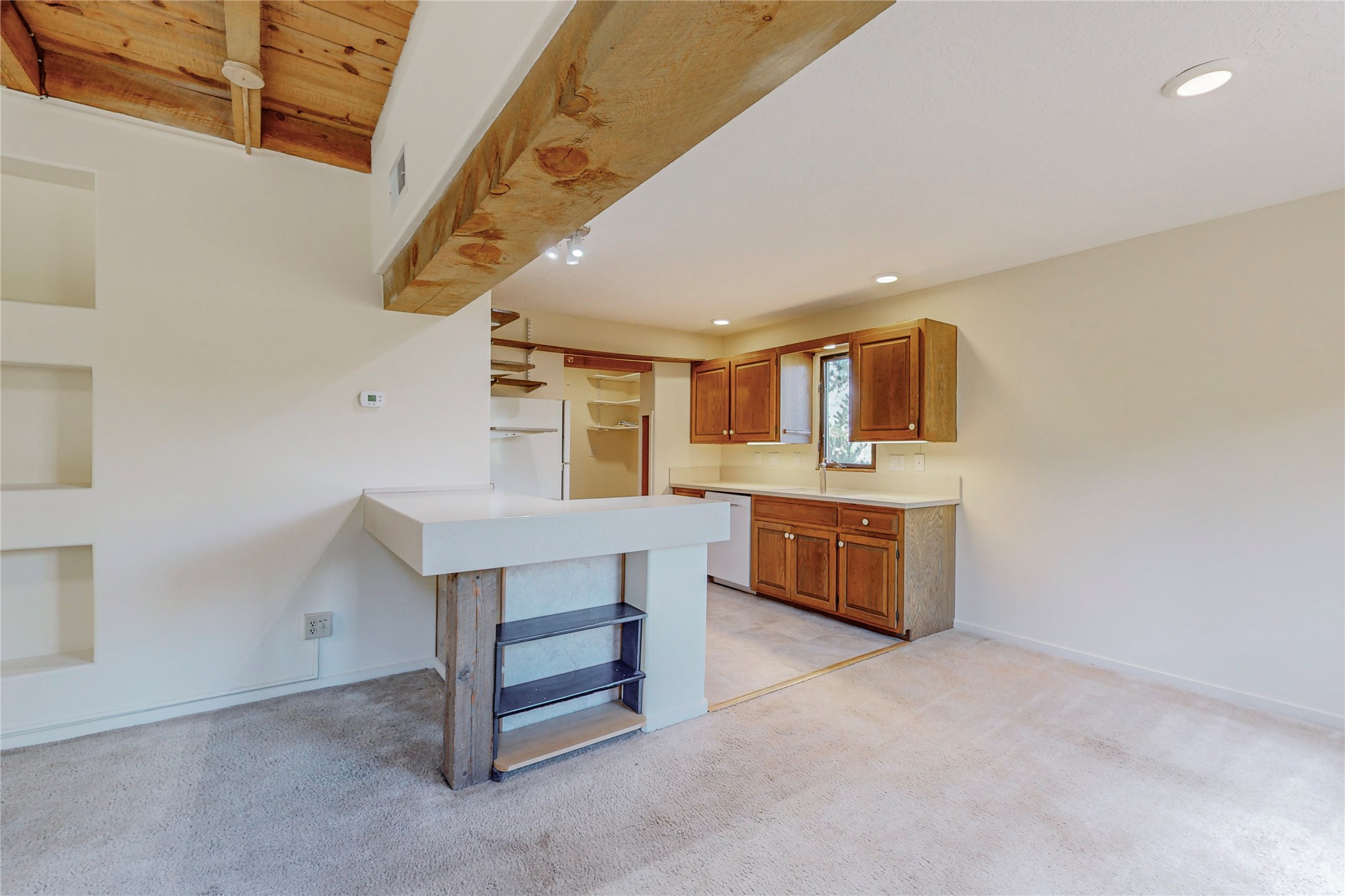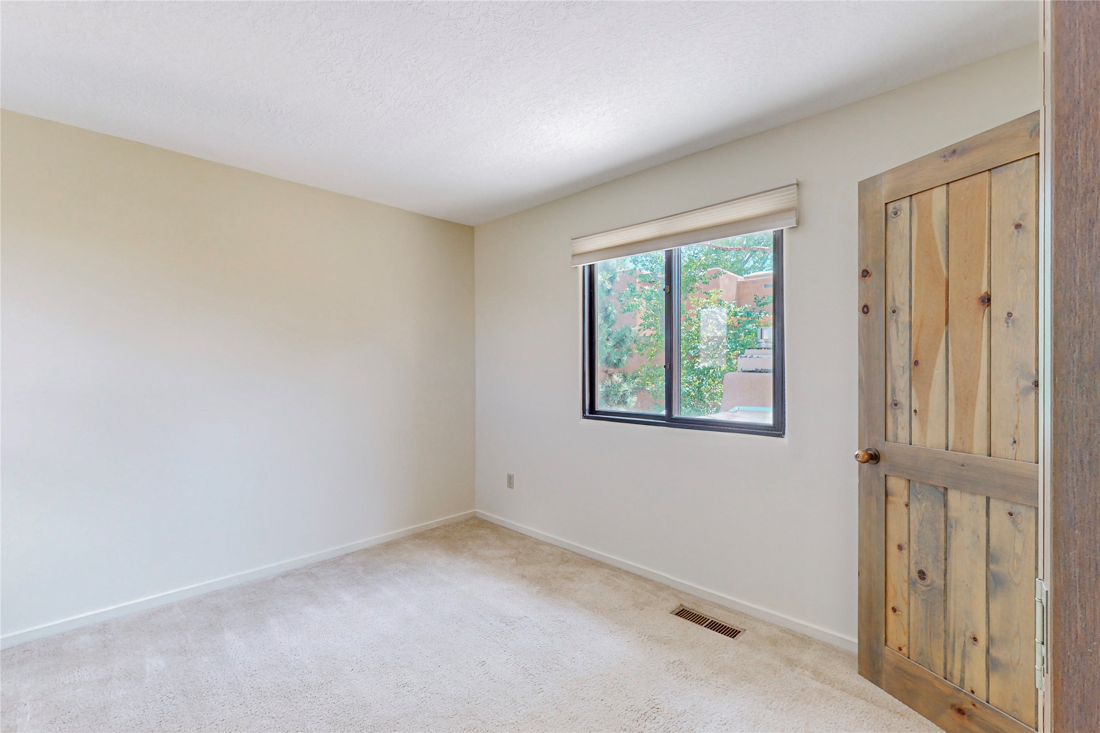 Sunny and secluded - an ideal location for your new Santa Fe home! This condo unit will surprise you, it's private and tucked away at the end of a cul-de-sac. A peaceful courtyard greets you, and this area of greenery and sunshine is also seen from inside the unit. The entire first floor is open space planning focused on a large light-filled living room, complete with a gas-fired corner kiva fireplace. The open space flows to a dining area and from these windows you'll see mountain views of the Sangres - and possibly snow-covered peaks. The open kitchen is euro style with a Wolf induction cook top. Currently there is no oven, but there is a cabinet space (under counter) in the kitchen that formerly had an oven and this is where a new oven could be installed. The extra-deep attached garage, laundry area, and bath with walk-in shower complete the first floor. Up the staircase you'll find two generous bedrooms with a large full bath between. Both bedrooms offer big windows, good closets and lots of natural light. With professional HOA coverage on many exterior items plus the new roof completed in September of 2021, this unit will provide the new owner with easy living. The location offers you close proximity to all of downtown Santa Fe, for restaurants, museums, shopping. Nearby are numerous grocery store options and the farmers' market. Within 5 minutes you can be ordering breakfast at a downtown location. Also, just at the base of the hill is Ft Marcy park, which offers multiple choices: pickle ball courts, indoor swimming pool, basketball court, exercise rooms, and good dog walking options. OR, you can walk downhill to the Plaza in about 20 minutes. This is a very comfortable place as a full time home or your Santa Fe escape. Welcome to Santa Fe!