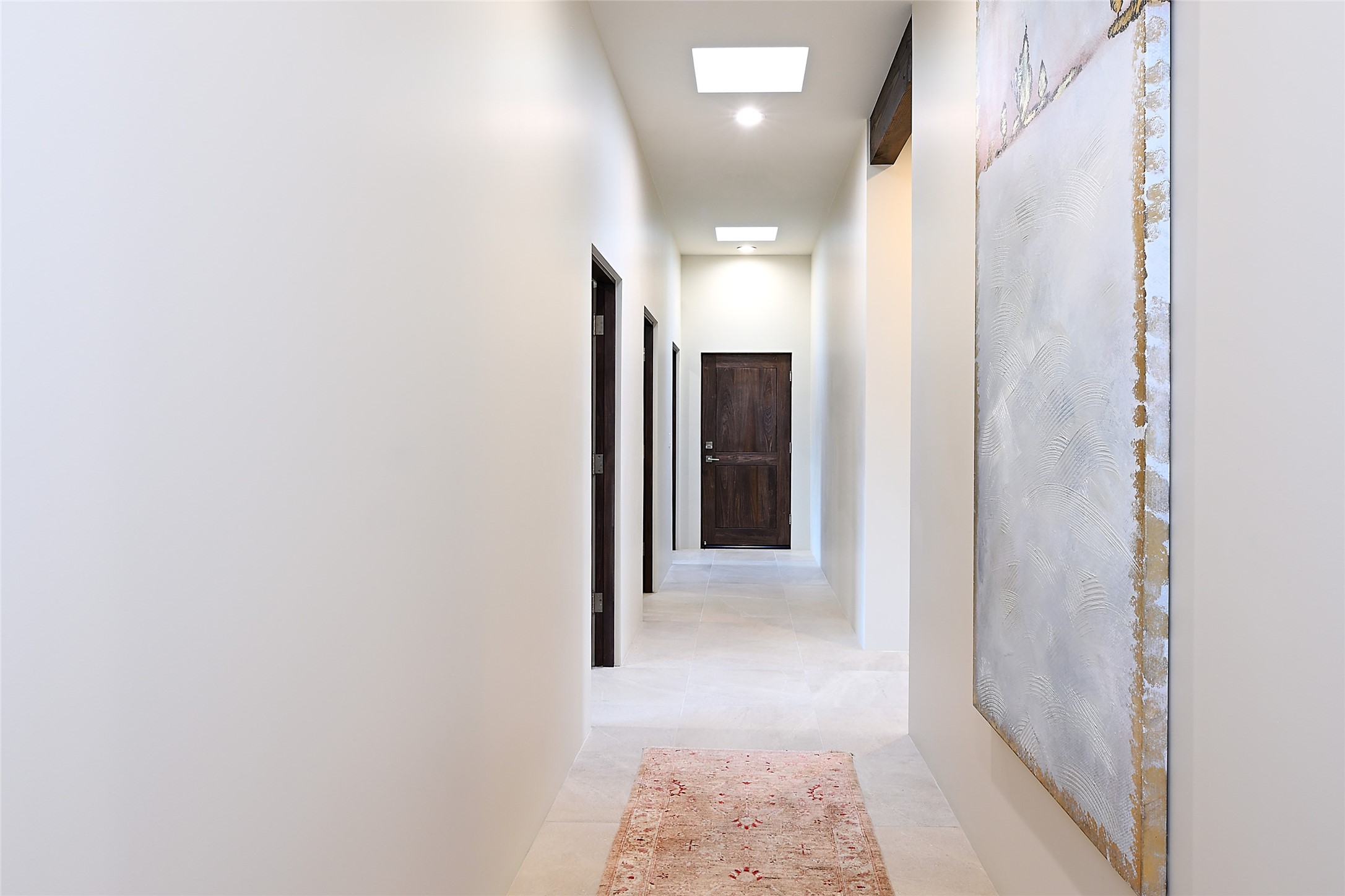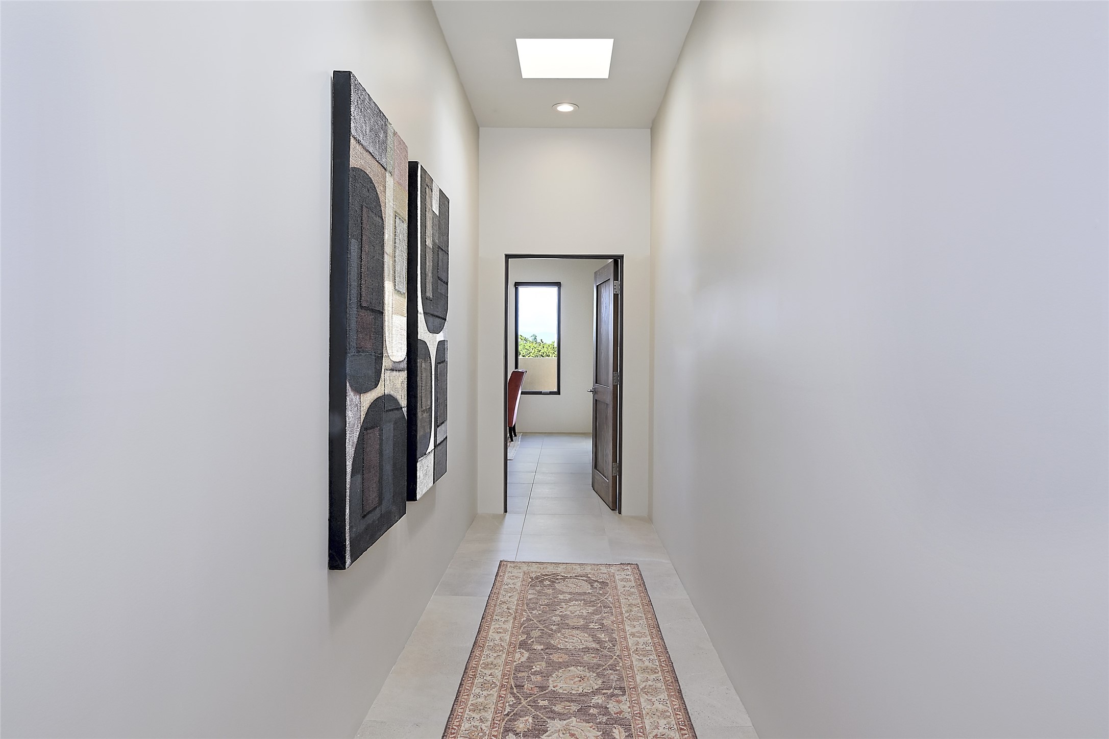 Exemplifying sleek, chic contemporary design in one of the most desirable locations in Santa Fe, this light-filled new three-bedroom, 3,394-square-foot residence affords sweeping vistas from its ideal location in the western reaches of the exclusive Las Campanas community. Sophisticated living and entertaining are effortless indoors and out thanks to an easy open floor plan that encompasses a living room with a soaring beamed ceiling, a modern gas fireplace, handsome built-ins, and 10-foot glass doors; a dining area with sliding glass doors; an impeccably appointed chef's kitchen with Caesarstone counters, handcrafted cabinets, and top-caliber appliances; and a Jemez-facing portal and courtyard-all linked in an effortless flow and basking in mountain and sunset views. Two generous guest bedrooms with spacious closets and en suite baths enjoy the seclusion of their own wing, while a quiet home office-which could easily serve as a fourth bedroom-is located down the hall and steps from a three-quarter bath. A serene, solitary oasis, the primary bedroom suite is tucked in a peaceful private spot and features a contemporary gas fireplace, a lavish bath with two vanities and both a soaking tub and a shower, and an impressively outfitted room-sized walk-in closet of nearly 200 square feet. Other welcome elements include a walk-in pantry or storage room; a bright, discreet laundry room; and a two-door, two-car garage with additional storage space.