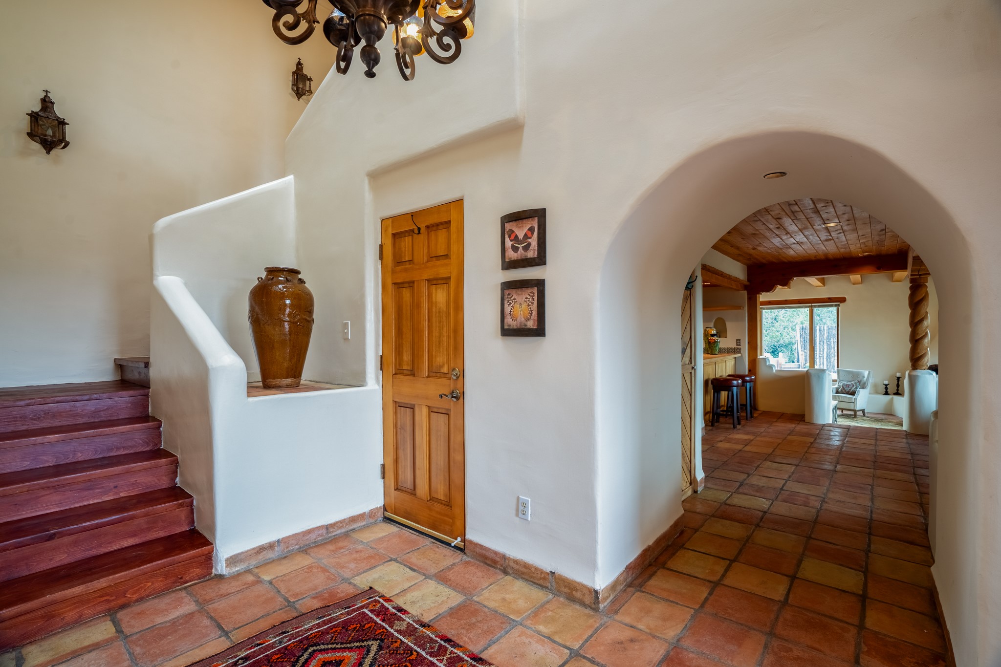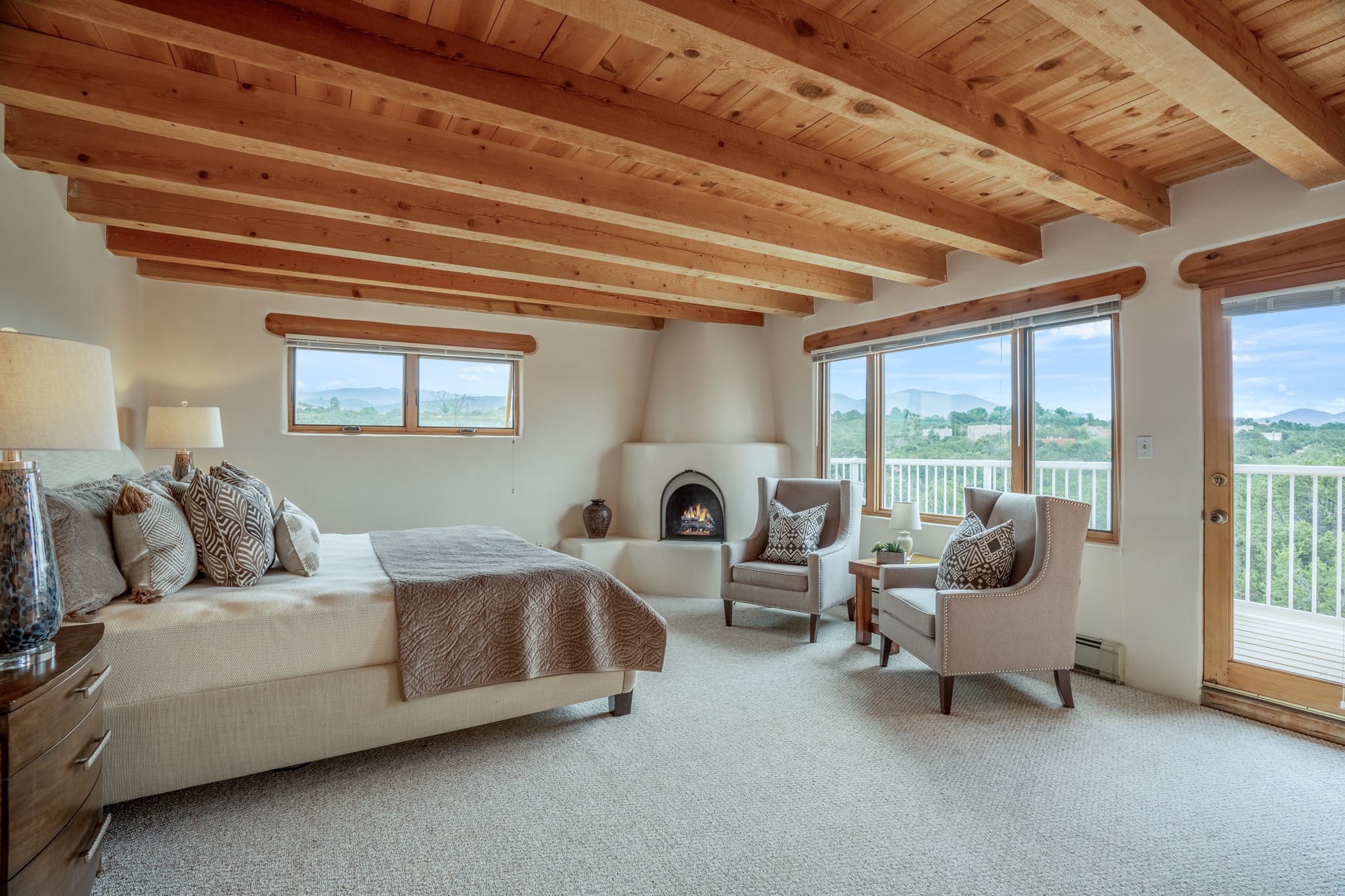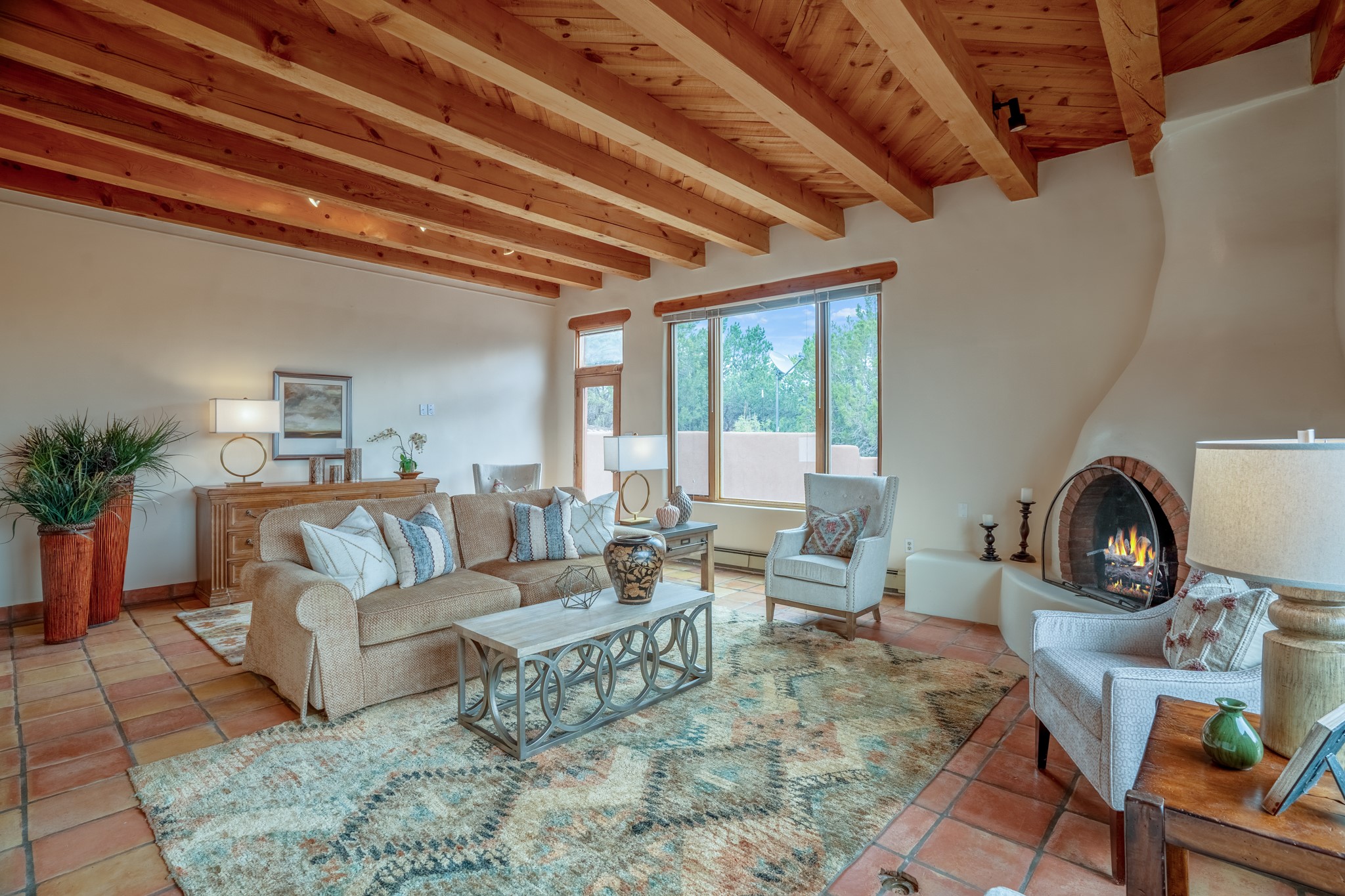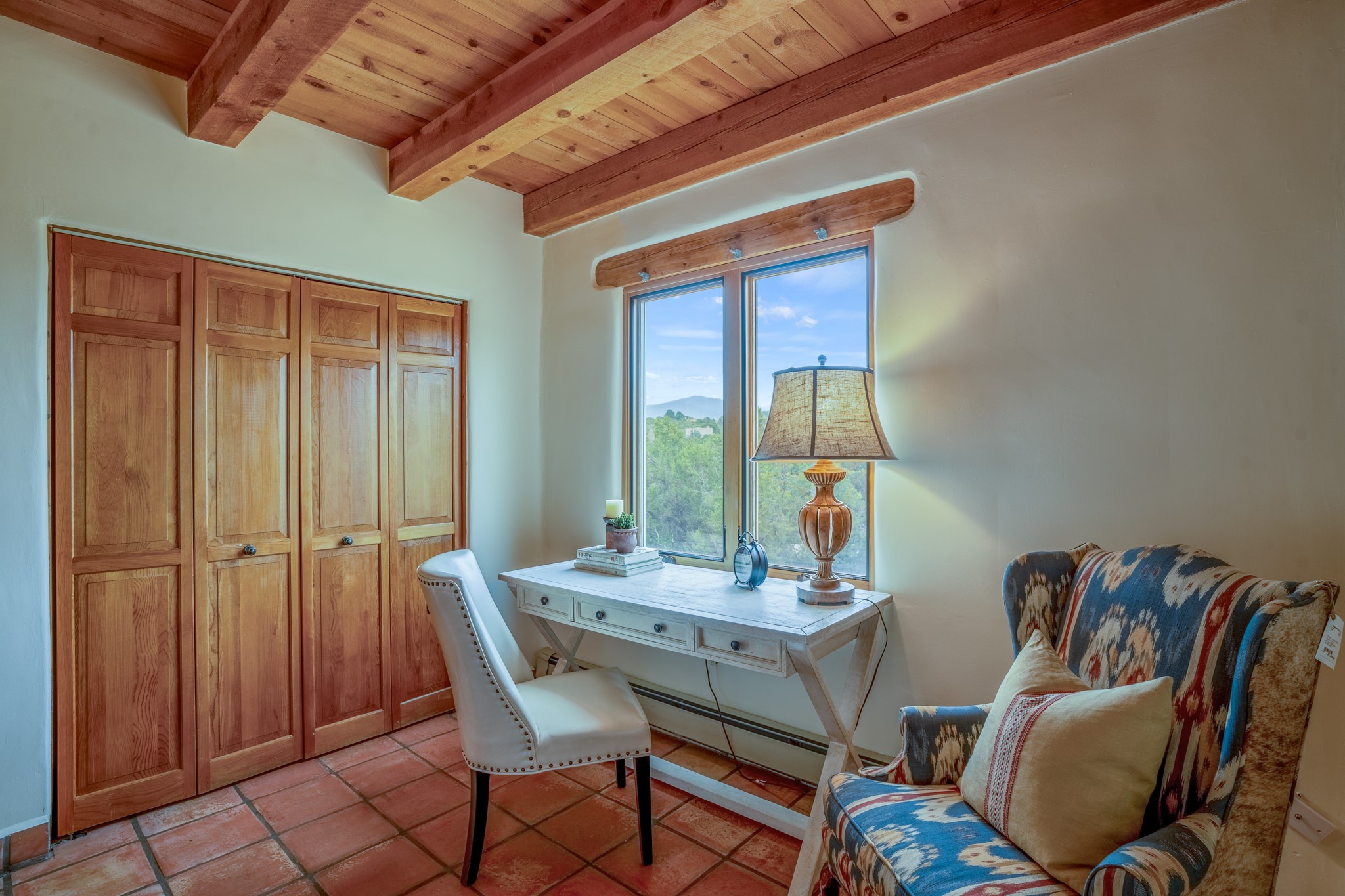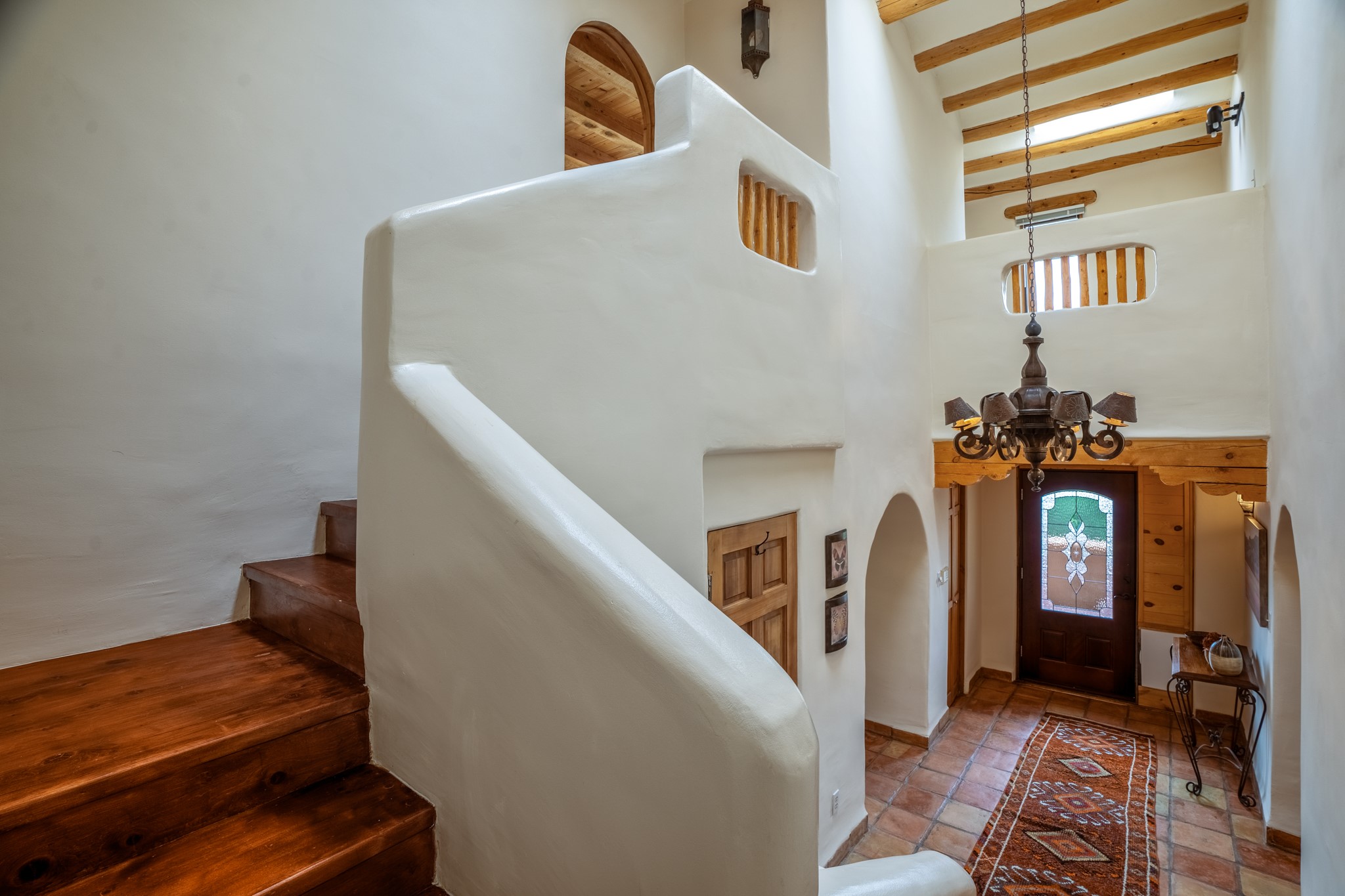 Tucked away in Santa Fe's tranquil North East hills, this property encapsulates Southwest living. The home features 3 beds and 2 baths, theupstairs primary suite offers a private balcony with excellent foothill and mountain views, complemented by beamed ceilings and a cozy kiva fireplace. Saltillo tile floors, beamed ceilings, and a spacious living area with a large Kiva fireplace.The kitchen is practical with excellent features such as the large Viking range, a wood bar counter withseating and latilla accents. The adjacent dining room is an excellent entertaining space with great views.The attached casita is complete with its own private entry courtyard, a 3/4 bathroom, kitchenette/bar area, and a kiva fireplace. Other features include a 2-car garage, mud/utility room, newer boiler and a recently painted interior.Spanning 1+ acres amid the pion and juniper trees. This property offers an authentic Santa Fe experience, combining comfort with the allure of the Southwest landscape. Seize the chance to shape this haven into your Santa Fe dream.