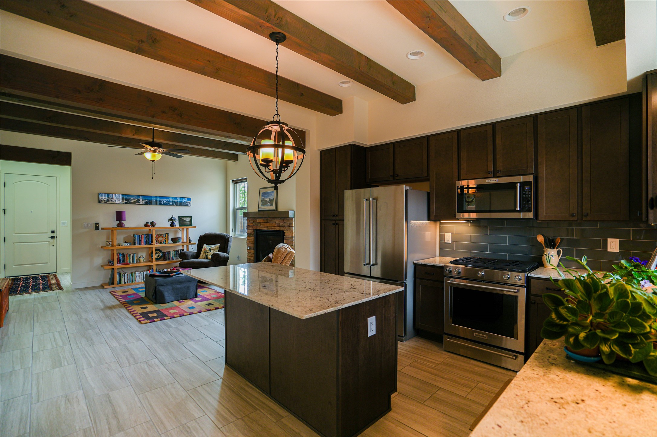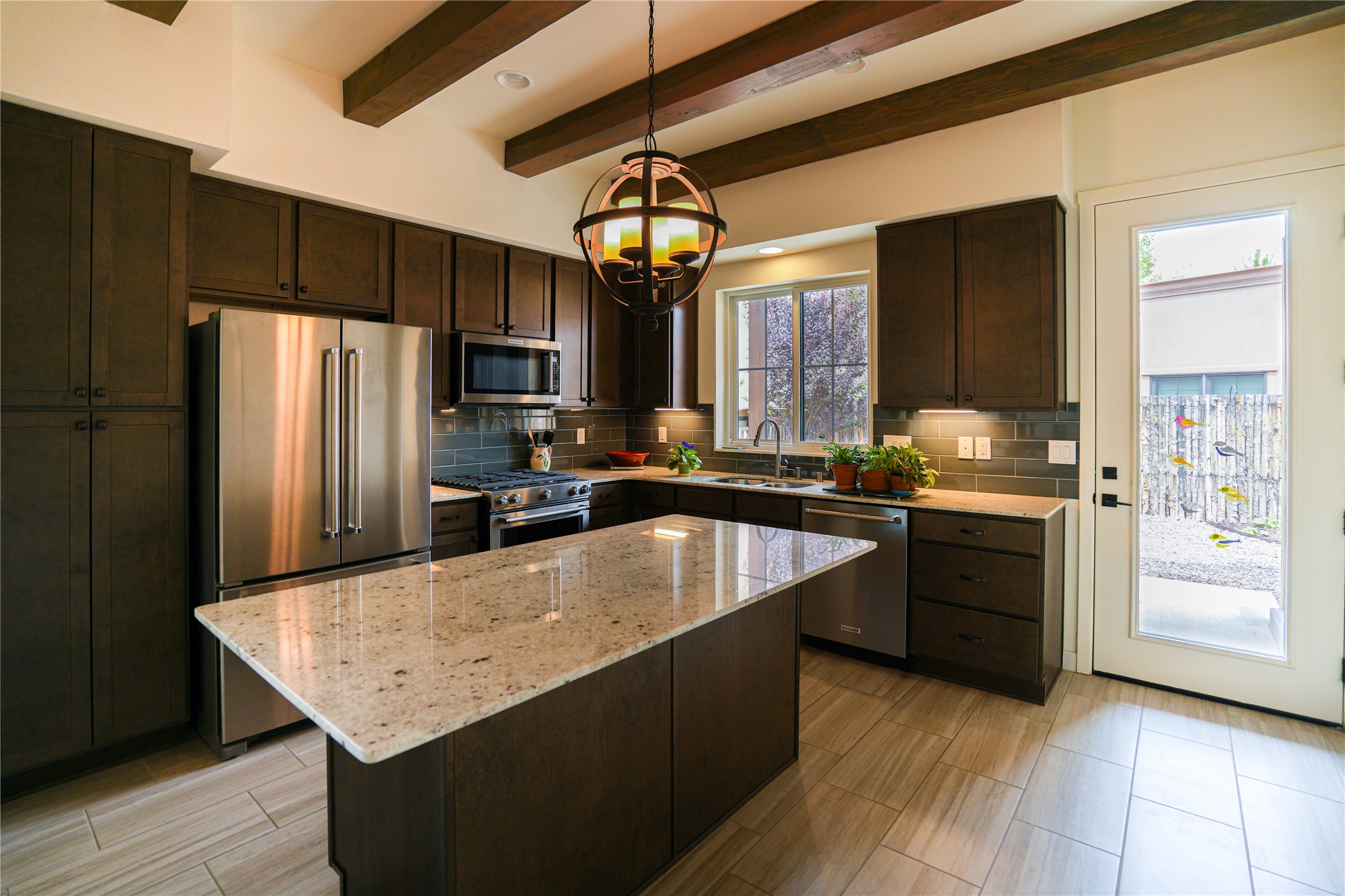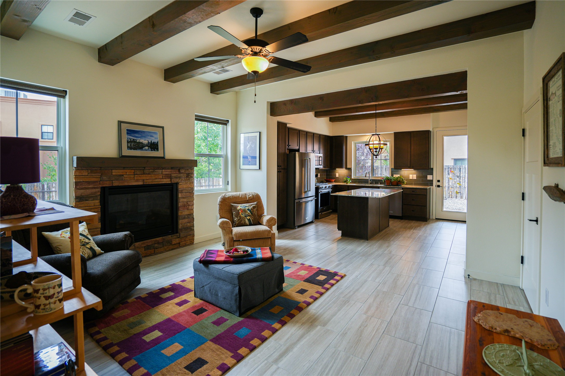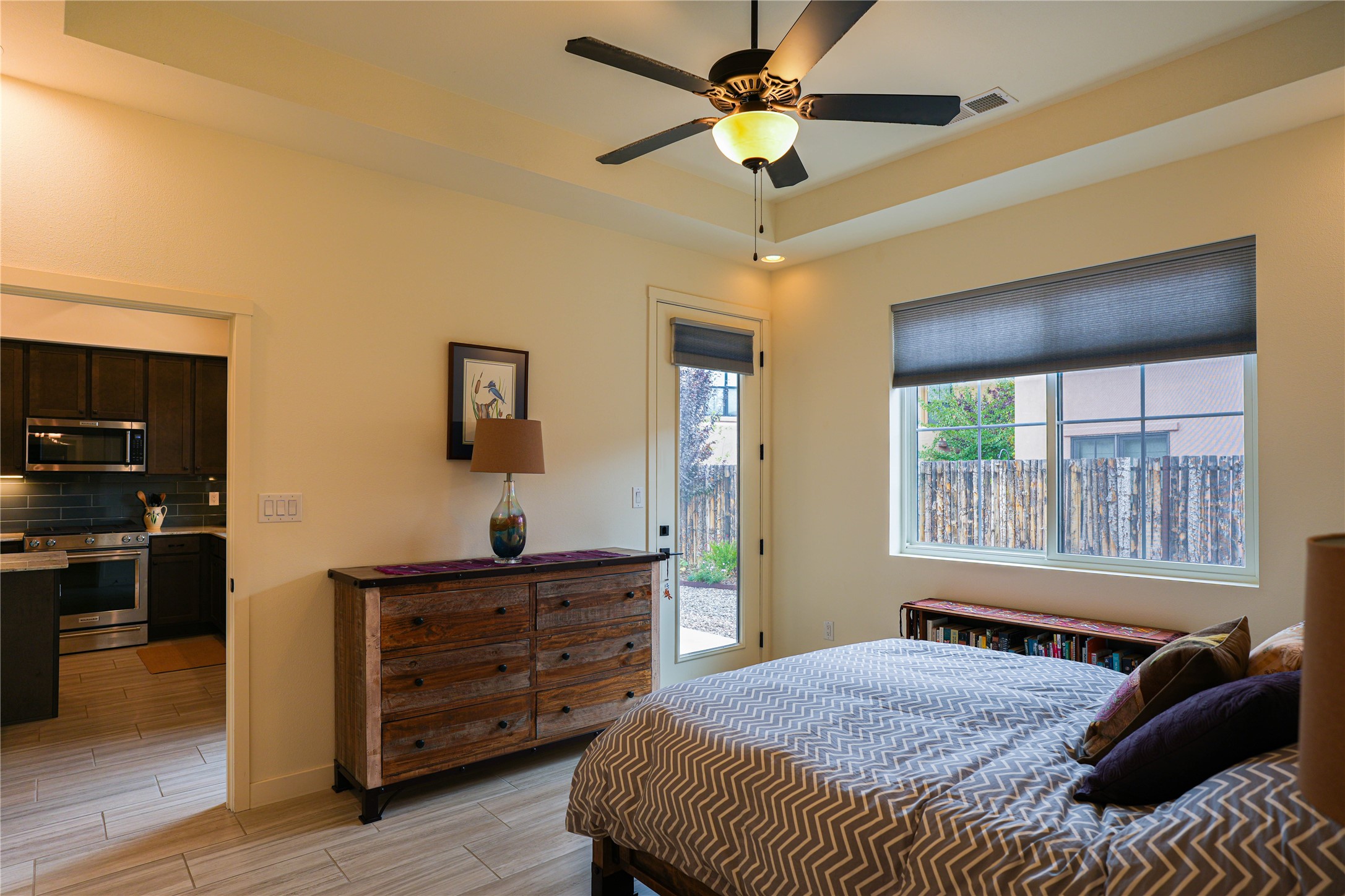This gated community features timeless, Tuscan Old-world architectural exterior details and beautiful, mature landscaping. Small lots offer easy landscaping and comfortable outdoor living spaces. With plenty of walking trails, sidewalks, and pocket parks, residents have safe and beautiful way to enjoy the outdoors. Villas di Toscana is located at Governor Miles Road and Camino Carlos Rey, giving residents easy access to shopping, recreation, and the downtown Plaza. Homeowner Association Management and covenant controlled, with private, quiet streets, this is one of the most sought-after neighborhoods in Santa Fe real estate. Arete Homes of Santa Fe was the awarded Best Design, Best Kitchen and Best Water Efficiency by Hacienda's 2017 Parade of Homes in 2017. This is one of the homes in the Villas de Toscana community. This 2 bed 2 bath 4-year old home includes many upgrades at time of construction. Wonderful high end finishes throughout. The 2nd Bedroom could be used as a Bonus office/den/hobby room adjacent to living room. Tile flooring throughout the entire house. Covered portal off of the Kitchen and primary bedroom for outdoor living enjoyment. Beautiful easy-care landscaping with drip irrigation and a custom entry gate and full fenced yard. Gas forced air and central cooling make this home comfortable and very energy efficient.