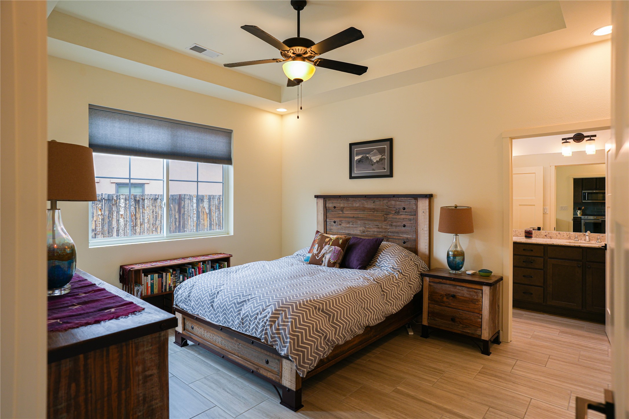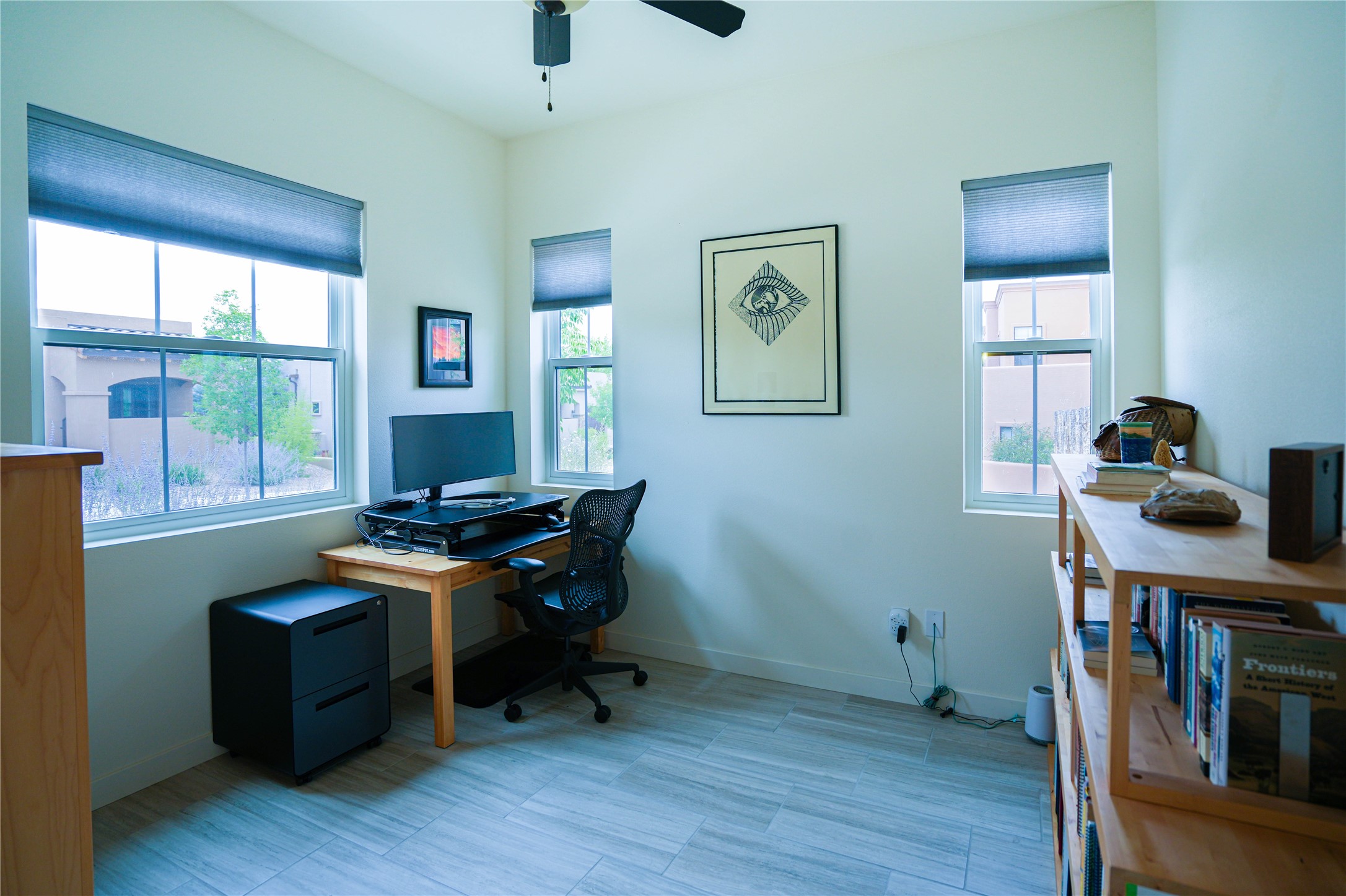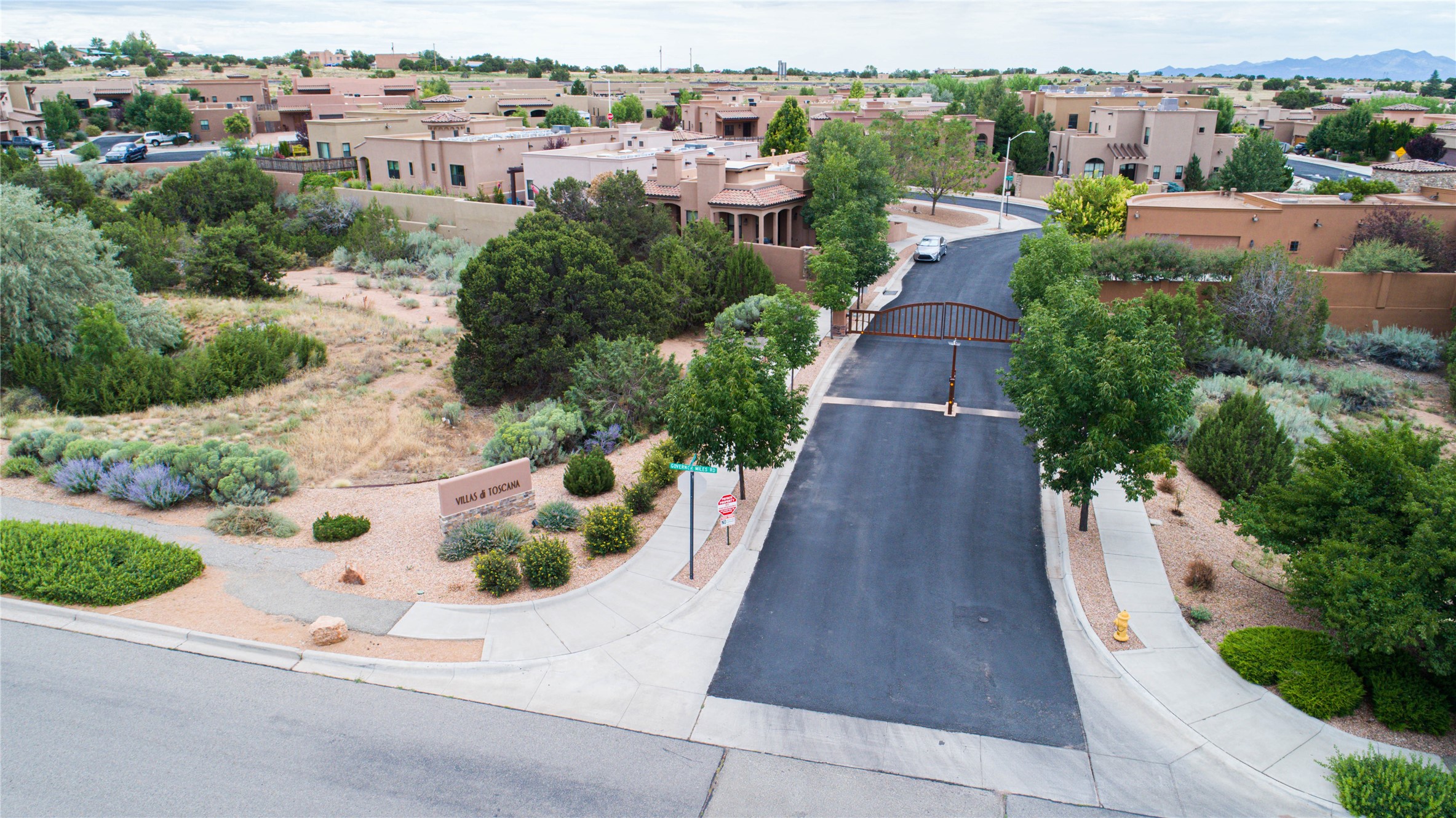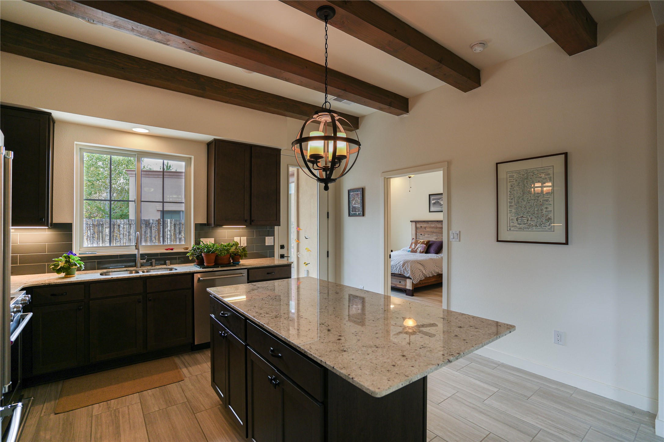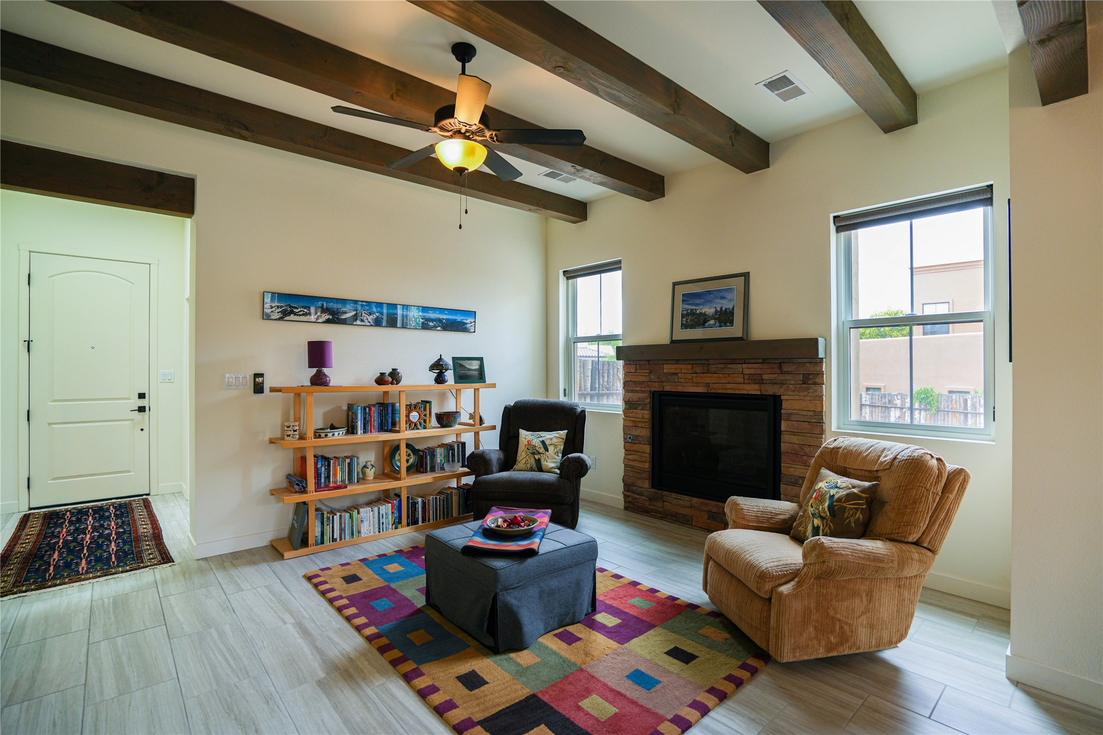 This gated community features timeless, Tuscan Old-world architectural exterior details and beautiful, mature landscaping. Small lots offer easy landscaping and comfortable outdoor living spaces. With plenty of walking trails, sidewalks, and pocket parks, residents have safe and beautiful way to enjoy the outdoors. Villas di Toscana is located at Governor Miles Road and Camino Carlos Rey, giving residents easy access to shopping, recreation, and the downtown Plaza. Homeowner Association Management and covenant controlled, with private, quiet streets, this is one of the most sought-after neighborhoods in Santa Fe real estate. Arete Homes of Santa Fe was the awarded Best Design, Best Kitchen and Best Water Efficiency by Hacienda's 2017 Parade of Homes in 2017. This is one of the homes in the Villas de Toscana community. This 2 bed 2 bath 4-year old home includes many upgrades at time of construction. Wonderful high end finishes throughout. The 2nd Bedroom could be used as a Bonus office/den/hobby room adjacent to living room. Tile flooring throughout the entire house. Covered portal off of the Kitchen and primary bedroom for outdoor living enjoyment. Beautiful easy-care landscaping with drip irrigation and a custom entry gate and full fenced yard. Gas forced air and central cooling make this home comfortable and very energy efficient.