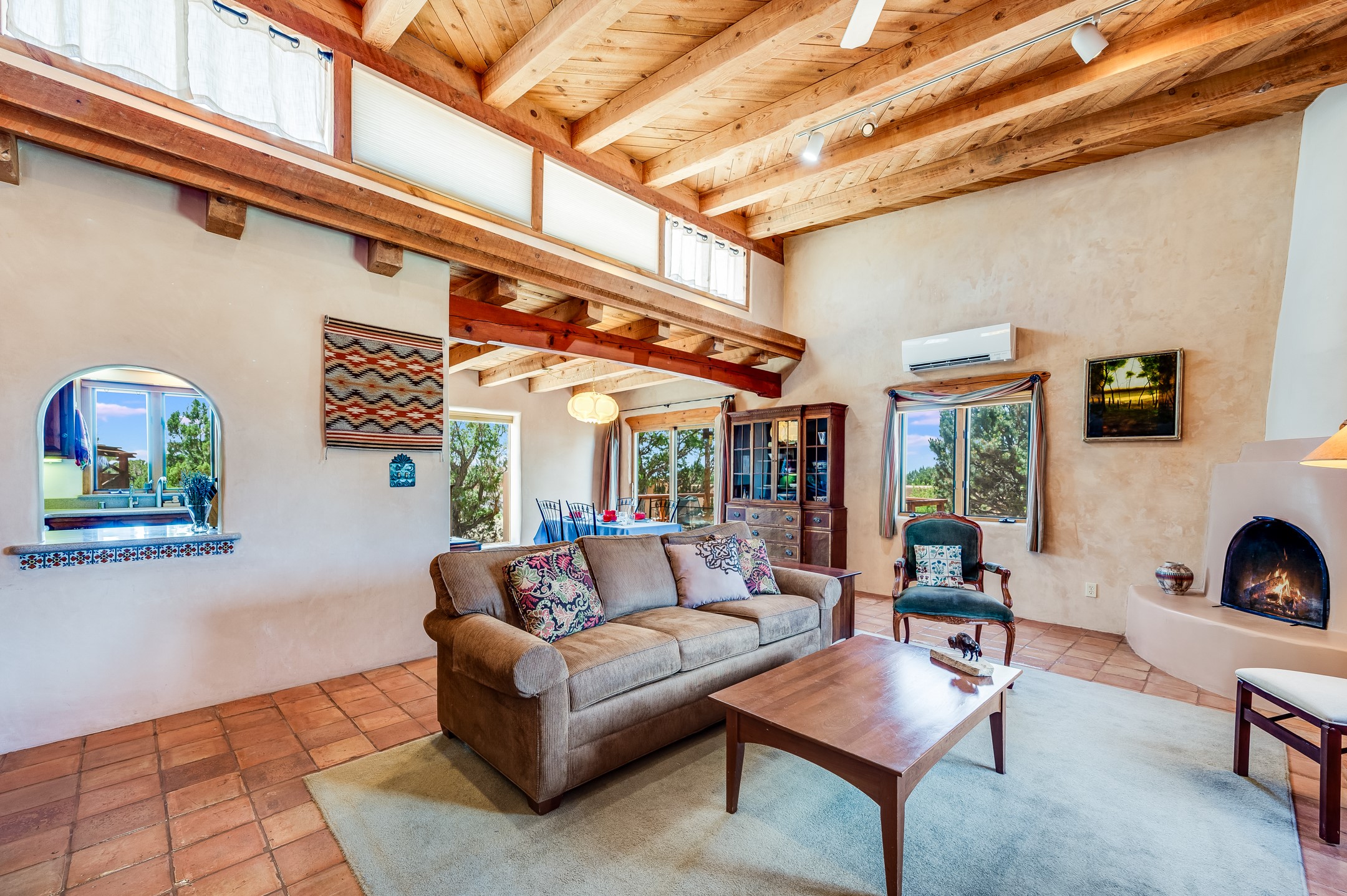 True pride of ownership is reflected in every inch of this wonderfully maintained Eldorado classic. This charming pueblo style home with clerestory windows and Trombe walls was built with passive solar gain in mind, and now with the addition of a solar panel system you can comfortably say goodbye to those pesky high electric bills and enjoy year-round comfort in this all-electric home with heat pumps for AC and heat. Upon entering this lovely home, you will instantly feel the timelessness of the traditional Santa Fe style including beautiful Saltillo tile floors, warm tinted plaster walls, kiva fireplace, and gorgeous wood ceilings and beams. This, along with the very flexible floorplan, allows you to create your perfect living spaces to suit your lifestyle. Currently this 4-bedroom 3 bath home is set up as a 3-bedroom with a media room and a generously sized office off the primary bedroom. Outside, you get glorious western sunsets and mountain views off your wood deck with a walled yard for your four-legged friends, and a delightful private area with the best chicken facilities in Eldorado. Also includes an attached oversized 2-car garage with shop area and lots of storage space. The Eldorado community offers miles of trails and paved bike paths, a public library, a fantastic community center with pool, tennis, pickleball, volleyball, disc golf, athletic fields, dog park and more. It also has The Agora Shopping center with grocery store, and so much more! Did I mention the community preserve and the starry night skies?