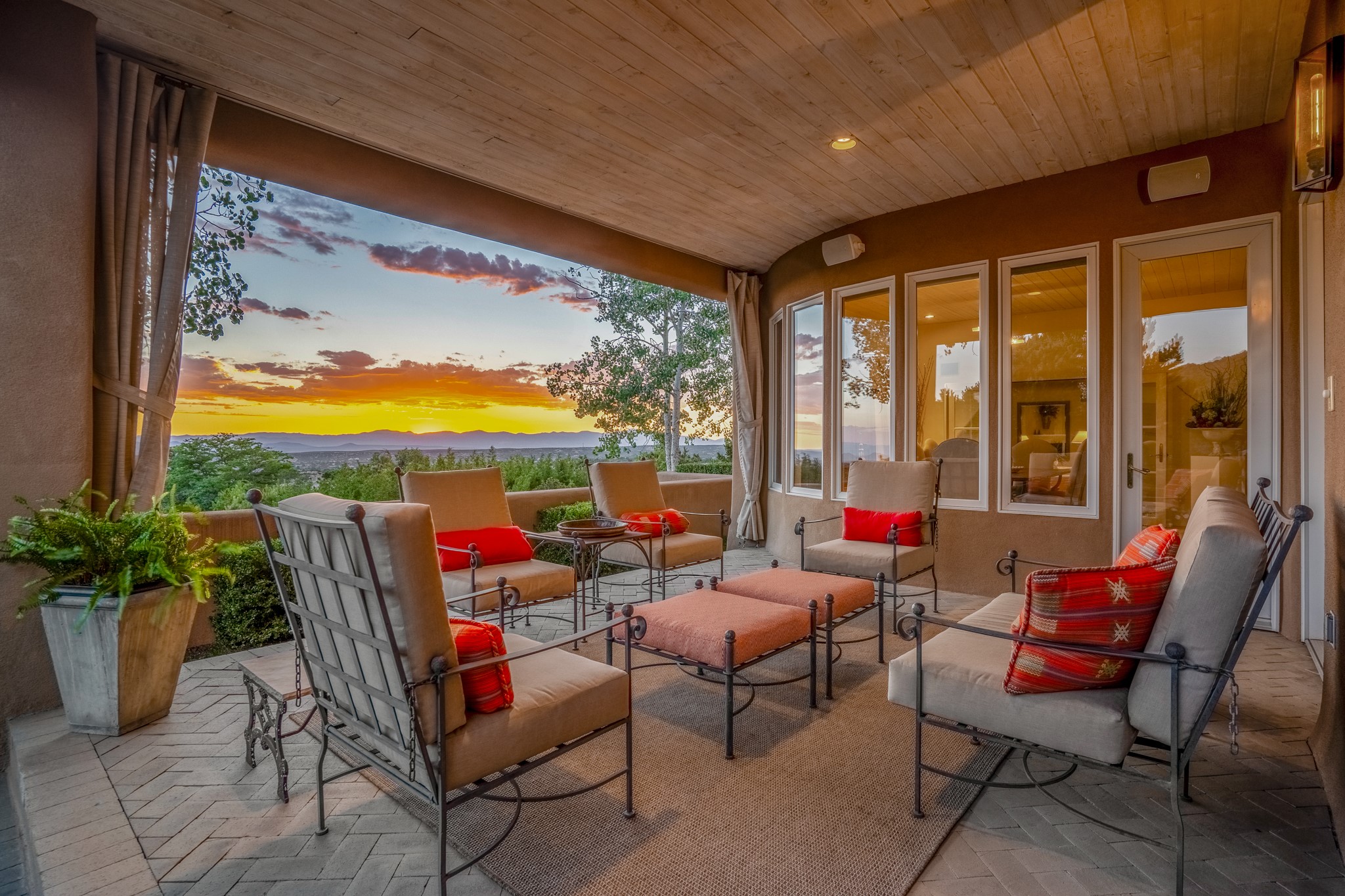 Perched in the hills above the Santa Fe Plaza, this timeless masterpiece with panoramic views of the town was expertly built in the 1990s by Jim Satzinger and flawlessly polished by the discerning eye of the interior designer who called it home. The mostly single level, +/- 3500 square foot floor plan is sited at the rear of a cul-de-sac parcel that looks much larger and feels much more private than the acreage would imply. Its central living space is bookended by the owners' suite and personal office in the North wing, and the two guest bedroom suites in the South wing. With lushly landscaped surroundings and deep portals to lure you through the numerous French doors, it is not only the uninterrupted view that will captivate. Some of the features include polished French limestone floors, recently renovated custom cabinetry, mini-splits, custom solid doors throughout, Dornbracht plumbing fixtures, imported Turkish tile accents, beamed ceilings, gleaming plaster walls, numerous fireplaces to cozy up to, a heated driveway, and new roof in 2021 to round it out. A near endless list of refined finishes, high end appliances, and immaculate maintenance record are testament to the meticulous care this property has received. With a curated furniture package that is negotiable, this home is truly one-of-a-kind and completely move-in ready.