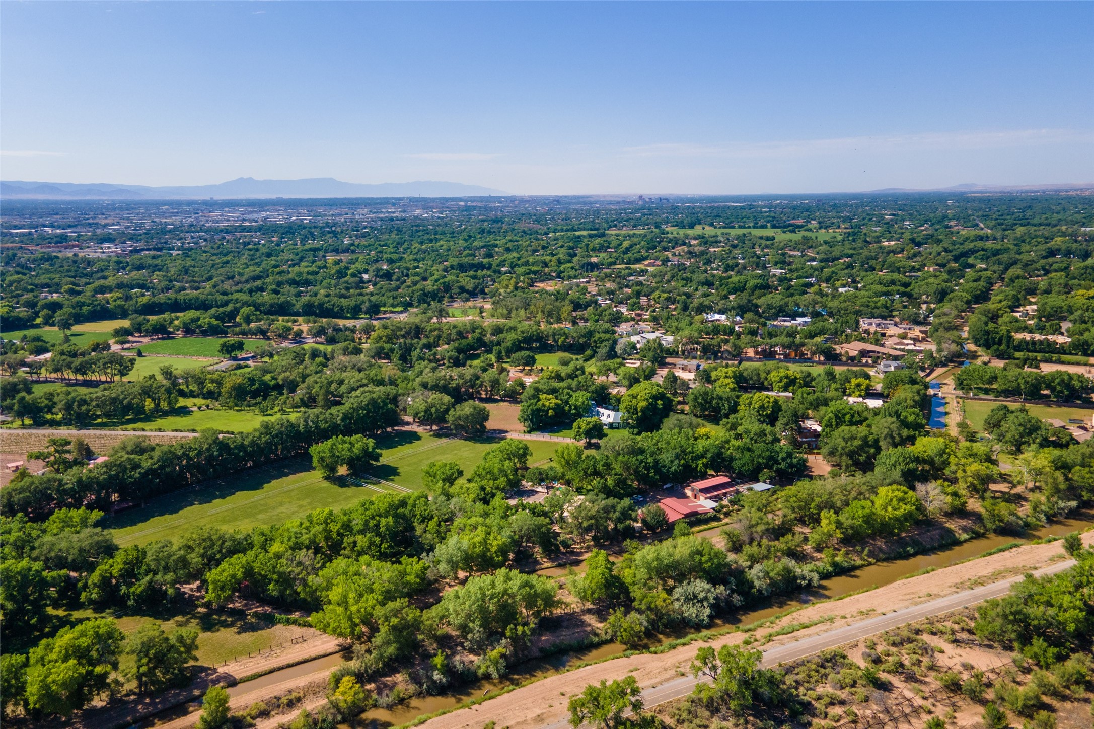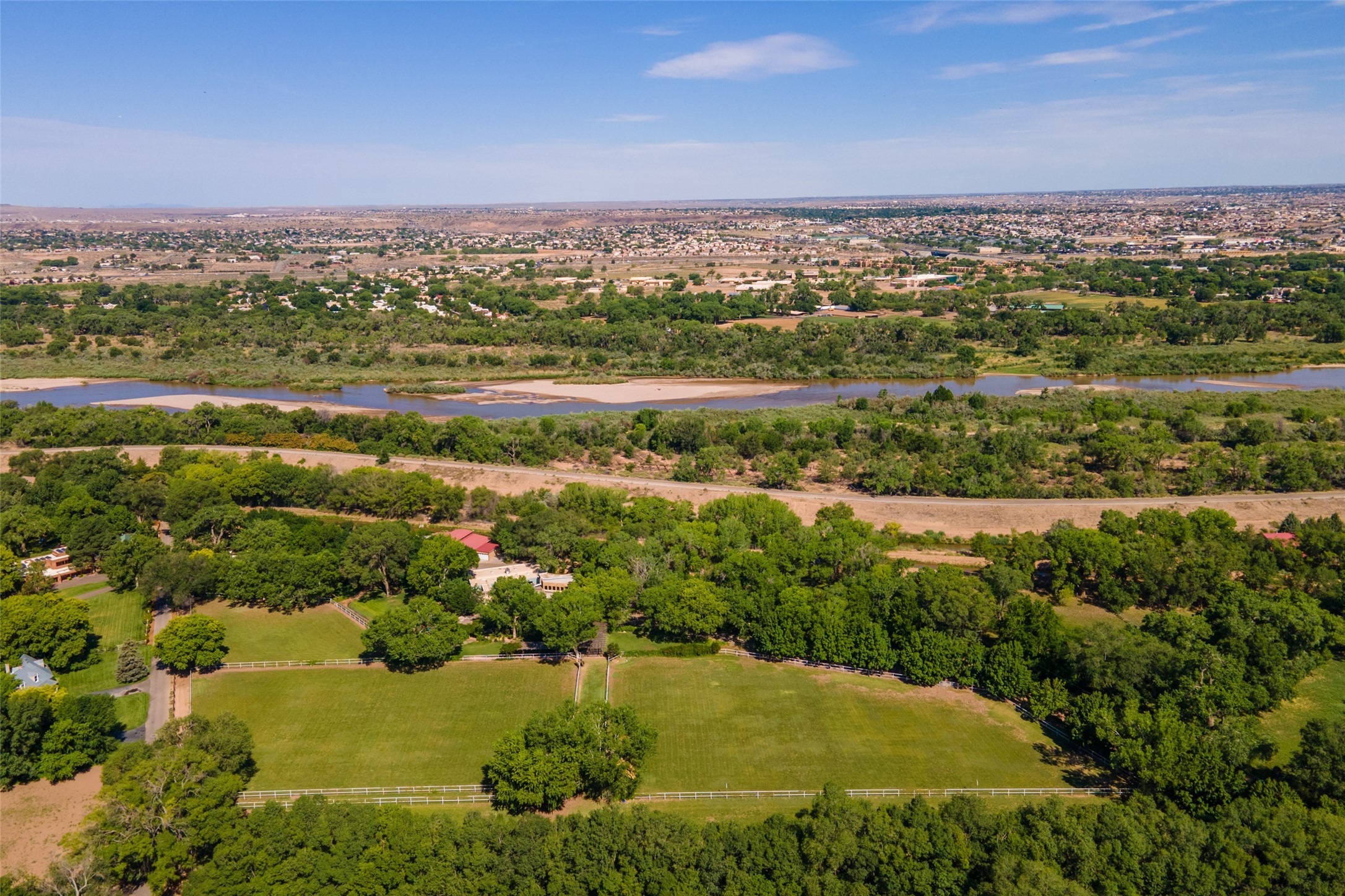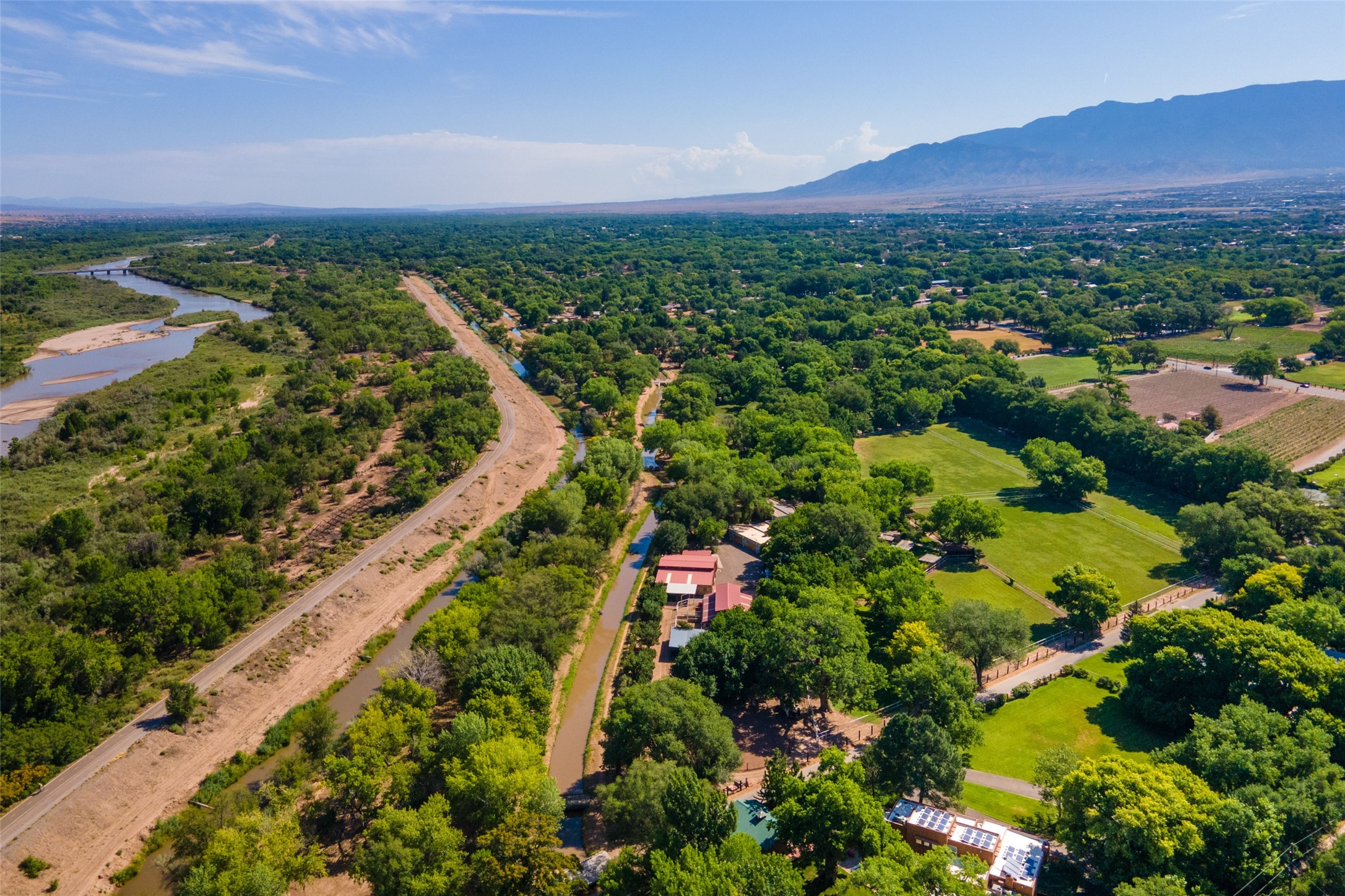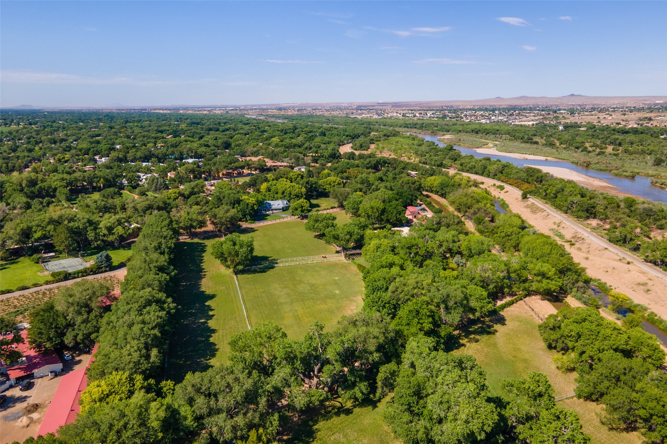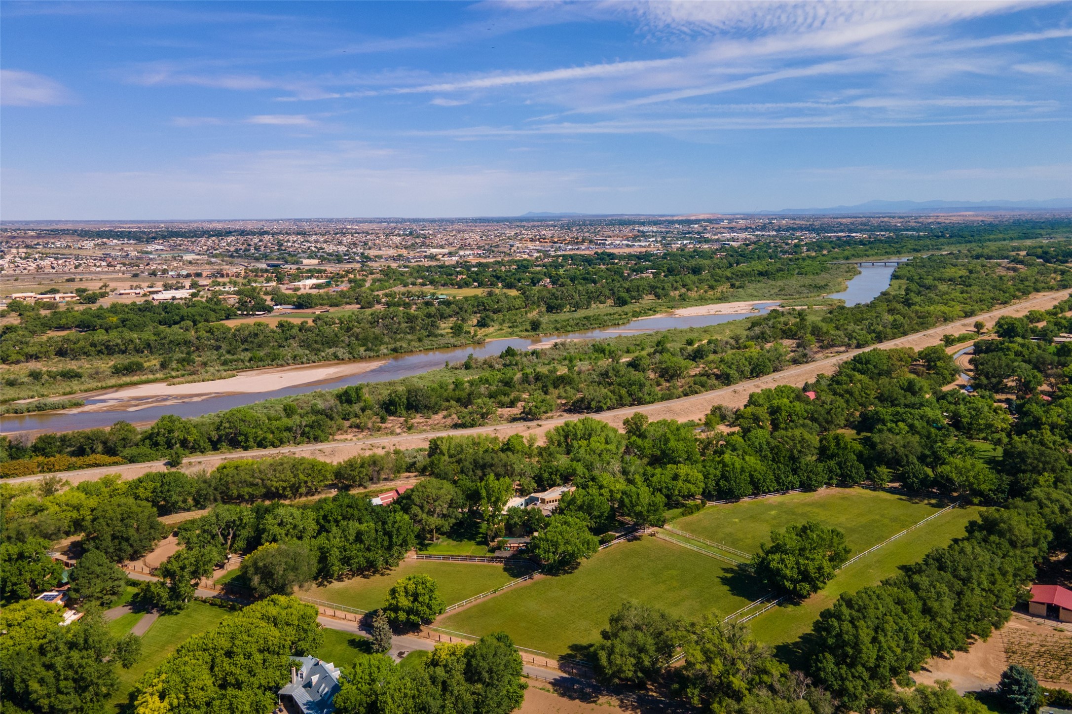 Sited on 9 + lush acres along the Bosque of the Rio Grande in the heart of Los Ranchos towering cottonwoods, fruit trees, rose gardens,horse facilities & green pastures await. Peaceful natural wildlife habitat on pond with studio. Large,comfortable home with several living areas, offering space for multiple uses. Lovely outdoor entertaining spaces, pool & cabana. Irrigation from several wells and MRGCD ditch rights provide water for multiple uses. 6 stall barn with turnouts, hot walker, round pen provide your horses with room. Riding trails along the Bosque are easily accessed. Newly remodeled attached 2 bedroom casita with private entrance provides an oasis for in laws or guests with separate kitchen and living areas. So many possibilities to enjoy a peaceful, country lifestyle!