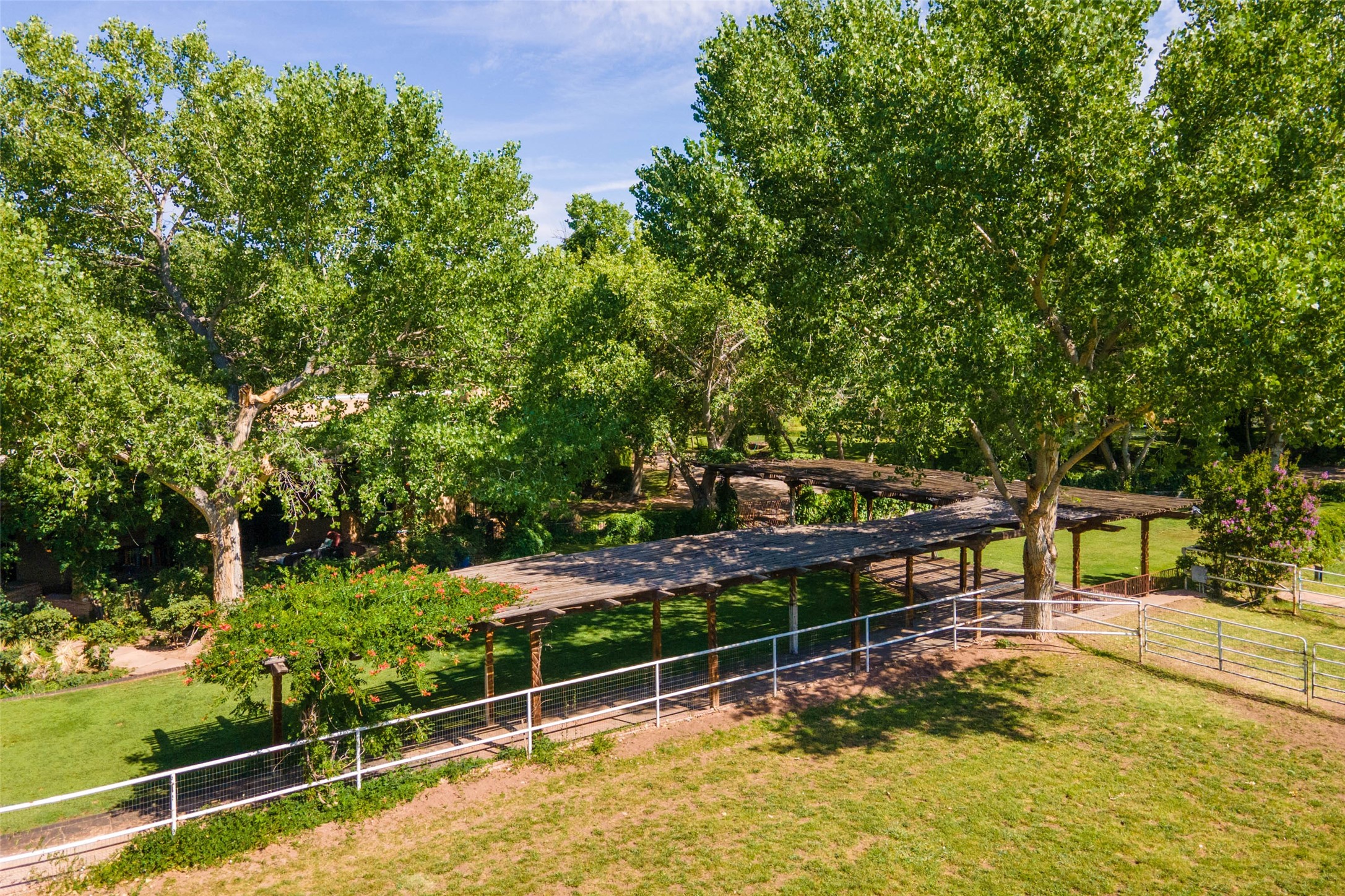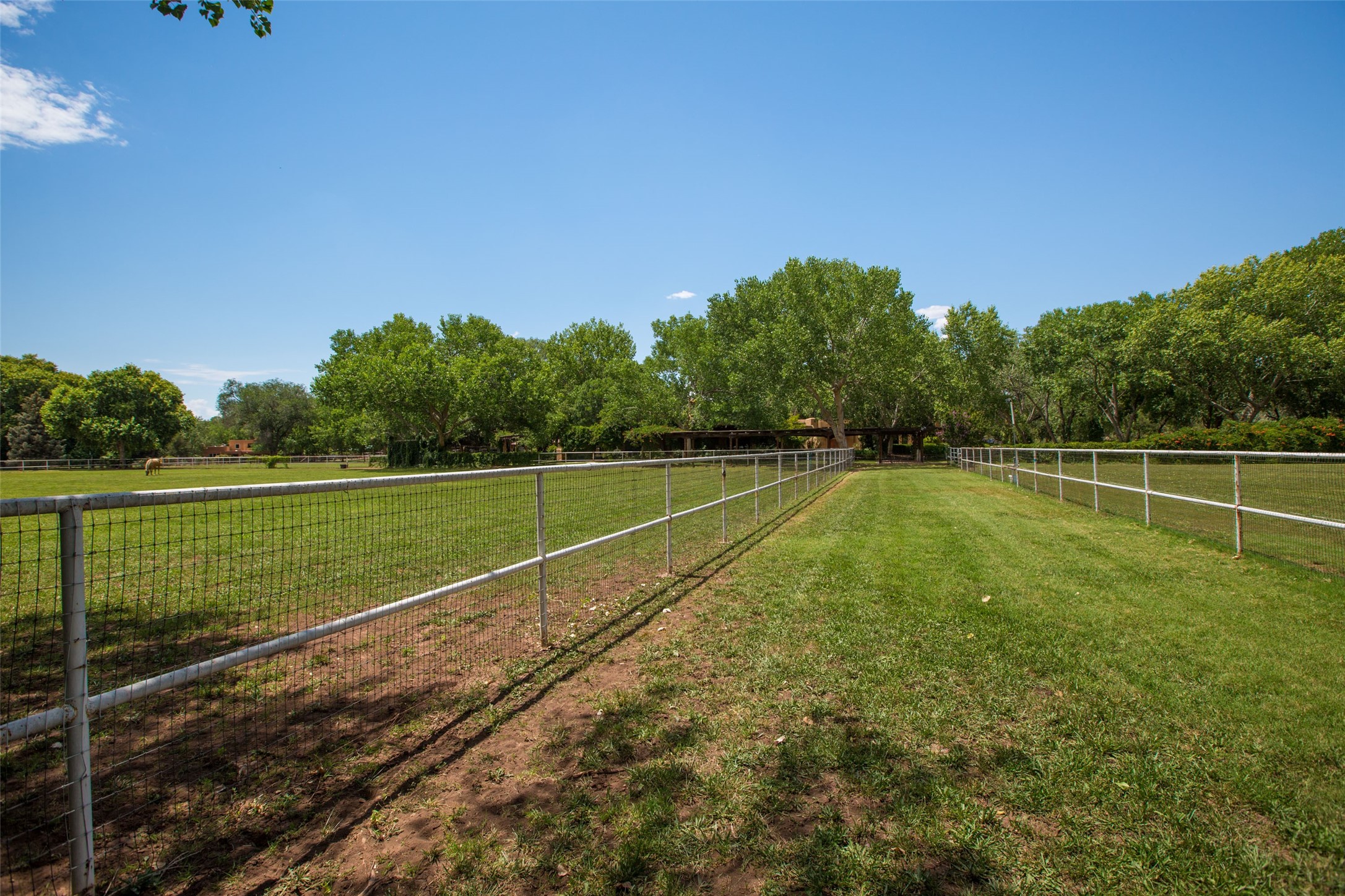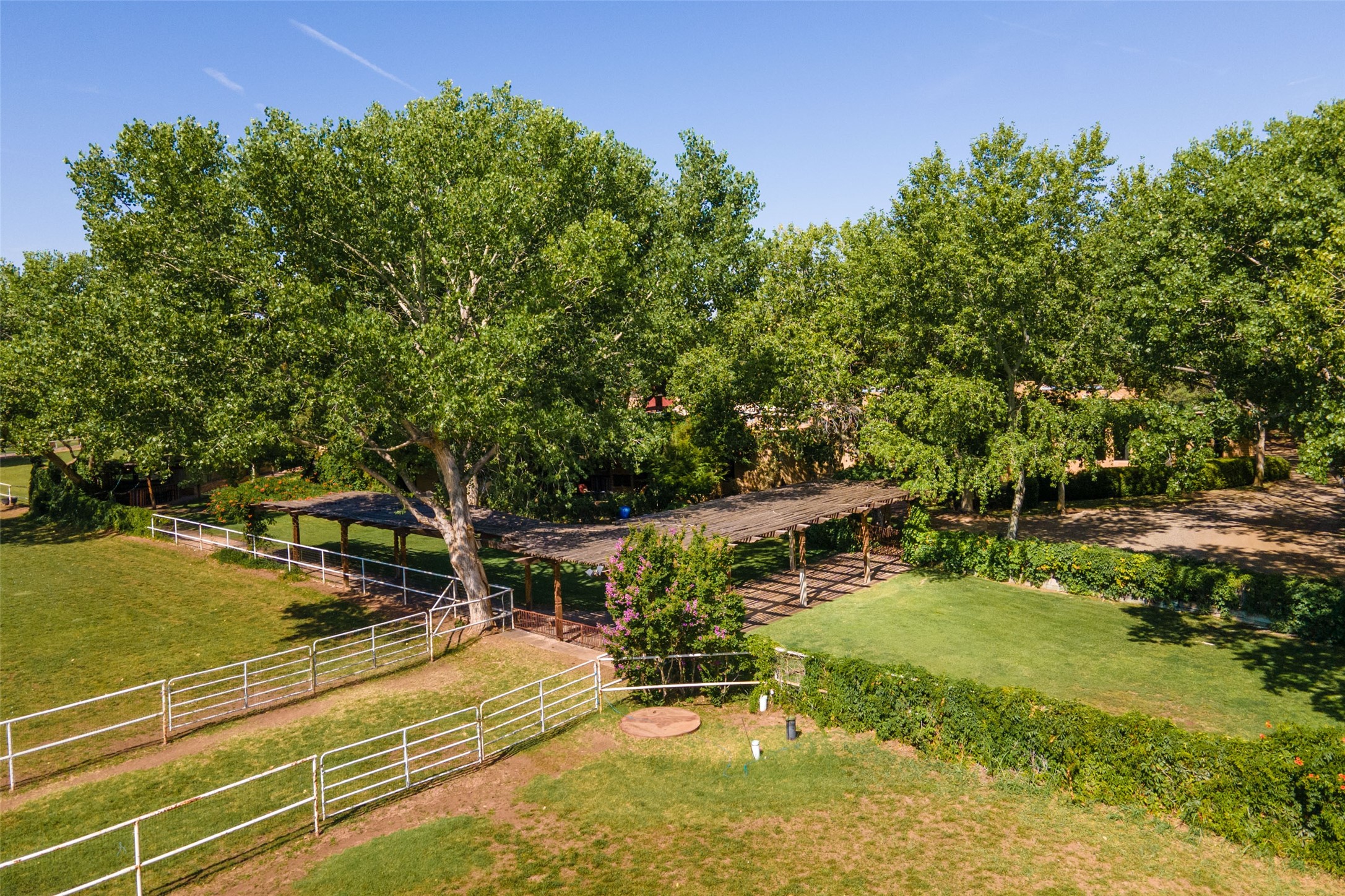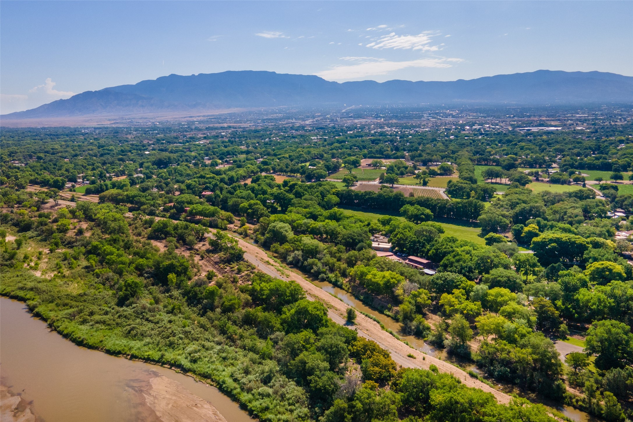 Sited on 9 + lush acres along the Bosque of the Rio Grande in the heart of Los Ranchos towering cottonwoods, fruit trees, rose gardens,horse facilities & green pastures await. Peaceful natural wildlife habitat on pond with studio. Large,comfortable home with several living areas, offering space for multiple uses. Lovely outdoor entertaining spaces, pool & cabana. Irrigation from several wells and MRGCD ditch rights provide water for multiple uses. 6 stall barn with turnouts, hot walker, round pen provide your horses with room. Riding trails along the Bosque are easily accessed. Newly remodeled attached 2 bedroom casita with private entrance provides an oasis for in laws or guests with separate kitchen and living areas. So many possibilities to enjoy a peaceful, country lifestyle!