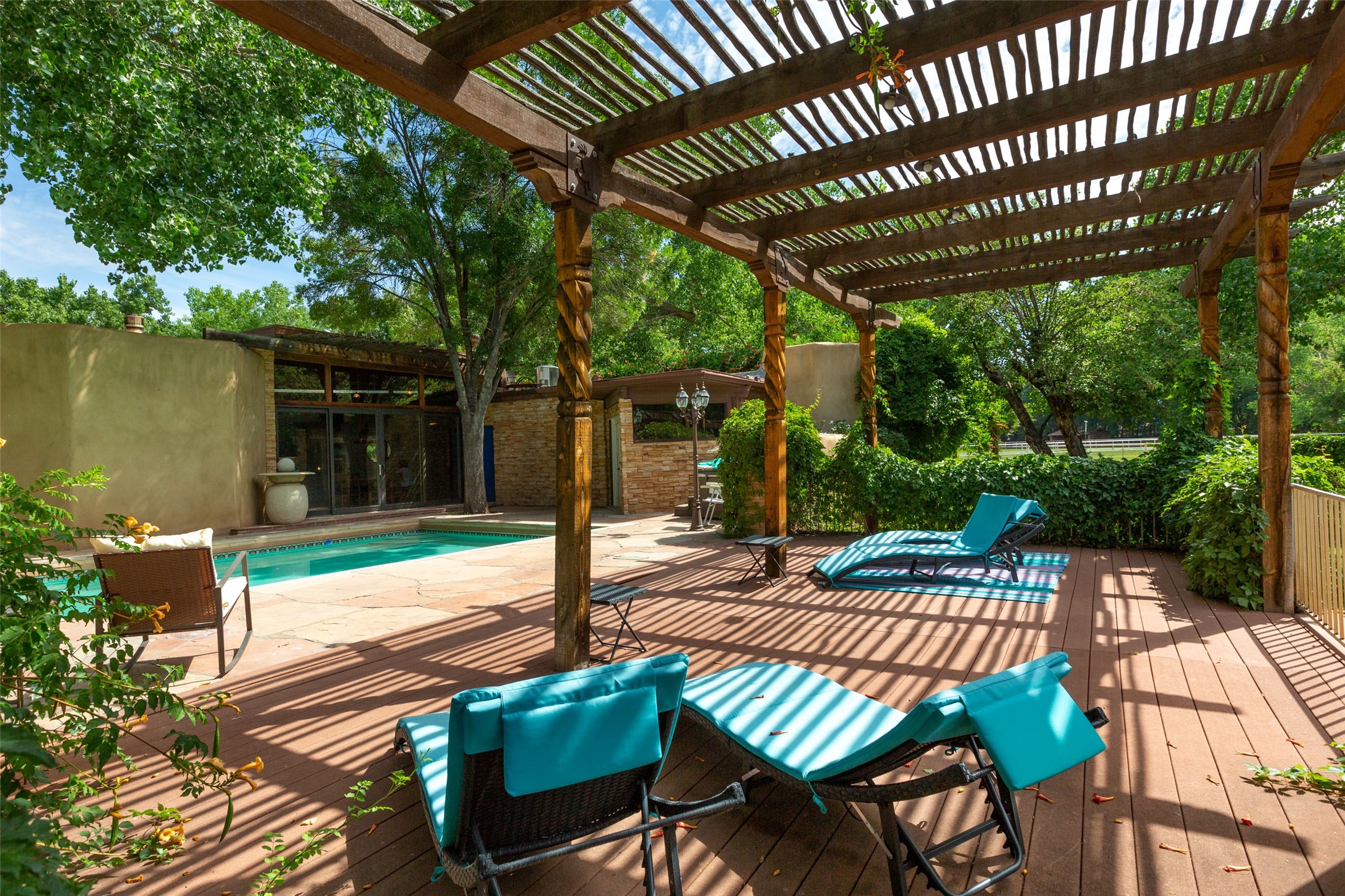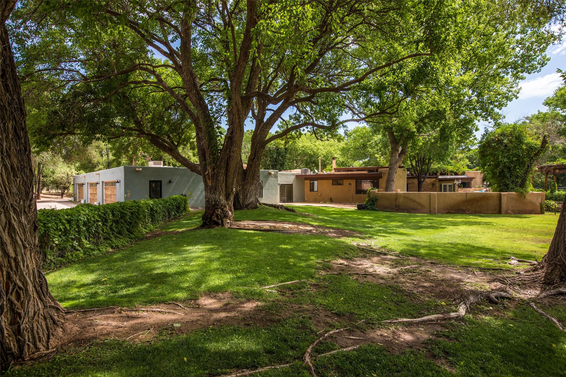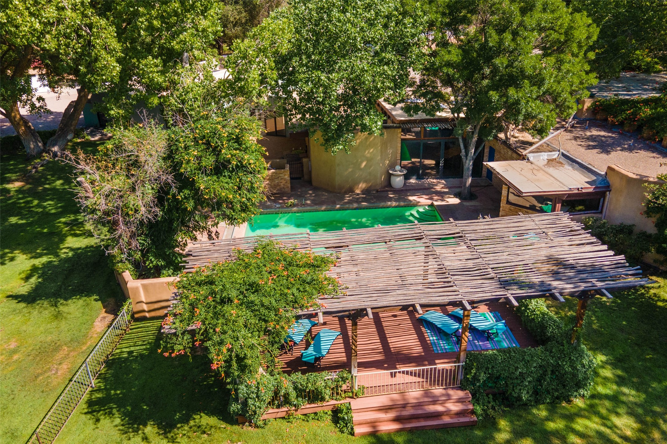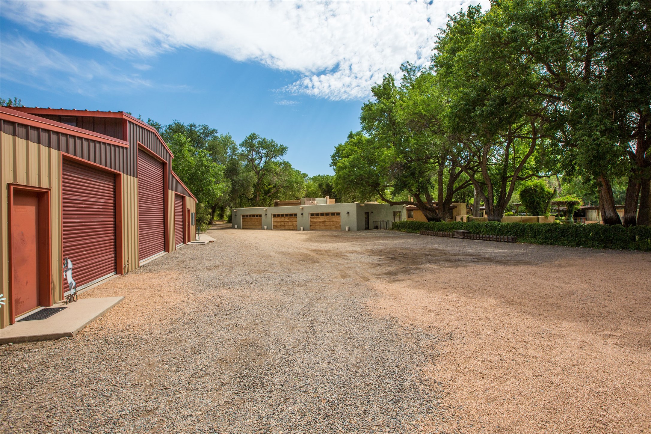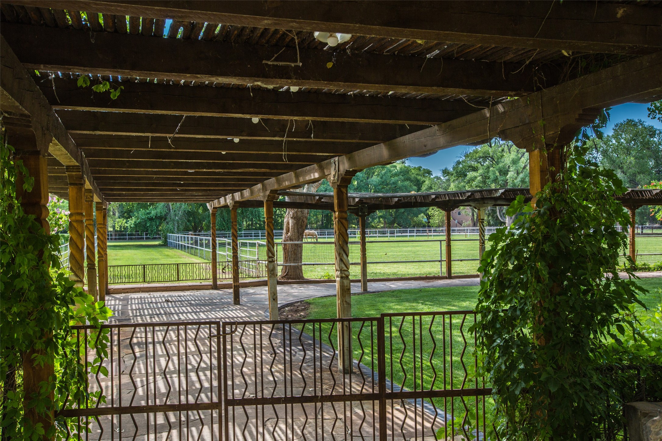 Sited on 9 + lush acres along the Bosque of the Rio Grande in the heart of Los Ranchos towering cottonwoods, fruit trees, rose gardens,horse facilities & green pastures await. Peaceful natural wildlife habitat on pond with studio. Large,comfortable home with several living areas, offering space for multiple uses. Lovely outdoor entertaining spaces, pool & cabana. Irrigation from several wells and MRGCD ditch rights provide water for multiple uses. 6 stall barn with turnouts, hot walker, round pen provide your horses with room. Riding trails along the Bosque are easily accessed. Newly remodeled attached 2 bedroom casita with private entrance provides an oasis for in laws or guests with separate kitchen and living areas. So many possibilities to enjoy a peaceful, country lifestyle!