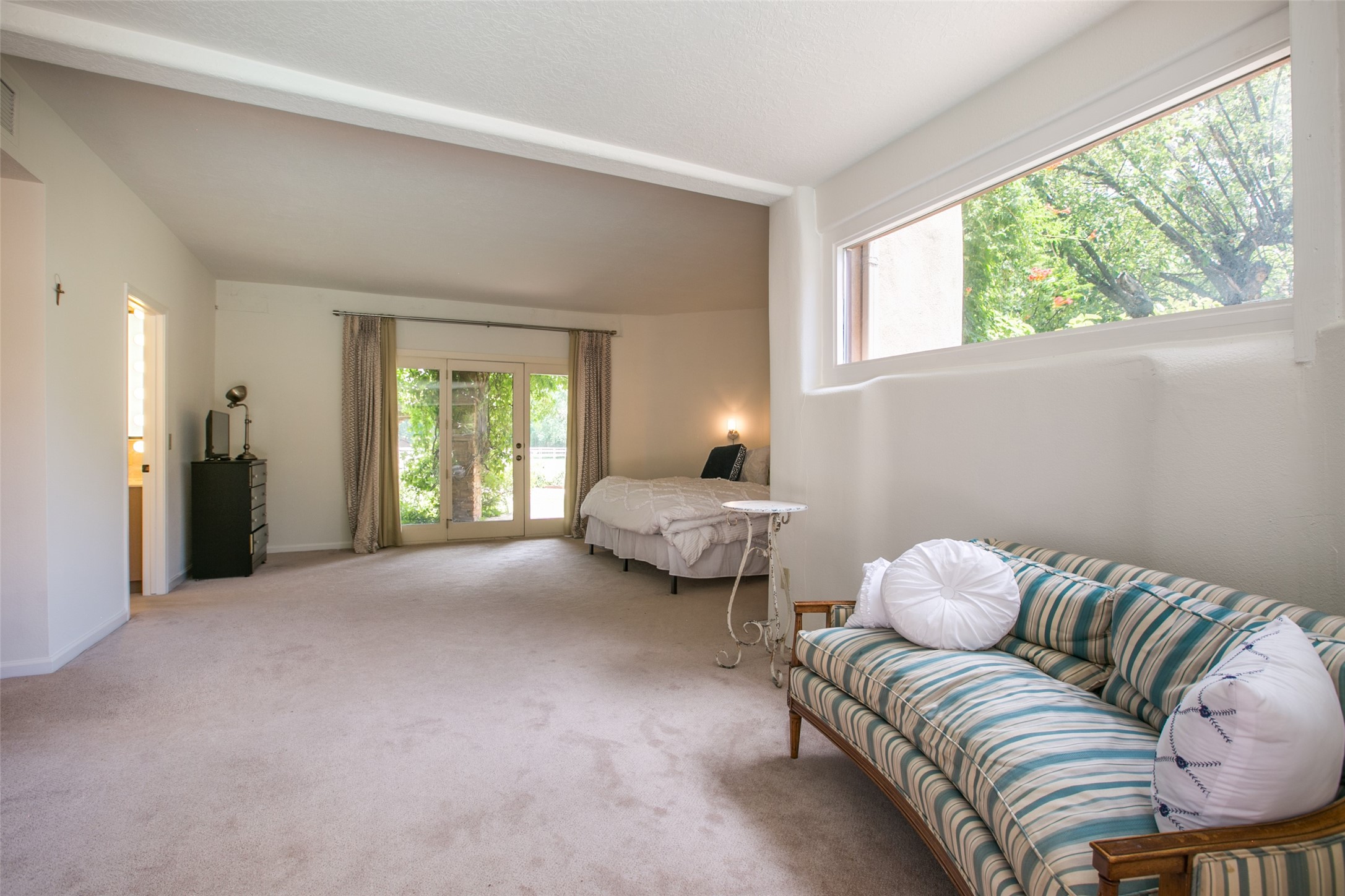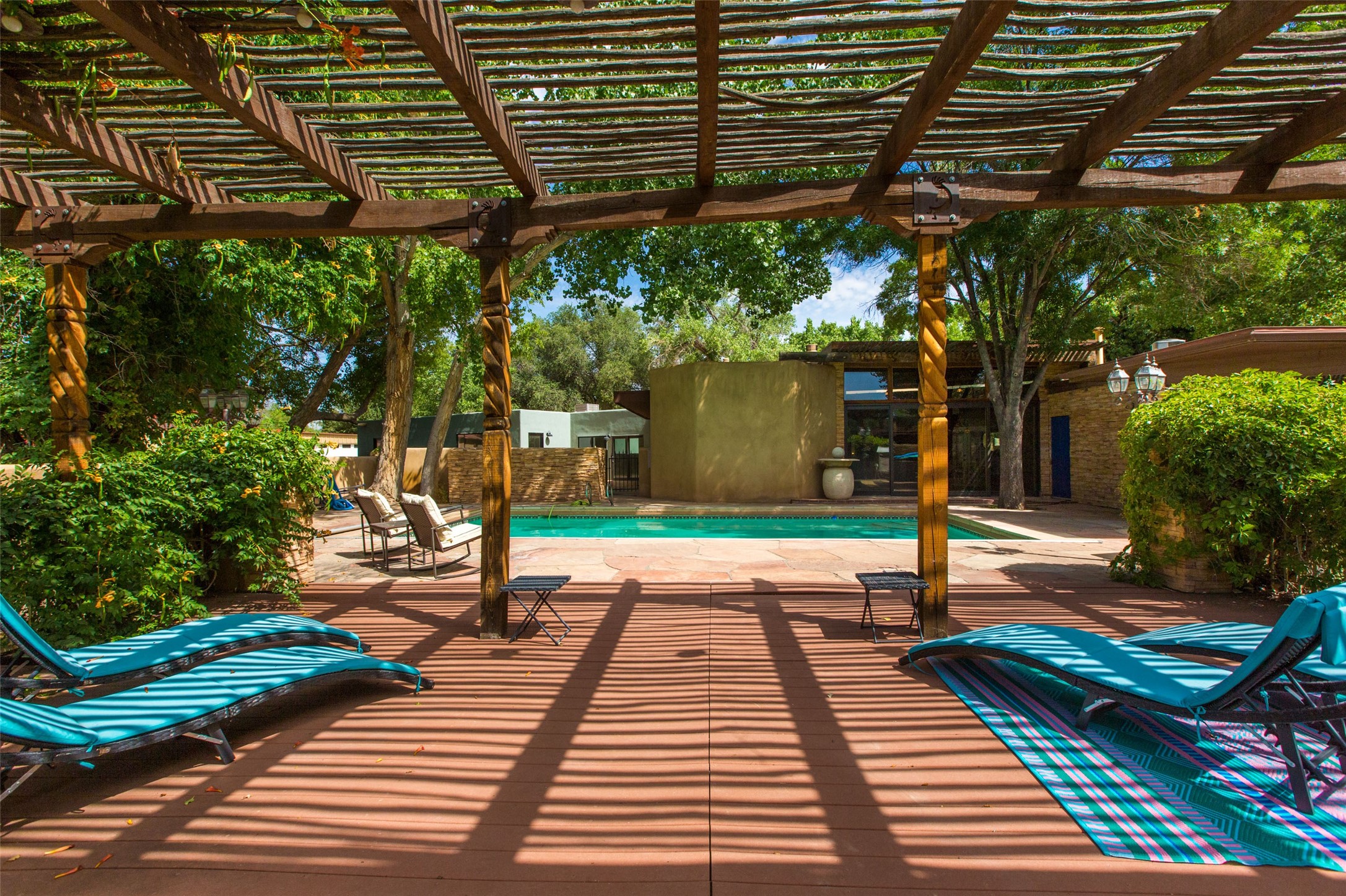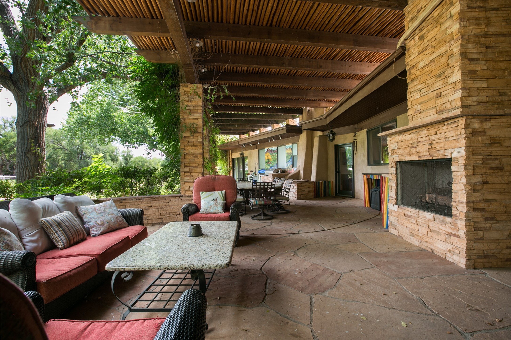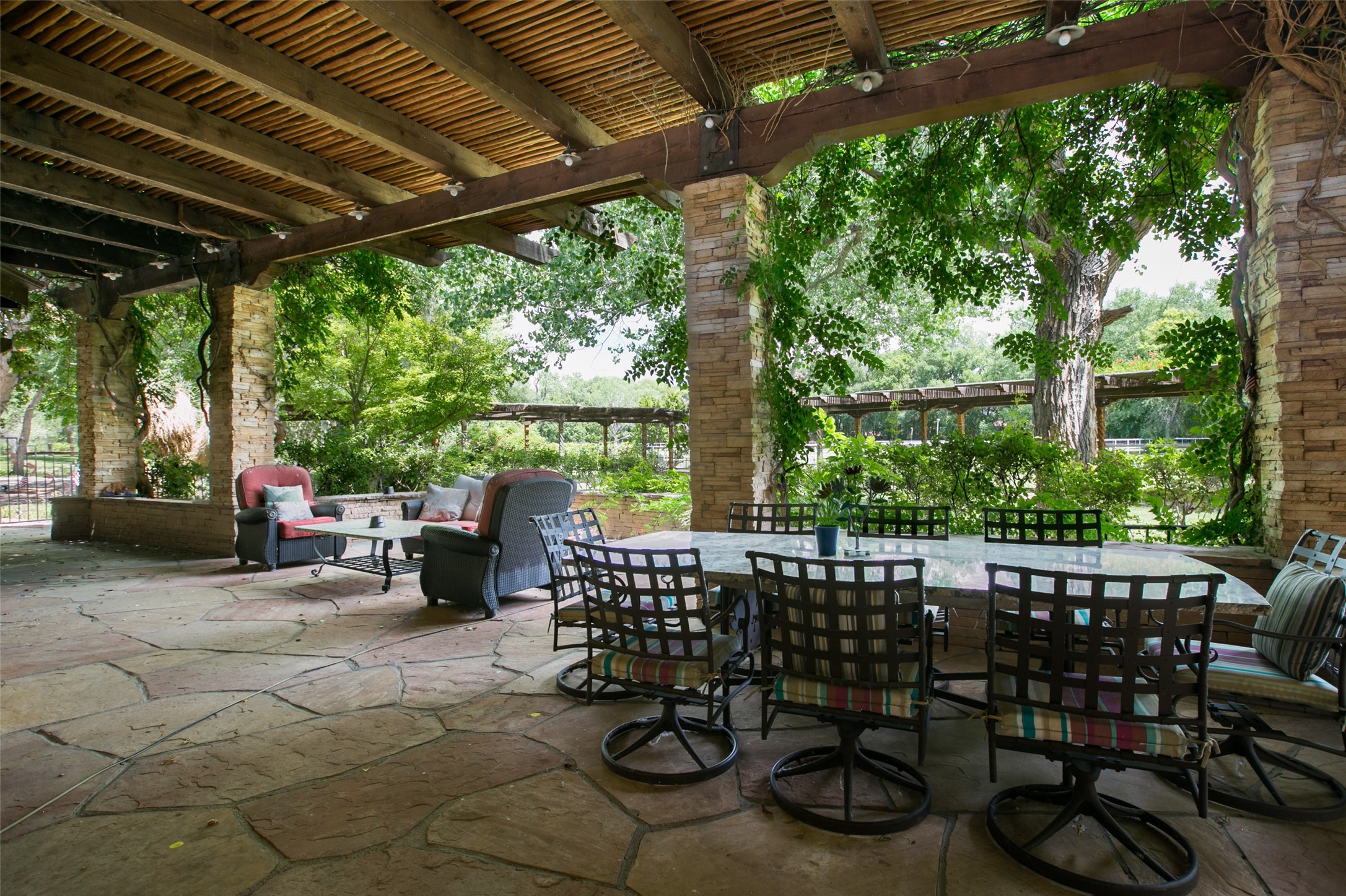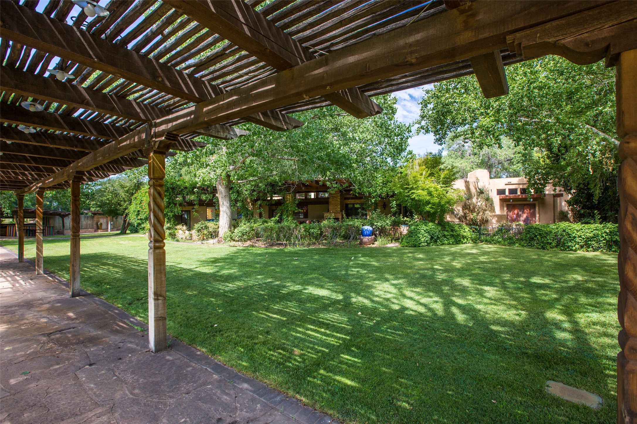 Sited on 9 + lush acres along the Bosque of the Rio Grande in the heart of Los Ranchos towering cottonwoods, fruit trees, rose gardens,horse facilities & green pastures await. Peaceful natural wildlife habitat on pond with studio. Large,comfortable home with several living areas, offering space for multiple uses. Lovely outdoor entertaining spaces, pool & cabana. Irrigation from several wells and MRGCD ditch rights provide water for multiple uses. 6 stall barn with turnouts, hot walker, round pen provide your horses with room. Riding trails along the Bosque are easily accessed. Newly remodeled attached 2 bedroom casita with private entrance provides an oasis for in laws or guests with separate kitchen and living areas. So many possibilities to enjoy a peaceful, country lifestyle!