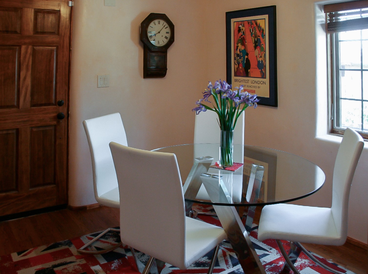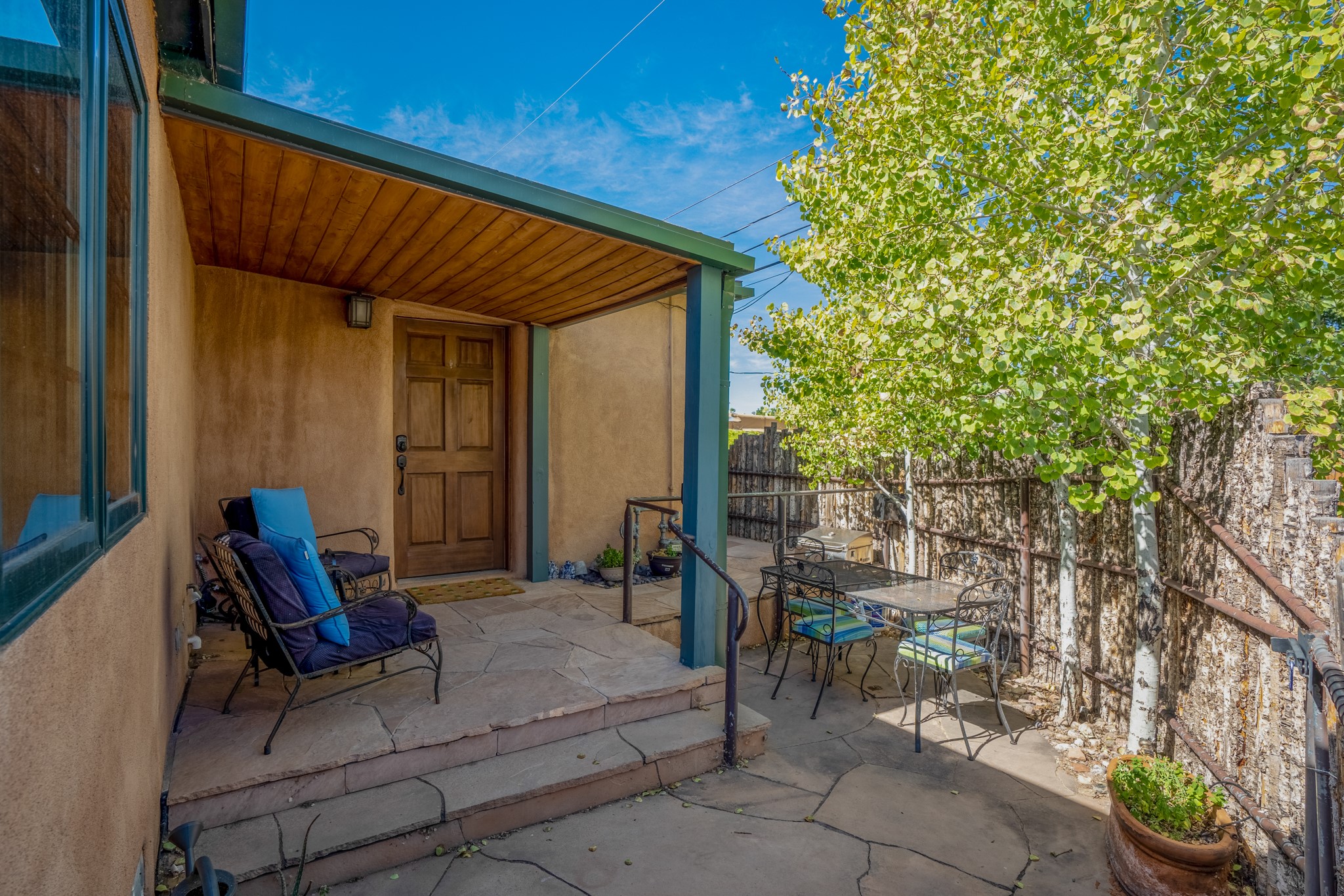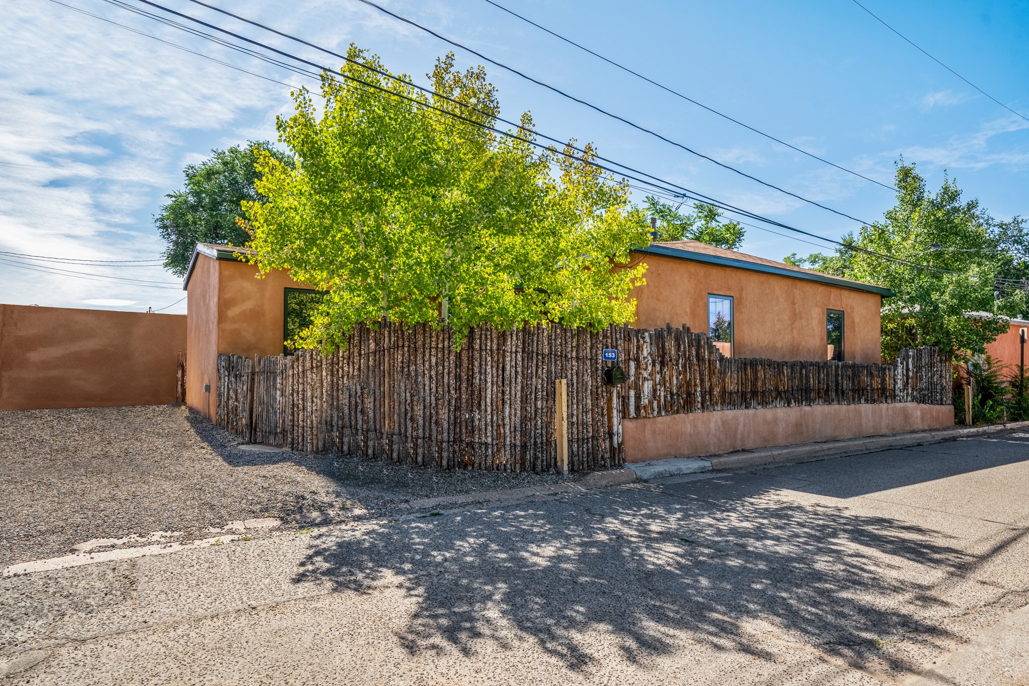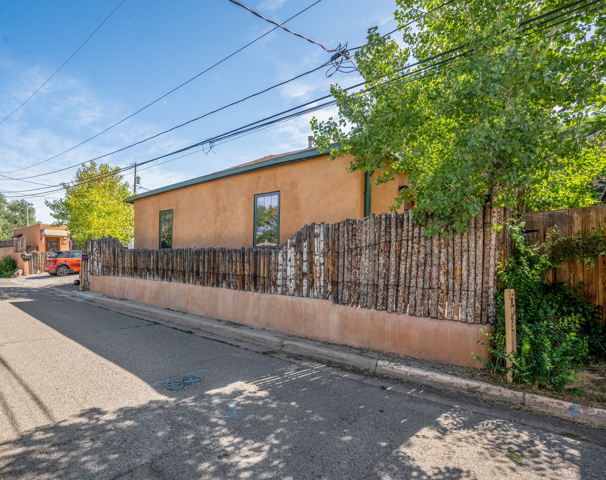 Predominantly Adobe with abundant charm! 3 Bedrooms and 2 baths (third bedroom is a flex space with an exterior door) with updates throughout. Kitchen has stainless steel appliances, including a wine refrigerator, and granite countertops. Outdoor spaces with mature aspen trees are cozy and inviting, while requiring minimal maintenance. Highly prized off-street parking for two vehicles. Superb location - close to the Plaza, shopping, entertainment and more than 20 restaurants. Currently a long-term rental, the home has a short-term rental history as well. This versatile property can serve as either a comfortable home or a source of supplementary income, depending on your vision.