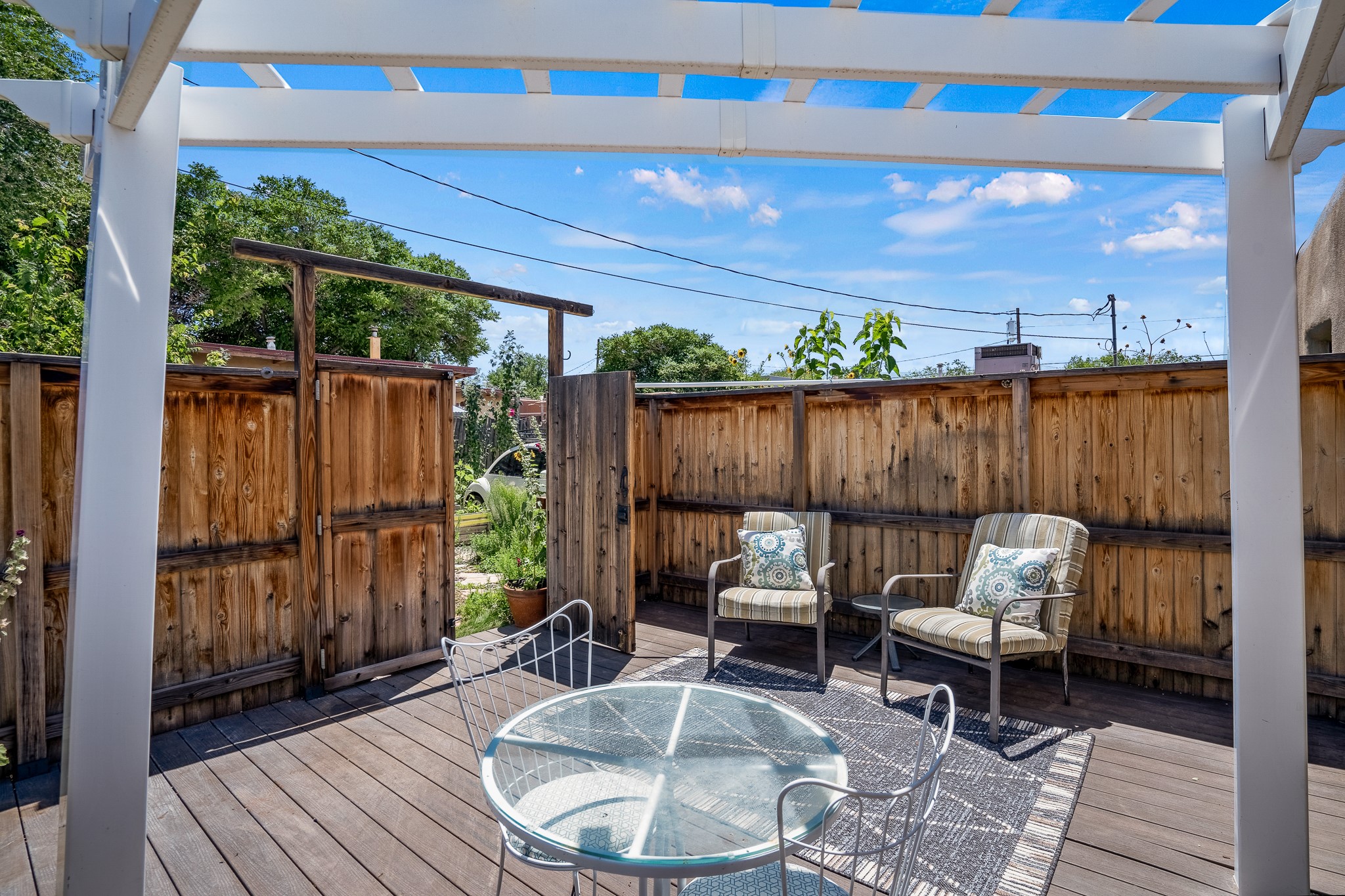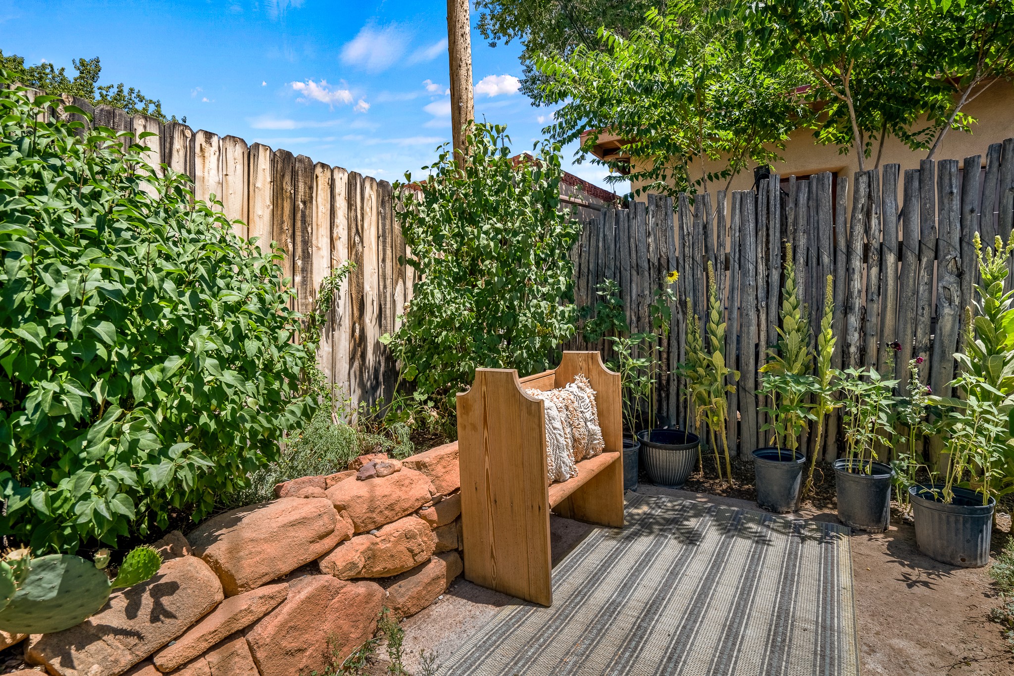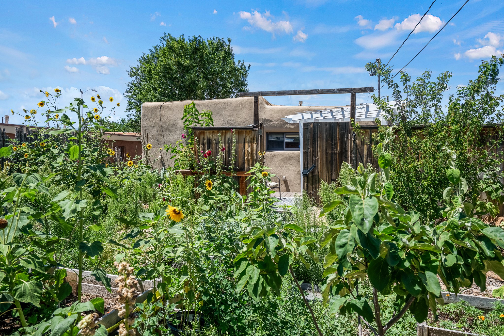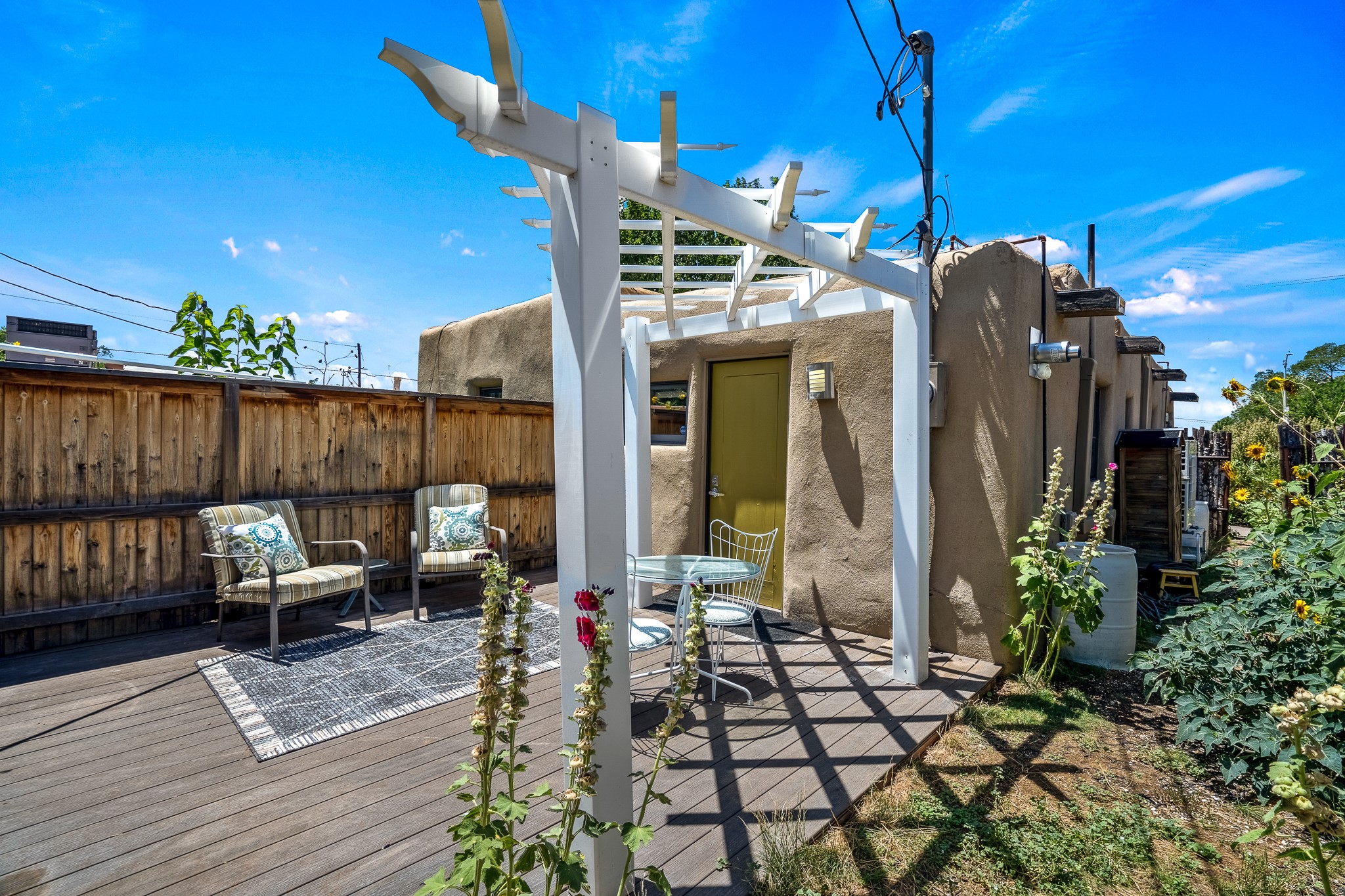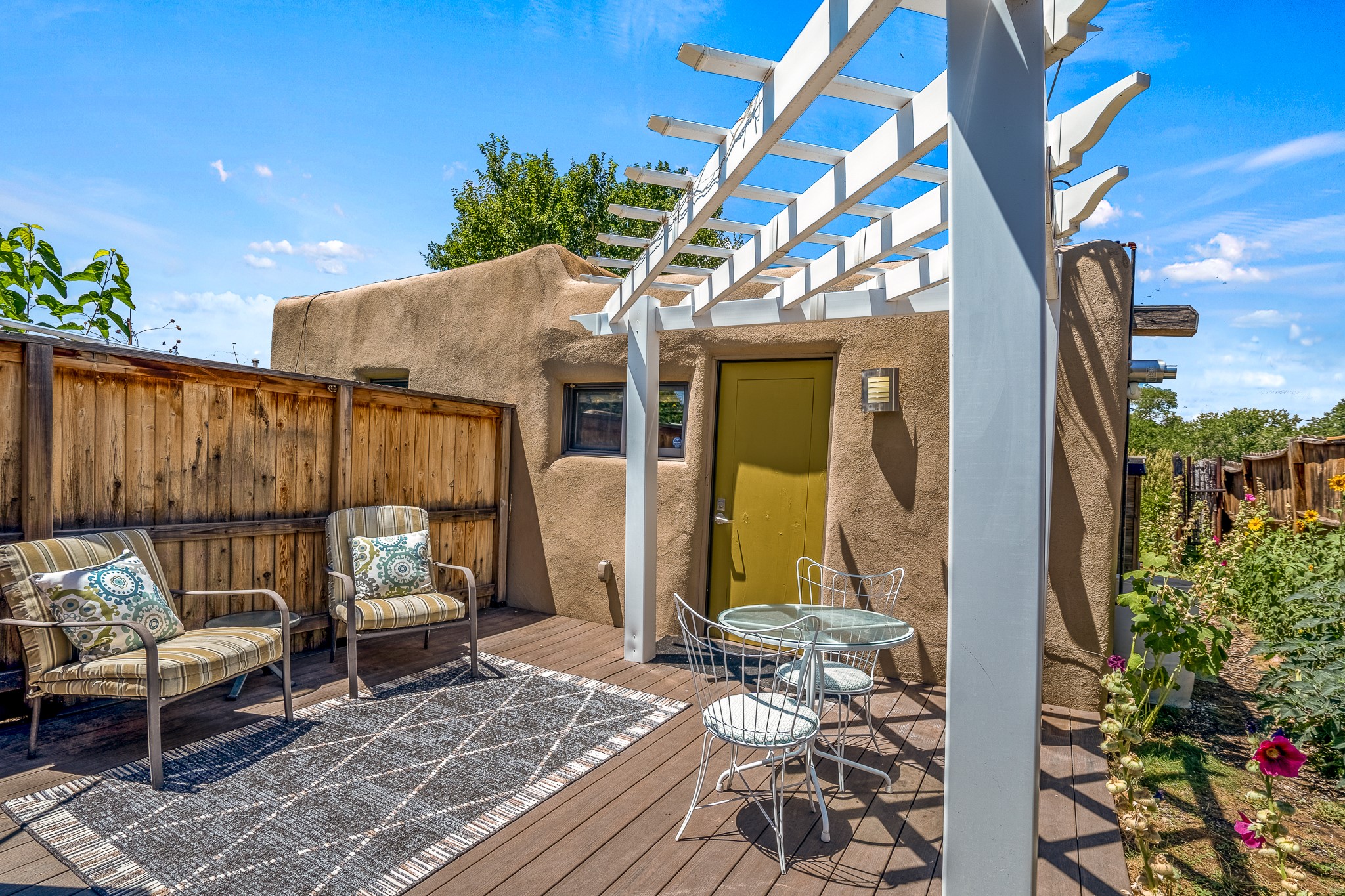 Step into the enchanting private walled courtyard, and the magic unfolds! This adobe casita offers a blend of uniqueness, trendiness, and turnkey convenience, with versatile spaces for living, working, or a live/work setup. The backyard is a gardener's paradise,complemented by a beautiful private outdoor deck, creating even more living area. Situated in the fabulous Railyard location, you'll enjoy a walkable/bikeable lifestyle with easy access to the Farmer's Market, shopping, restaurants, theaters, train, and walking trails. Recent upgrades include the roof and mini-splits for heating and cooling, enhancing the overall comfort of this wonderful home.