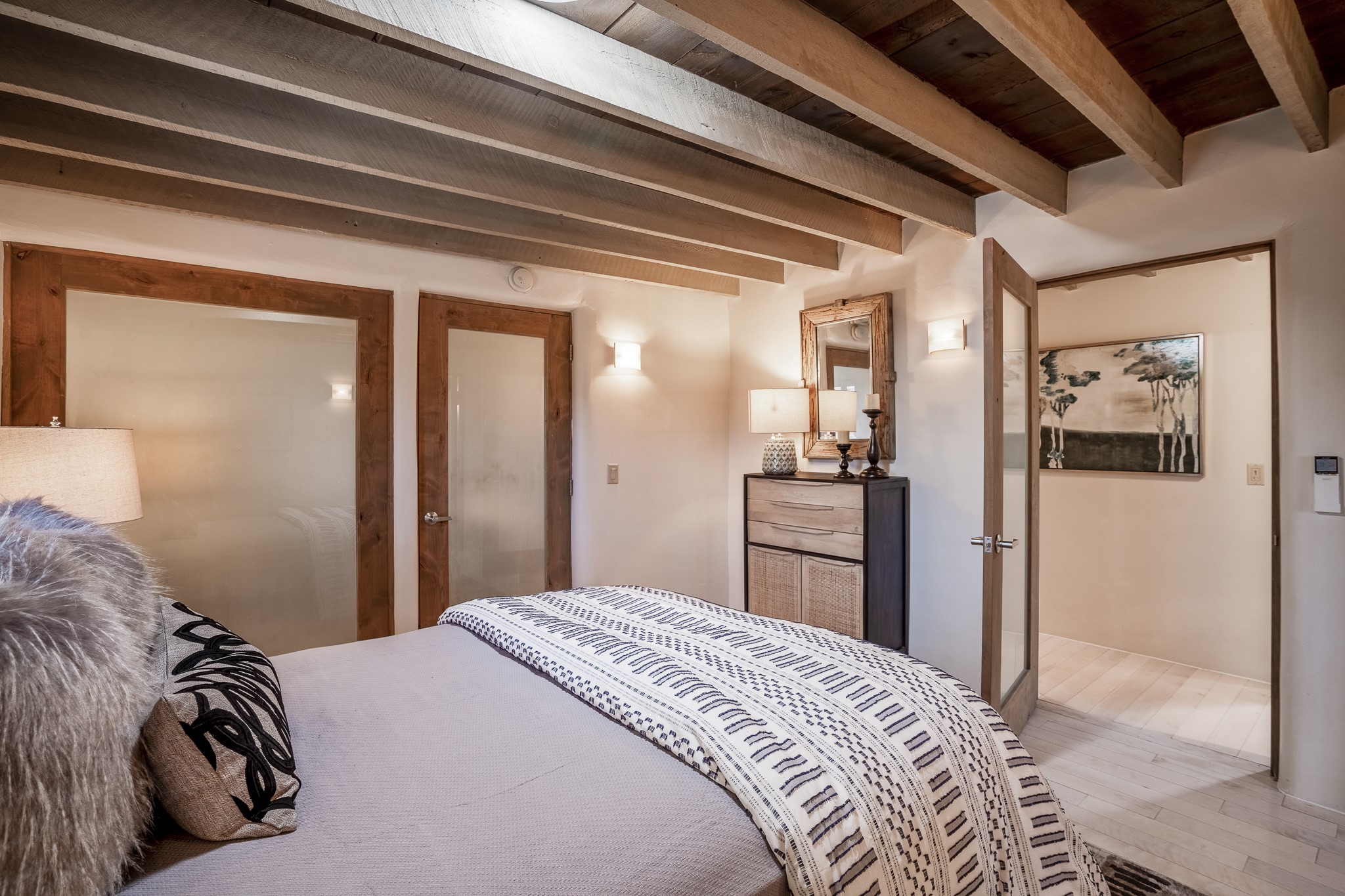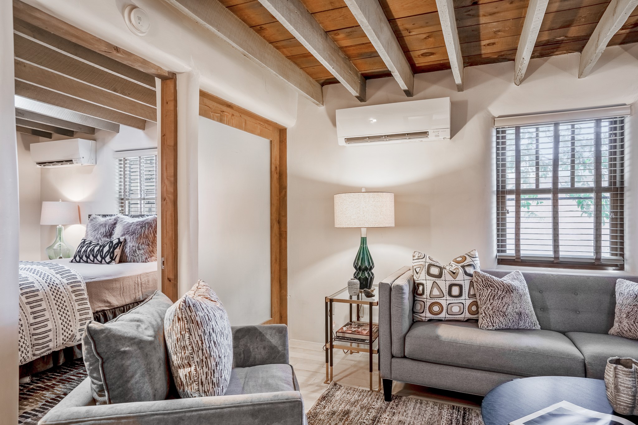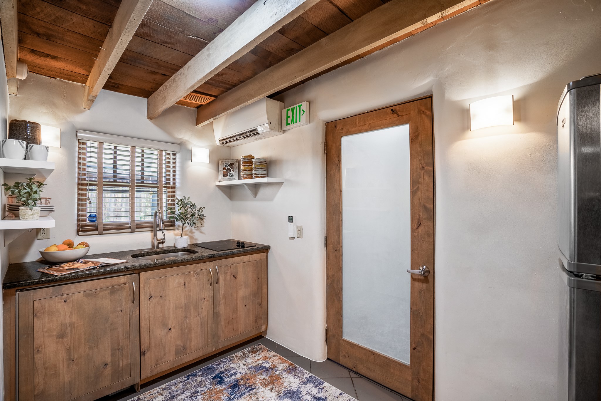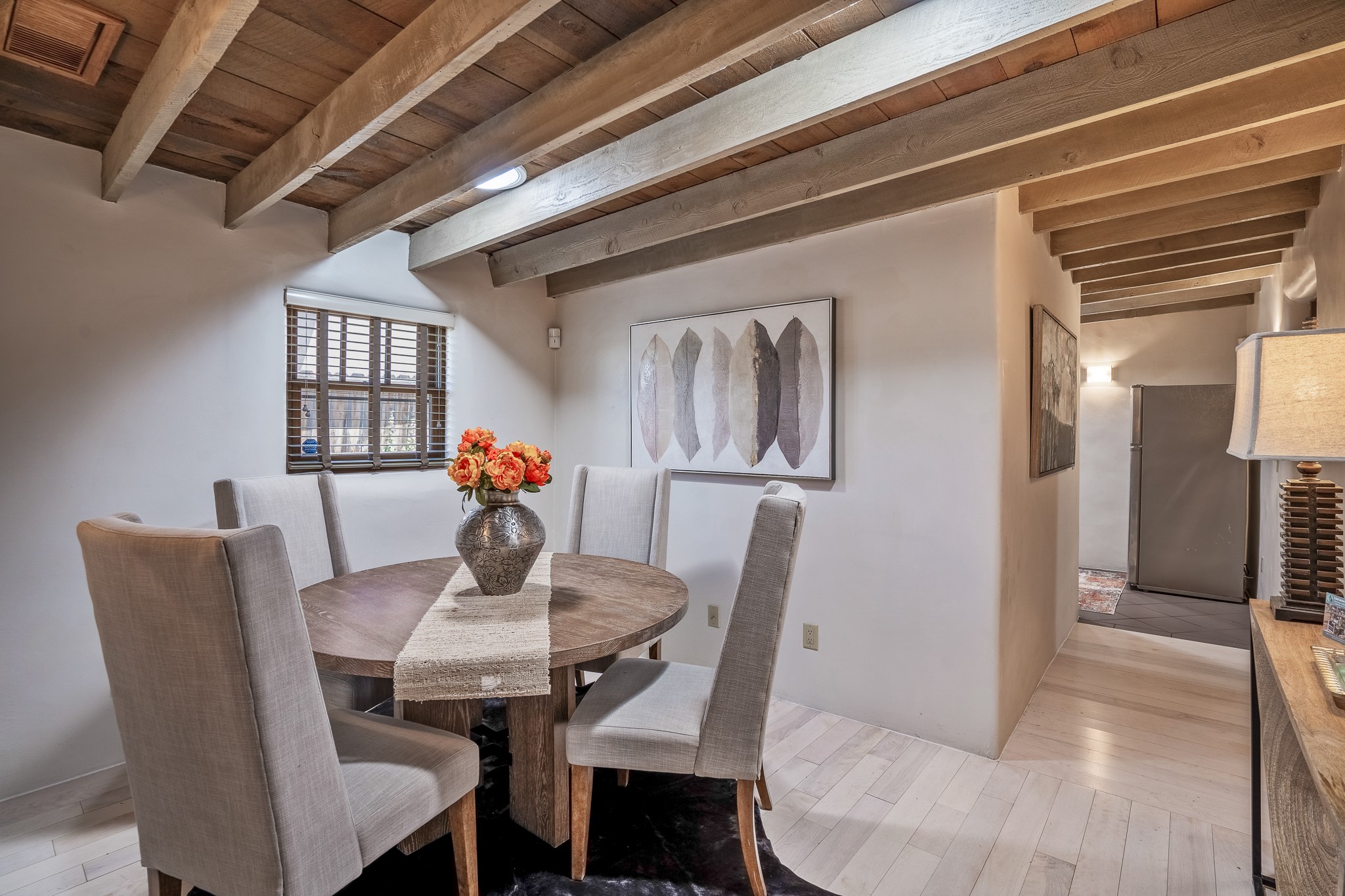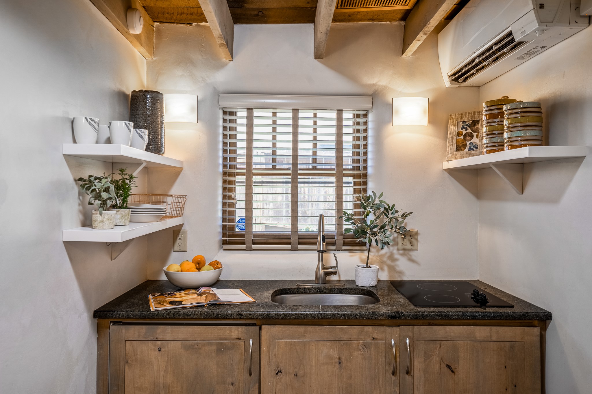Step into the enchanting private walled courtyard, and the magic unfolds! This adobe casita offers a blend of uniqueness, trendiness, and turnkey convenience, with versatile spaces for living, working, or a live/work setup. The backyard is a gardener's paradise,complemented by a beautiful private outdoor deck, creating even more living area. Situated in the fabulous Railyard location, you'll enjoy a walkable/bikeable lifestyle with easy access to the Farmer's Market, shopping, restaurants, theaters, train, and walking trails. Recent upgrades include the roof and mini-splits for heating and cooling, enhancing the overall comfort of this wonderful home.
