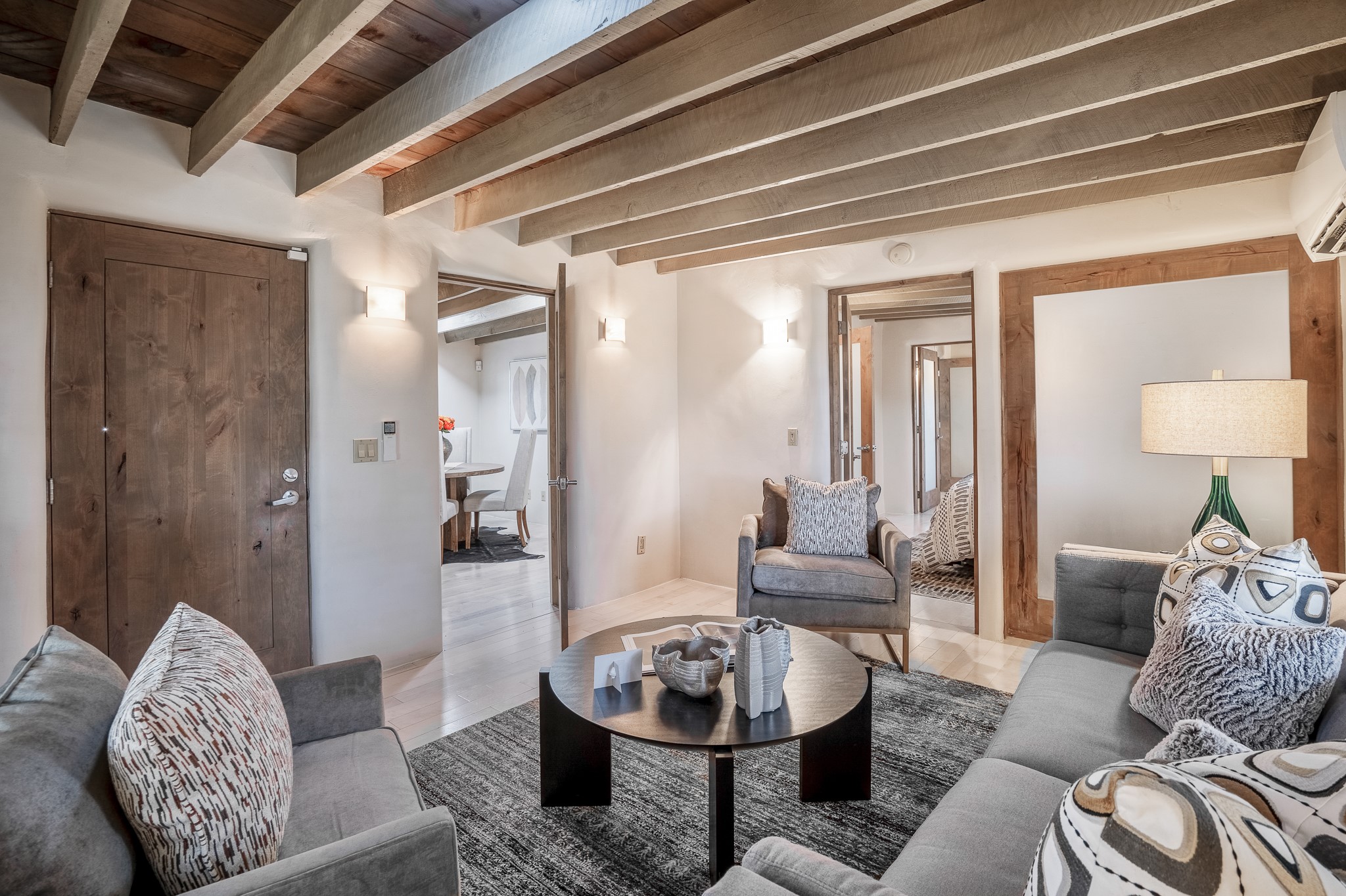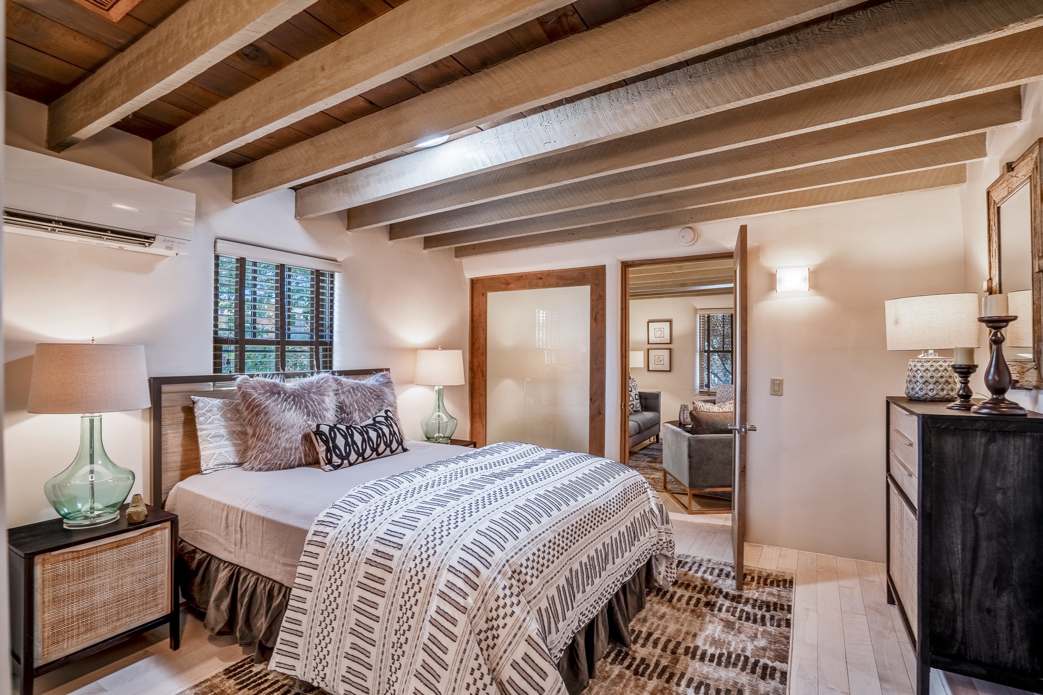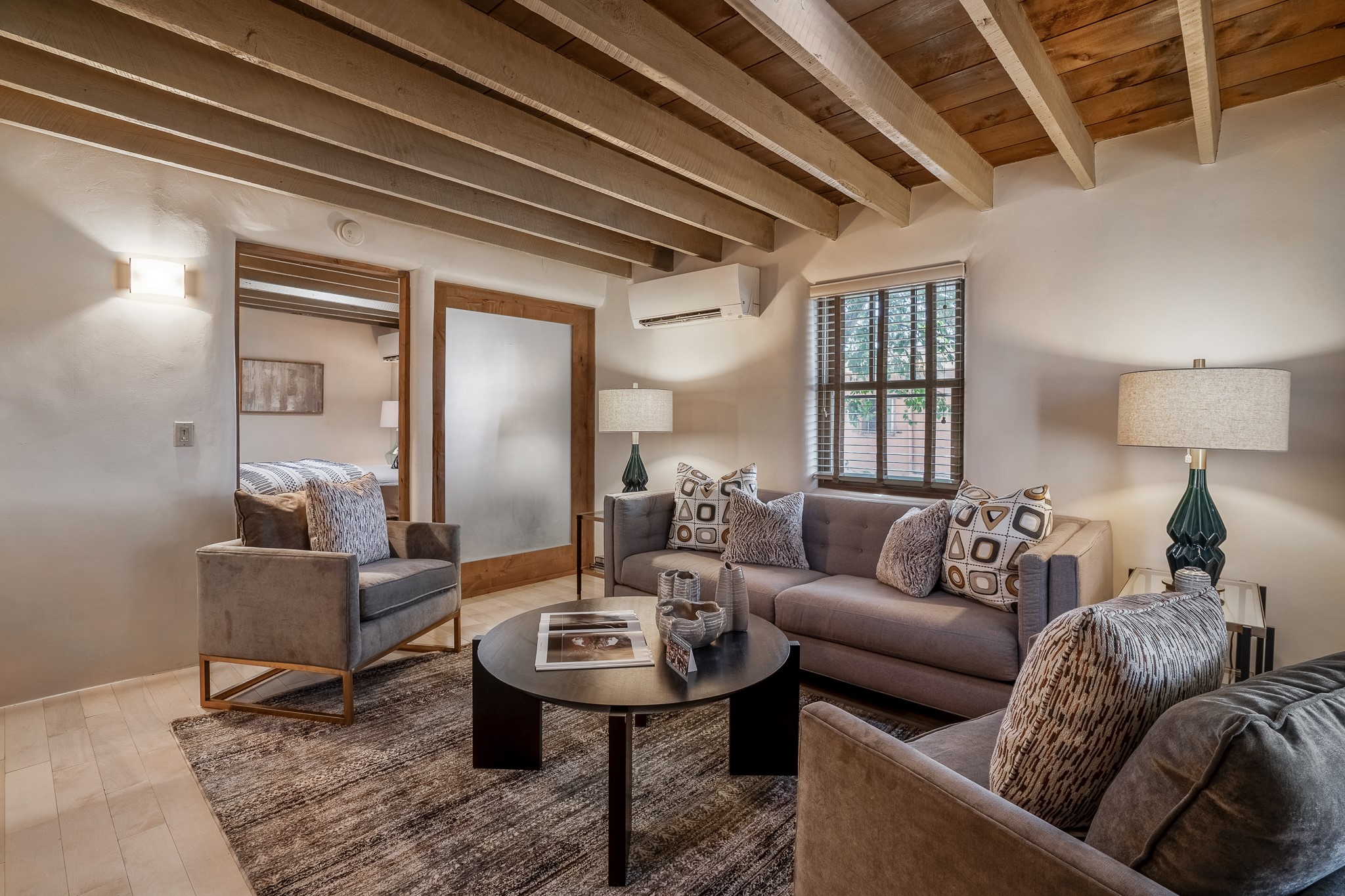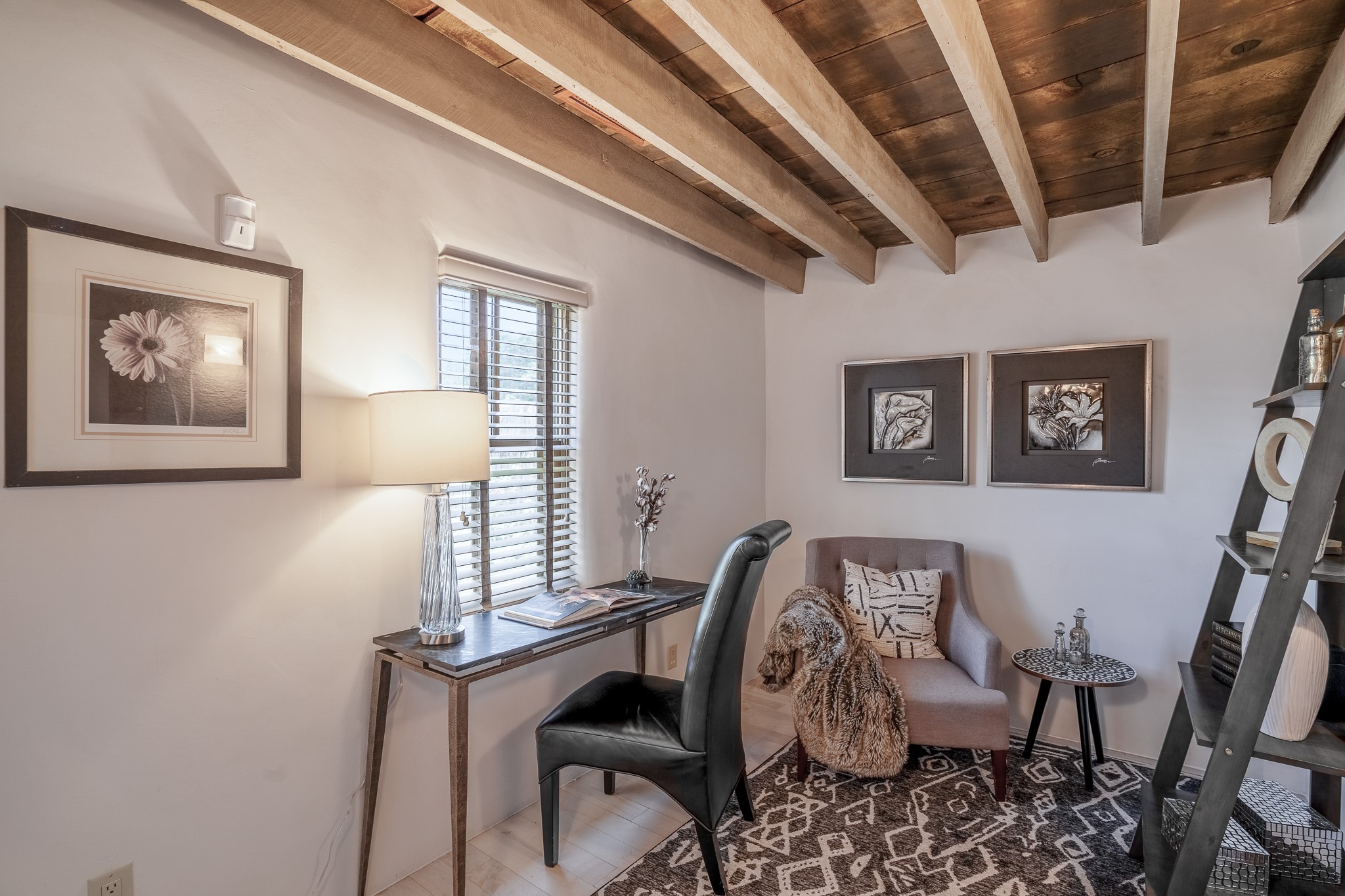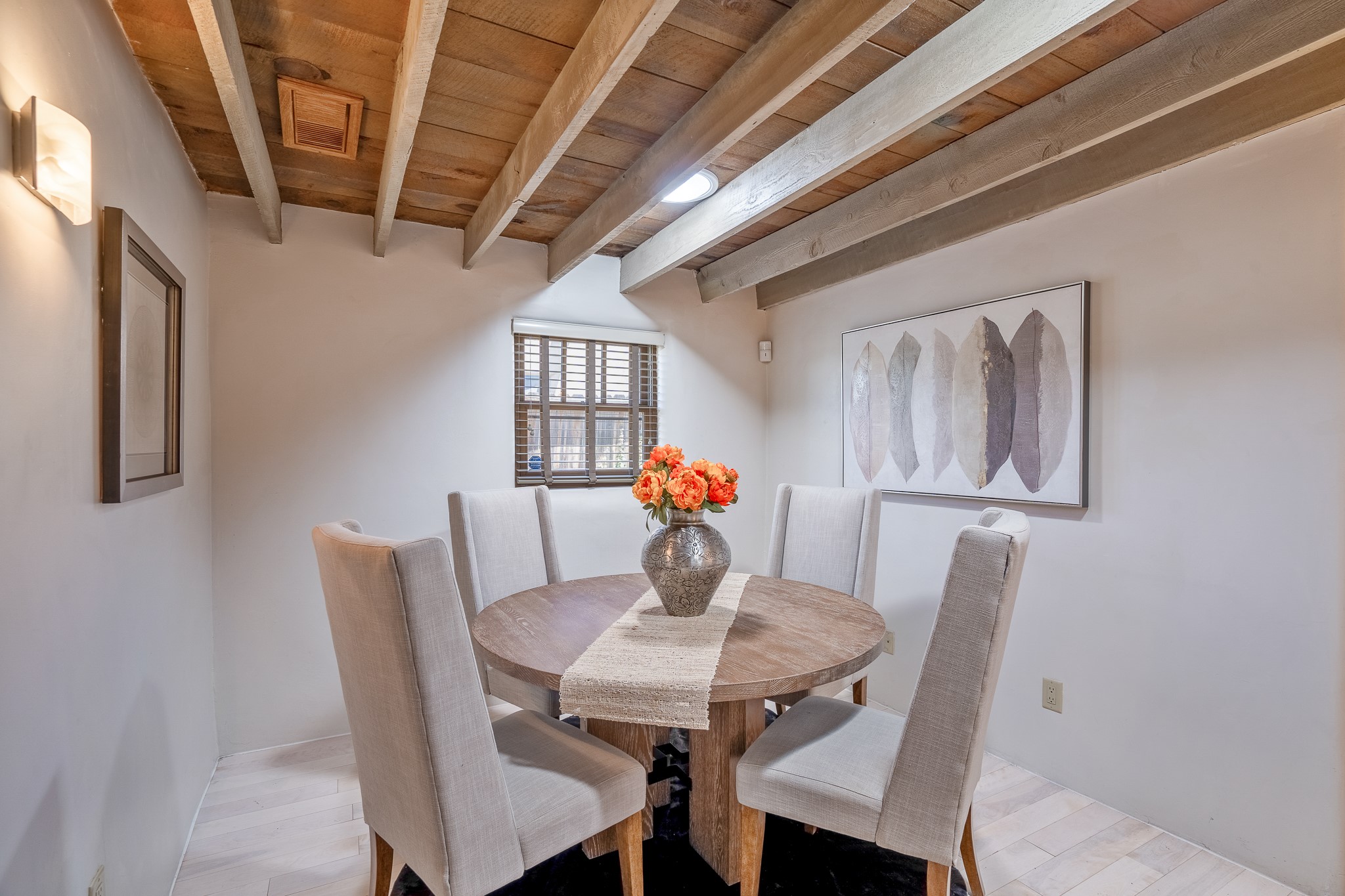 Step into the enchanting private walled courtyard, and the magic unfolds! This adobe casita offers a blend of uniqueness, trendiness, and turnkey convenience, with versatile spaces for living, working, or a live/work setup. The backyard is a gardener's paradise,complemented by a beautiful private outdoor deck, creating even more living area. Situated in the fabulous Railyard location, you'll enjoy a walkable/bikeable lifestyle with easy access to the Farmer's Market, shopping, restaurants, theaters, train, and walking trails. Recent upgrades include the roof and mini-splits for heating and cooling, enhancing the overall comfort of this wonderful home.