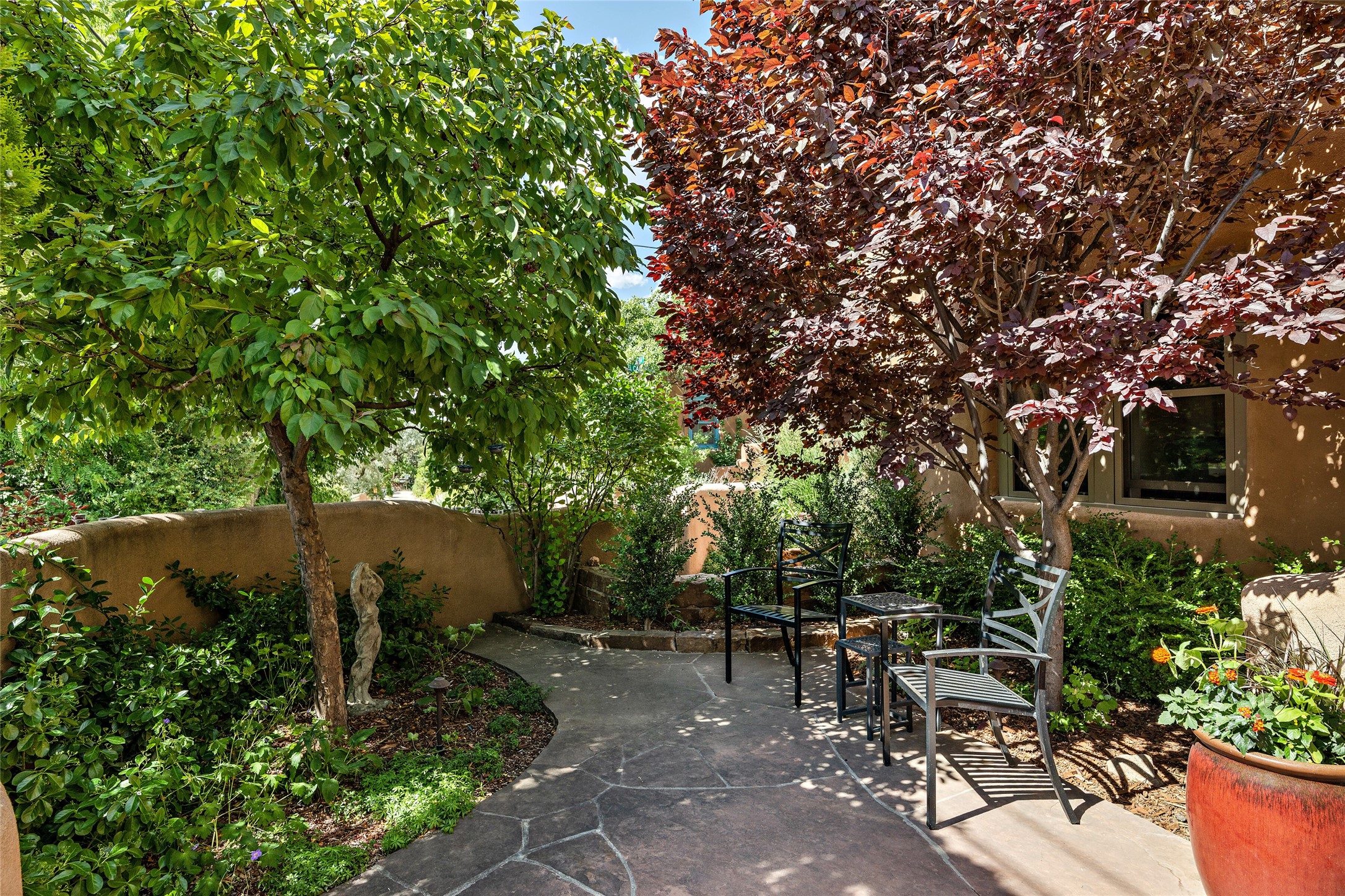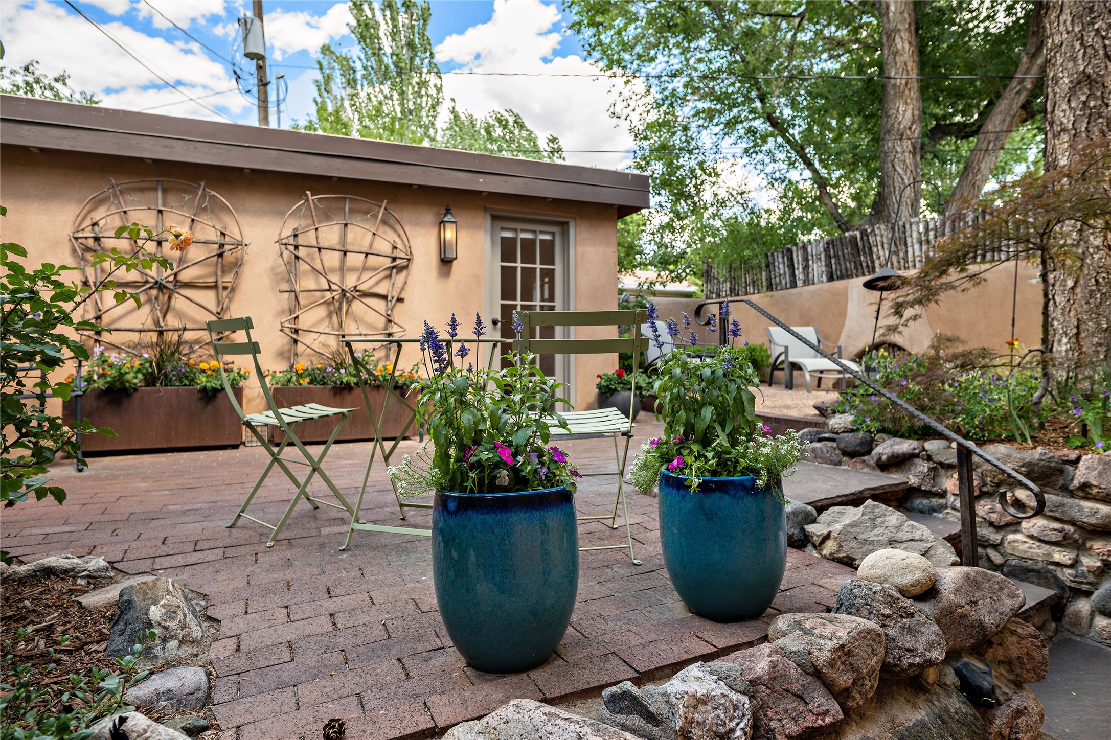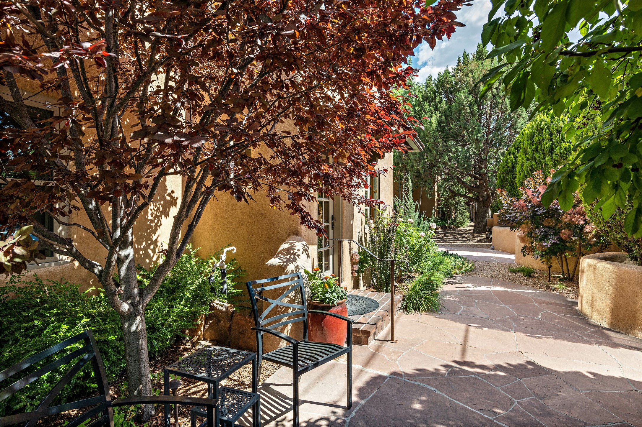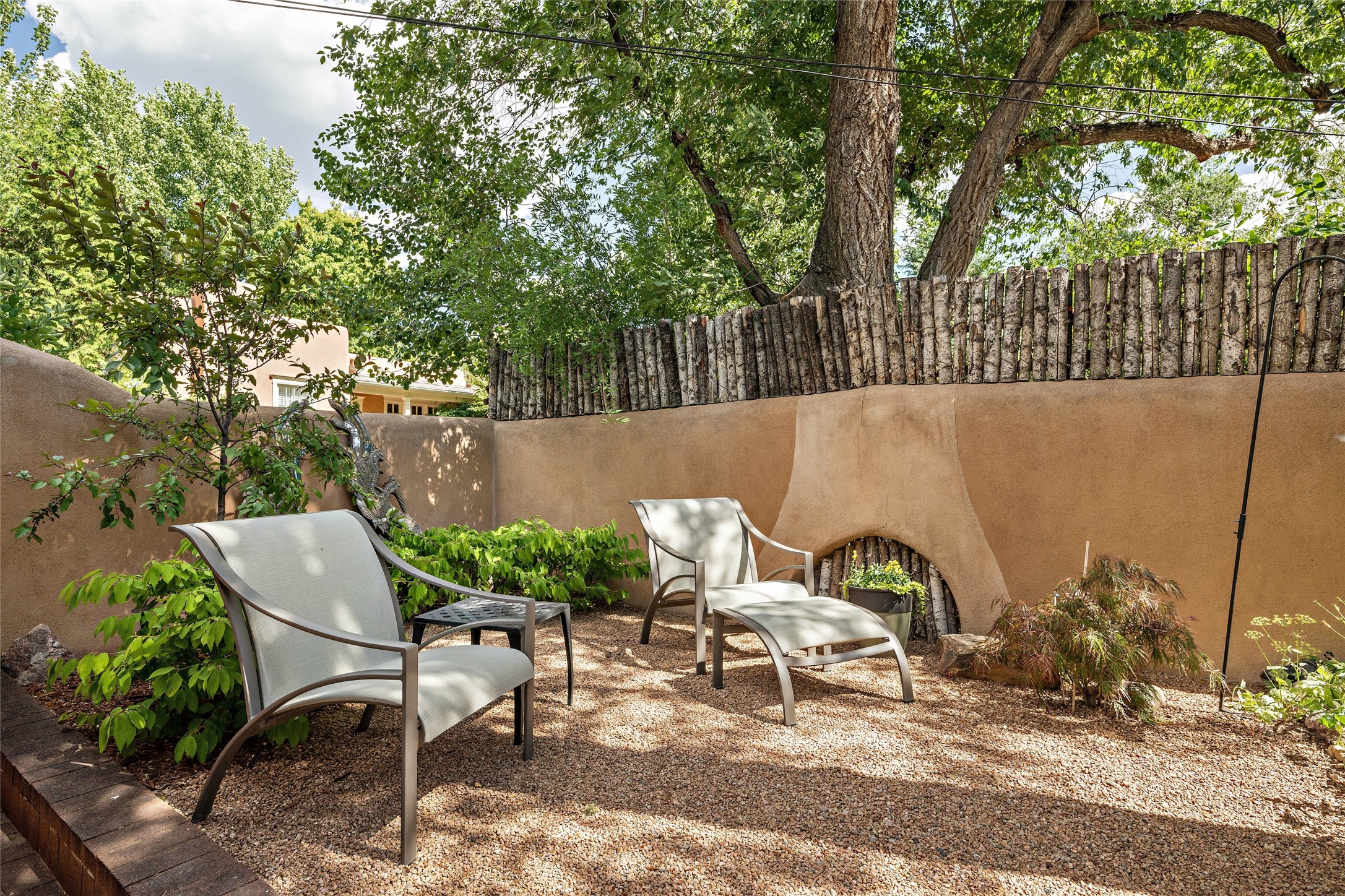 Step back into history with this exquisitely updated and maintained Eastside Santa Fe property situated in a private and quiet location close to Canyon Road. Comprised of a 1,020 +/- sq.ft., single-story adobe and frame constructed condo and detached 156 +/-sq.ft. frame and stucco casita, the property is completely surrounded by year-long sea-sonal, lush and mature landscaping, a backyard water feature and lovely walled and gated spaces attracting a wide array of native birds under a canopy of greenery; garden views from every window. Inside the main home, there are 2 large bedrooms and a re-cently renovated bathroom. A lovely kiva wood burning fireplace graces one bedroom, the other bedroom having backyard garden access. The open-concept galley kitchen, dining and living area is appointed with another wood burning kiva fireplace. The ca-sita consists of a large bedroom and ensuite bathroom with a skylight allowing for natu-ral sunlight during the day and star gazing at night, welcoming guests with a private and uplifting stay. Smooth plaster walls, vigas, wood and tile floors grace the spaces with classic Santa Fe charm. There are two dedicated off-street parking spots in this small four-unit complex. A large basement with interior access is ideal for storage and access to the mechanicals. A new roof which was installed in 2022 with a transferrable warranty in place, as well as zoned landscape irrigation and lighting systems are just some of the special details of this sweet hidden Santa Fe property nestled in the trees.