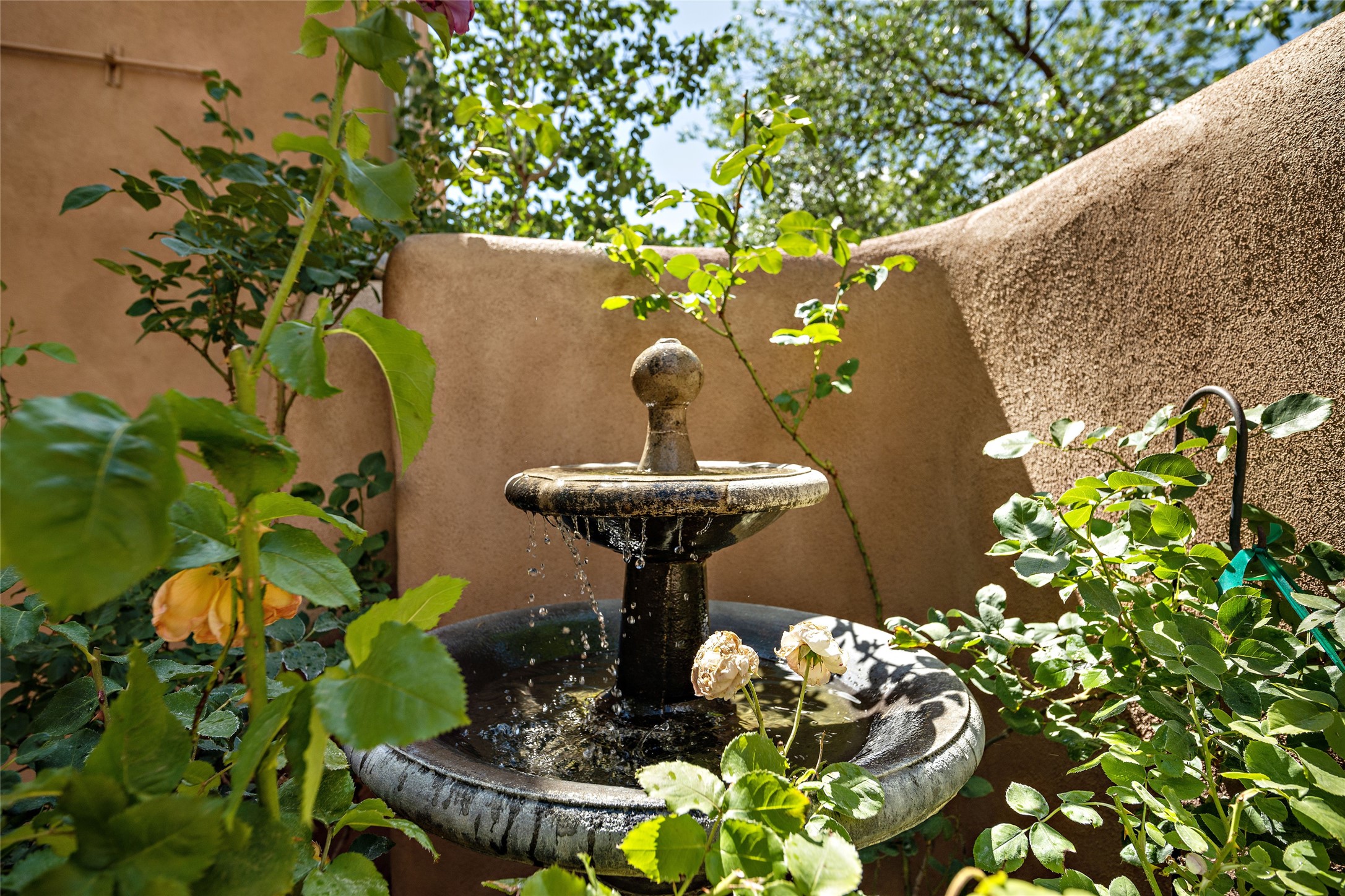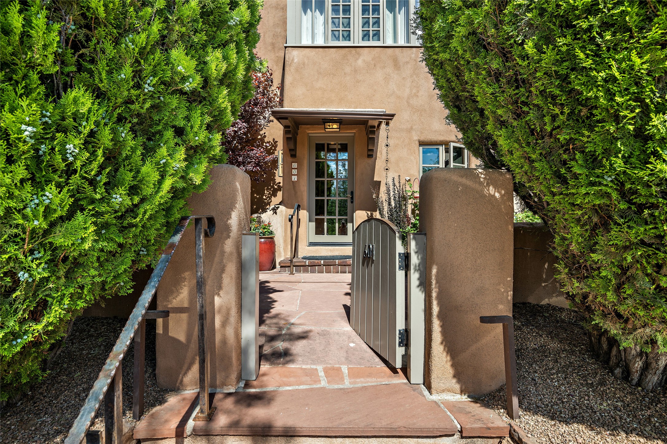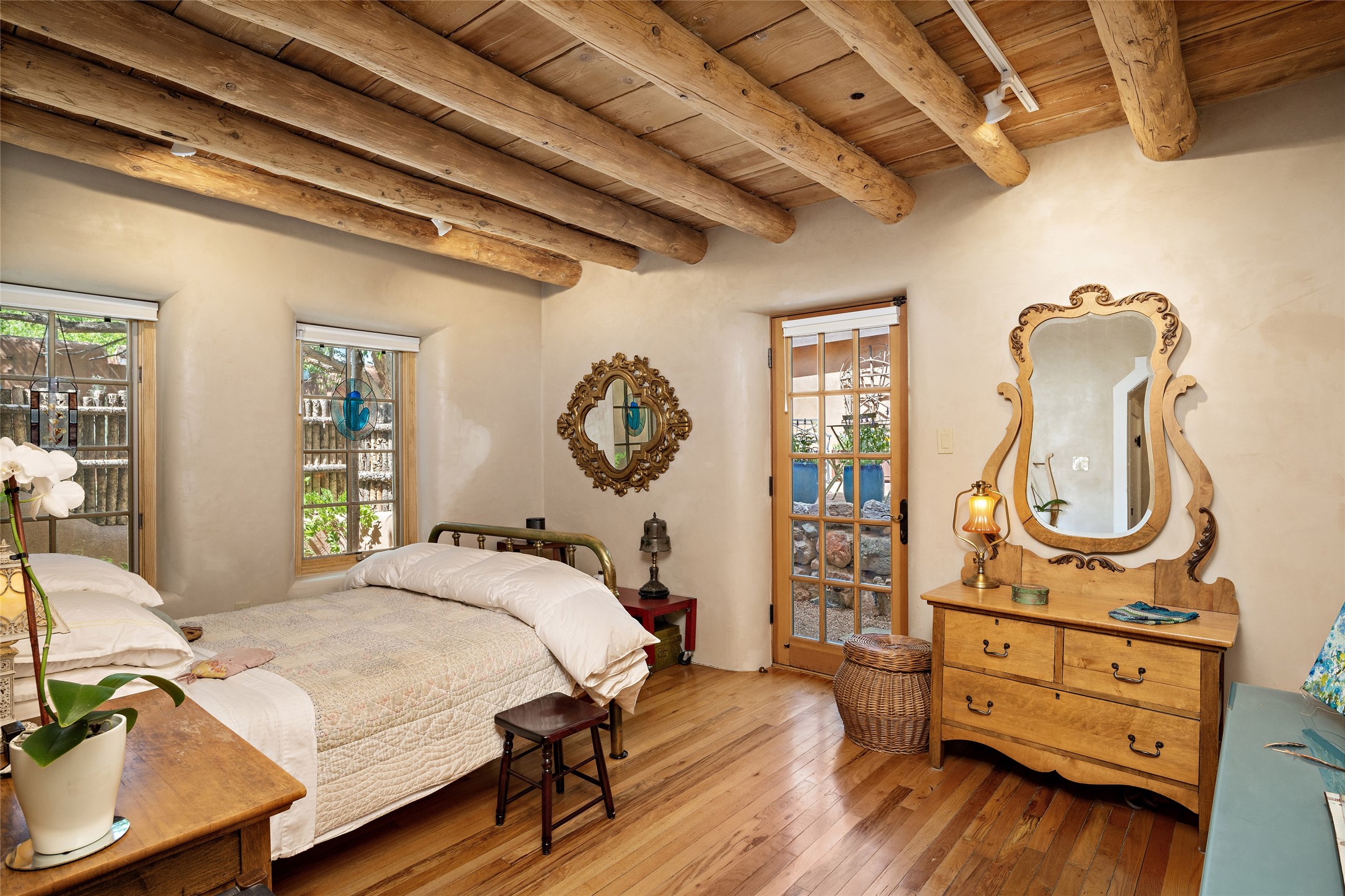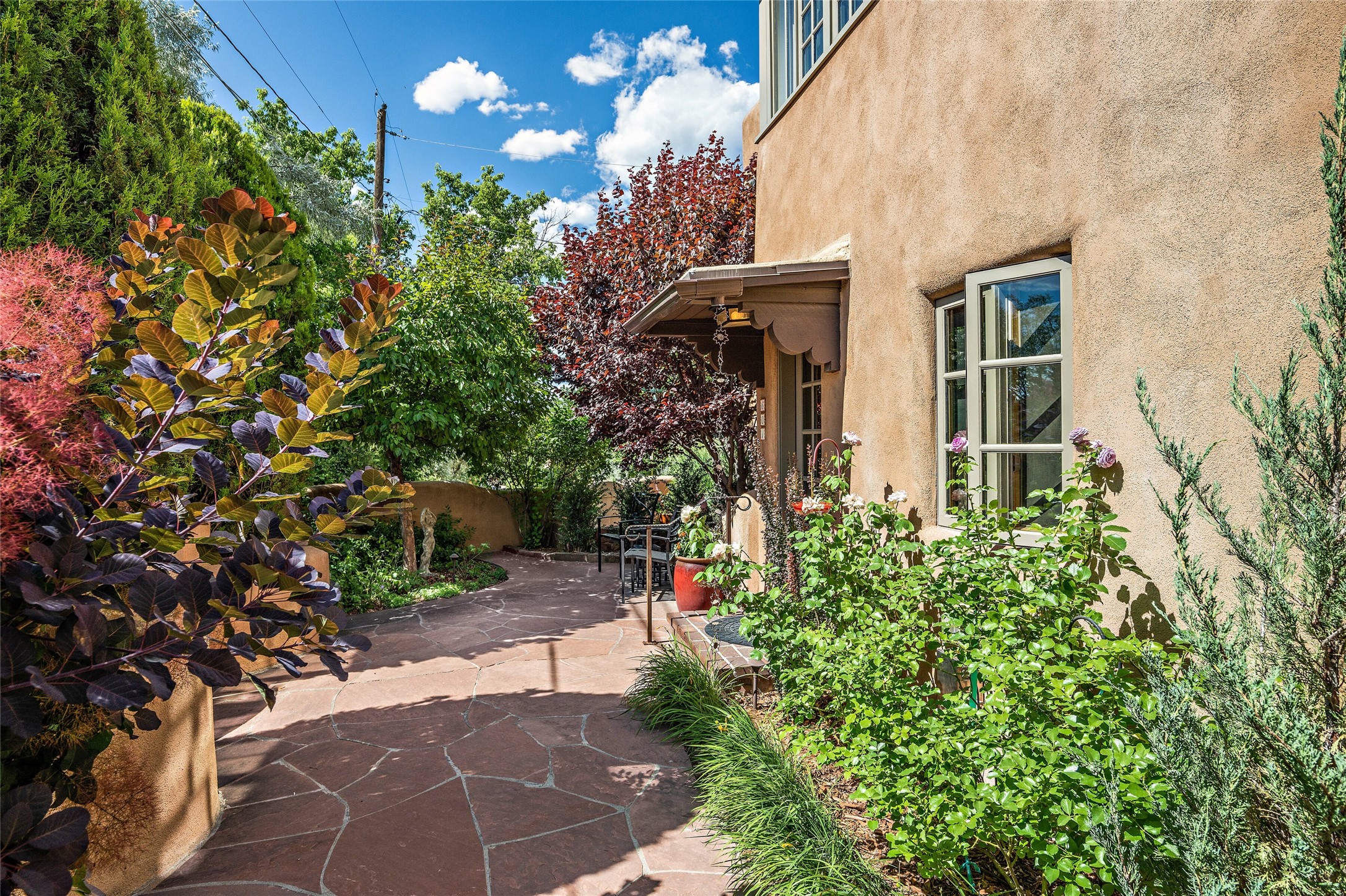 Step back into history with this exquisitely updated and maintained Eastside Santa Fe property situated in a private and quiet location close to Canyon Road. Comprised of a 1,020 +/- sq.ft., single-story adobe and frame constructed condo and detached 156 +/-sq.ft. frame and stucco casita, the property is completely surrounded by year-long sea-sonal, lush and mature landscaping, a backyard water feature and lovely walled and gated spaces attracting a wide array of native birds under a canopy of greenery; garden views from every window. Inside the main home, there are 2 large bedrooms and a re-cently renovated bathroom. A lovely kiva wood burning fireplace graces one bedroom, the other bedroom having backyard garden access. The open-concept galley kitchen, dining and living area is appointed with another wood burning kiva fireplace. The ca-sita consists of a large bedroom and ensuite bathroom with a skylight allowing for natu-ral sunlight during the day and star gazing at night, welcoming guests with a private and uplifting stay. Smooth plaster walls, vigas, wood and tile floors grace the spaces with classic Santa Fe charm. There are two dedicated off-street parking spots in this small four-unit complex. A large basement with interior access is ideal for storage and access to the mechanicals. A new roof which was installed in 2022 with a transferrable warranty in place, as well as zoned landscape irrigation and lighting systems are just some of the special details of this sweet hidden Santa Fe property nestled in the trees.