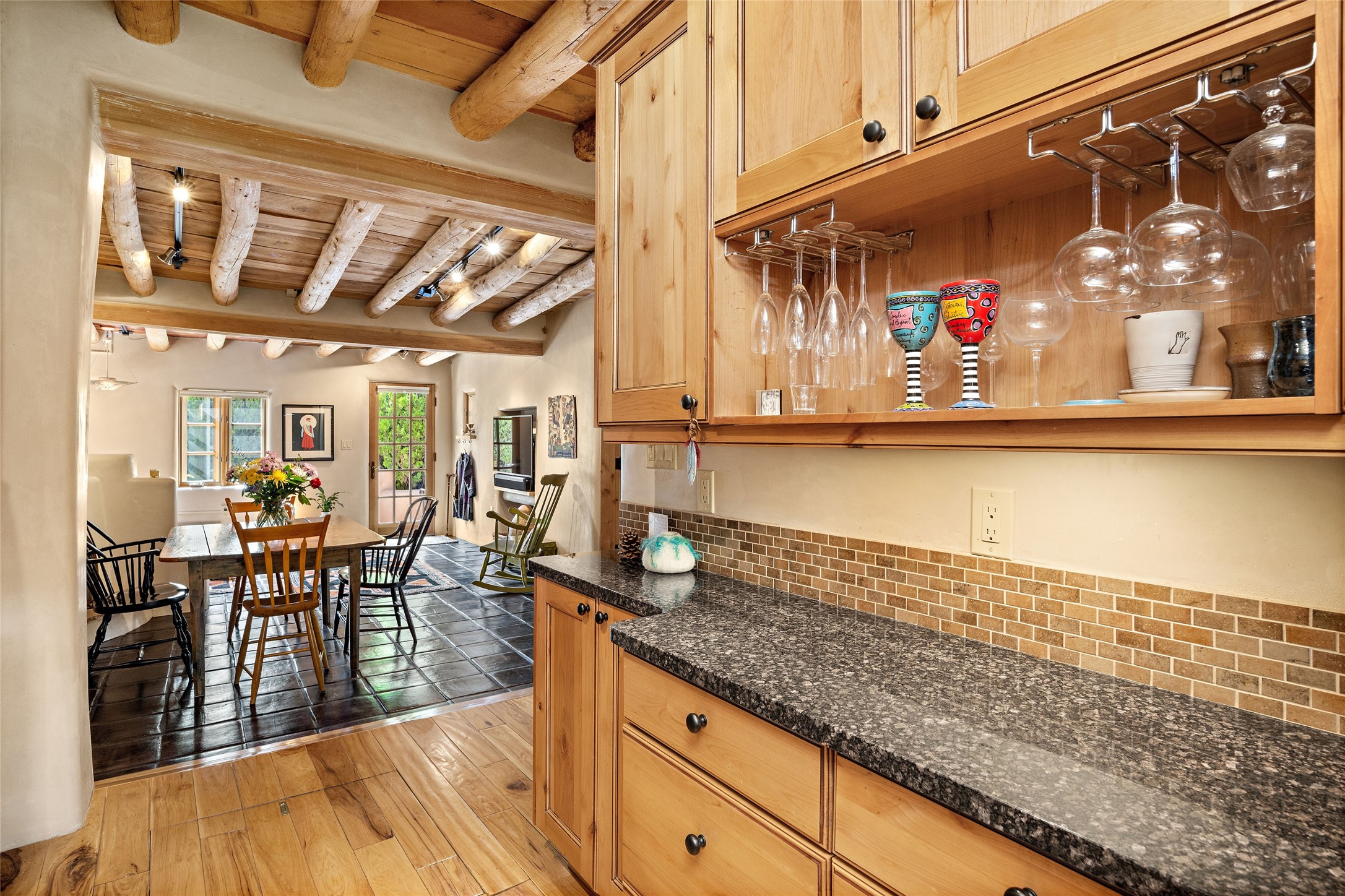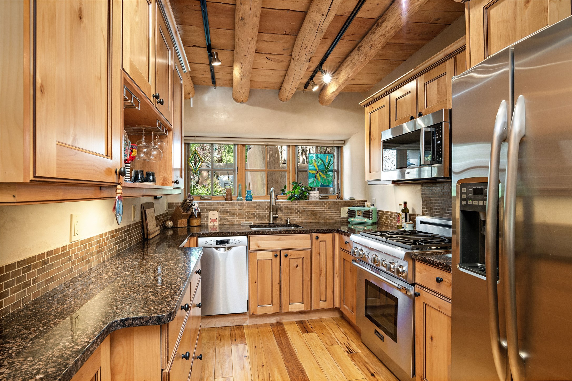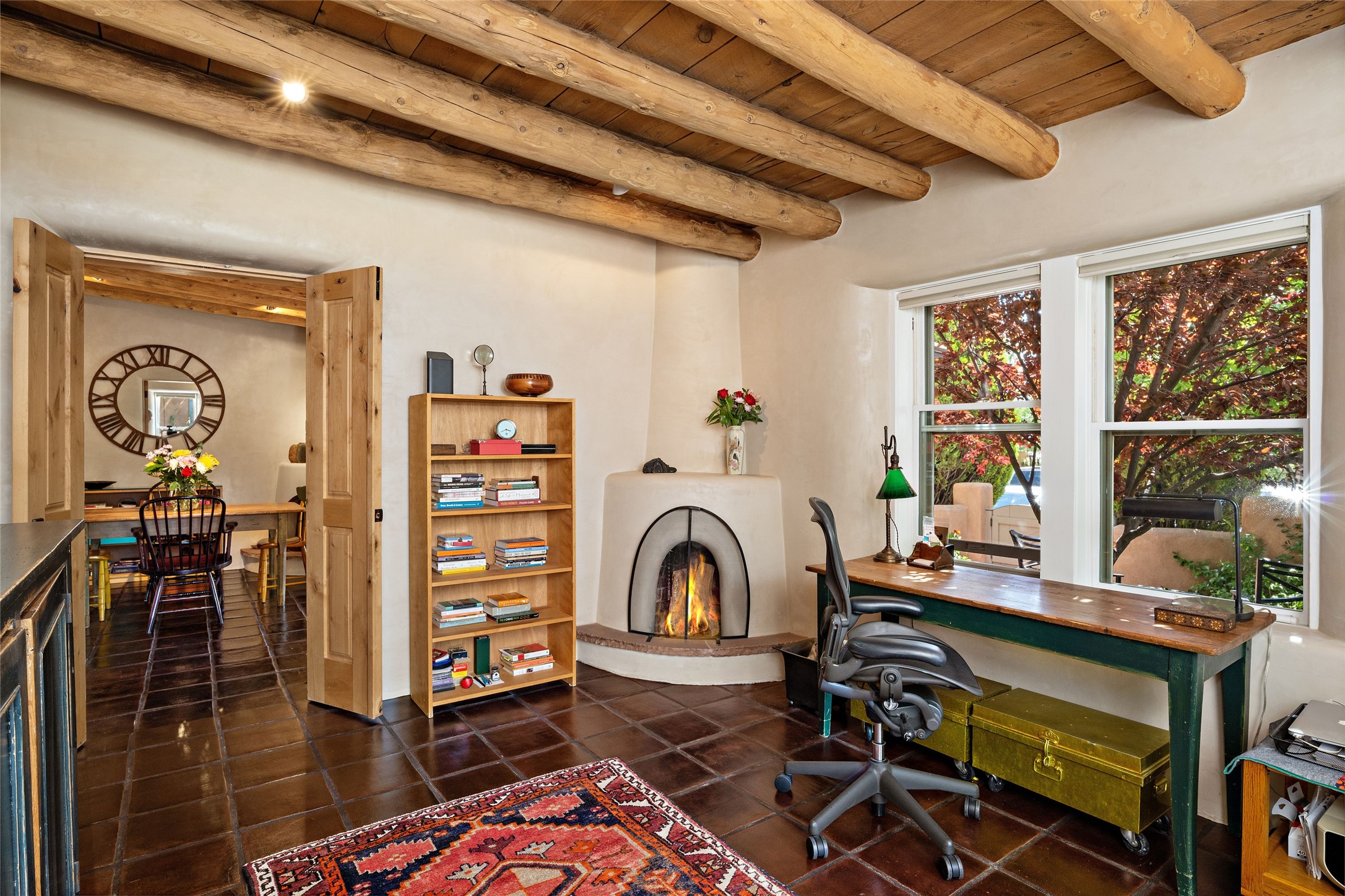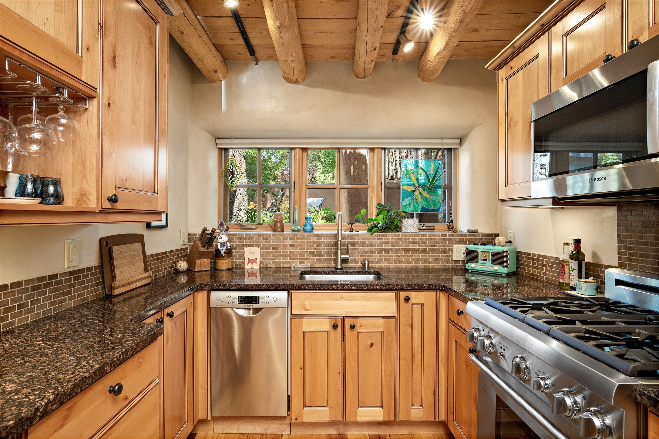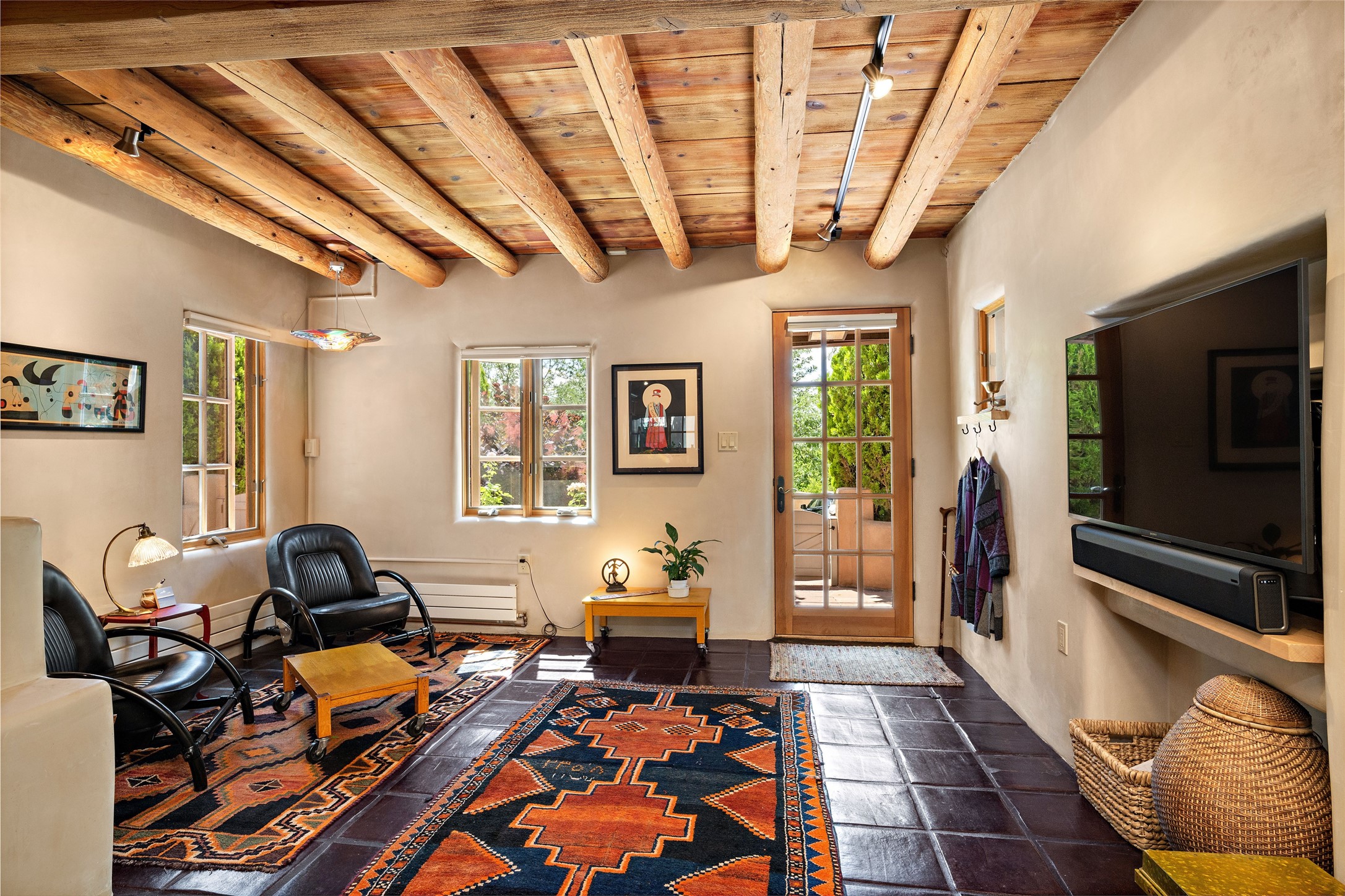 Step back into history with this exquisitely updated and maintained Eastside Santa Fe property situated in a private and quiet location close to Canyon Road. Comprised of a 1,020 +/- sq.ft., single-story adobe and frame constructed condo and detached 156 +/-sq.ft. frame and stucco casita, the property is completely surrounded by year-long sea-sonal, lush and mature landscaping, a backyard water feature and lovely walled and gated spaces attracting a wide array of native birds under a canopy of greenery; garden views from every window. Inside the main home, there are 2 large bedrooms and a re-cently renovated bathroom. A lovely kiva wood burning fireplace graces one bedroom, the other bedroom having backyard garden access. The open-concept galley kitchen, dining and living area is appointed with another wood burning kiva fireplace. The ca-sita consists of a large bedroom and ensuite bathroom with a skylight allowing for natu-ral sunlight during the day and star gazing at night, welcoming guests with a private and uplifting stay. Smooth plaster walls, vigas, wood and tile floors grace the spaces with classic Santa Fe charm. There are two dedicated off-street parking spots in this small four-unit complex. A large basement with interior access is ideal for storage and access to the mechanicals. A new roof which was installed in 2022 with a transferrable warranty in place, as well as zoned landscape irrigation and lighting systems are just some of the special details of this sweet hidden Santa Fe property nestled in the trees.